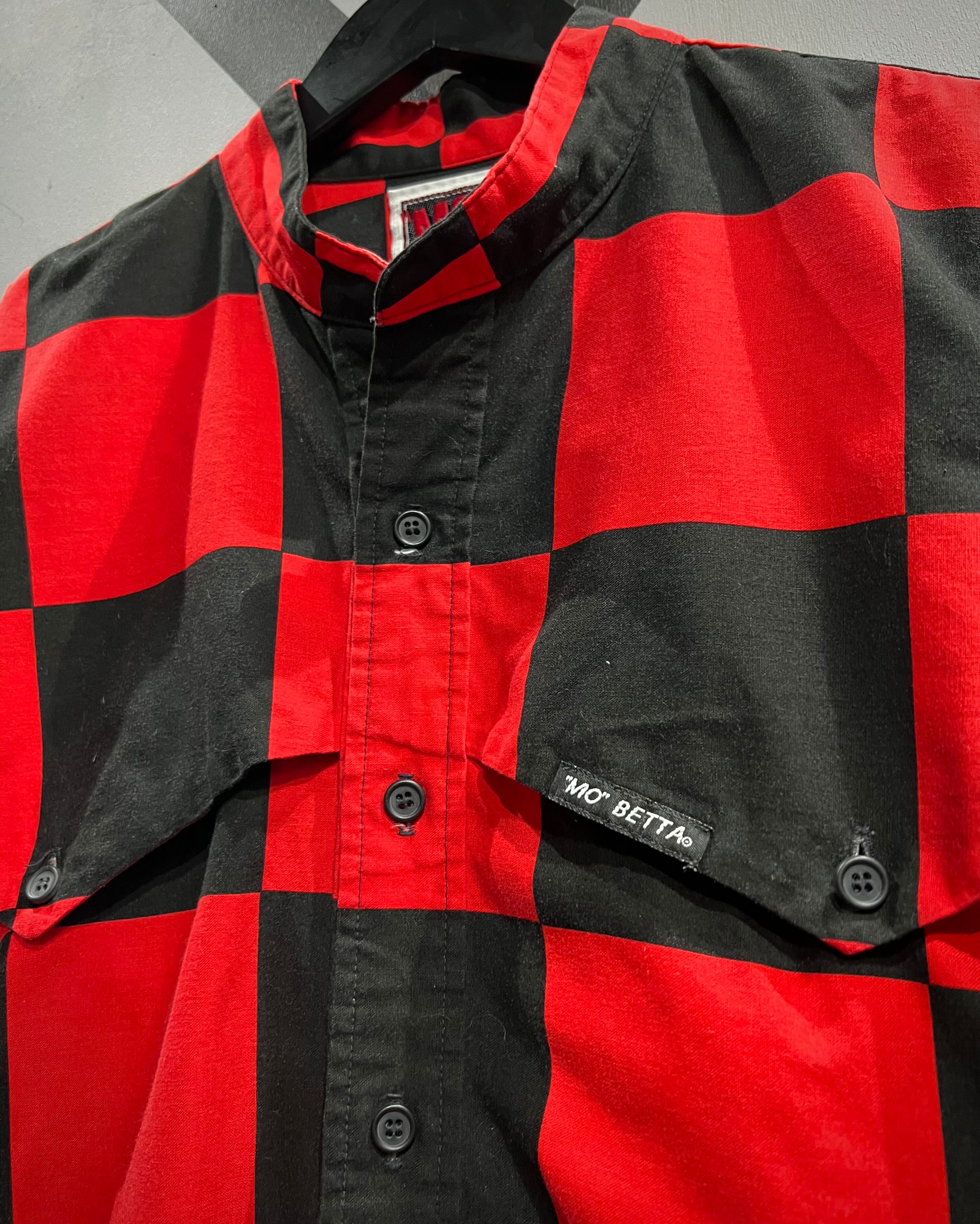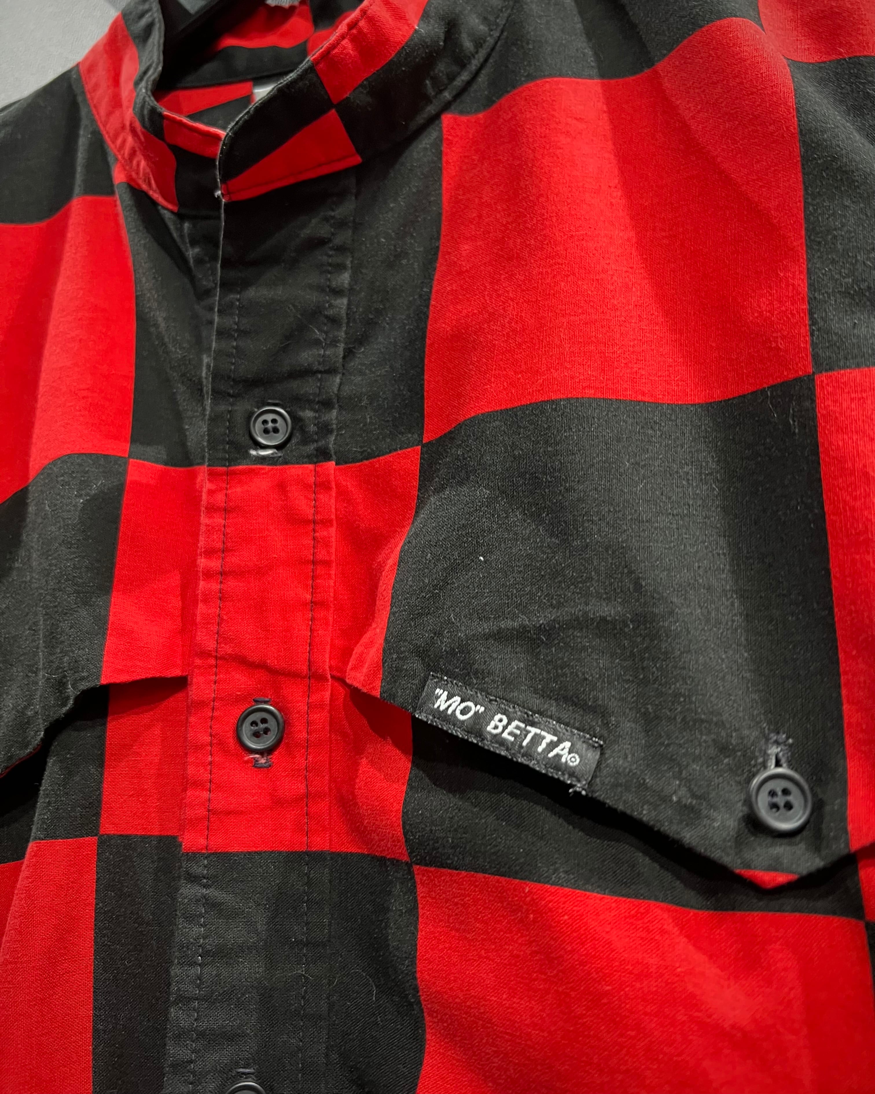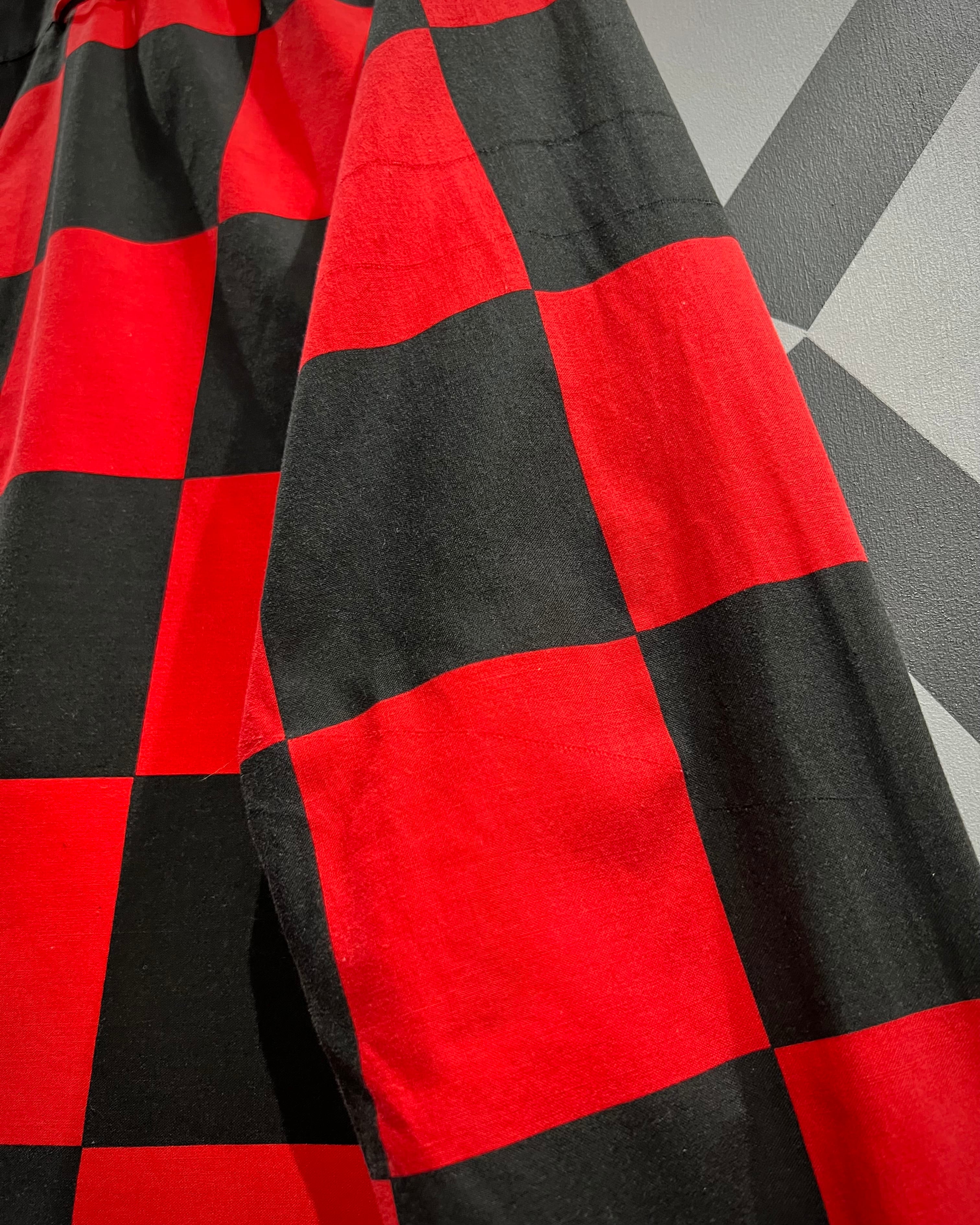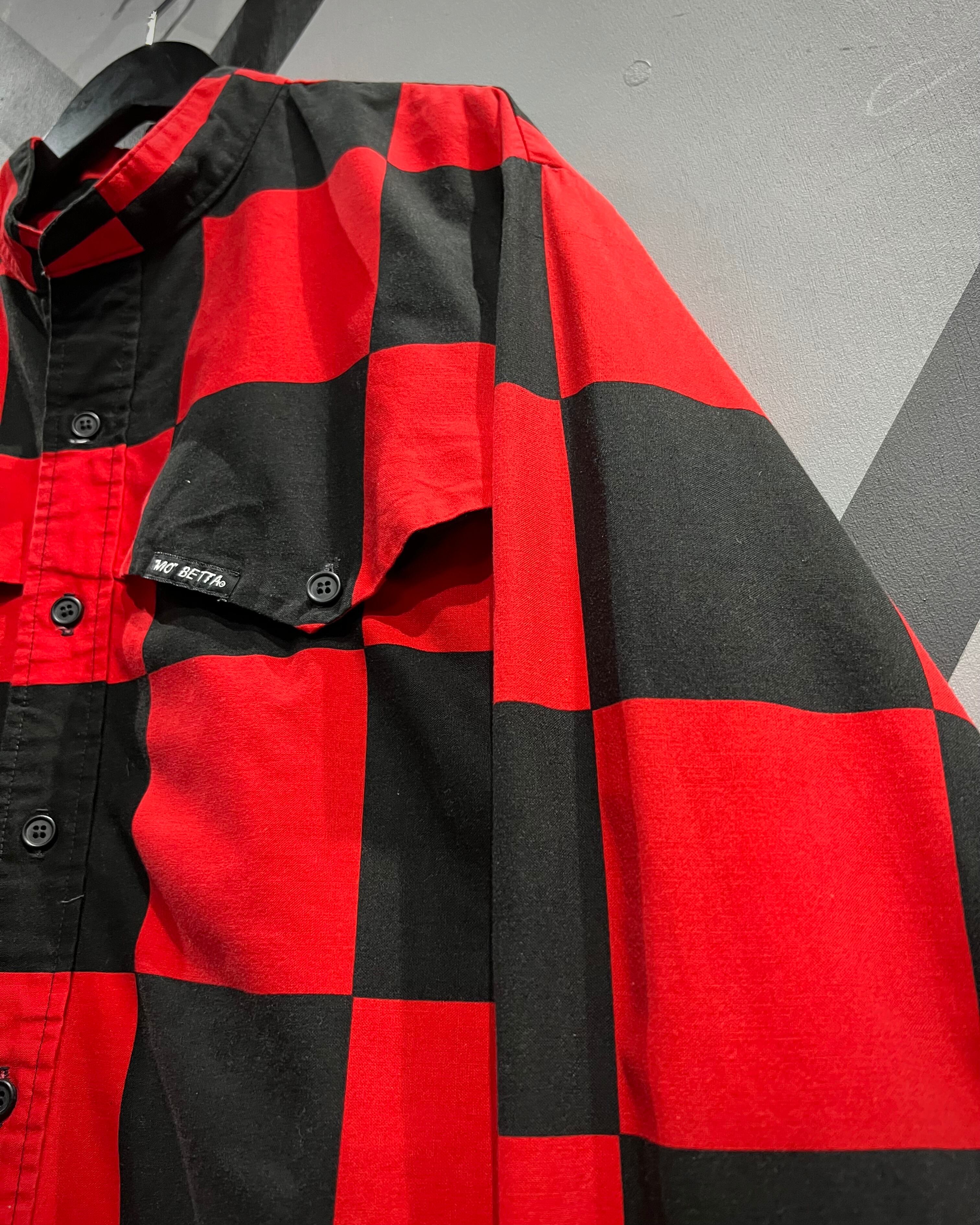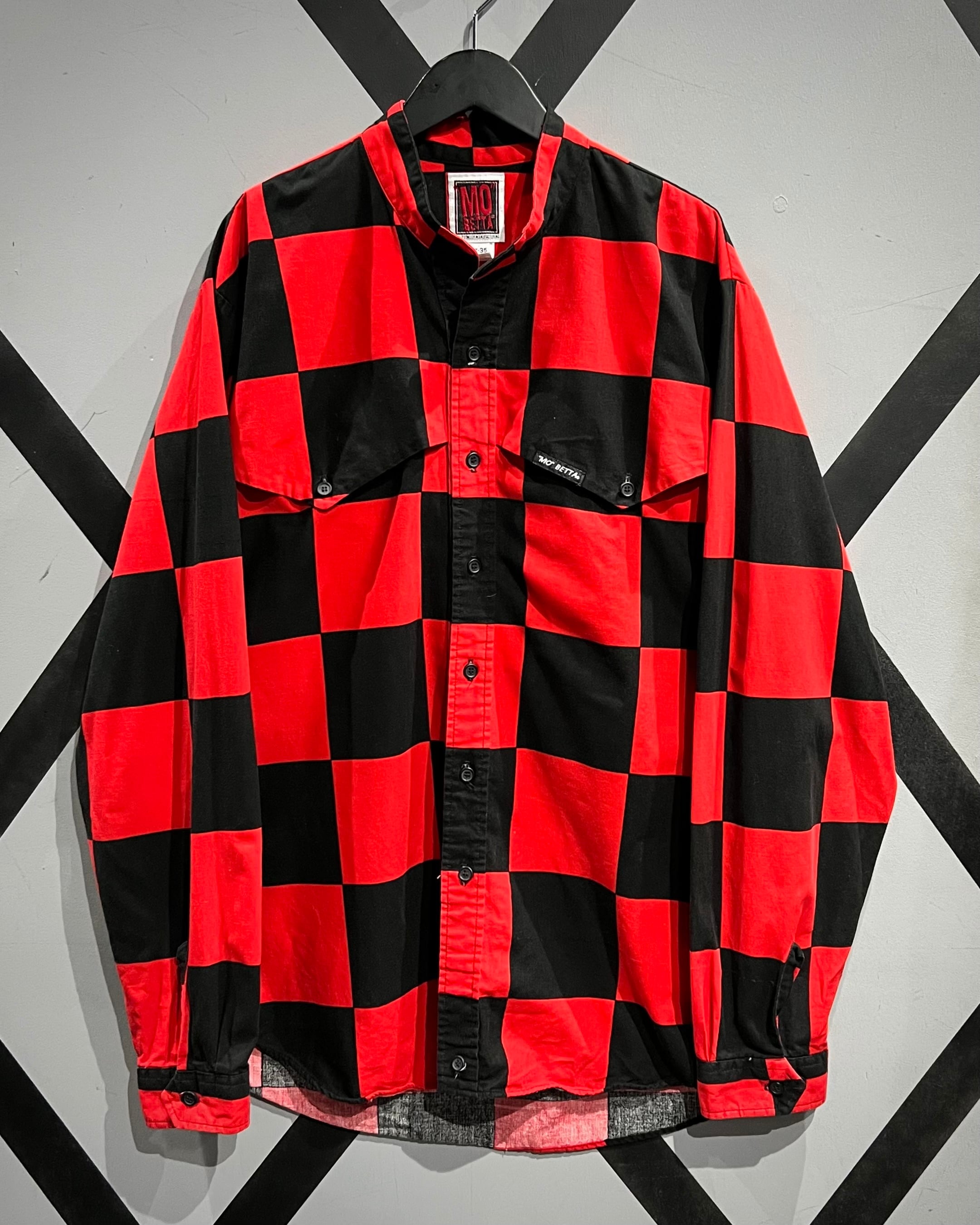 赤×黒のの大胆なブロックチェックを全面に配したインパクト抜群のデザインの長袖シャツ。