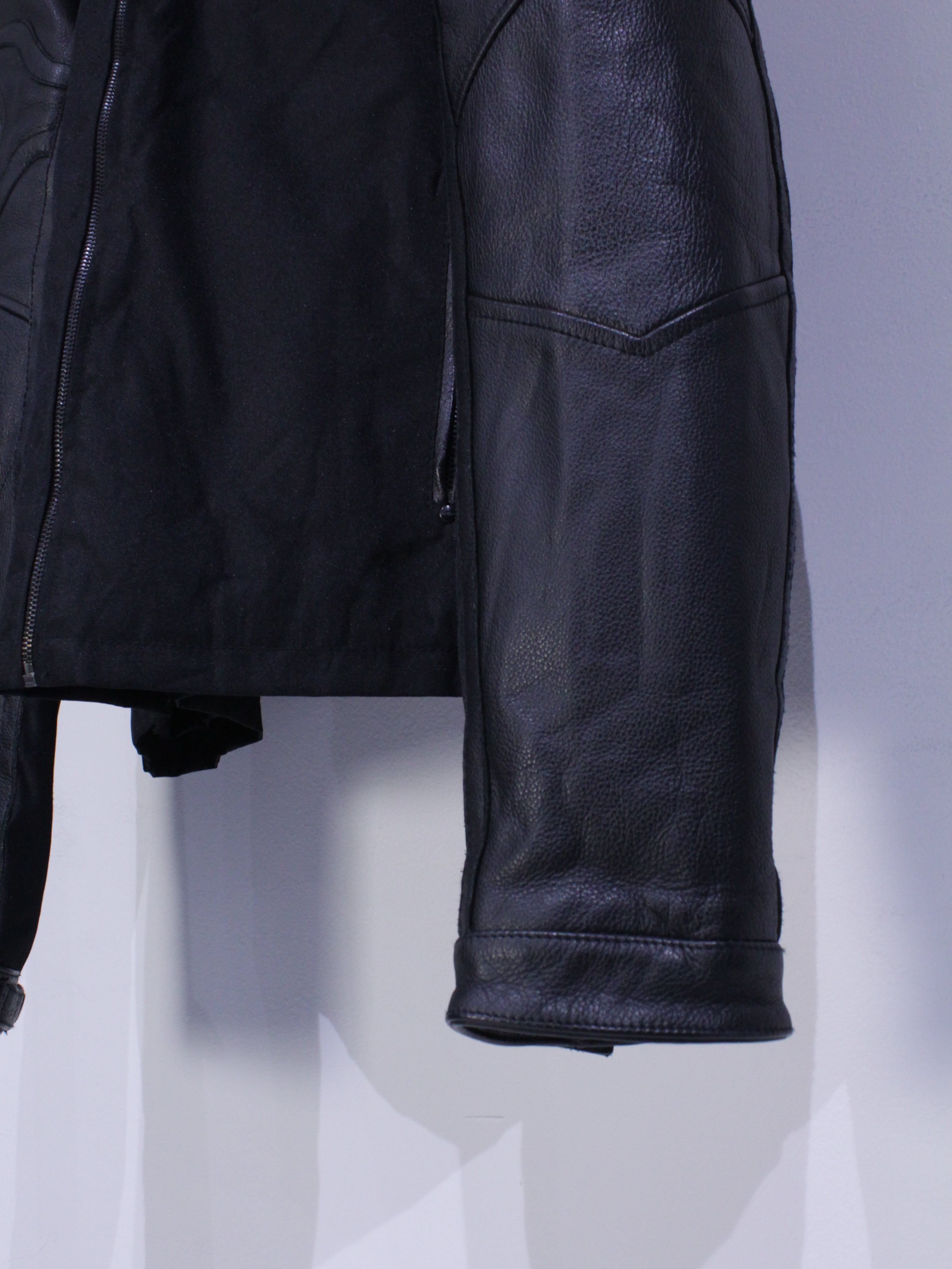 腕や肩、背面にレザーを配置することで、強度を高めながらデザイン面でもアクセントを加えた1着。ブラックワントーンで統一されたボディに映える切り替えが、無骨ながらも洗練された雰囲気を漂わせています。