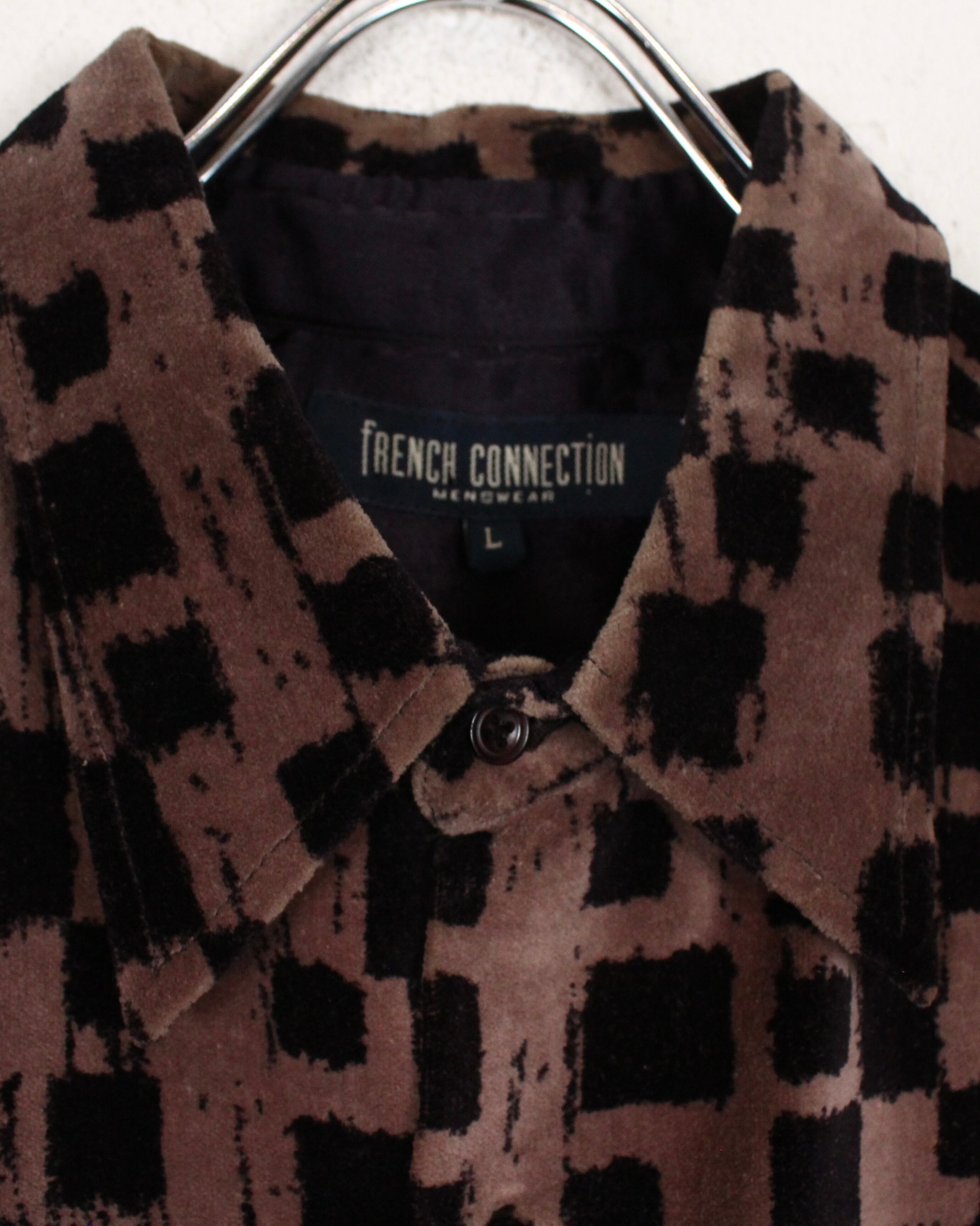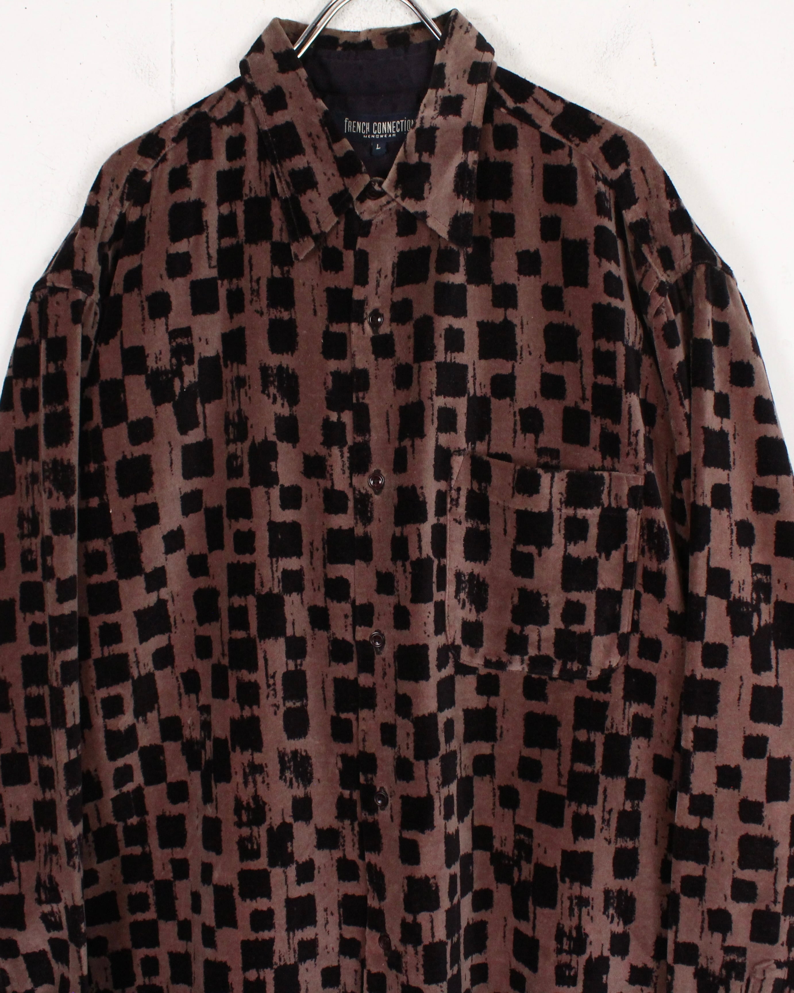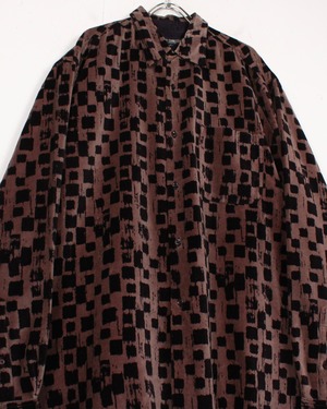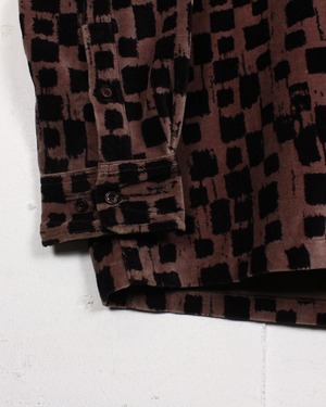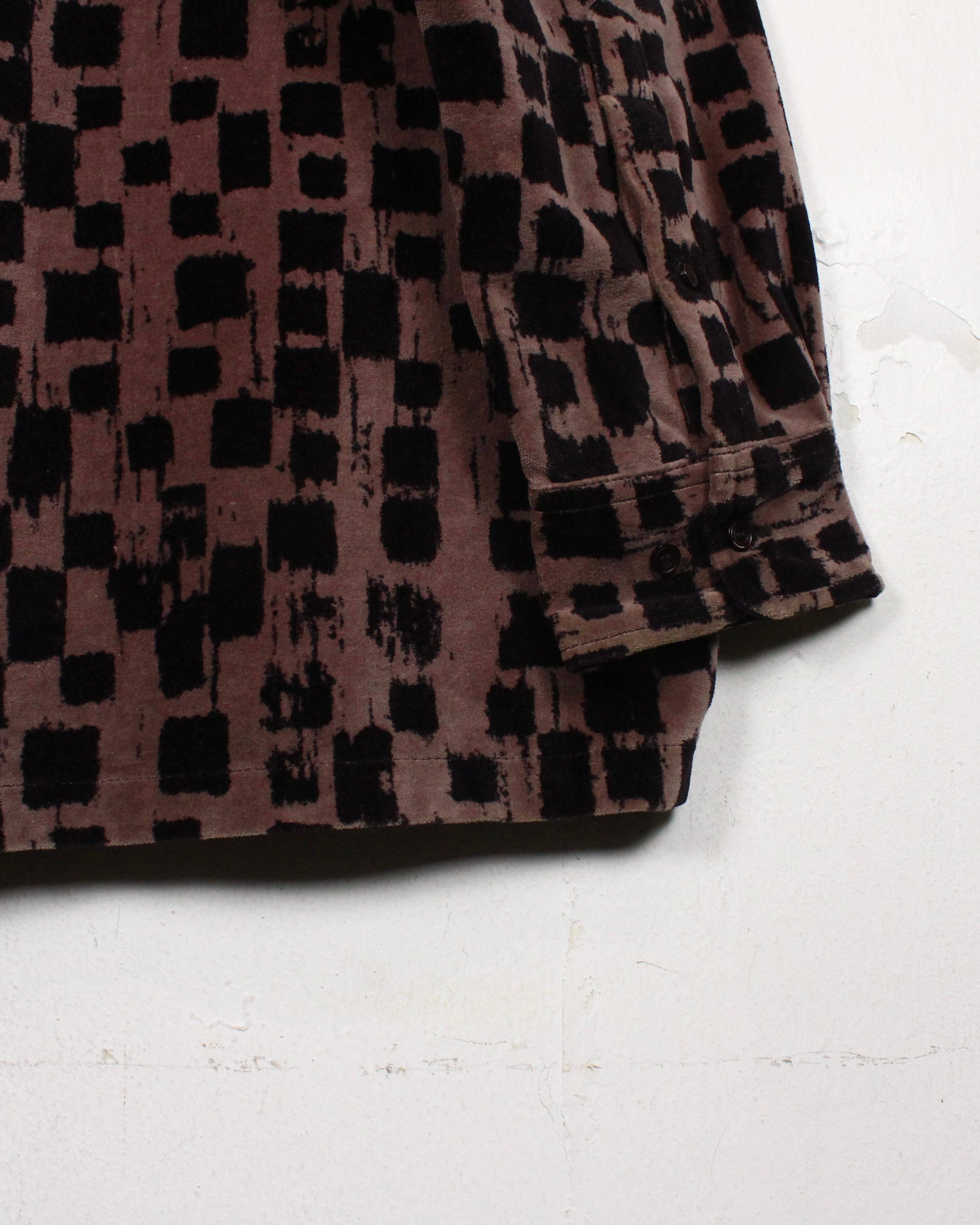 深みのあるブラウンをベースに、スクエア状のパターンをブラックで載せたベロアシャツ。