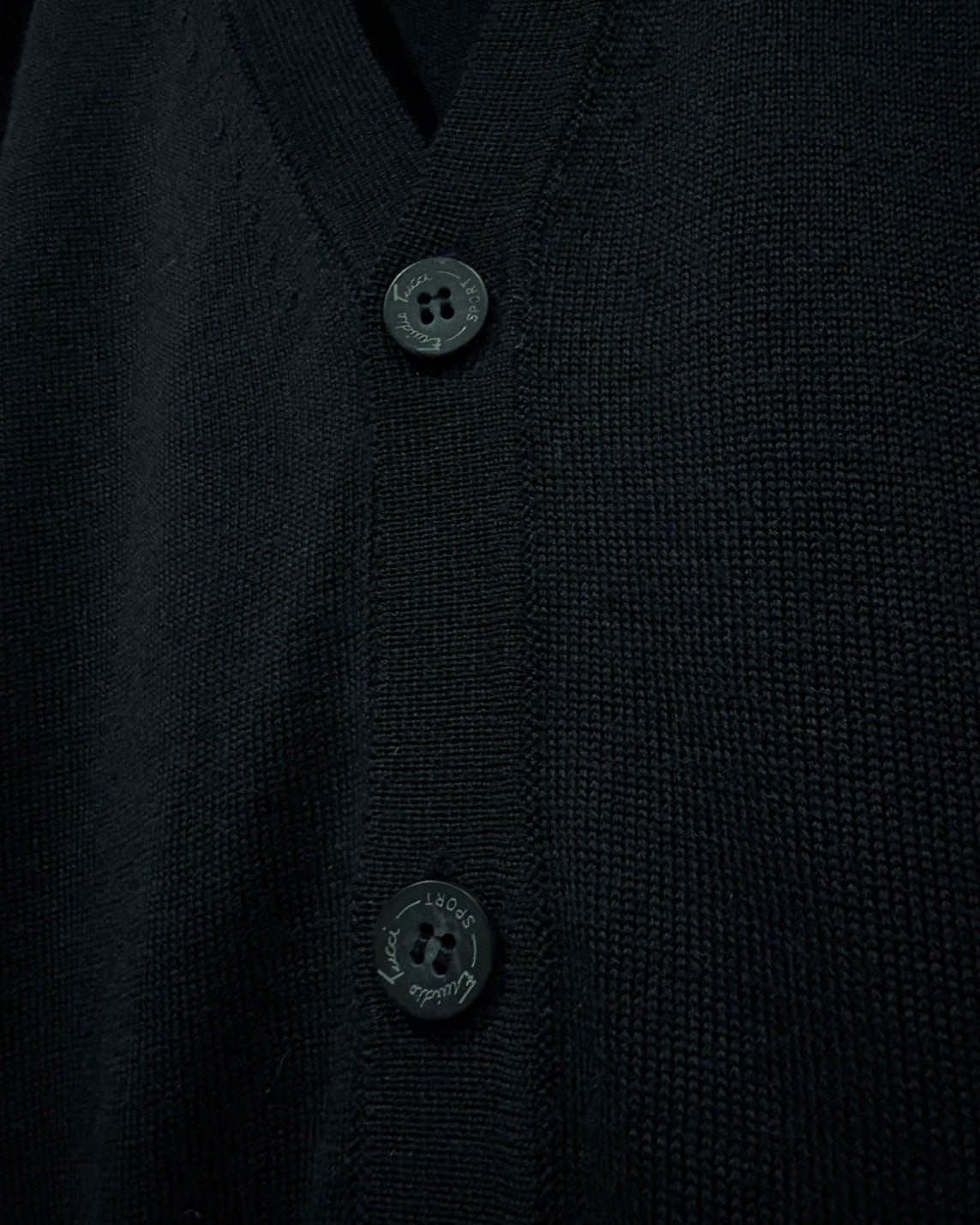 黒のボディで仕立てられた、薄手のスペイン製ニットカーディガン。60%ウール × 40%アクリルの軽やかな素材感は、さらりと羽織れる快適さと程よい保温性を兼ね備えています。