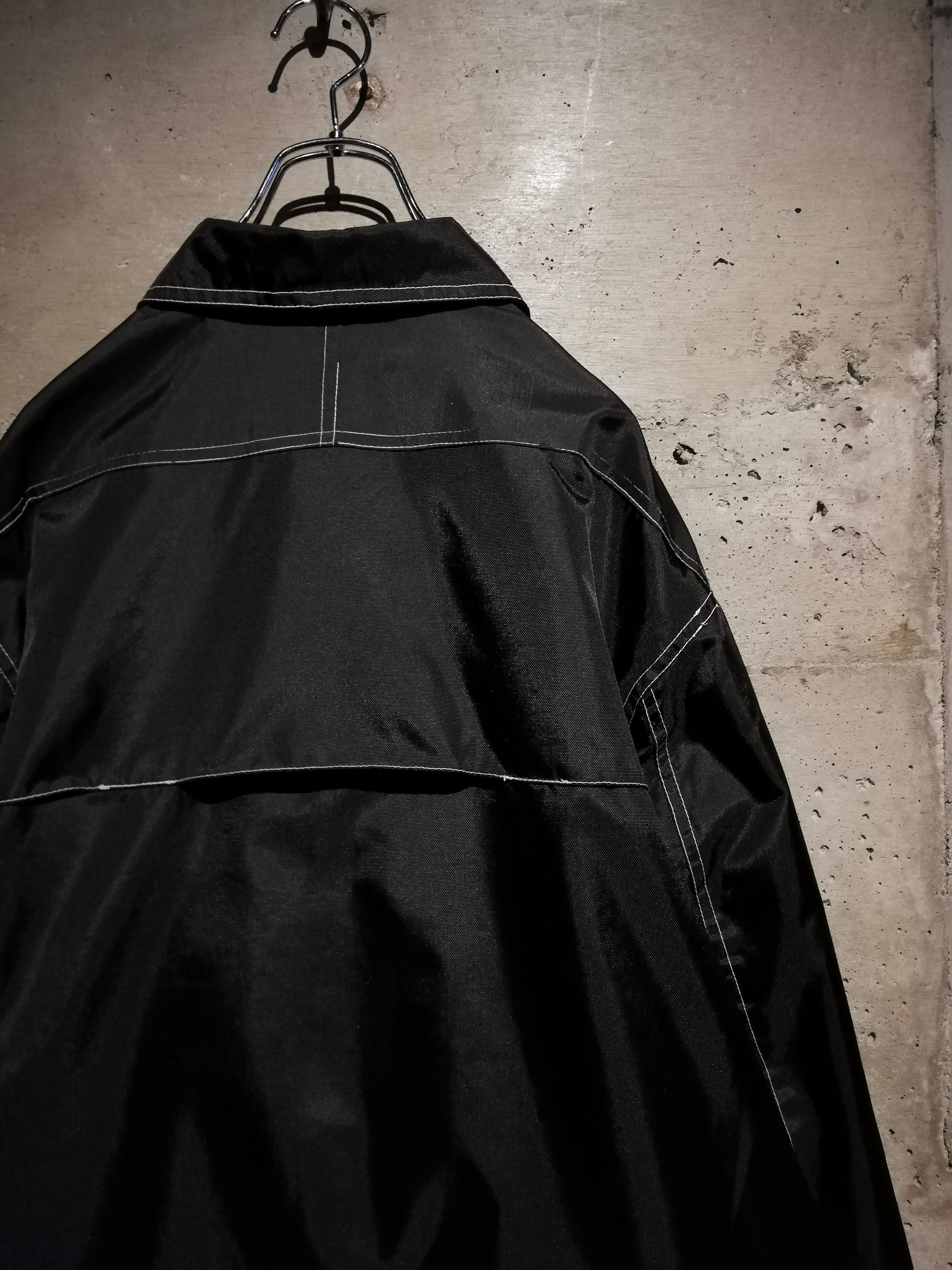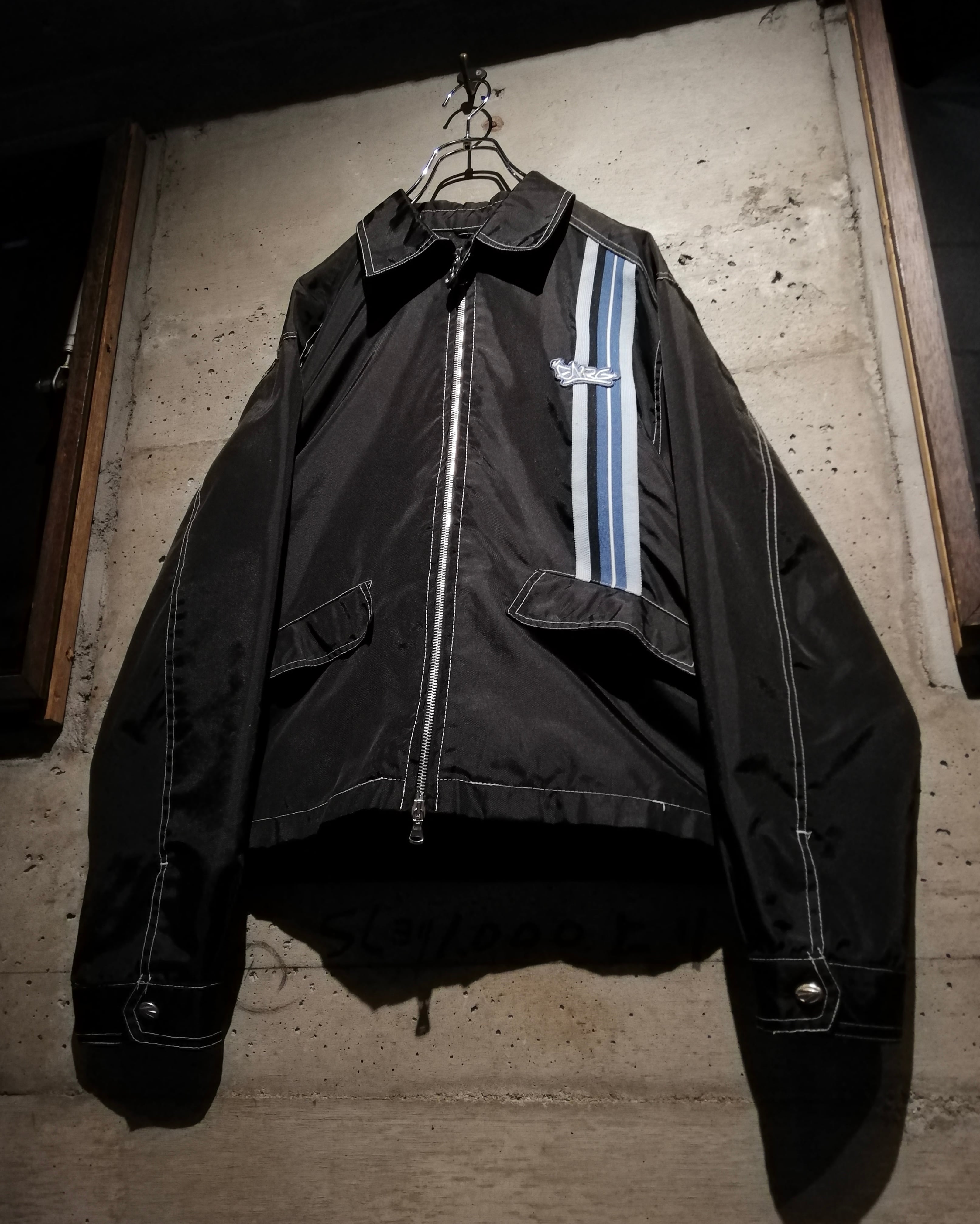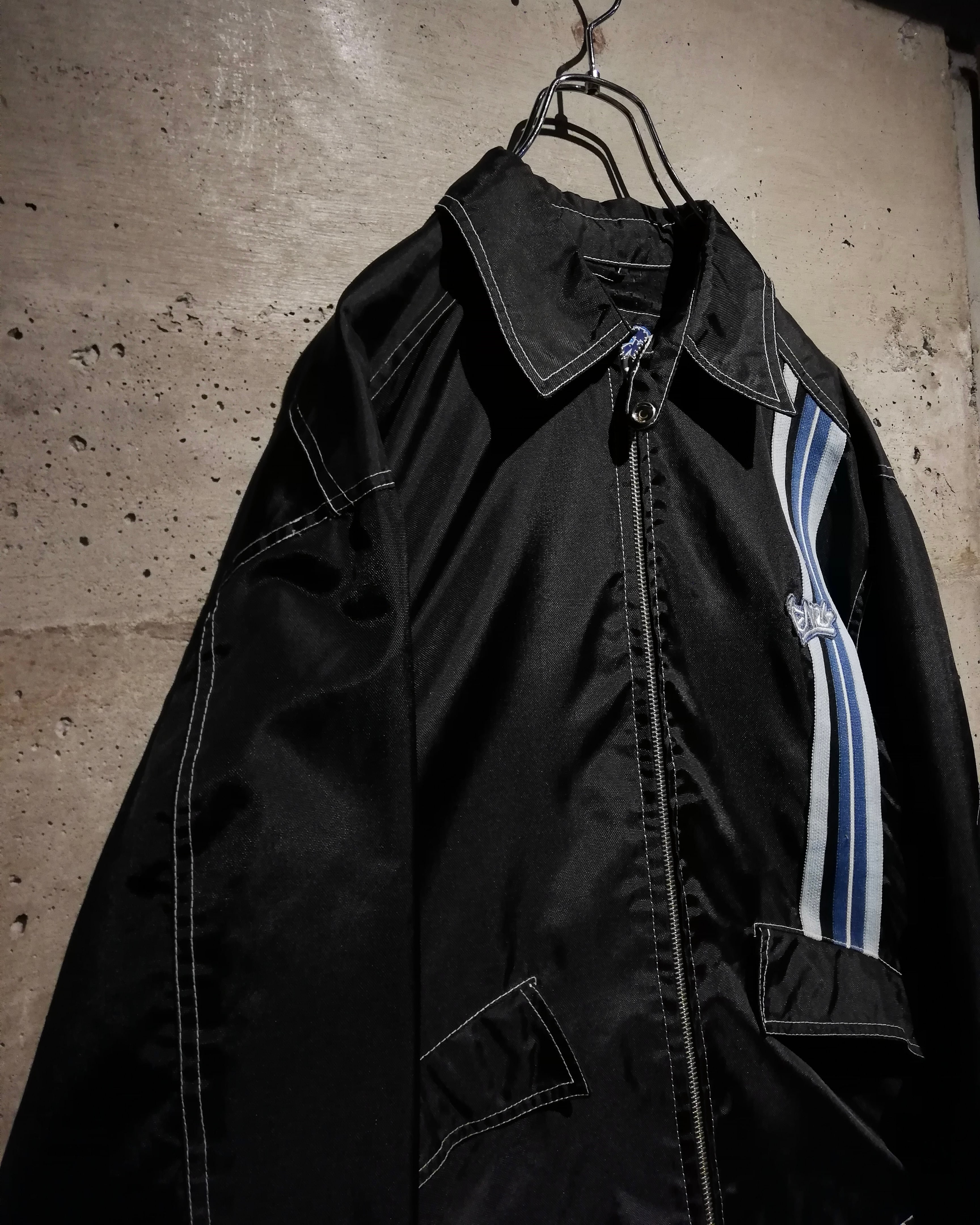 鋭い光沢を放つナイロン素材を用いて、ブラックをベースに水色と青のラインを縦に走らせたジップアップナイロンジャケット。