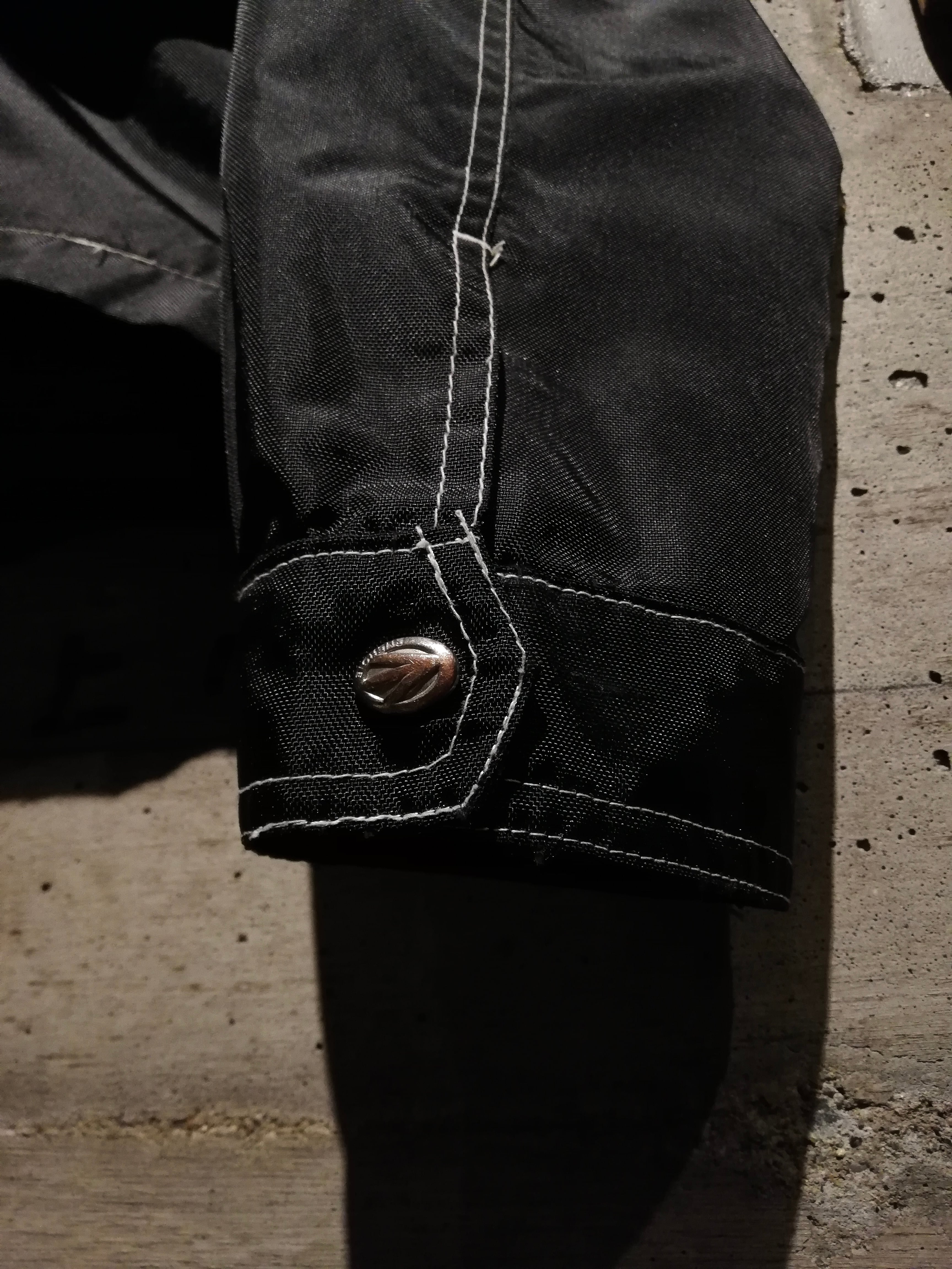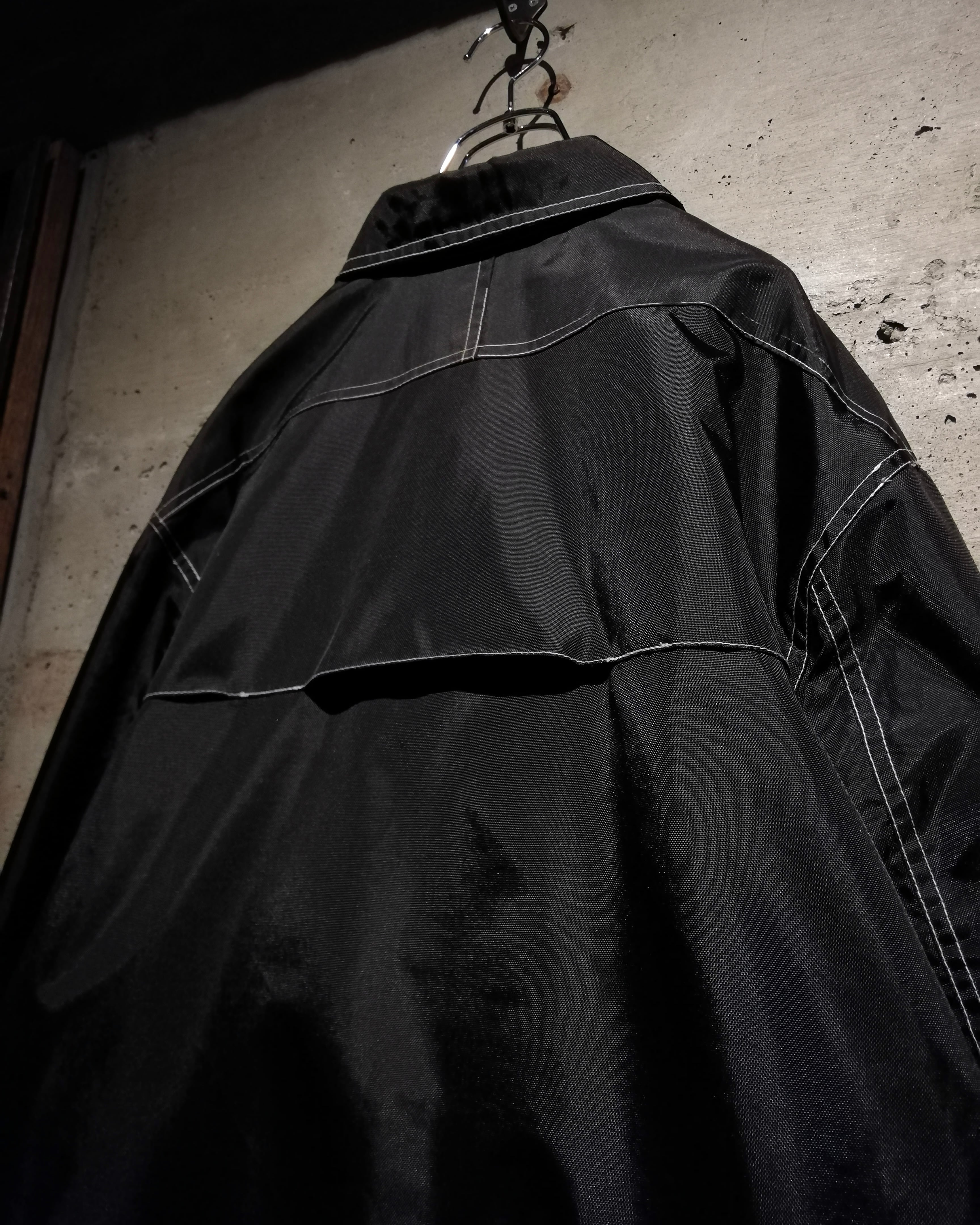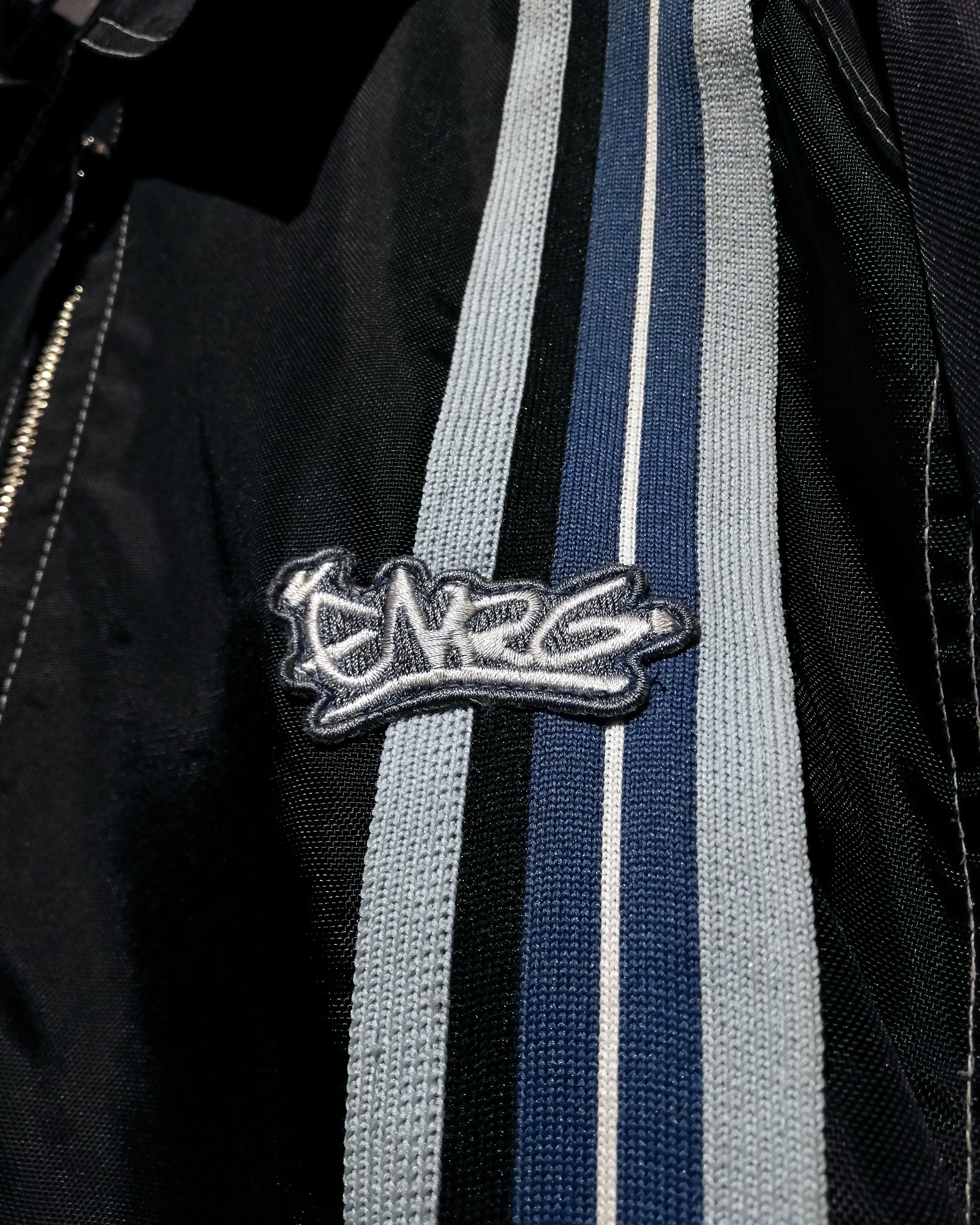 鋭い光沢を放つナイロン素材を用いて、ブラックをベースに水色と青のラインを縦に走らせたジップアップナイロンジャケット。