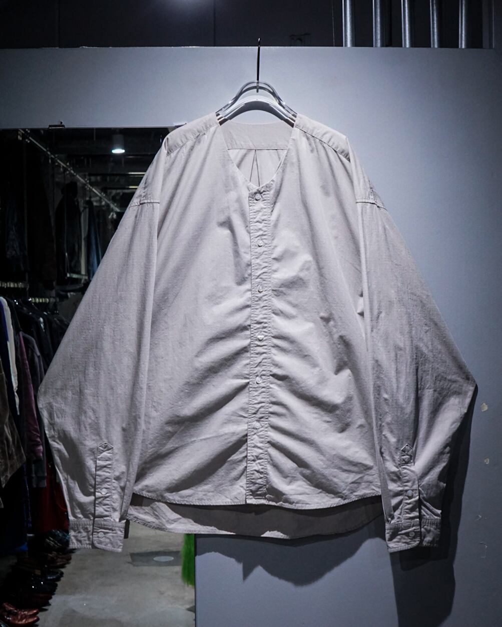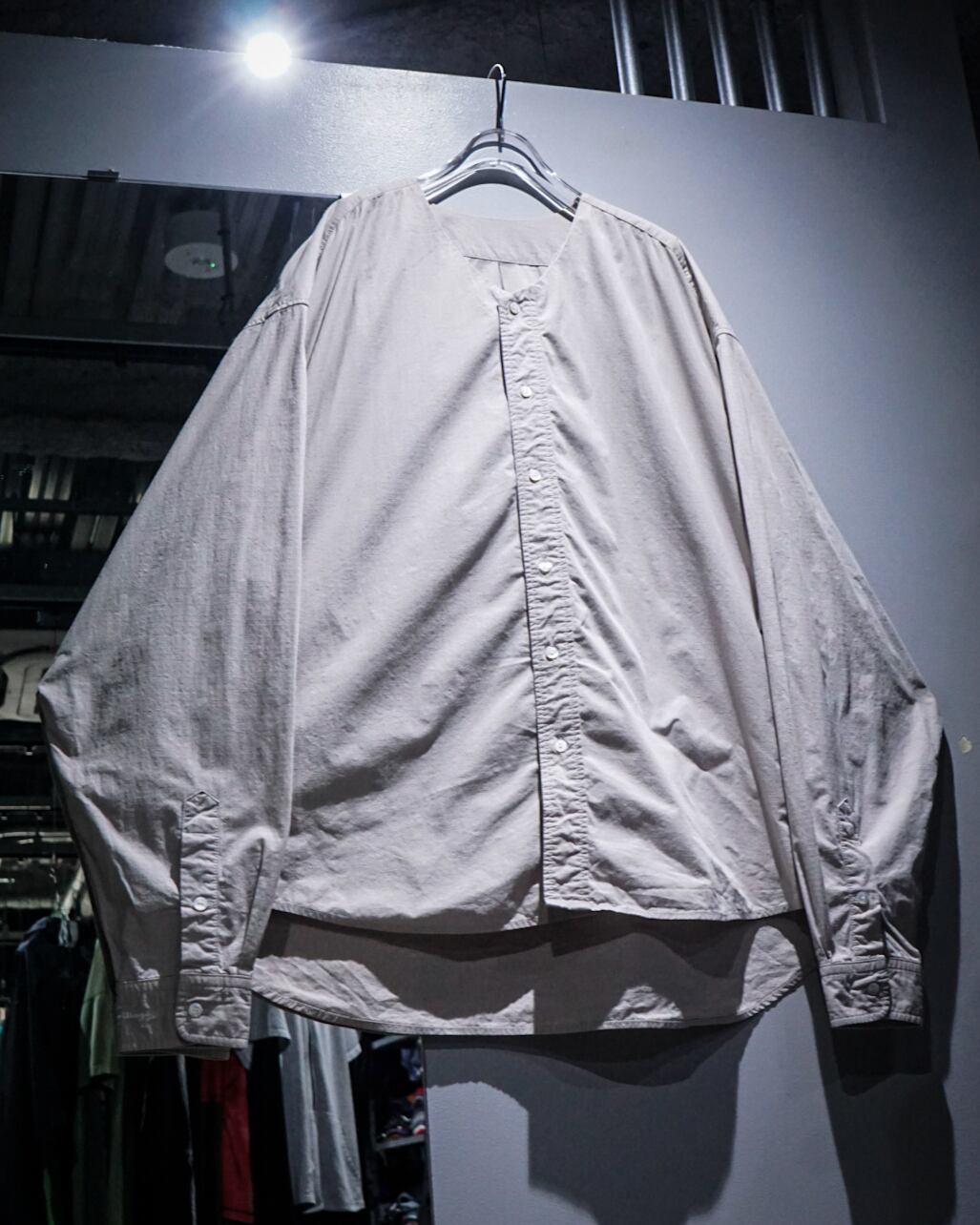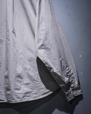 コットン×ナイロンのリップストップ生地を用いたノーカラーシャツ。
