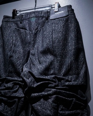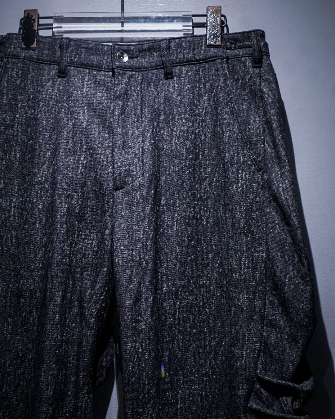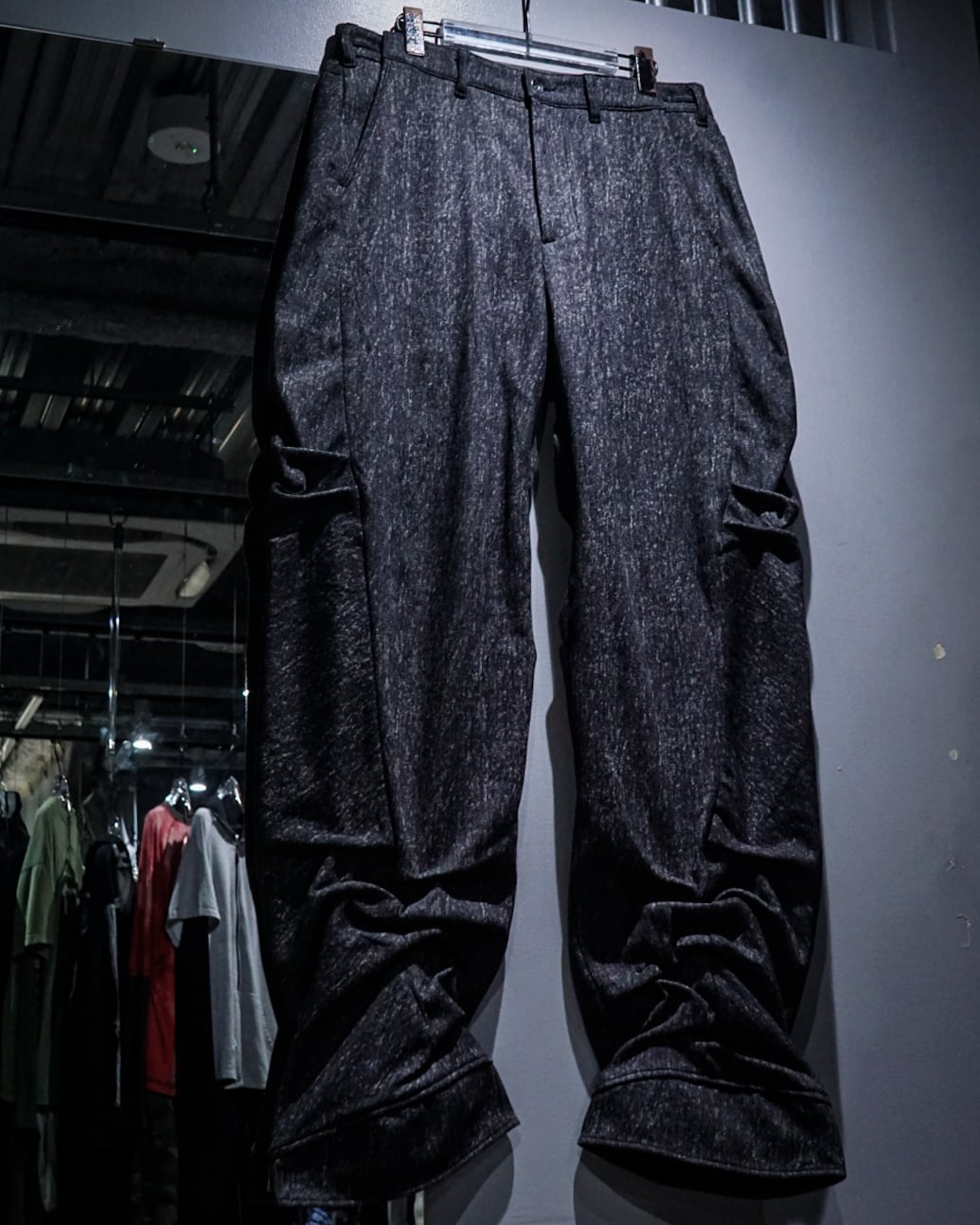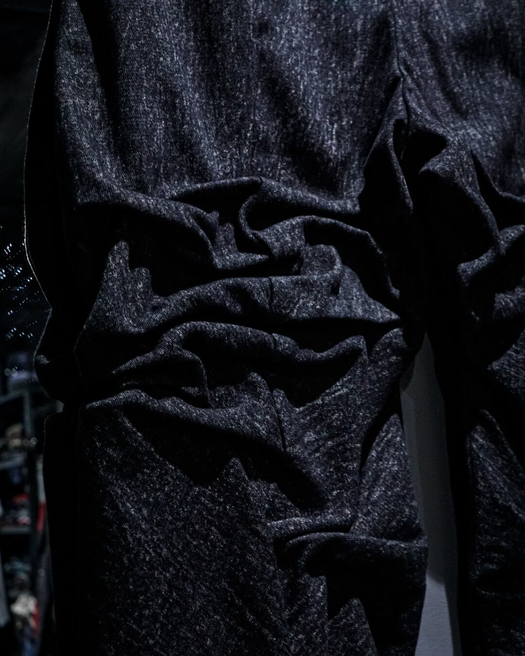 柔らかさとタフさを兼ね備えたデニム生地をベースに、立体的なドレープとねじれのあるシルエットを表現した1着。通常のストレートやワイドにはない造形美が際立ち、デニムでありながらテクニカルかつモードな印象を演出しています。