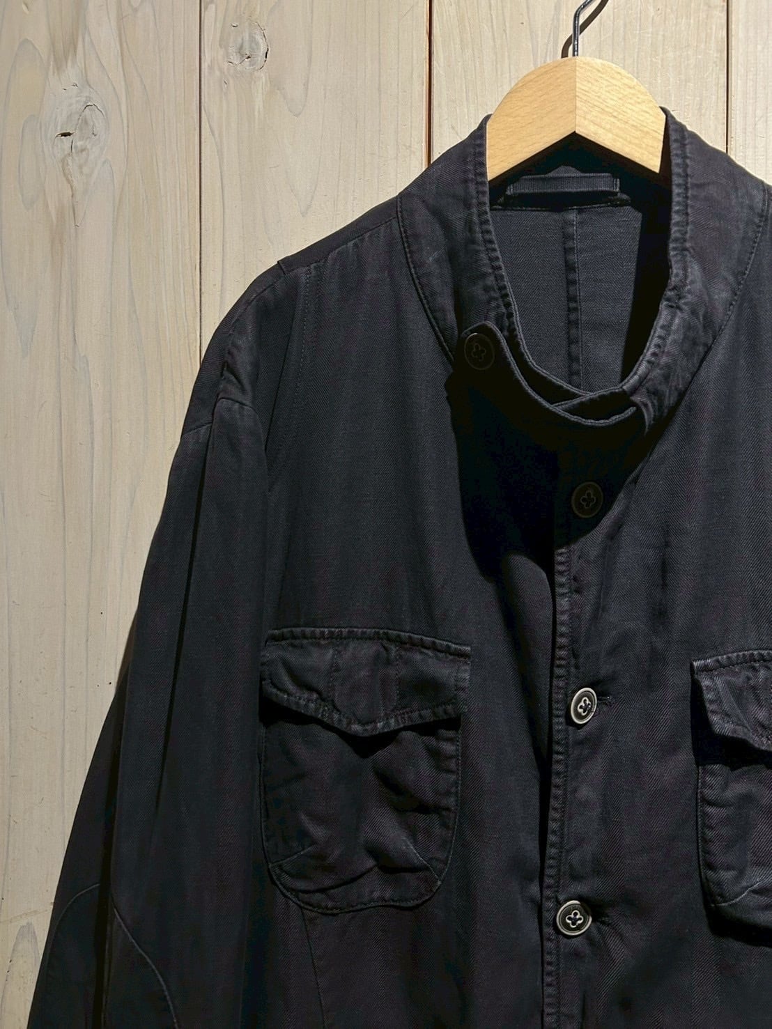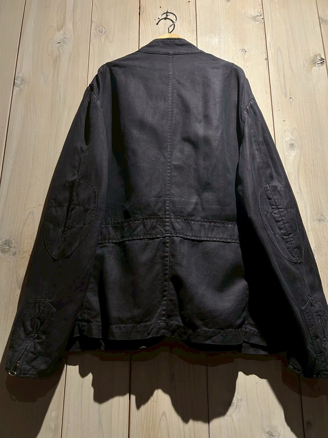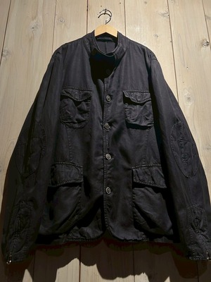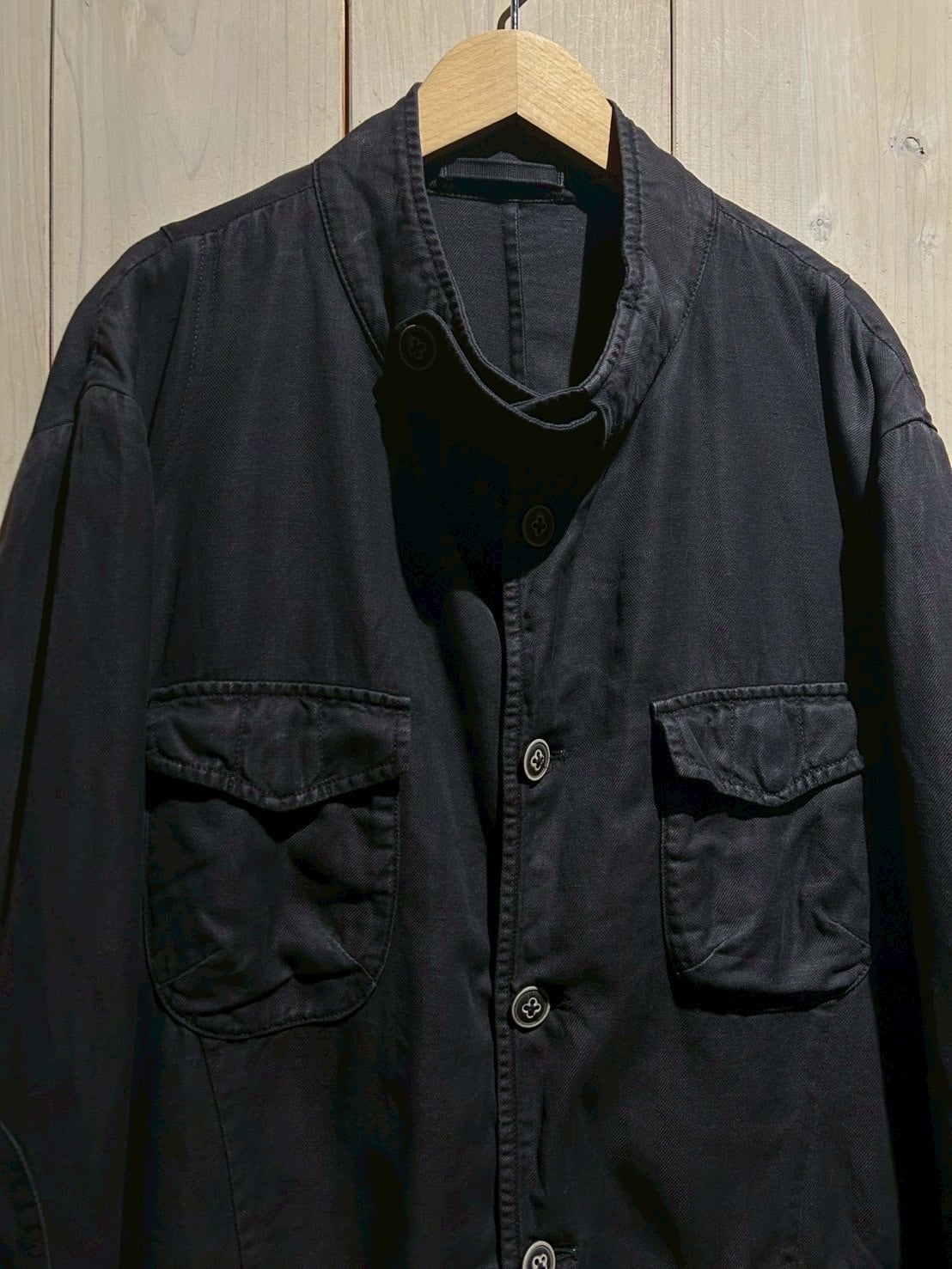 スタンドカラー仕様に加え、フロントにはフラップ付きポケットを4つ配置。袖口にはジップを備え、ワークとミリタリーの要素をミックスしたデザイン。さらに肘にはエルボーパッチを施し、無骨さと実用性をしっかり両立しています。