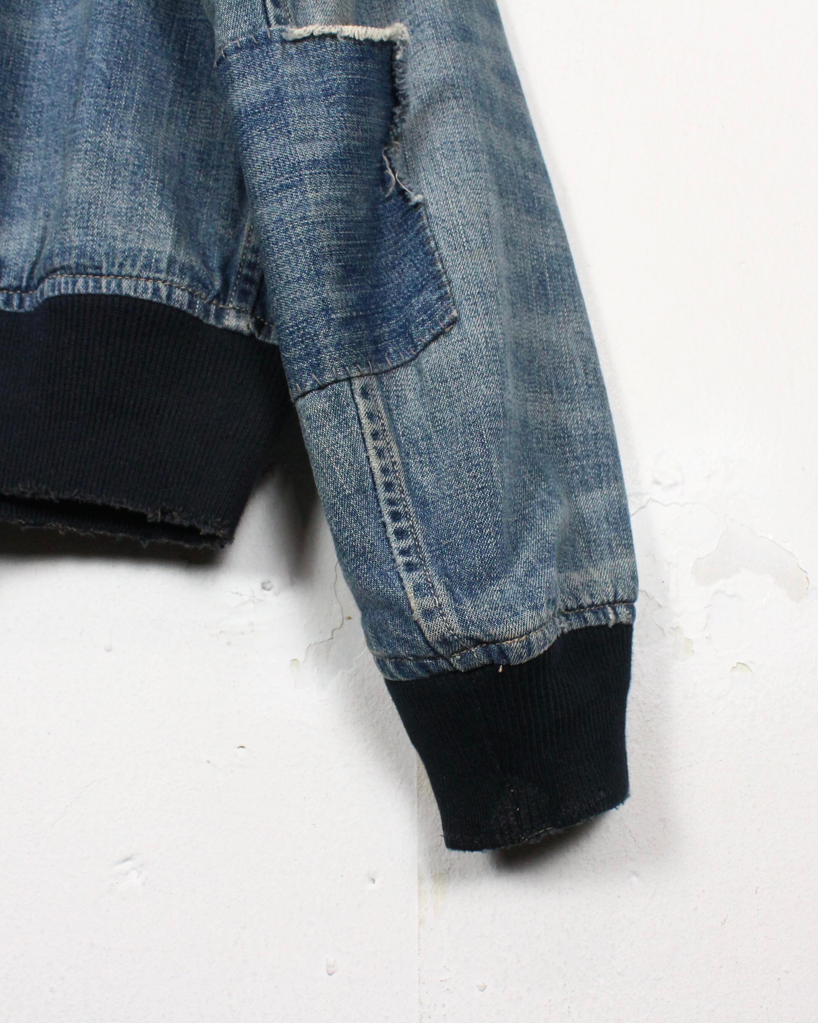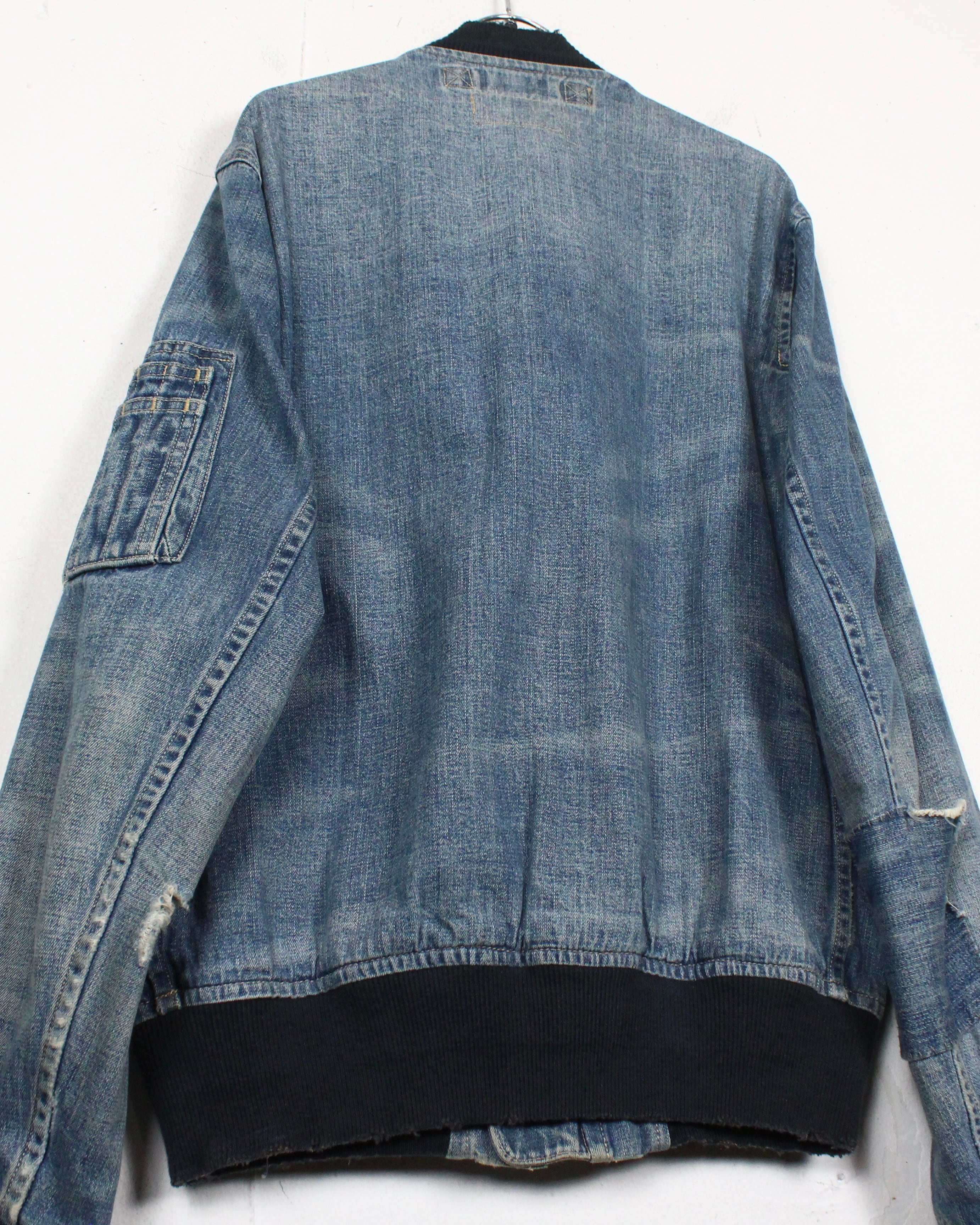 ユーティリティポケットやリブ切替えなど、MA-1らしいディテールをしっかり押さえながら、デニム素材で構築することで唯一無二の存在感を放ちます。さらに、ダメージやリペアの要素が加わることで、古着的な要素とファッション性を見事に両立。