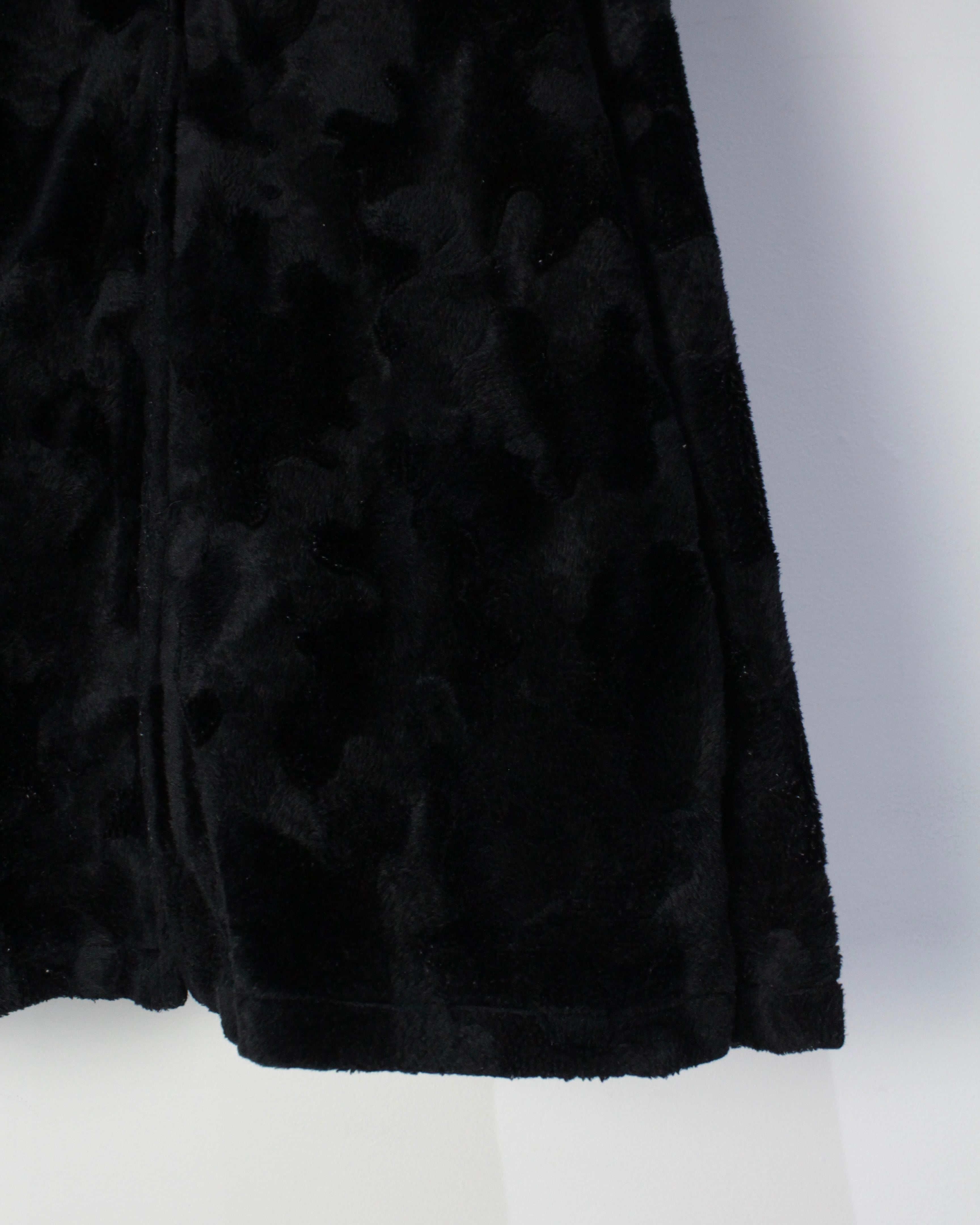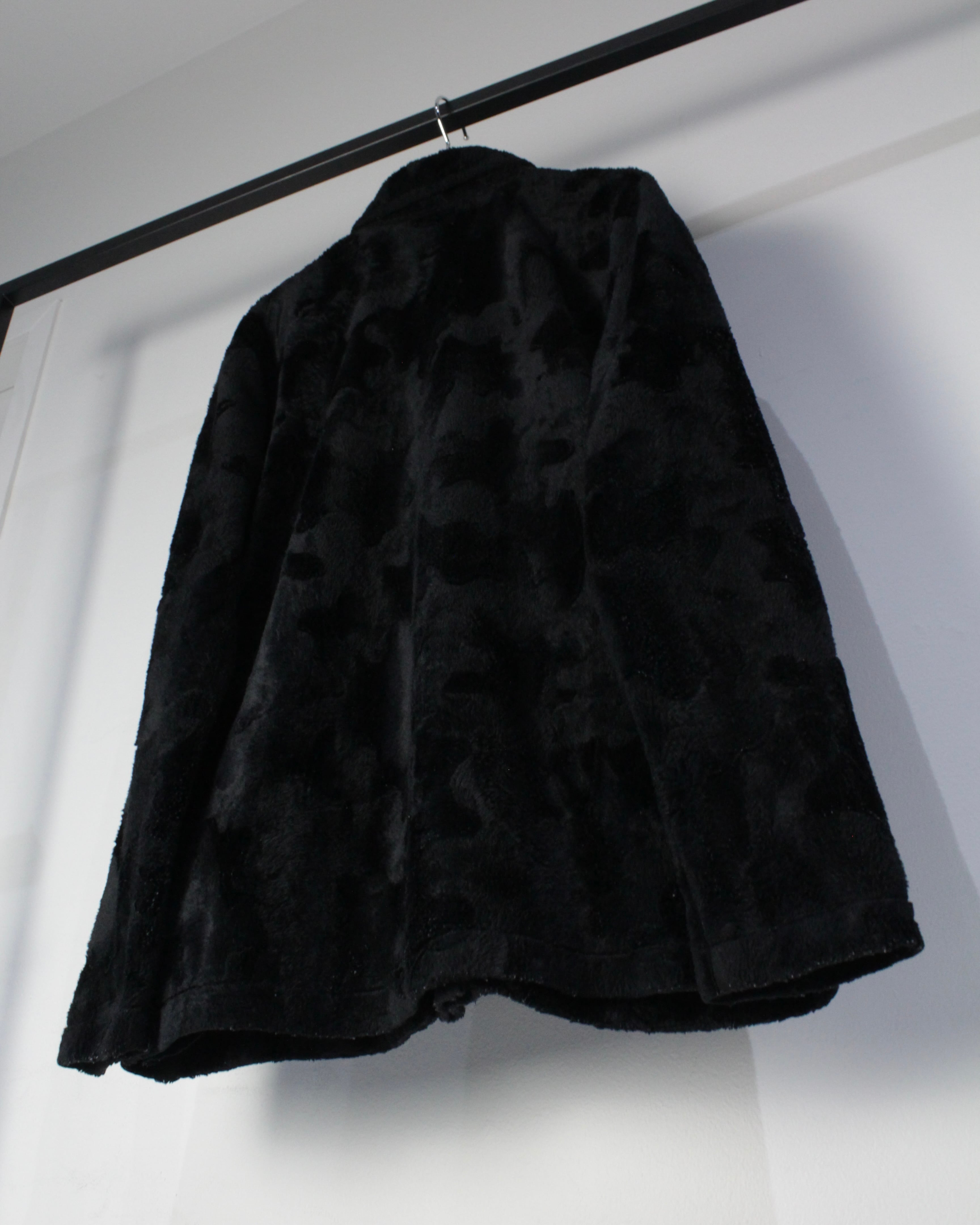 毛並みのような柔らかい質感は、触れた瞬間に伝わるなめらかさと程よい厚みを持ち、着る者に高揚感を与えてくれます。光の当たり方によって微妙に濃淡が浮かび上がり、深い黒の奥行きが静かに主張。単なる無地ではなく、まるで陰影を纏ったような存在感が漂います。