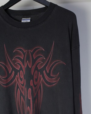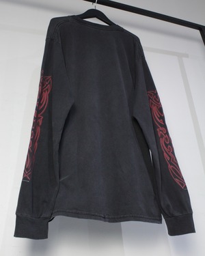 一枚でスタイリングの主役になる存在感を放つ、モードとストリートを繋ぐ当店らしいトライバルグラフィックロンTです。