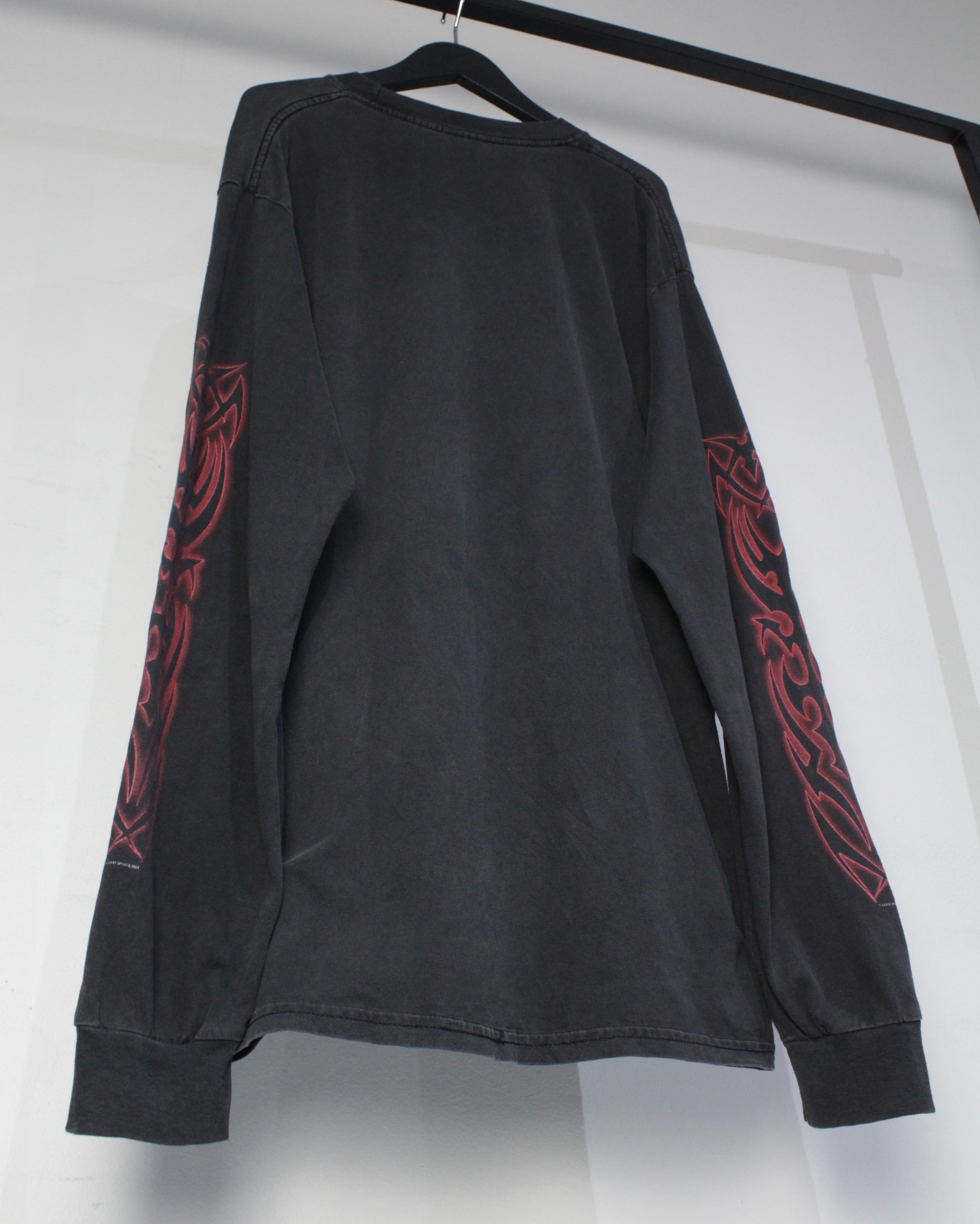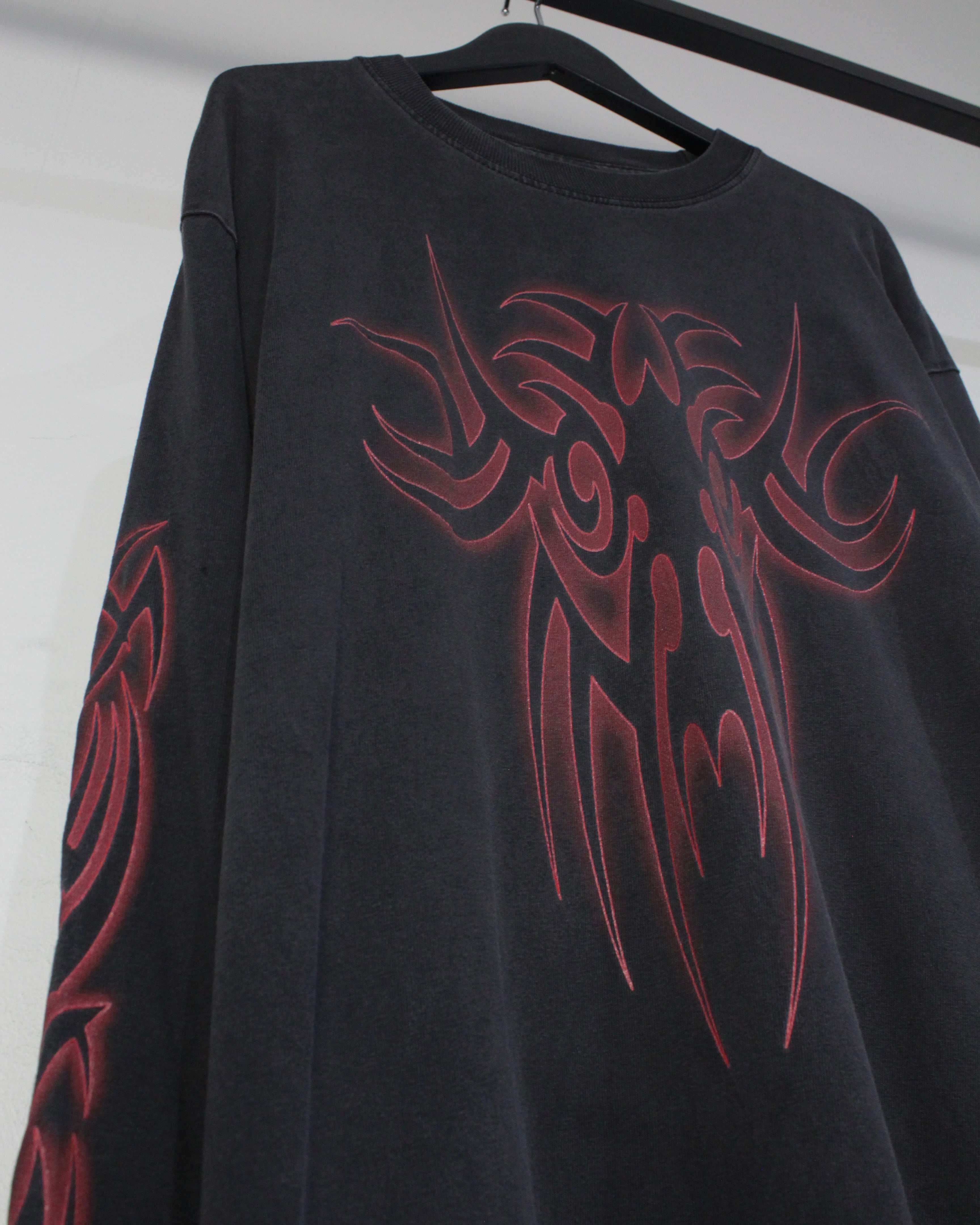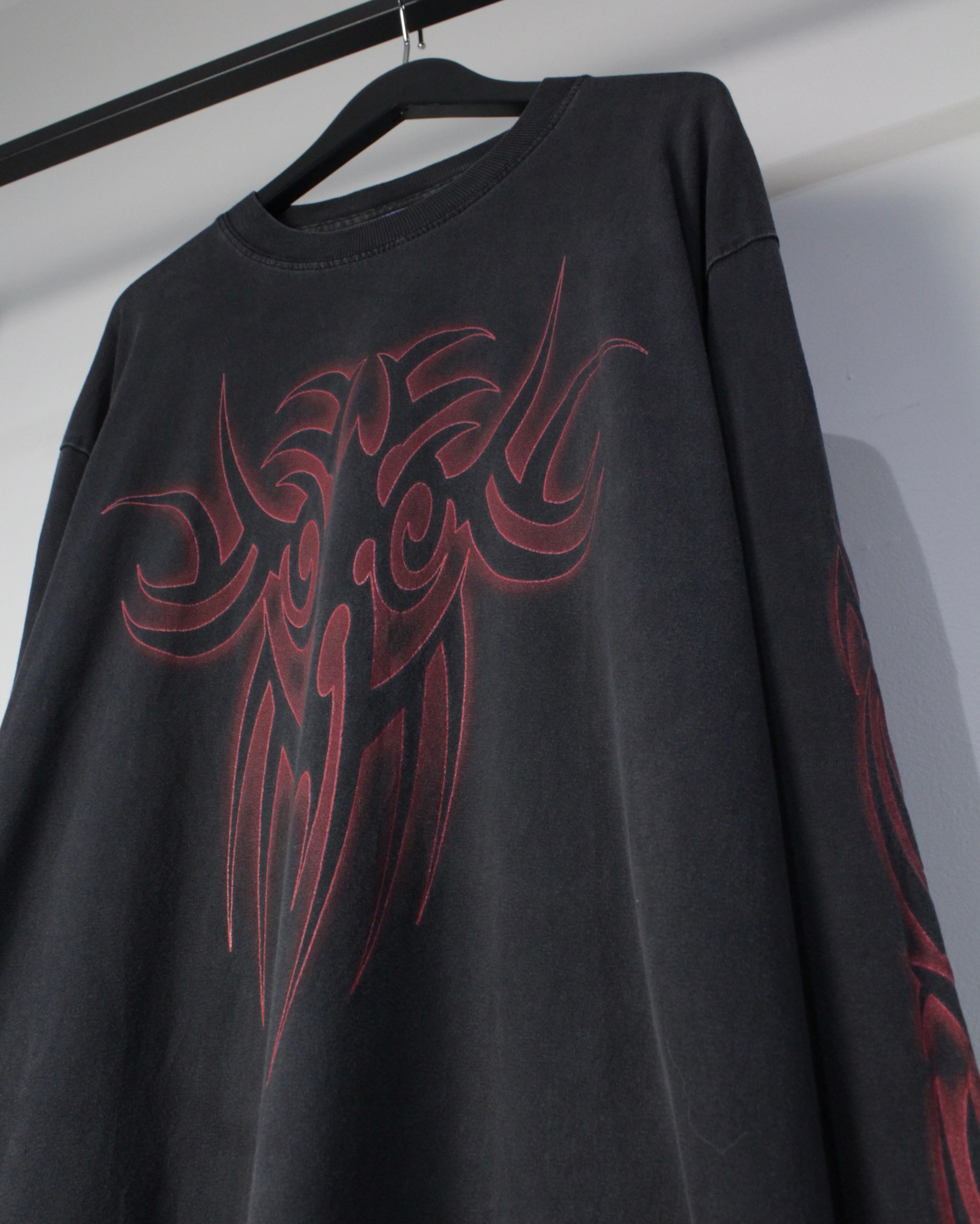 ブラックのボディに浮かび上がるのは、赤で描かれたトライバルのグラフィック。フロント中央に大きく鎮座し、両袖にも大胆にプリントが走るデザインは、当時のストリートシーンやY2K的なモード感を彷彿とさせます。