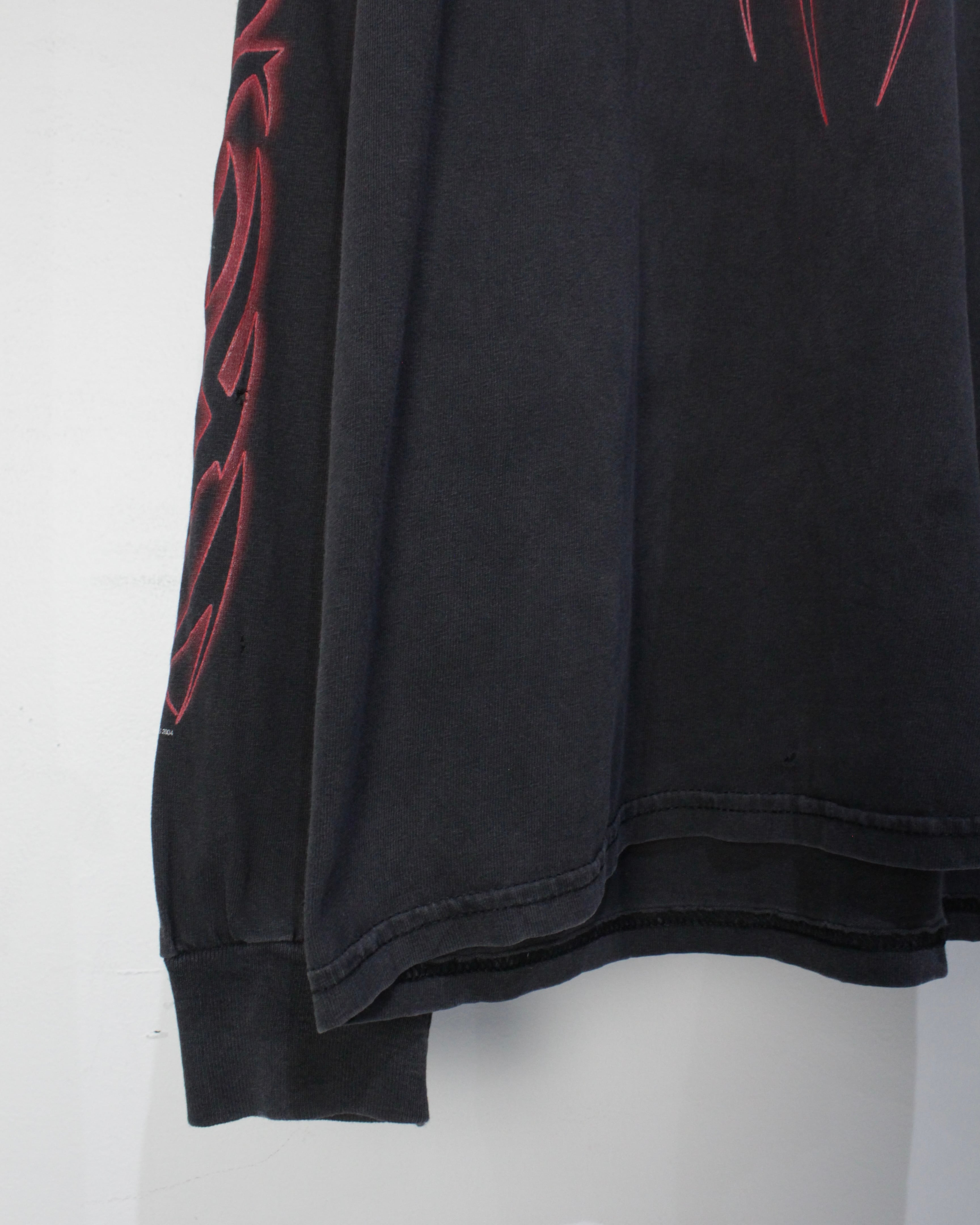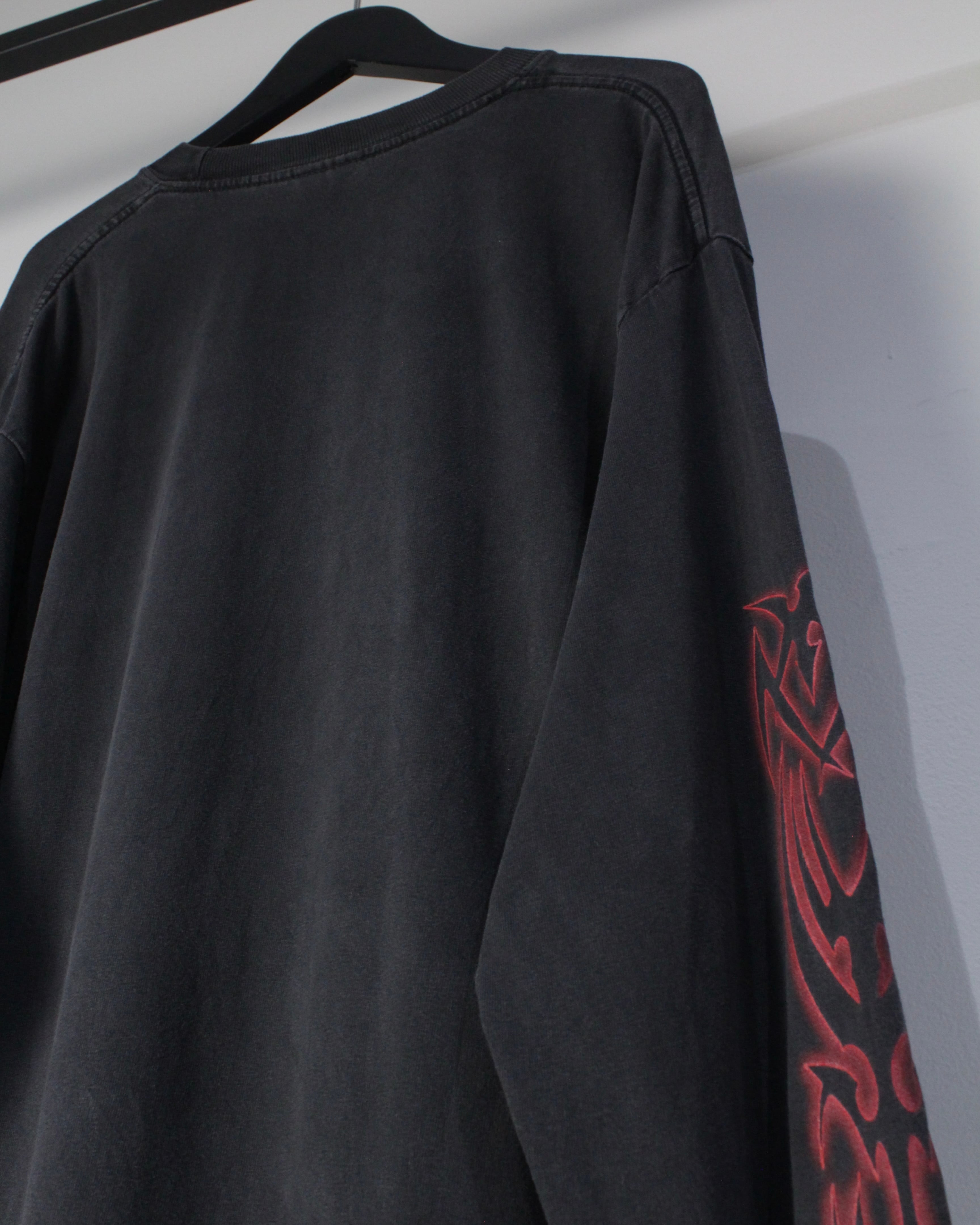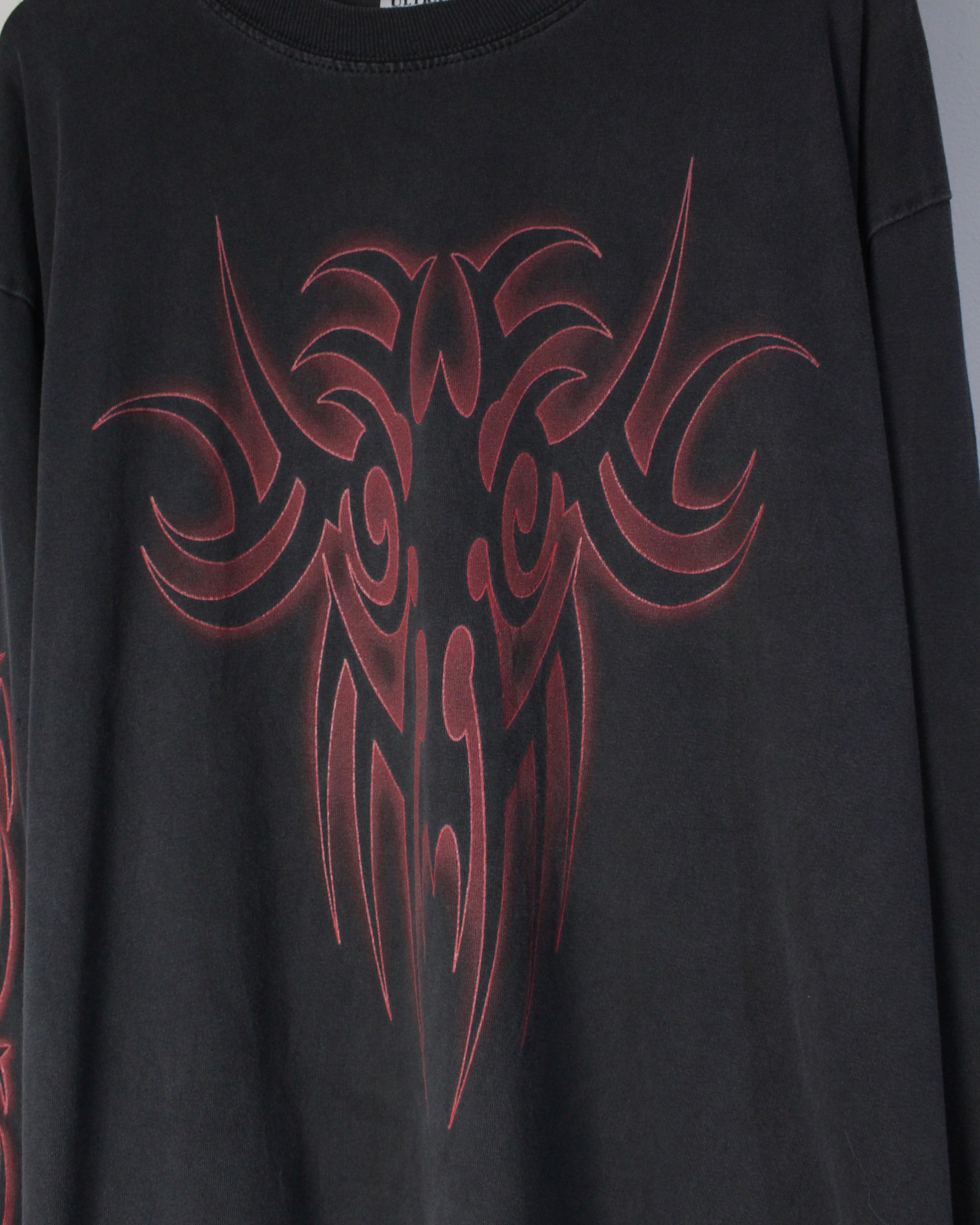 ブラックのボディに浮かび上がるのは、赤で描かれたトライバルのグラフィック。フロント中央に大きく鎮座し、両袖にも大胆にプリントが走るデザインは、当時のストリートシーンやY2K的なモード感を彷彿とさせます。