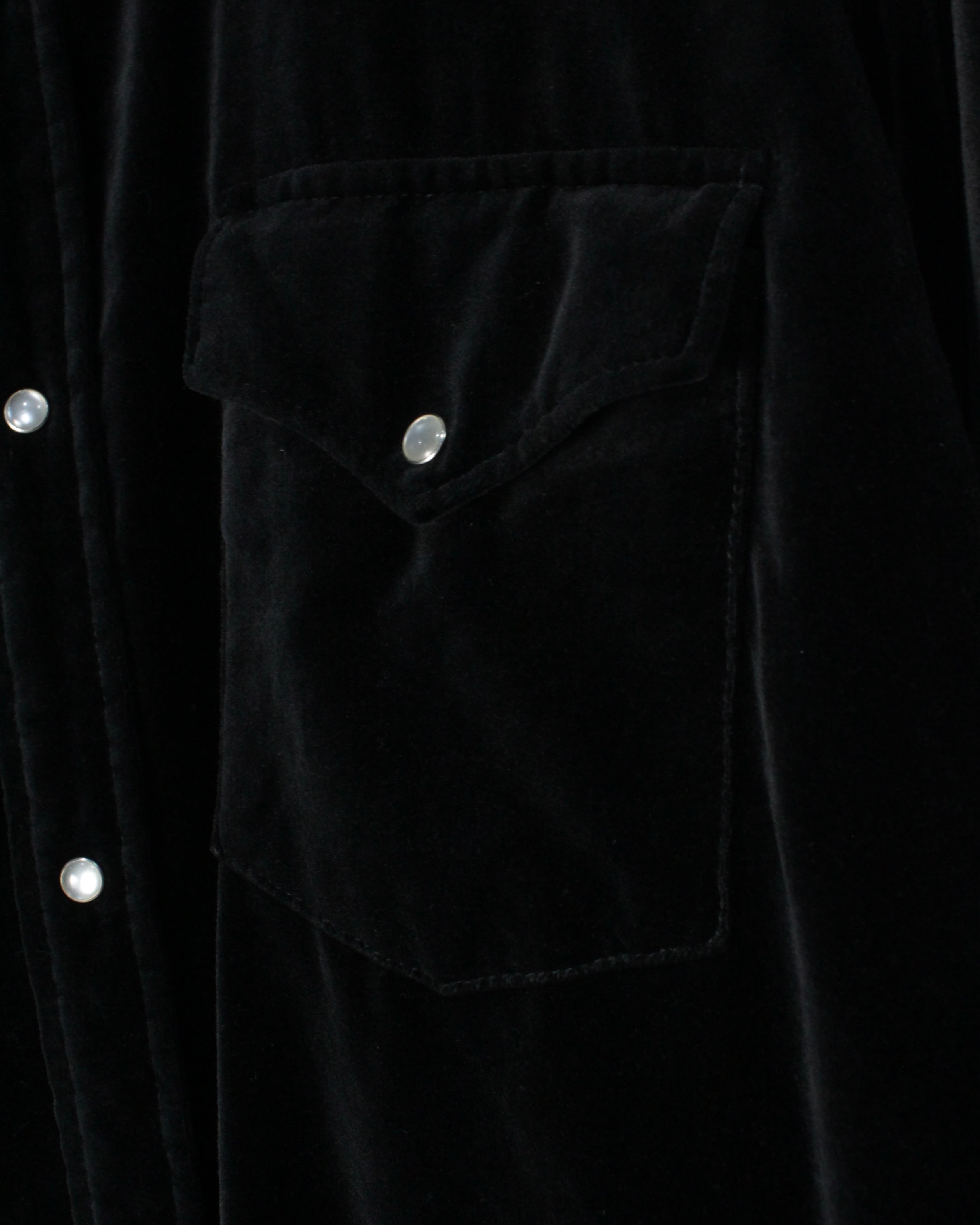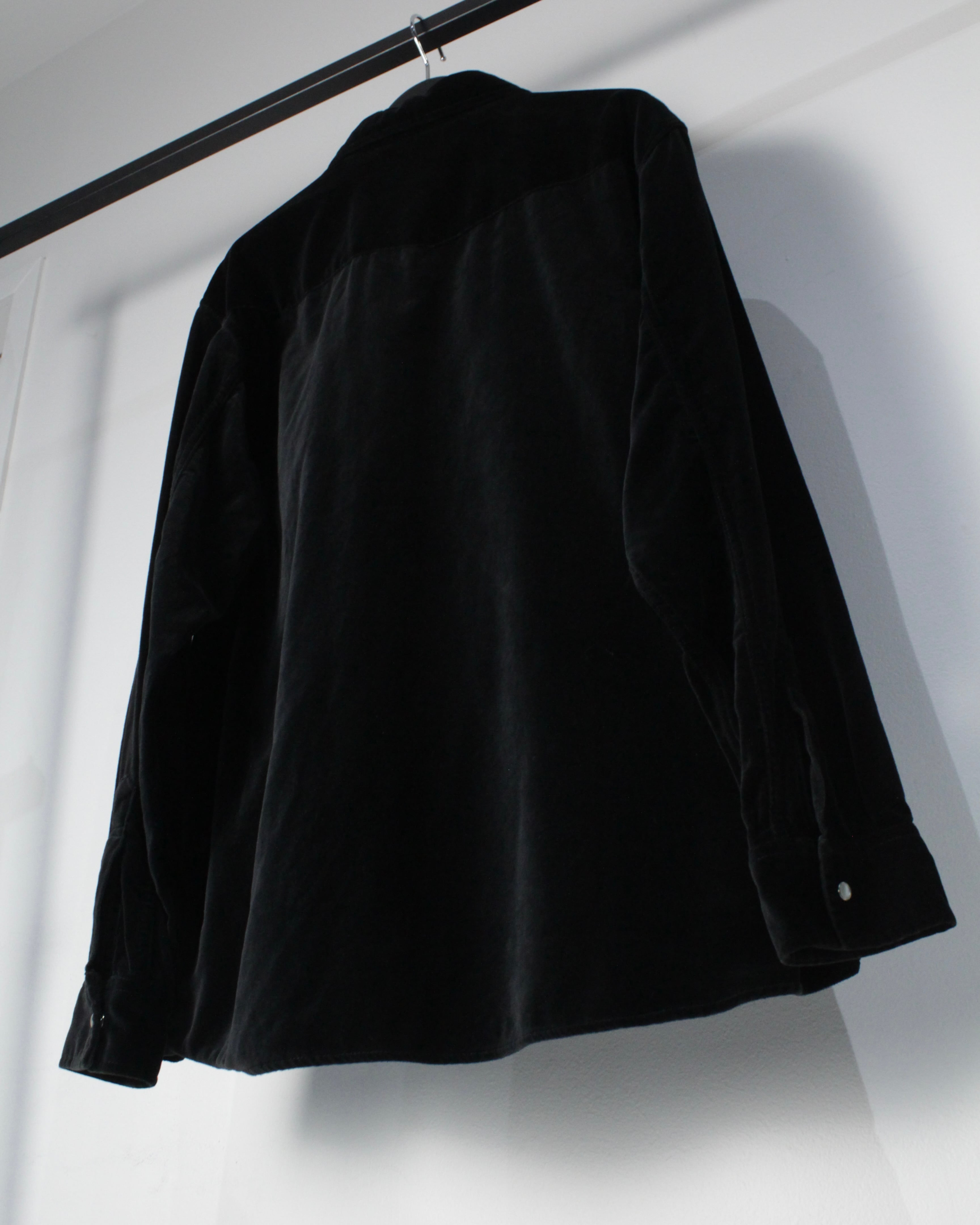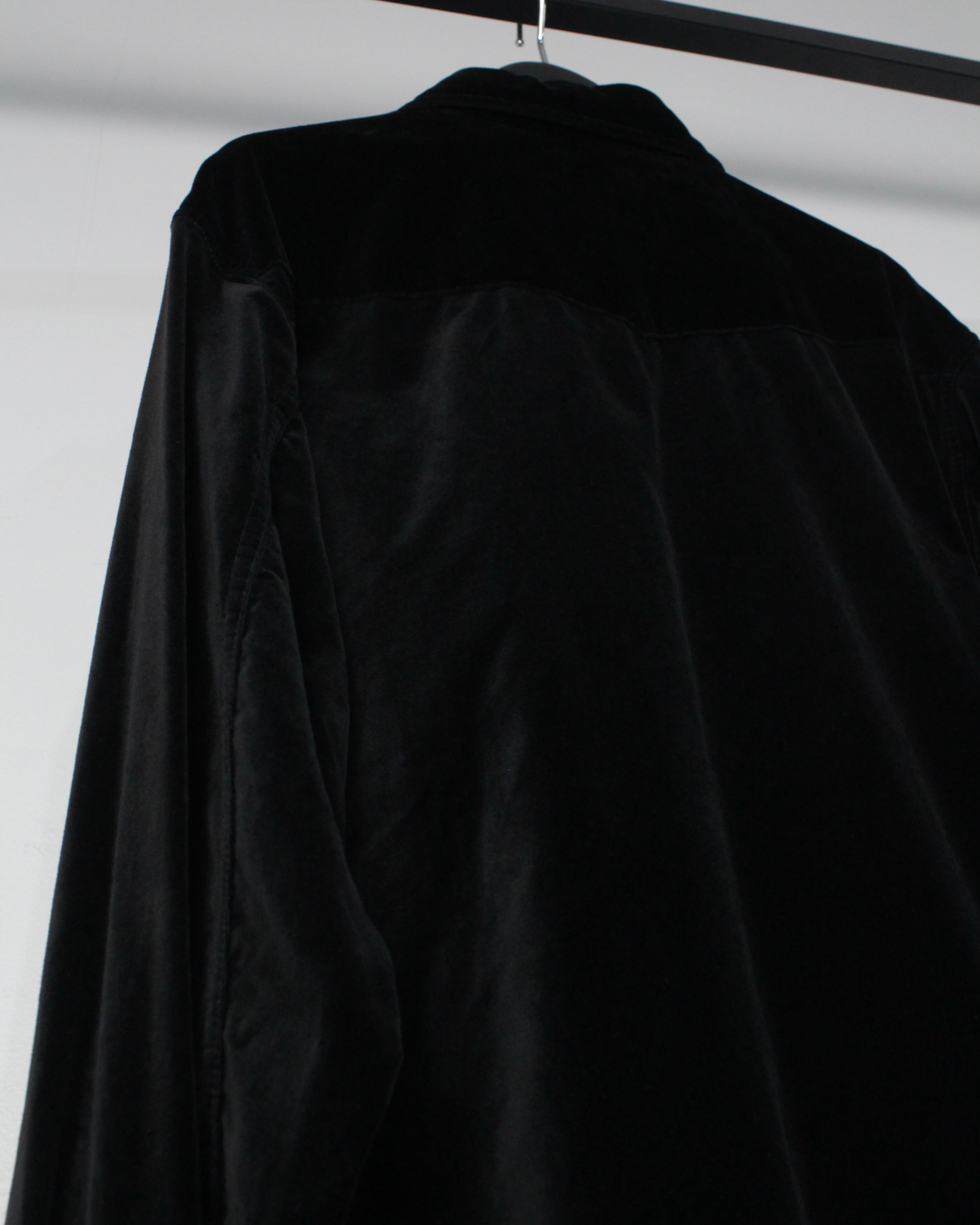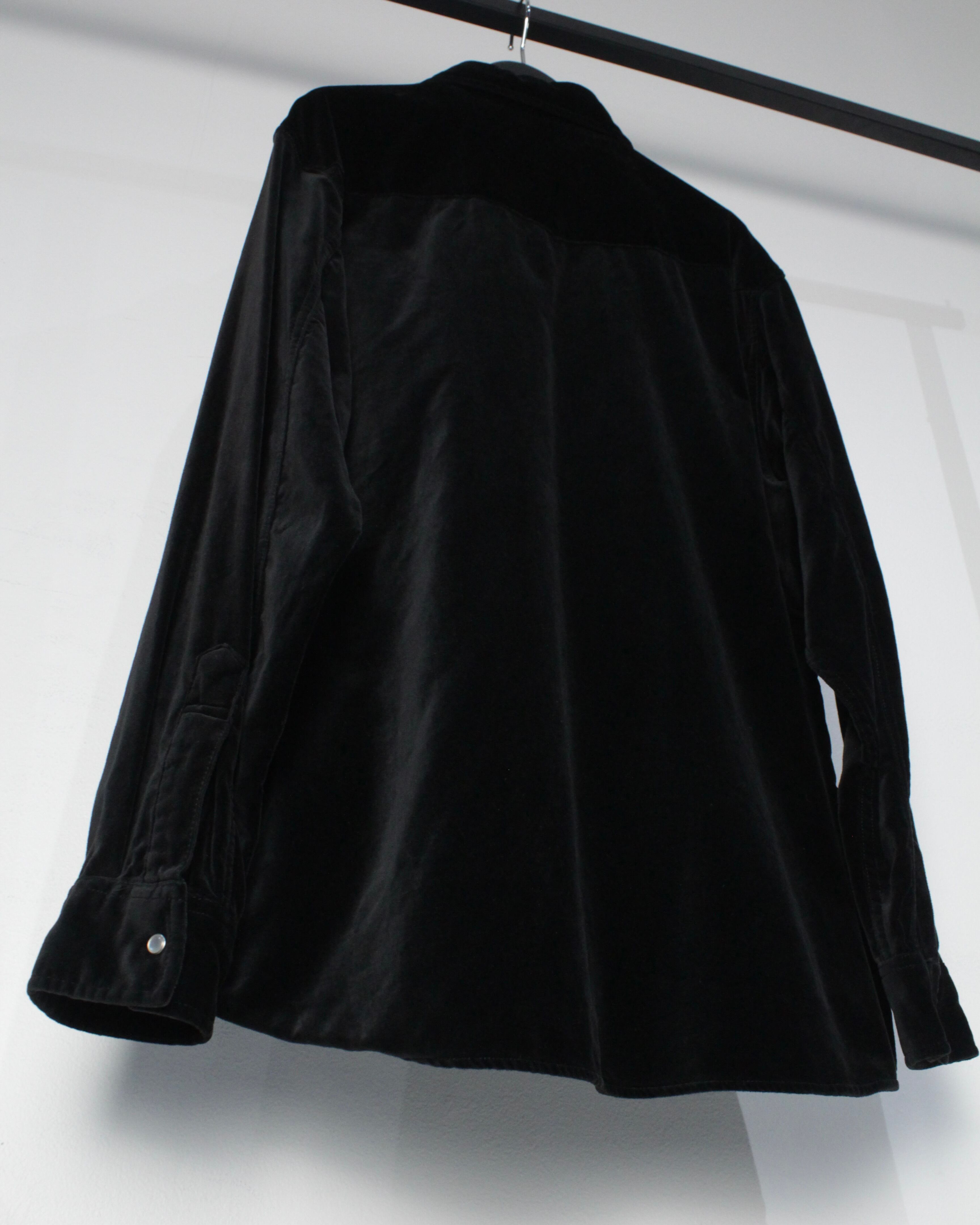 光の加減で鈍く光沢を放つ上質なブラックベロアを採用したトラッカージャケット。