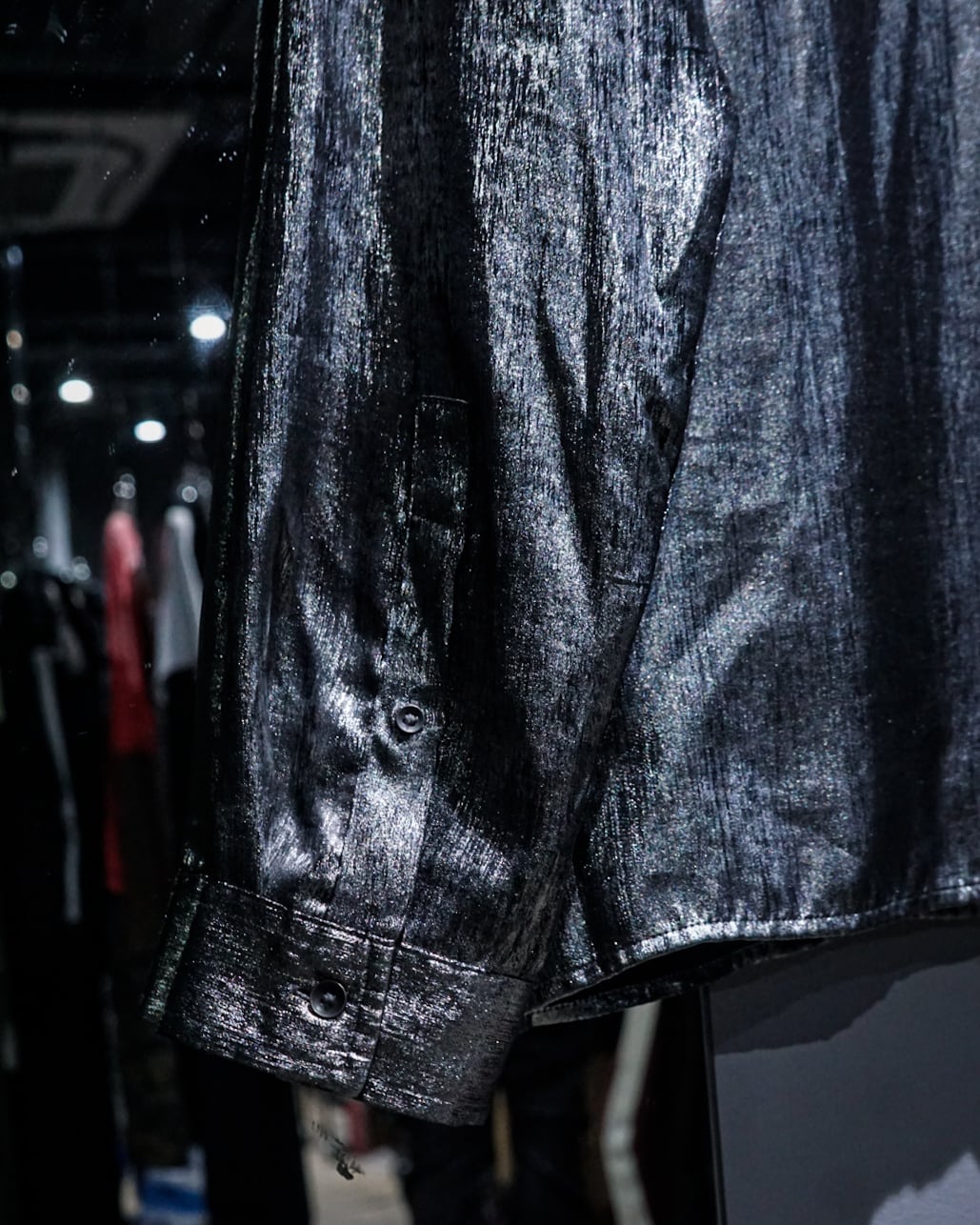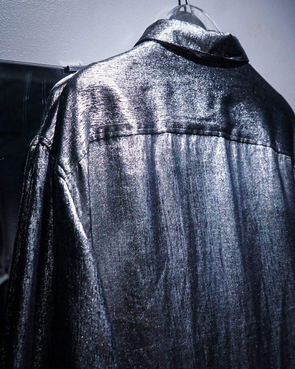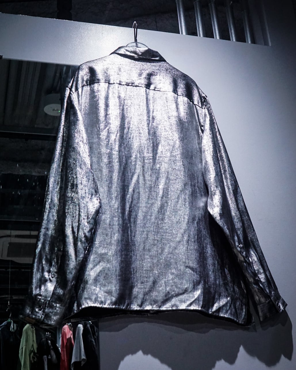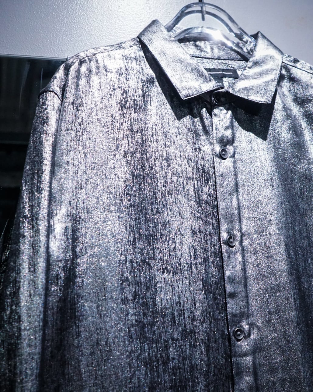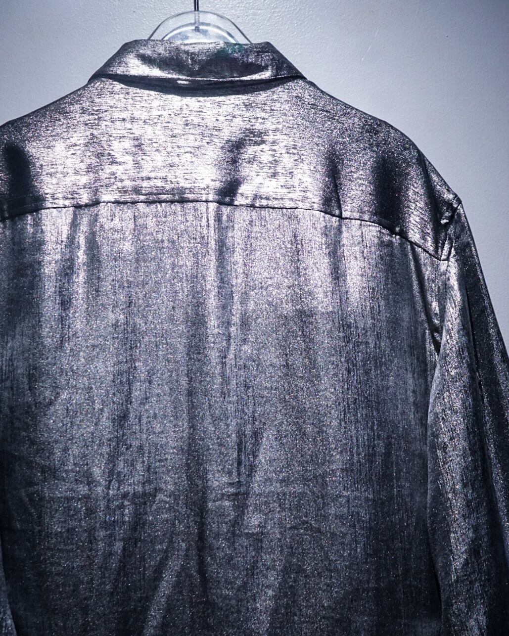 メタリックシルバーのテキスタイルを用いた、稀有な長袖シャツ。