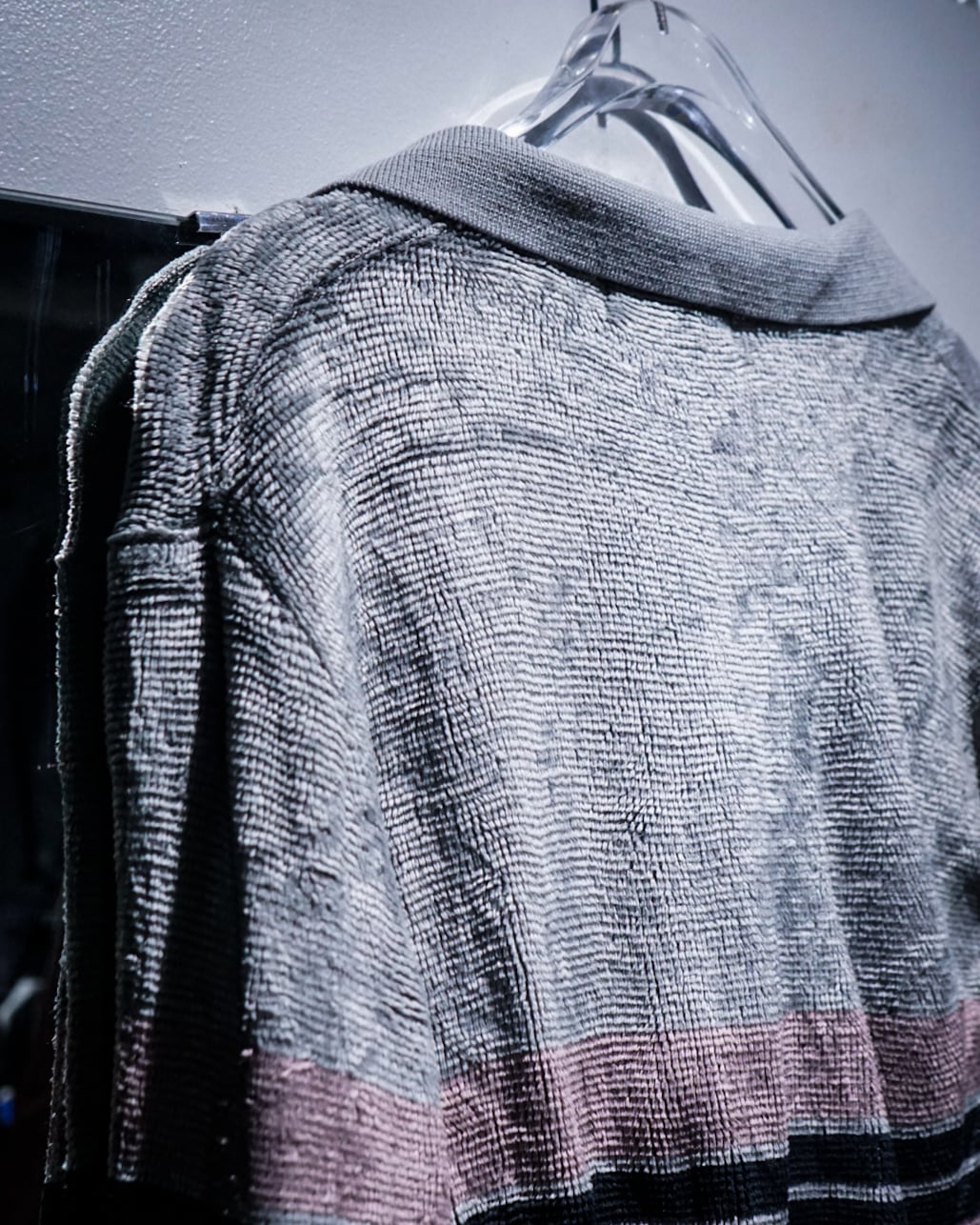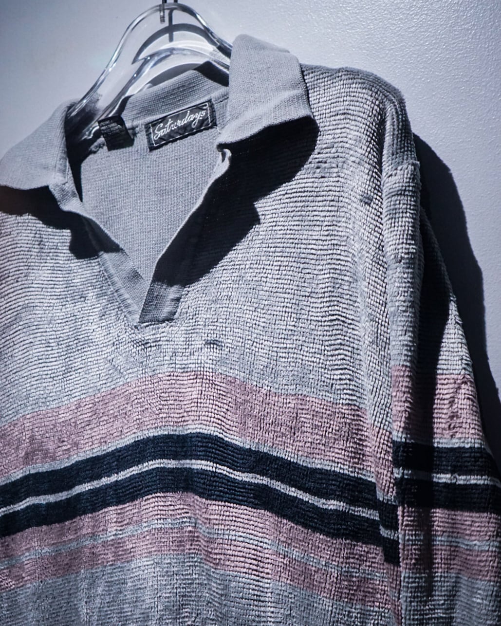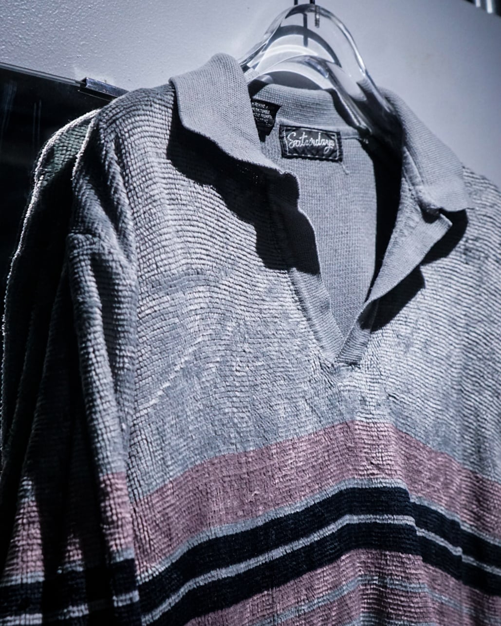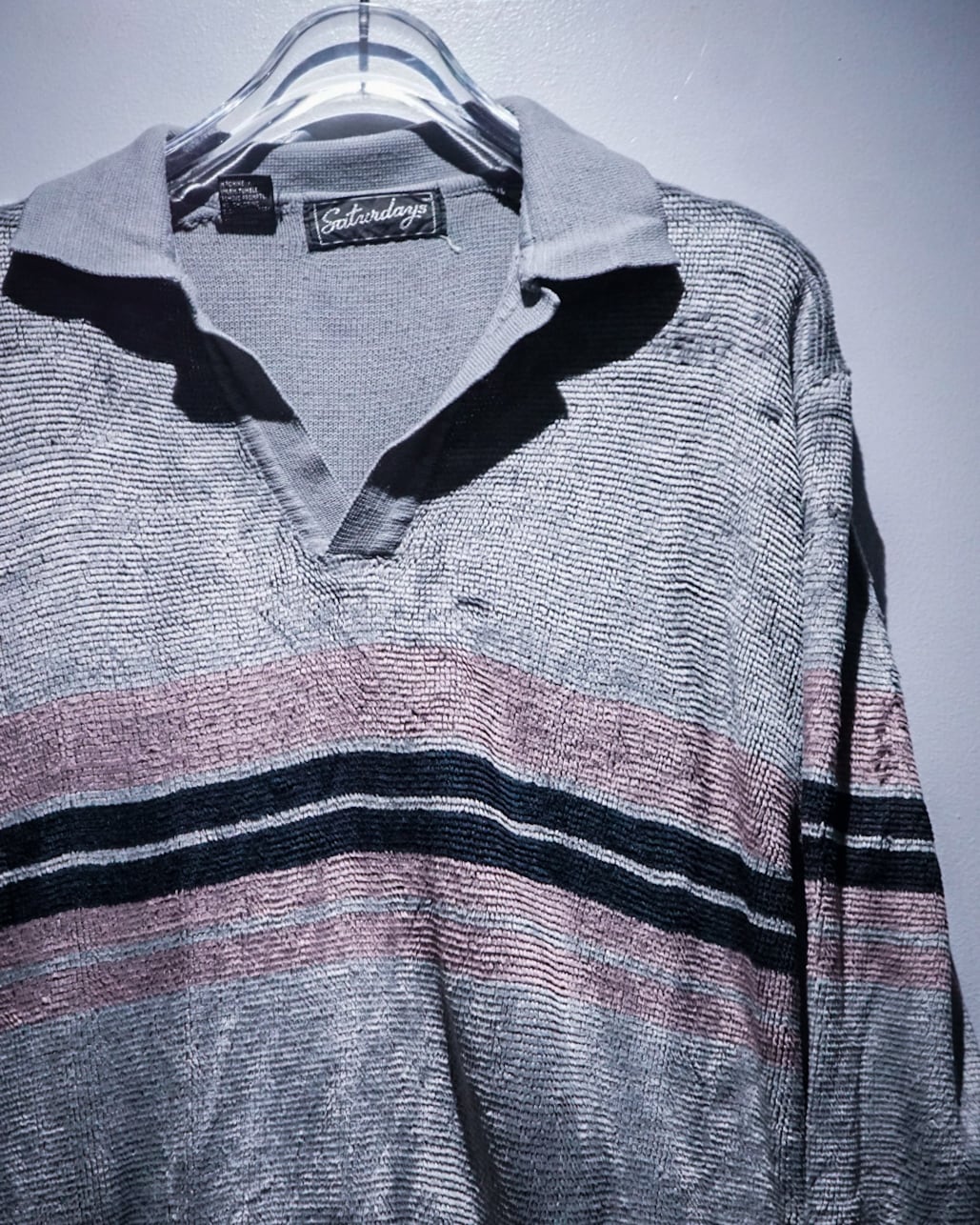 起毛感のあるグレーベースに、胸元を横断するピンク×ブラックのラインを配したレトロなデザイン。スキッパー襟の抜け感が程良いリラックスムードを演出しつつ、古着ならではの深みある表情を持った1着に仕上がっています。