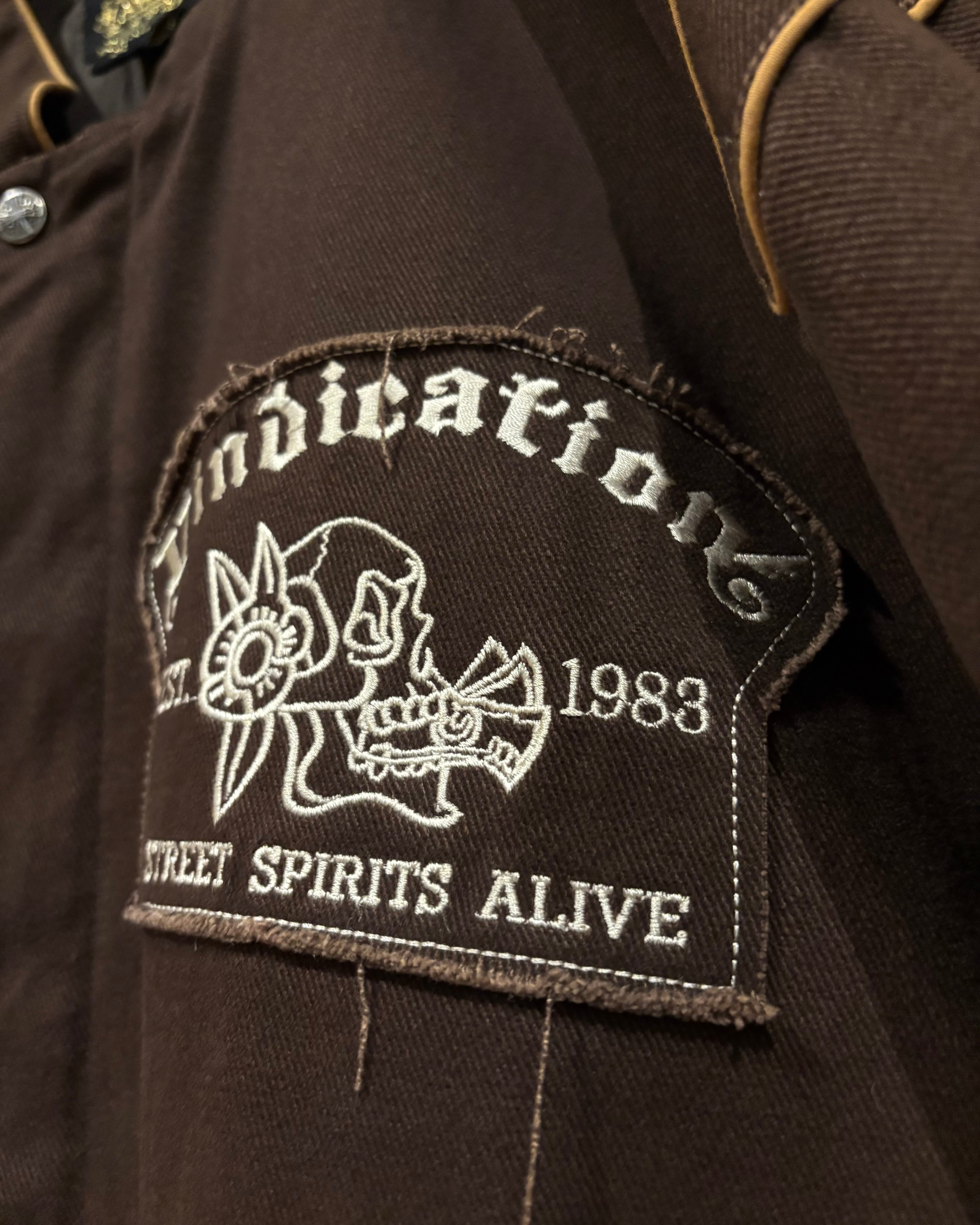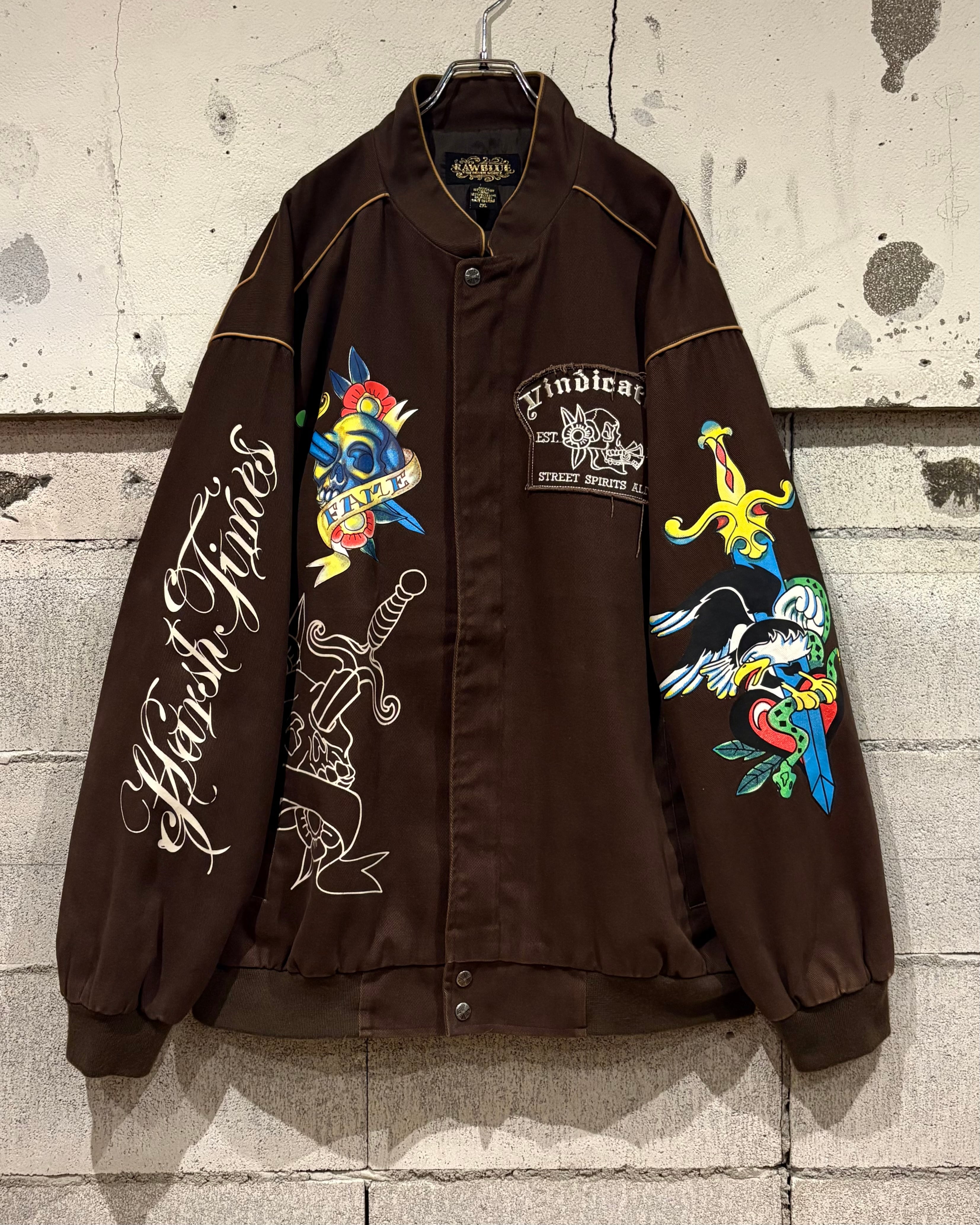 コットンツイルを用いたダークブラウンのボディに、フロントから背面、アームに至るまで大胆に落とし込まれたオールドスクールなタトゥーデザイン。スカルやフレイム、ダガー、ローズなど、ストリートカルチャーを象徴するモチーフがふんだんにあしらわれ、唯一無二の存在感を放ちます。