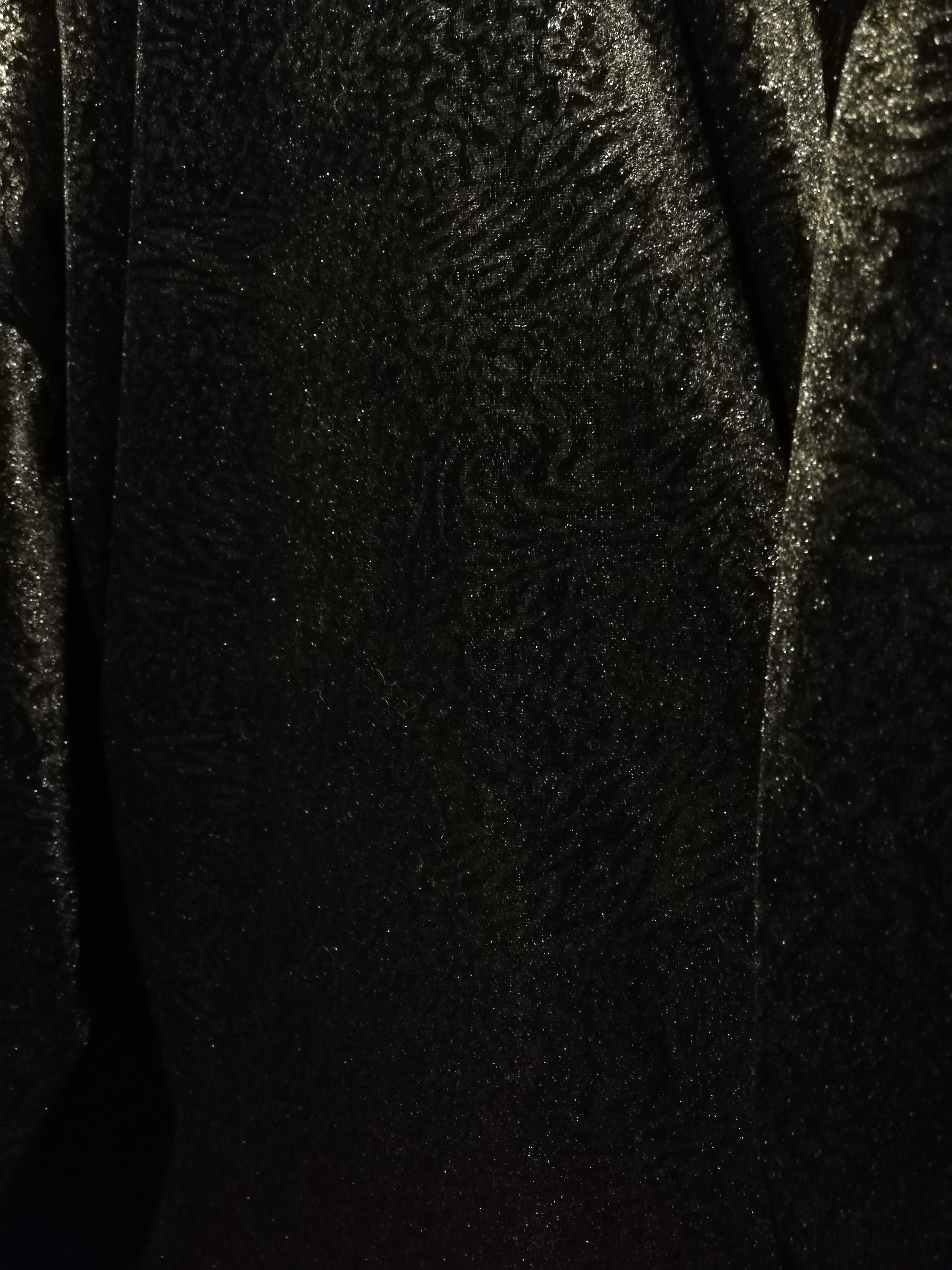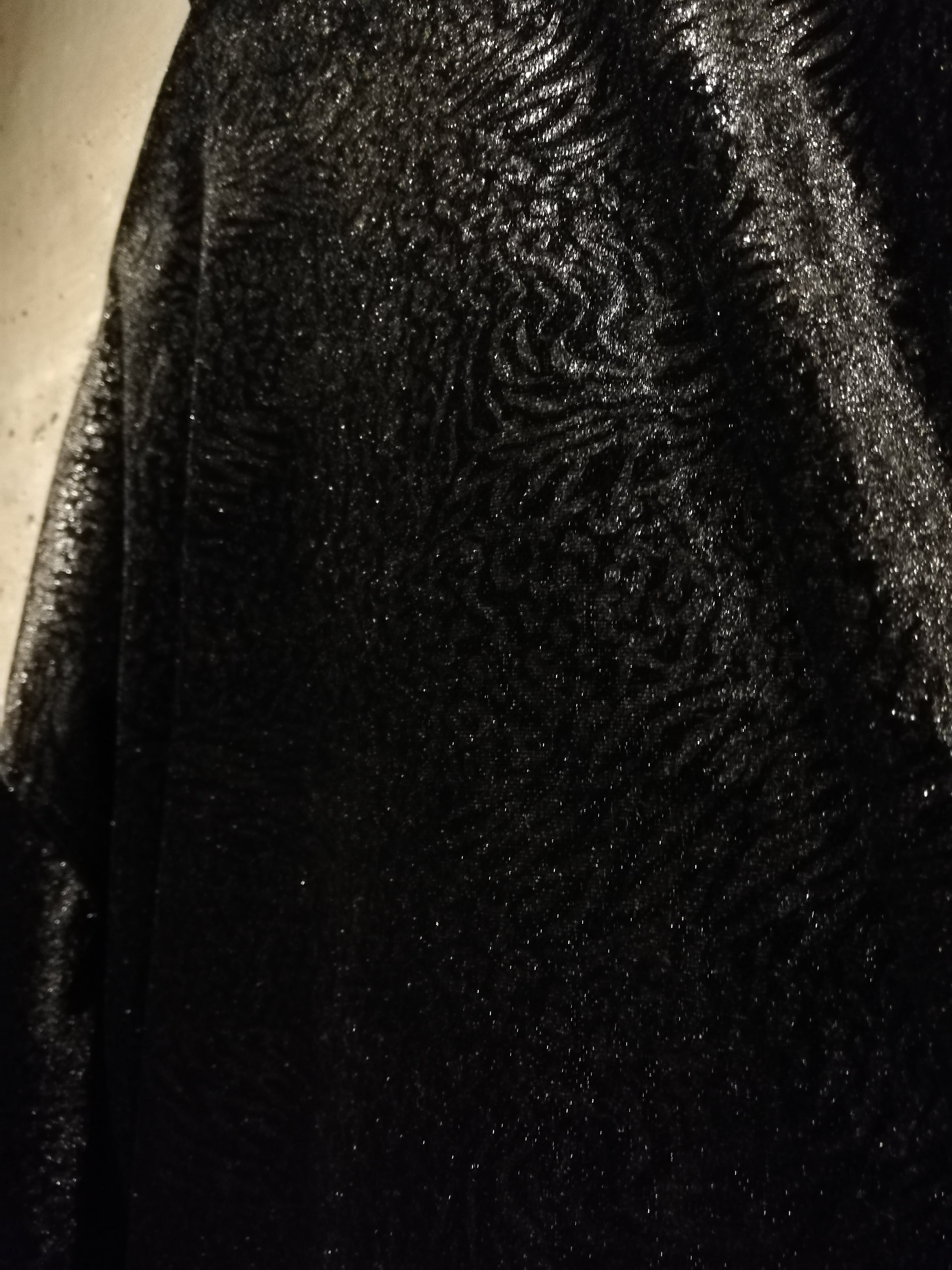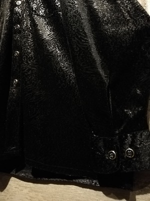 ボディ全体に施された模様は、虎の毛並みや木目を思わせるデザインで、角度や光の当たり方によって陰影が浮かび上がり、奥行きのある表情を演出します。ベロア特有の艶と相まって、ラグジュアリーかつ妖艶な雰囲気を纏う一枚。