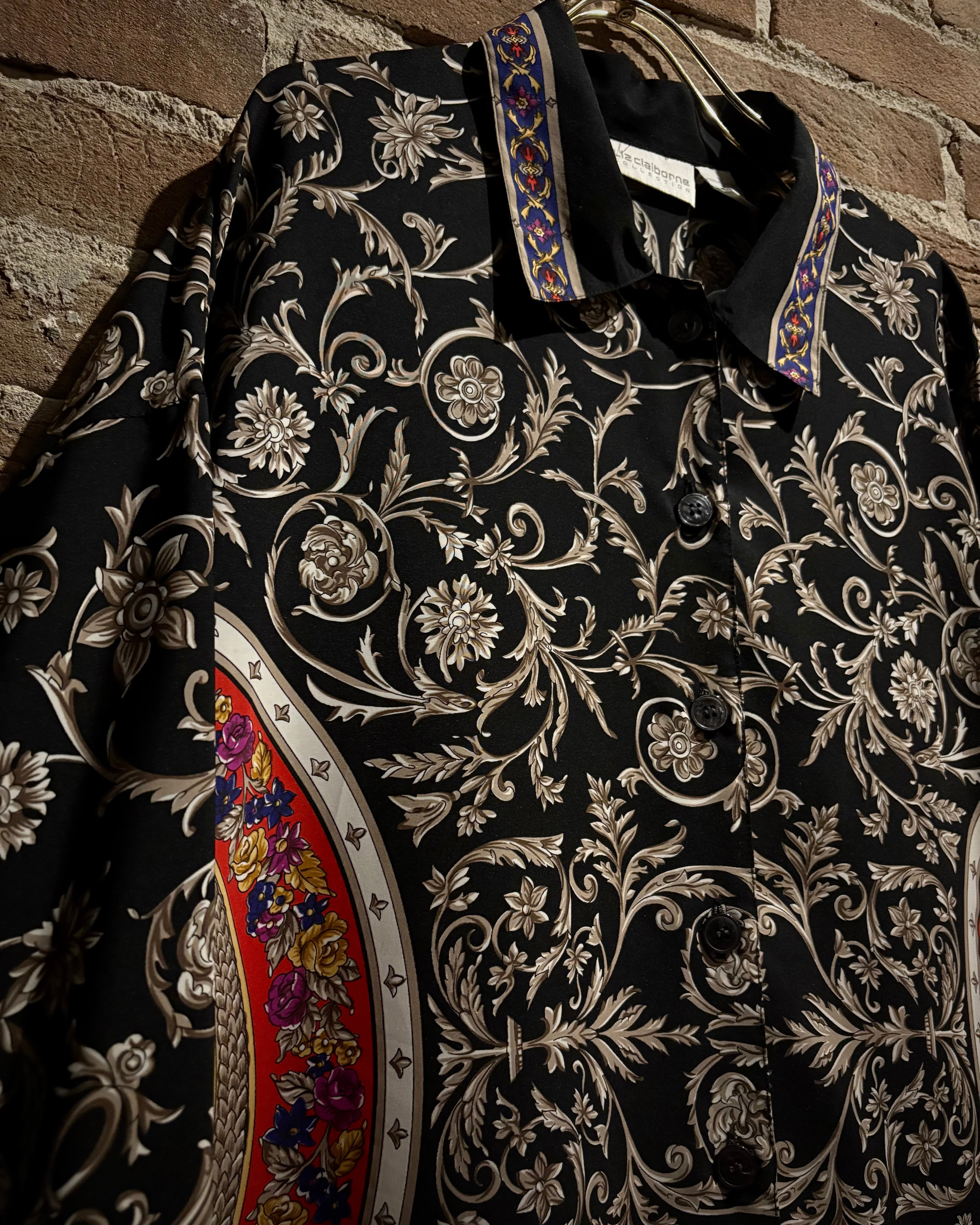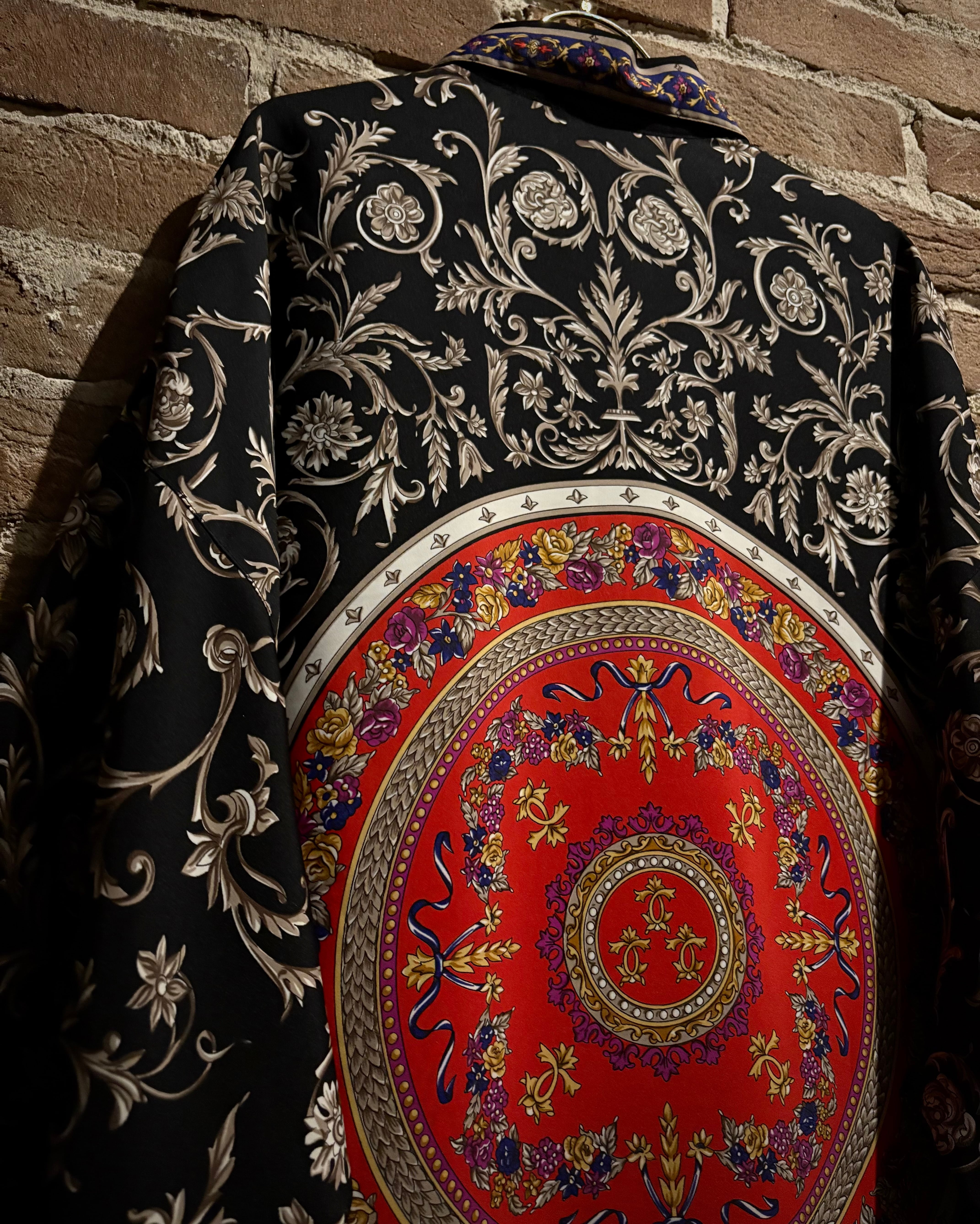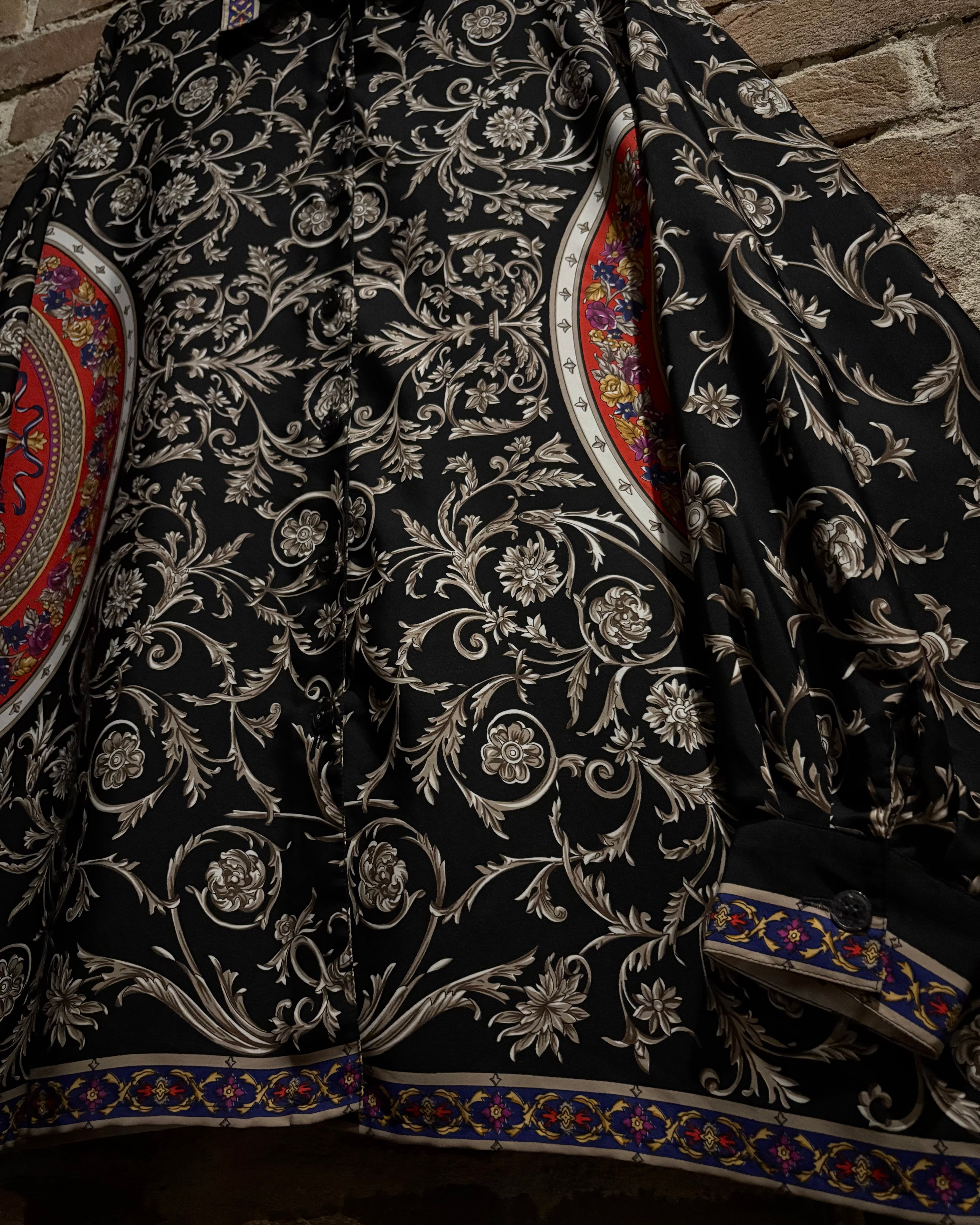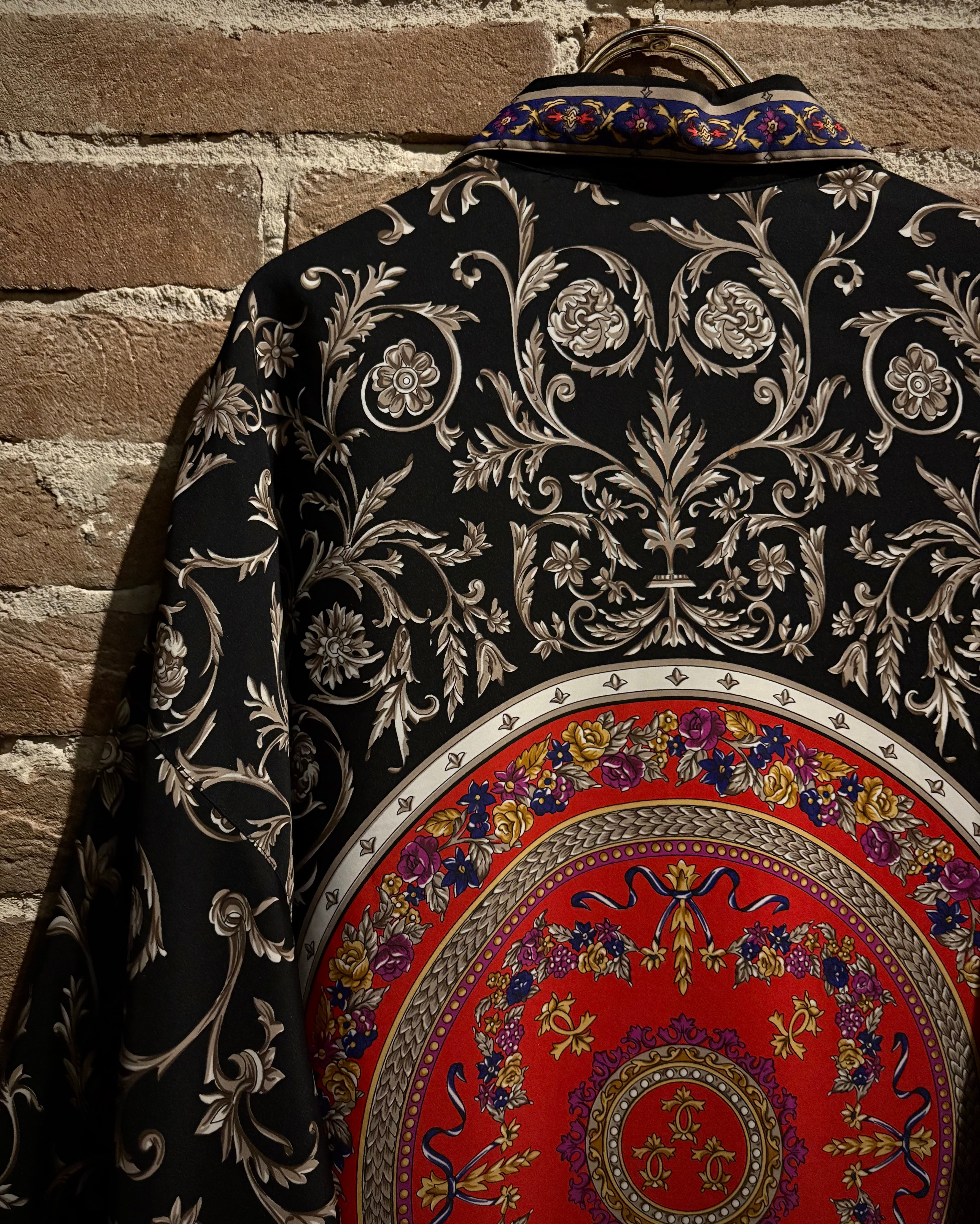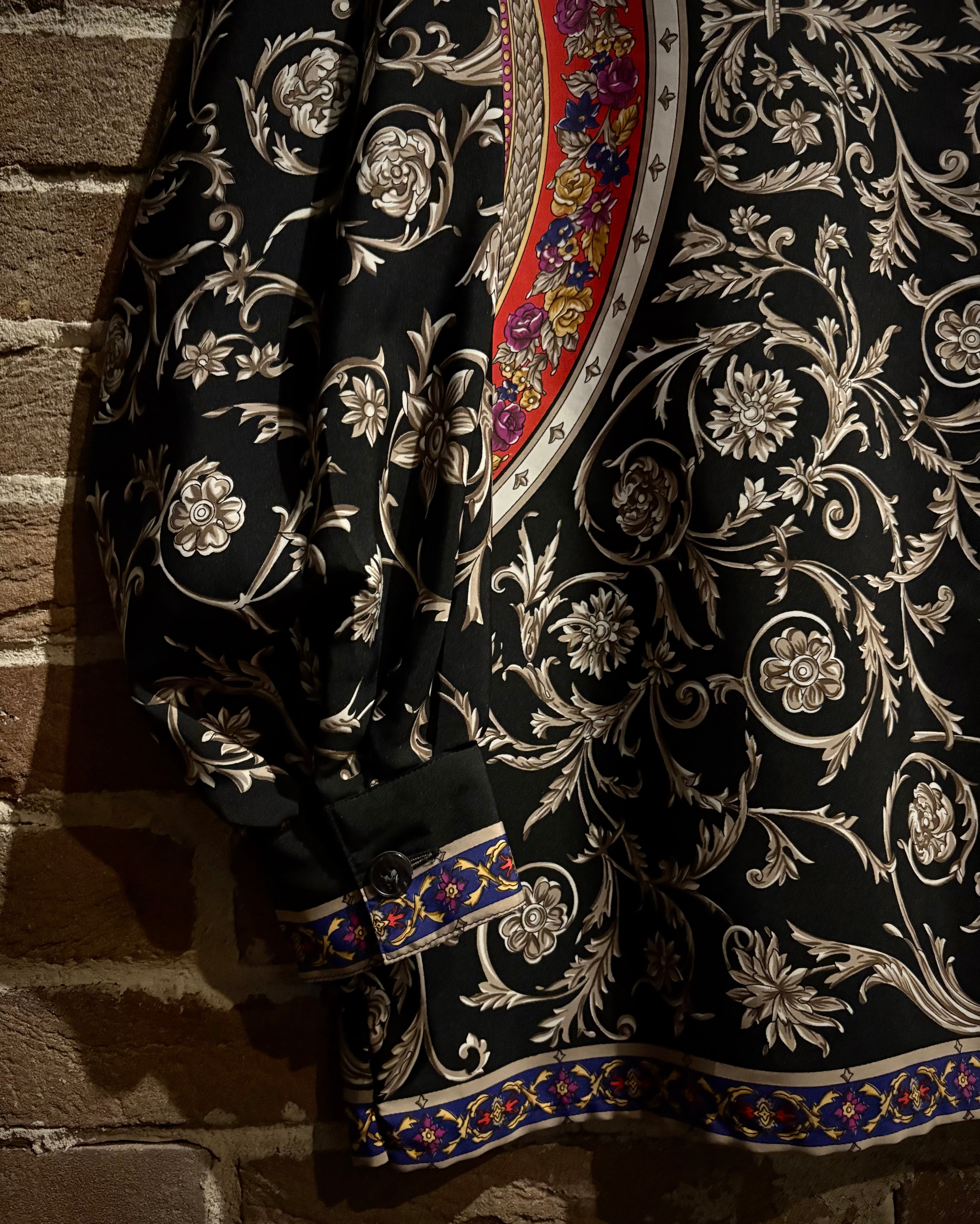 しっとりと肌に馴染む上質なポリエステル素材を贅沢に使用し、スカーフのような華やかなボタニカル、バロック調の柄を全面にあしらった1着。