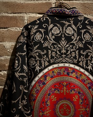黒を基調に、ゴールドと赤の装飾モチーフが立体的に映え、素材特有の滑らかな質感と相まって唯一無二のラグジュアリーなオーラを纏っています。