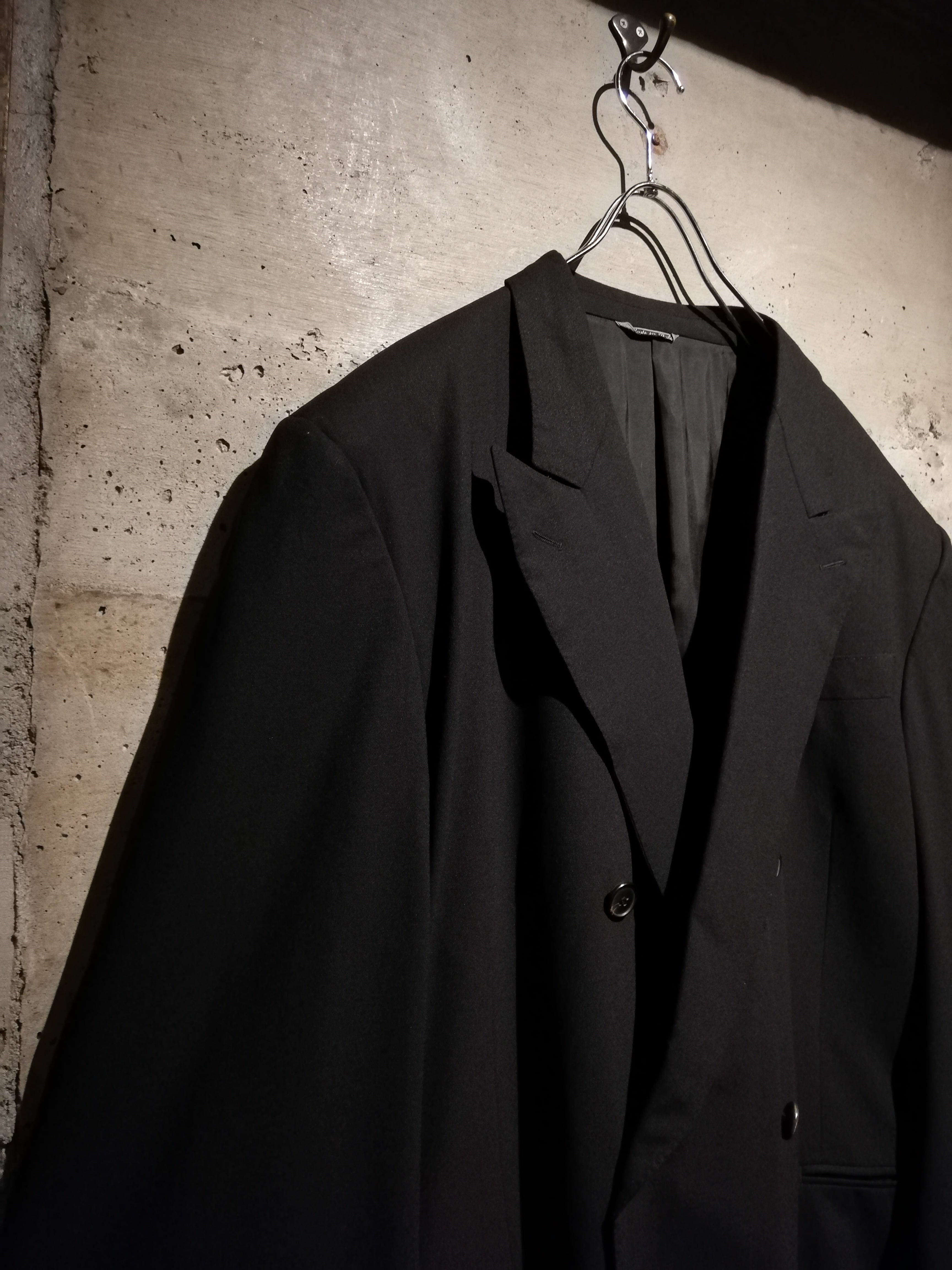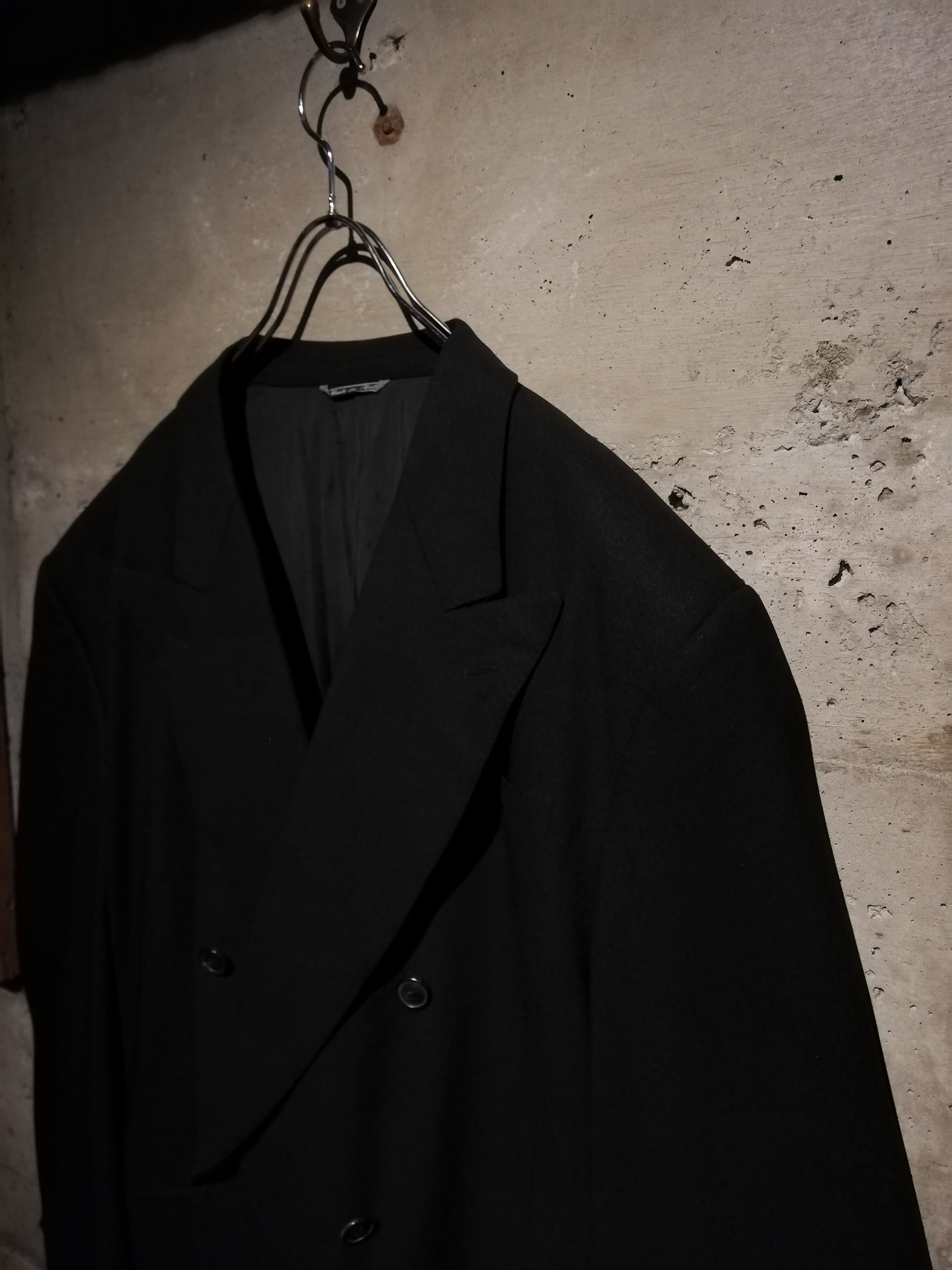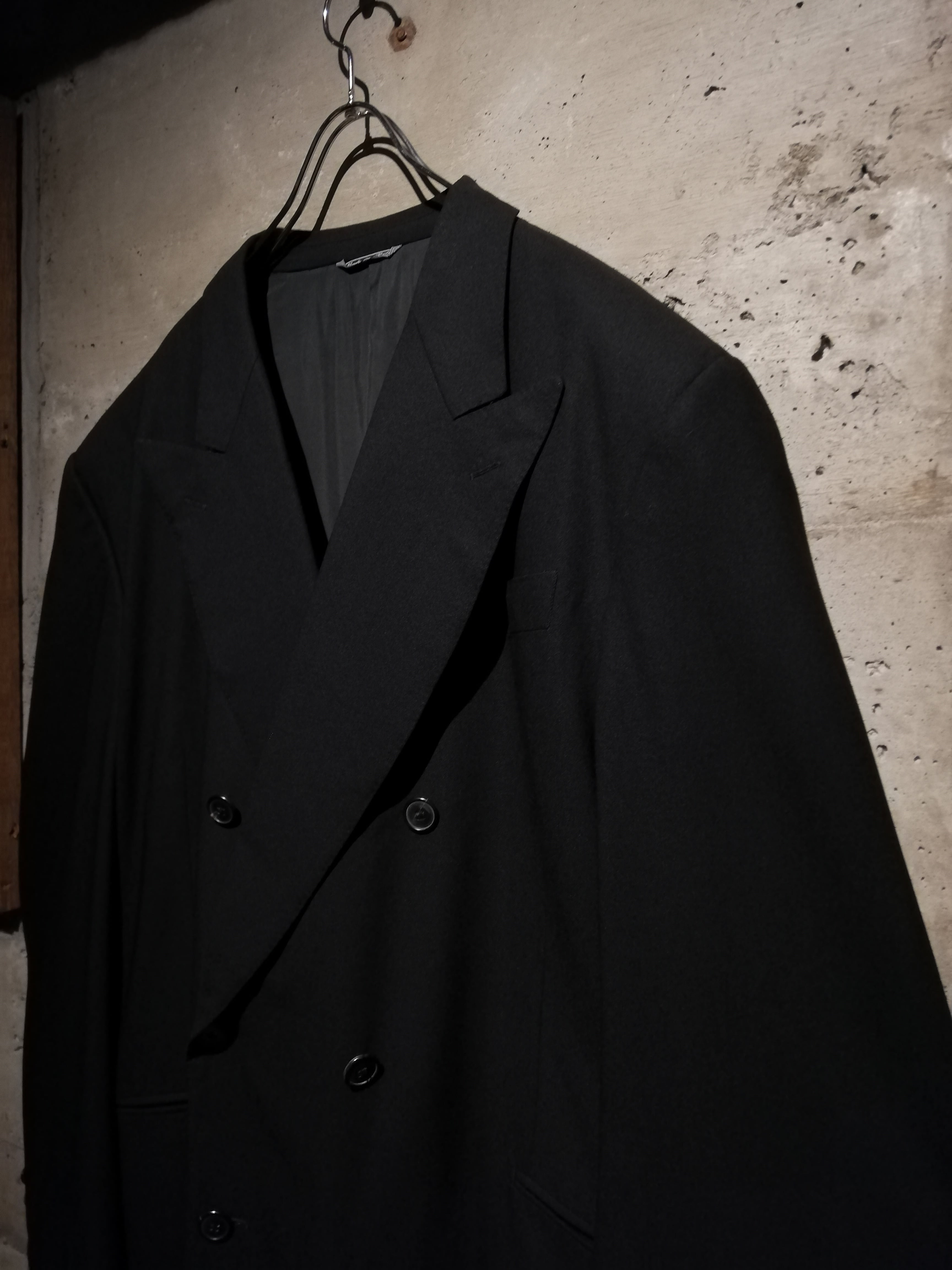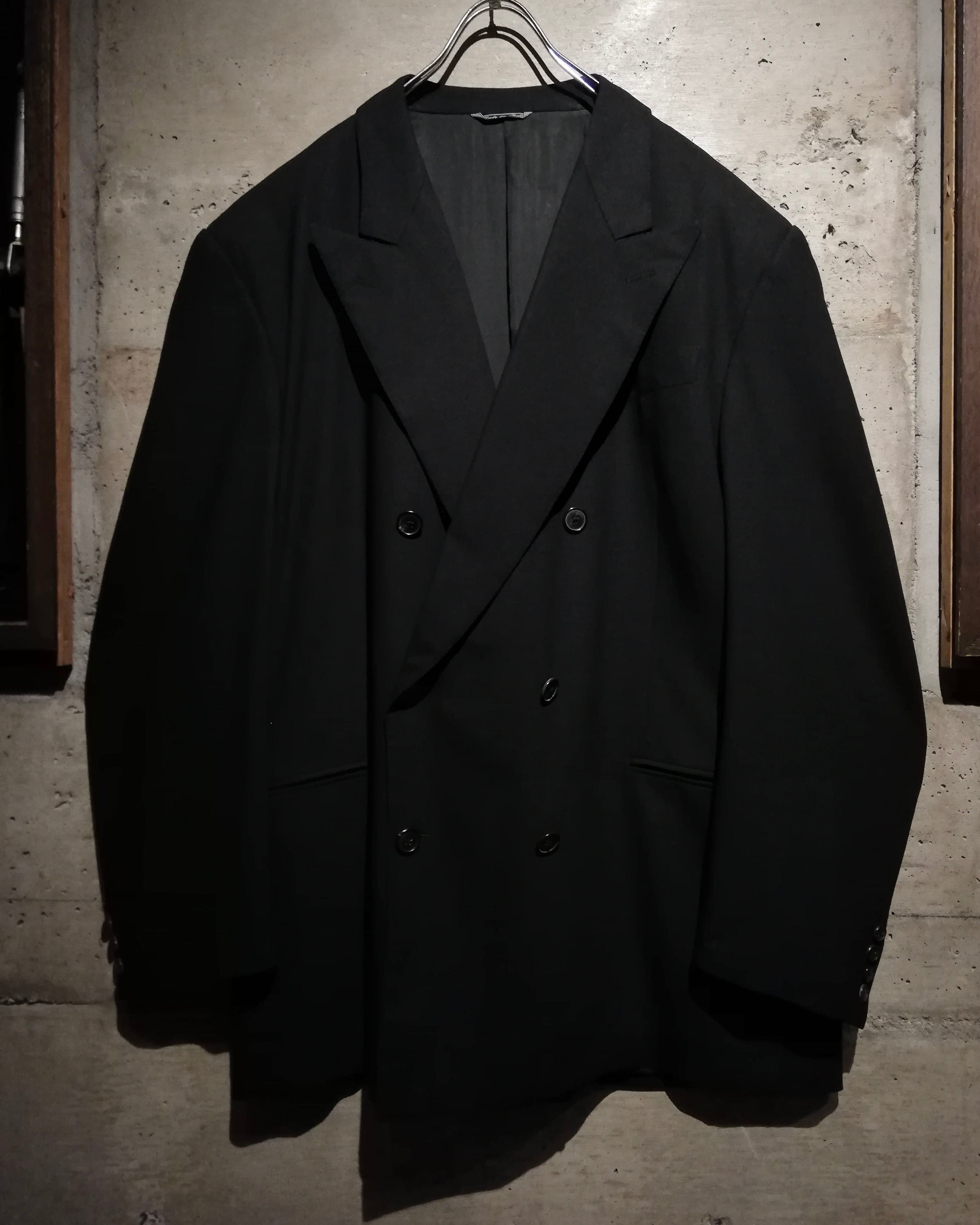 無駄を削ぎ落としたミニマルなブラックのボディに、ダブルブレスト特有の存在感をプラス。ラペルのラインや肩のフォルムはクラシカルながらも洗練されており、着る人の体格を美しく際立たせます。