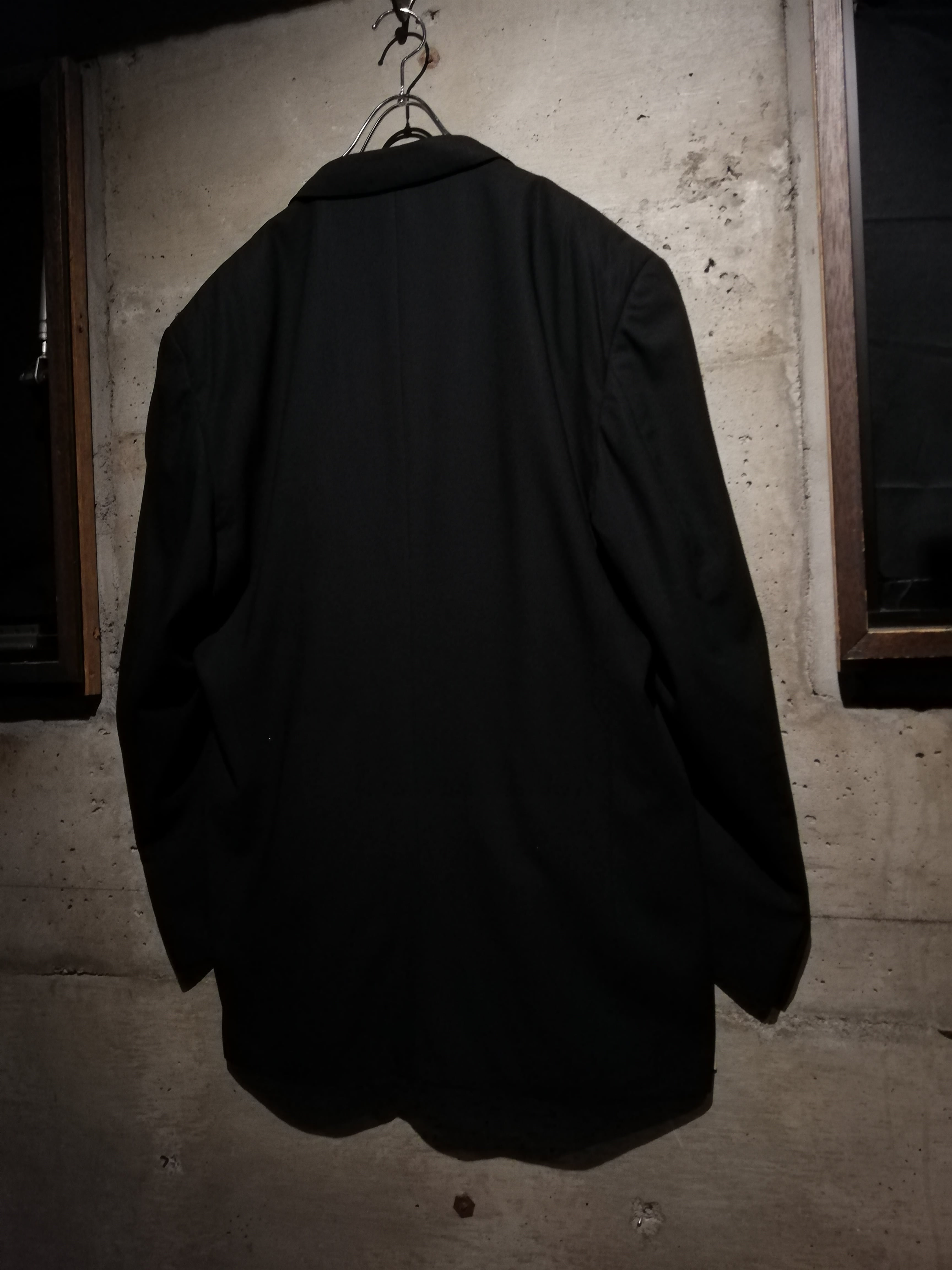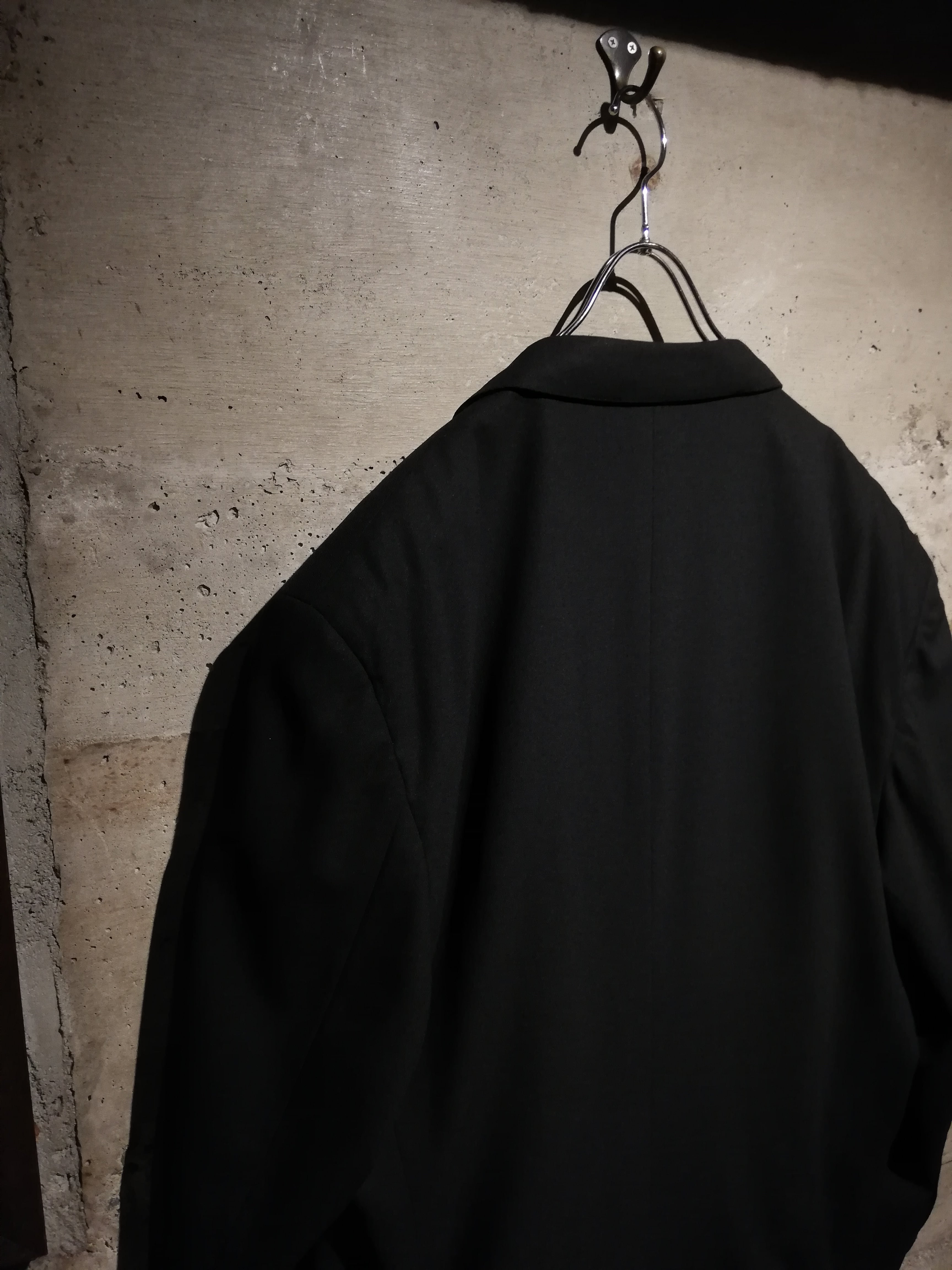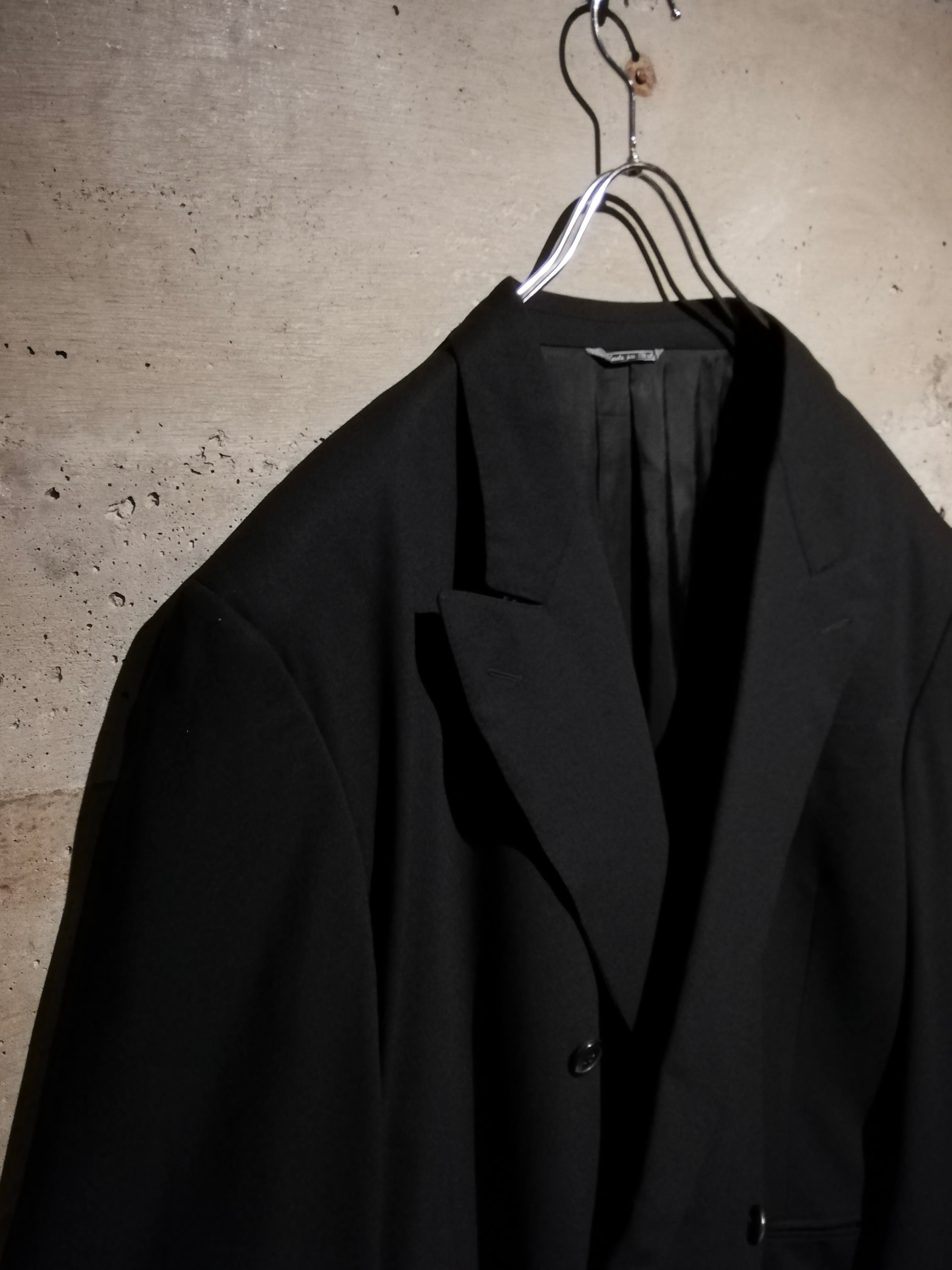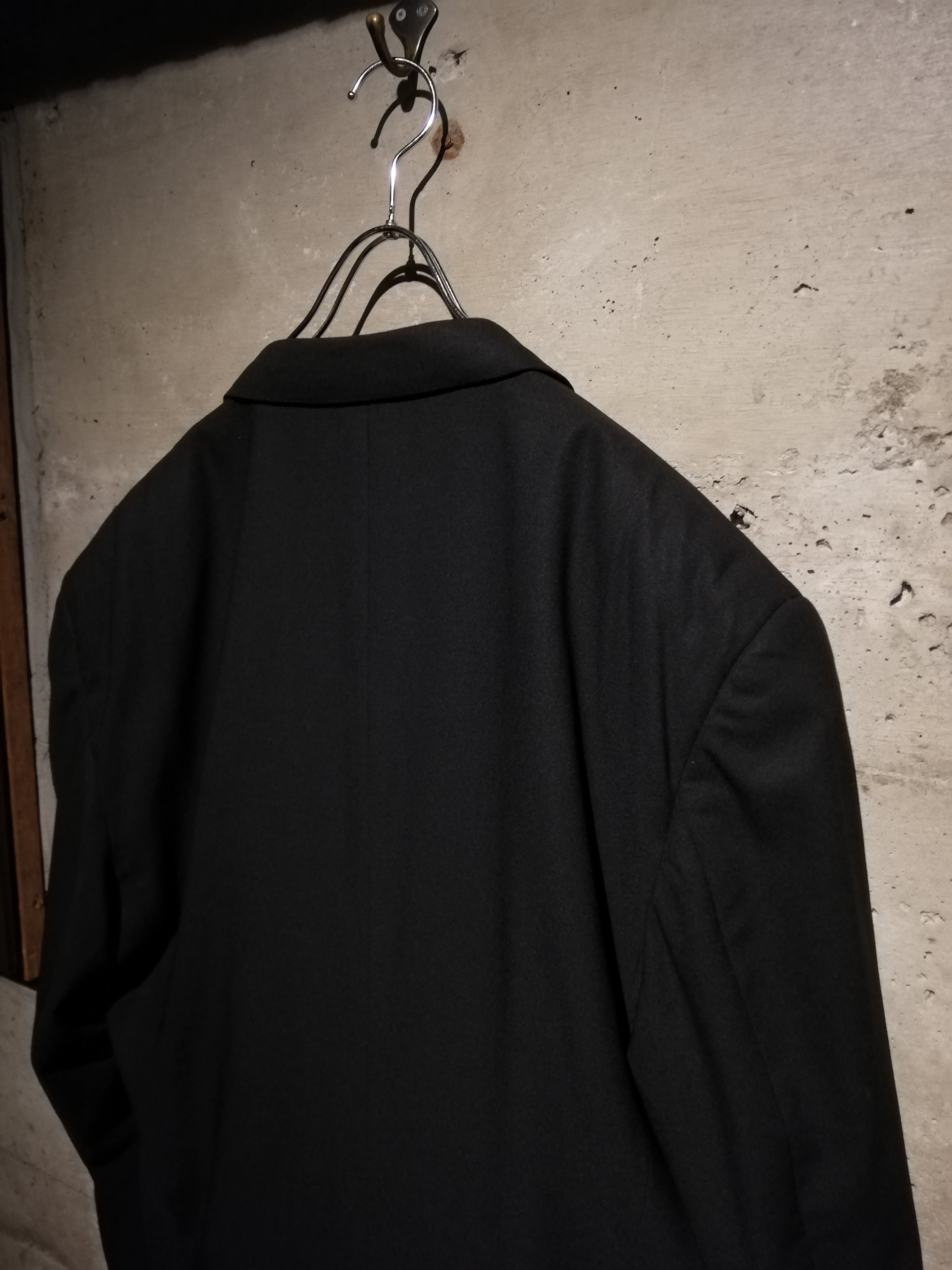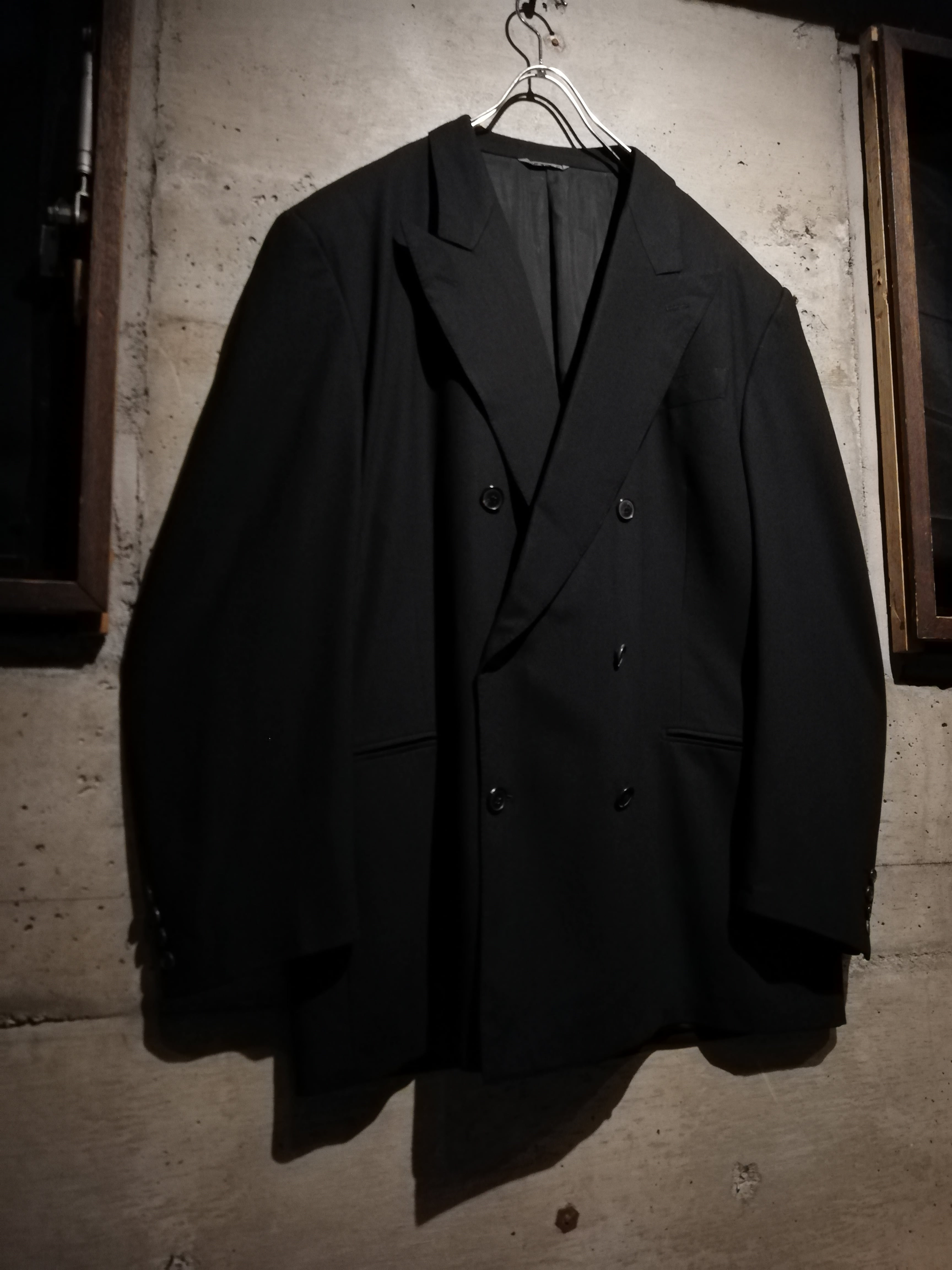 無駄を削ぎ落としたミニマルなブラックのボディに、ダブルブレスト特有の存在感をプラス。ラペルのラインや肩のフォルムはクラシカルながらも洗練されており、着る人の体格を美しく際立たせます。