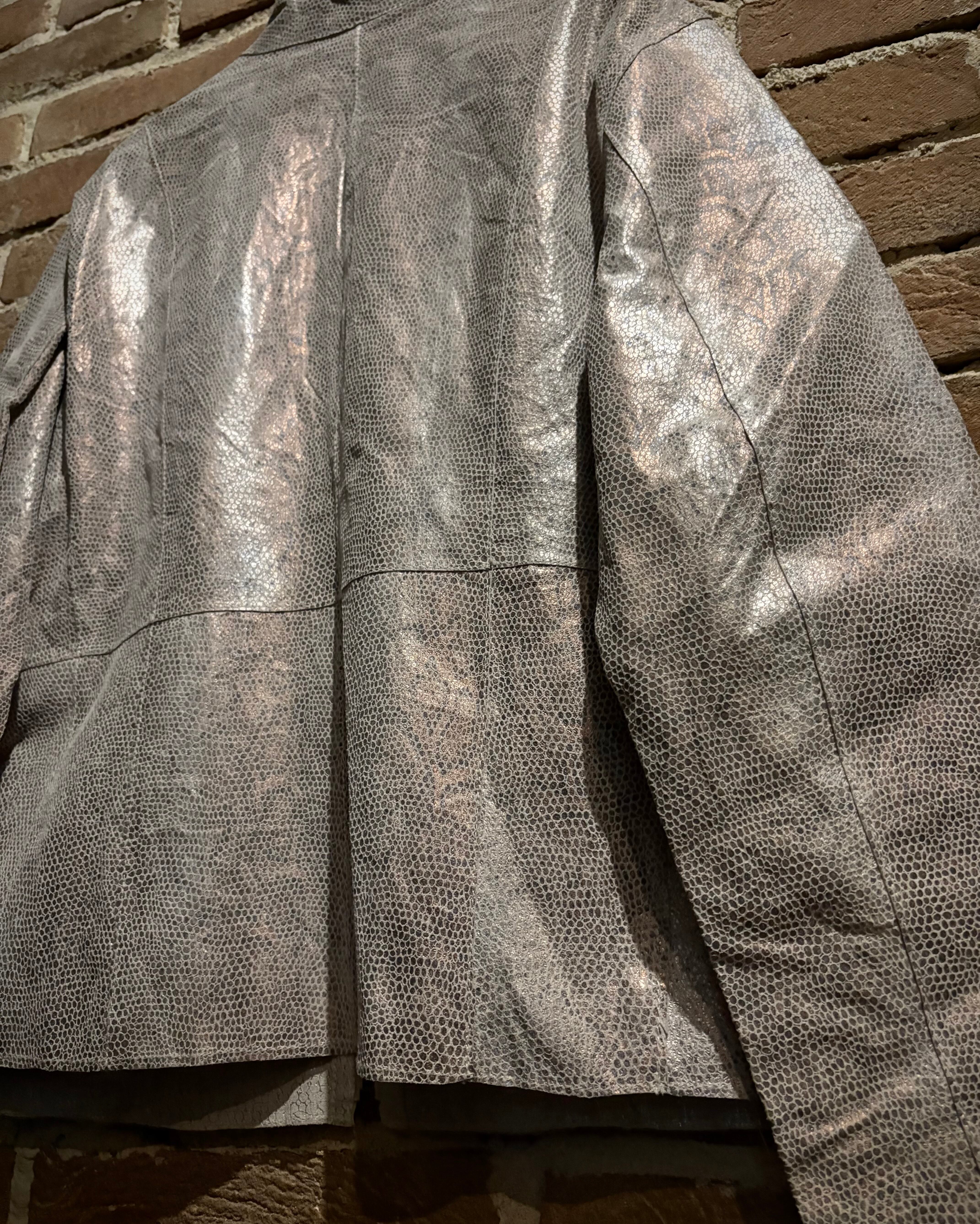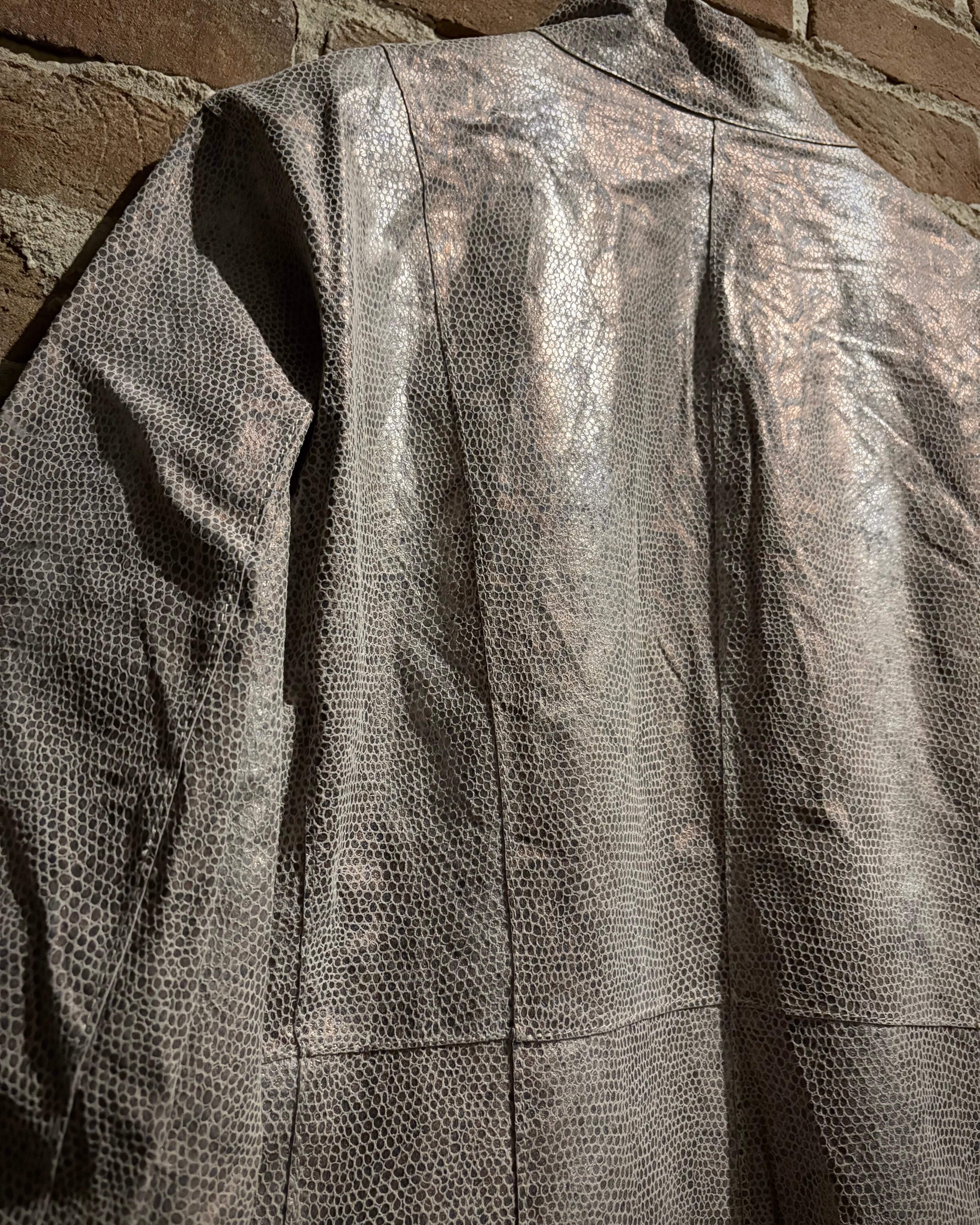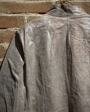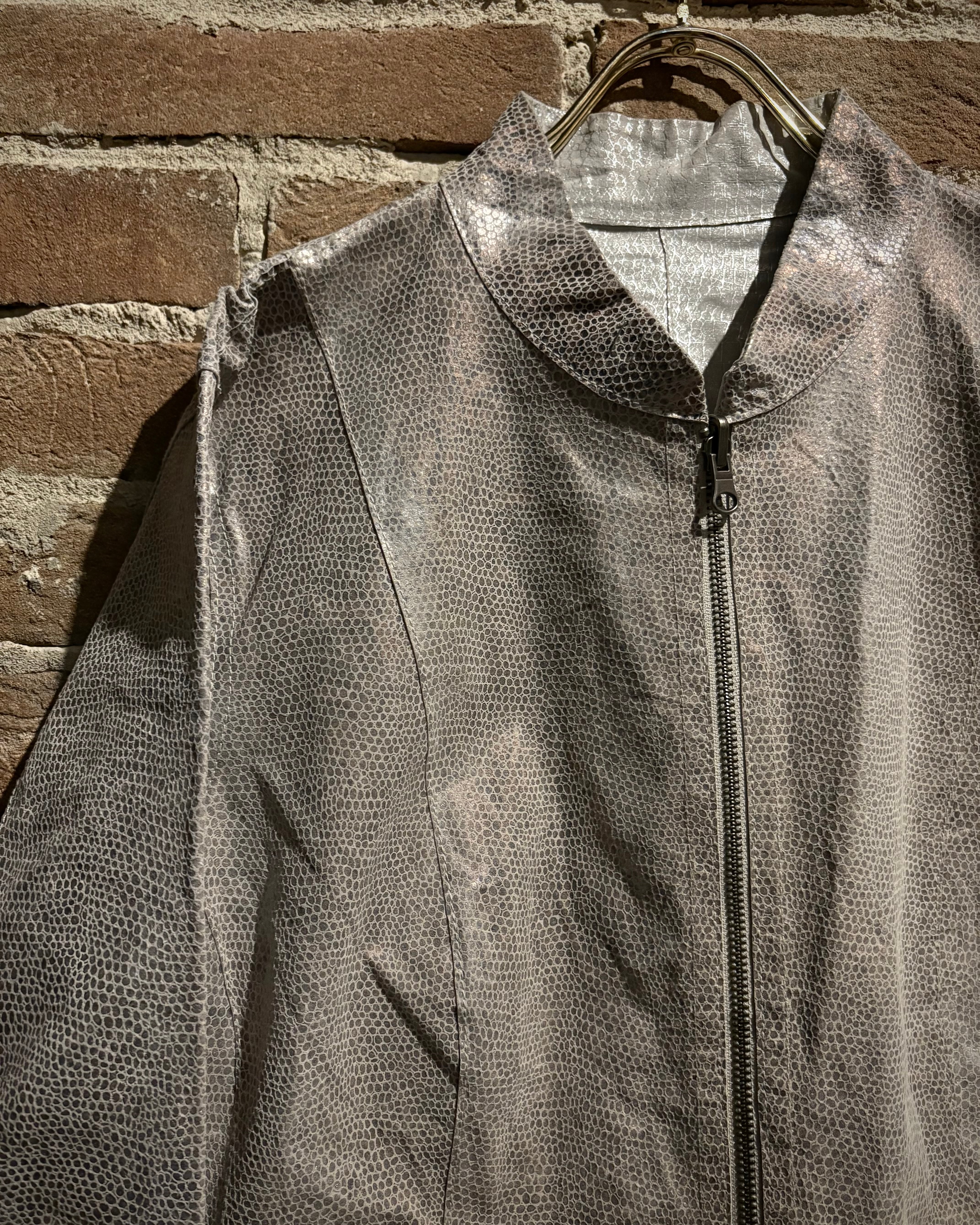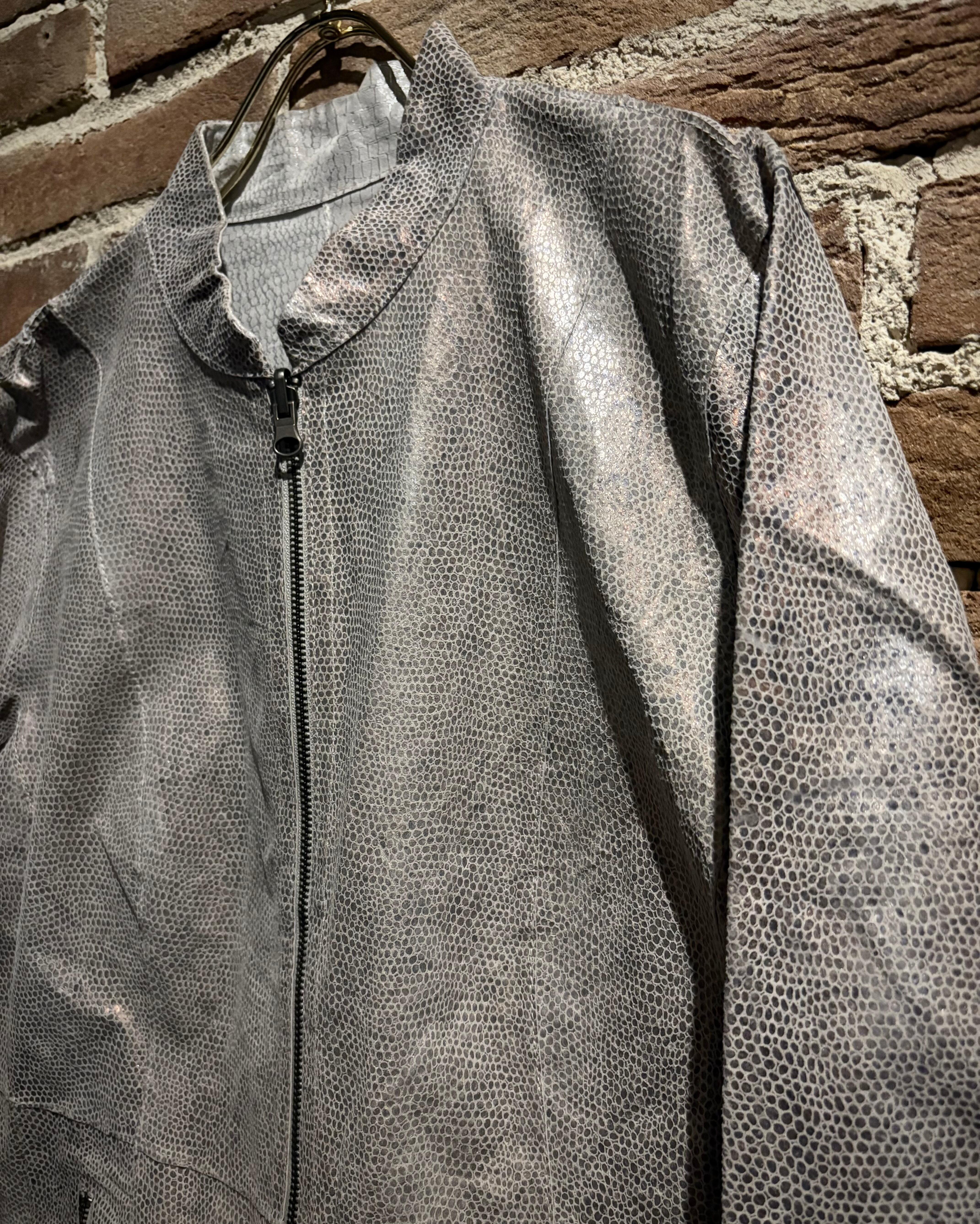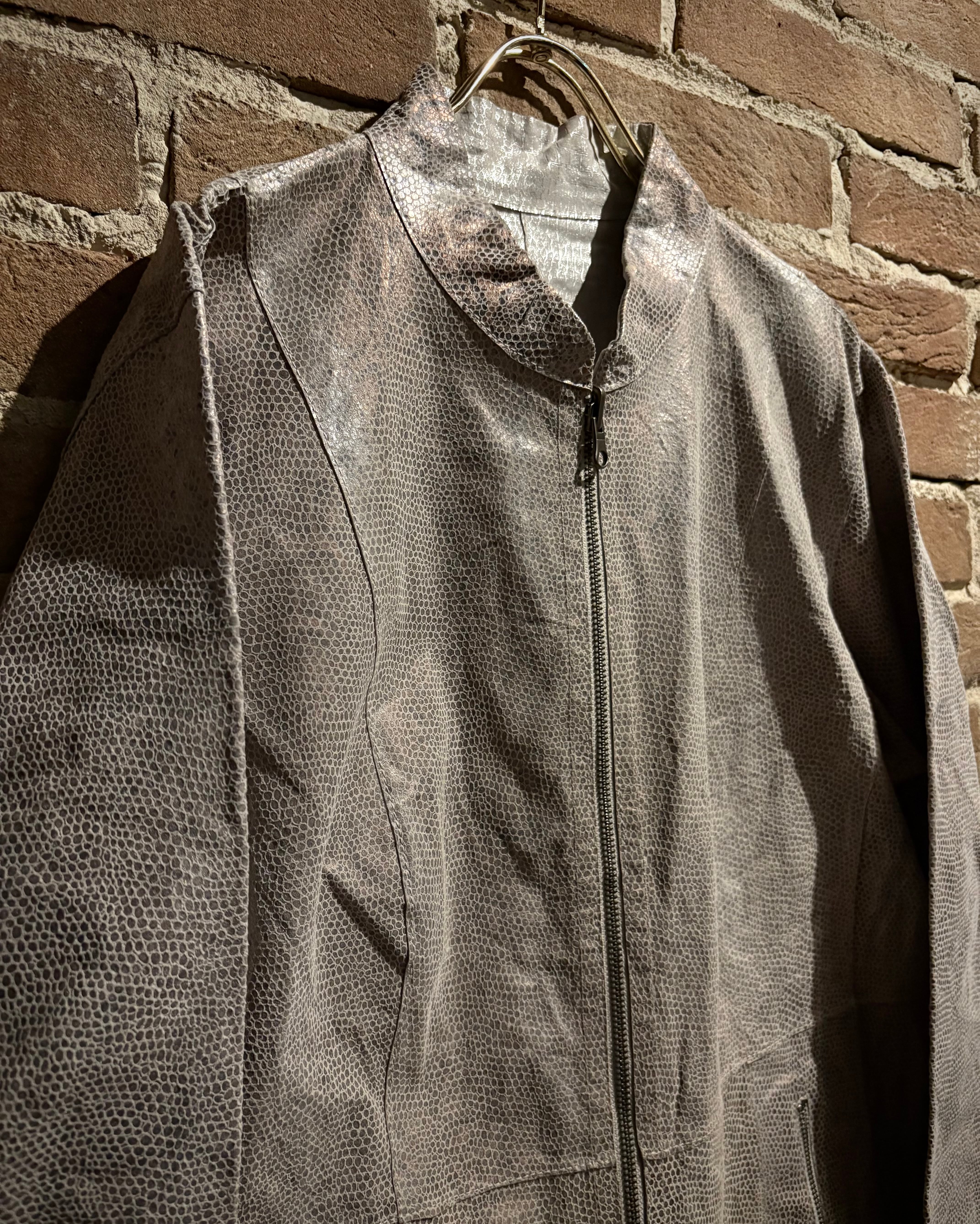 柔らかく薄手のリアルレザーをベースに、光沢感を帯びたパイソン柄をコーティングで表現したジップアップジャケット。