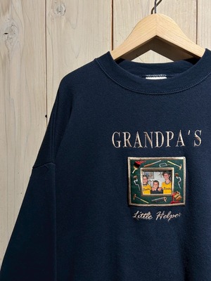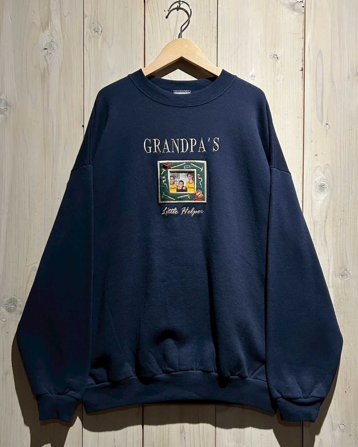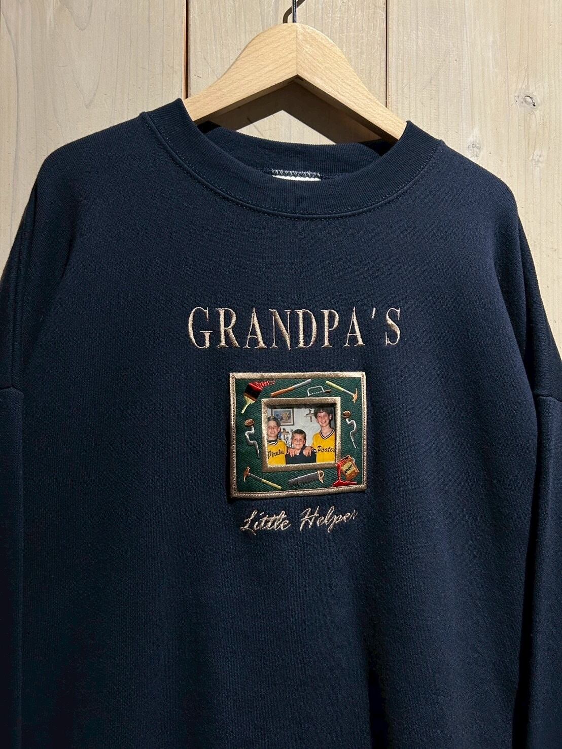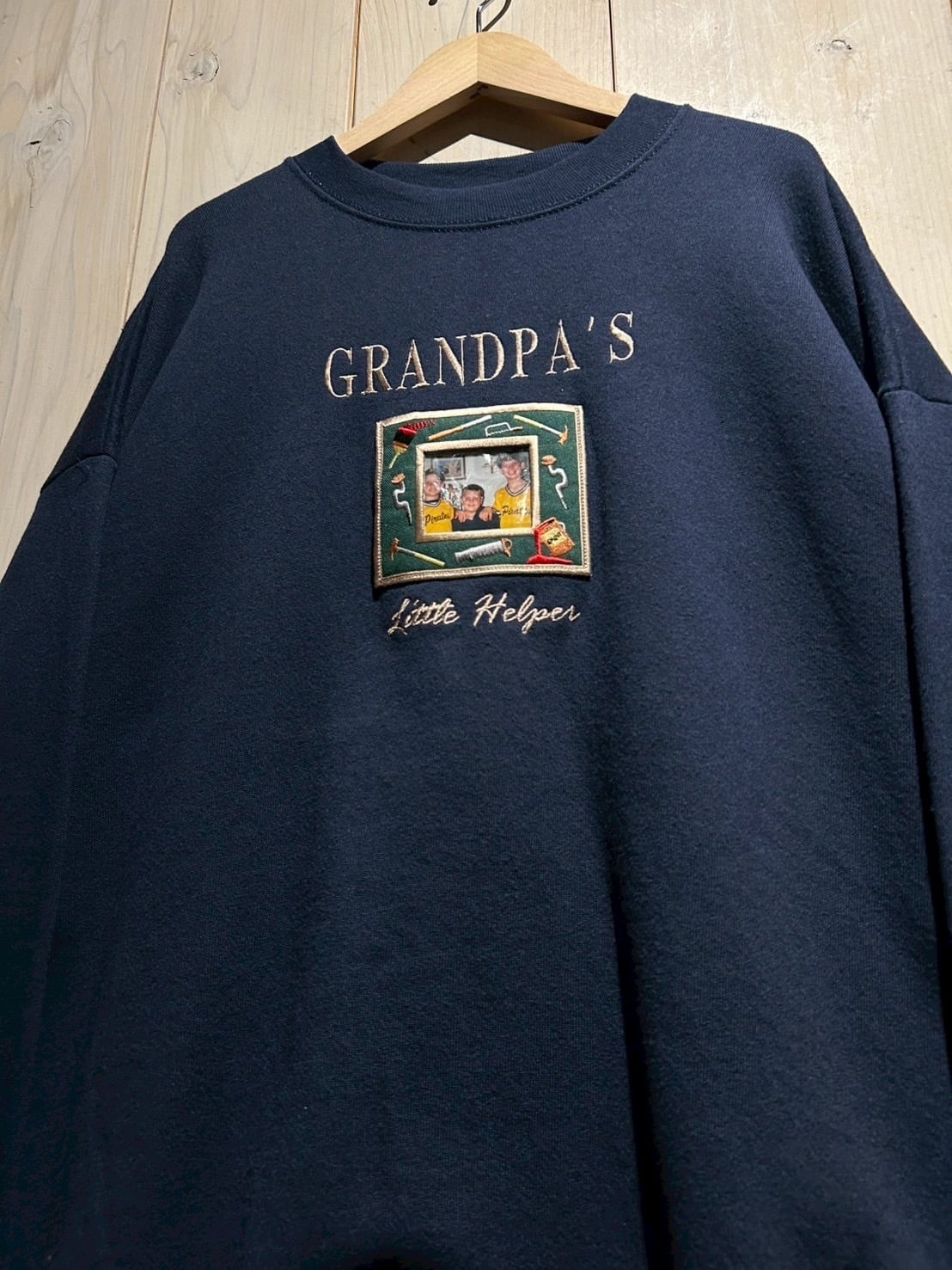 深みのあるネイビーボディに「GRANDPA’S」の刺繍ロゴ。そして胸元には、野球ユニフォームを着た少年3人が写った写真がそのままワッペンとして落とし込まれた、インパクト抜群のデザイン。額縁調に工具や金槌などが刺繍されており、“おじいちゃんの小さな助っ人たち”というストーリー性を演出しています。
