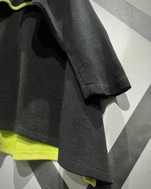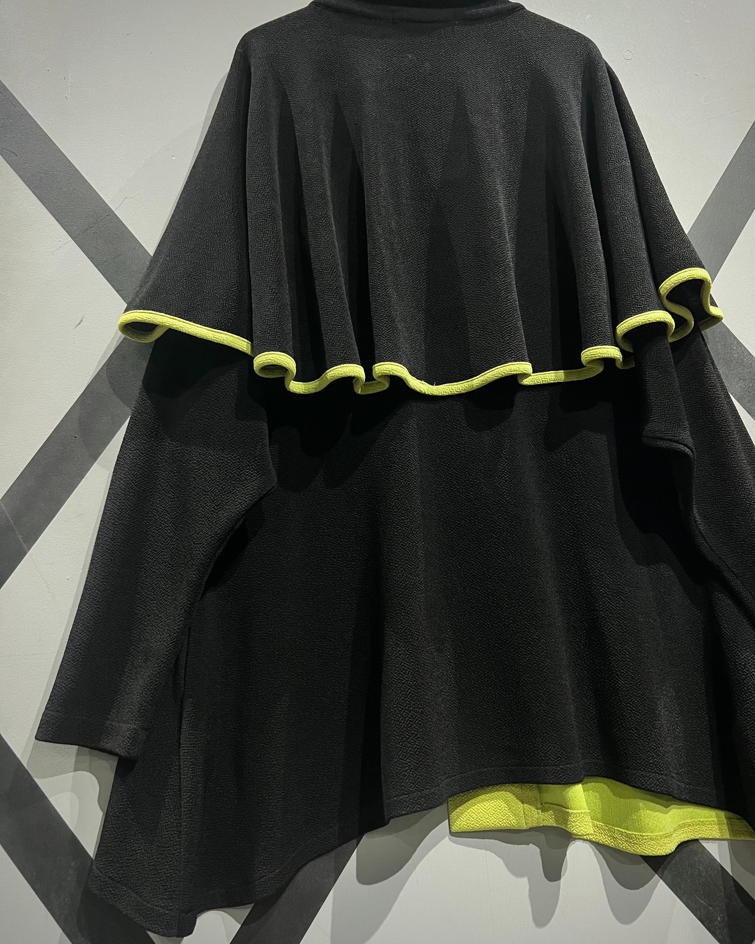 特に印象的なのは、ブラックのボディをライムイエローが大胆に切り替える配色バランス。さらに襟元や袖、裾のパイピングにまでイエローを効かせ、動くたびに立体的なコントラストが際立つ仕上がりに。