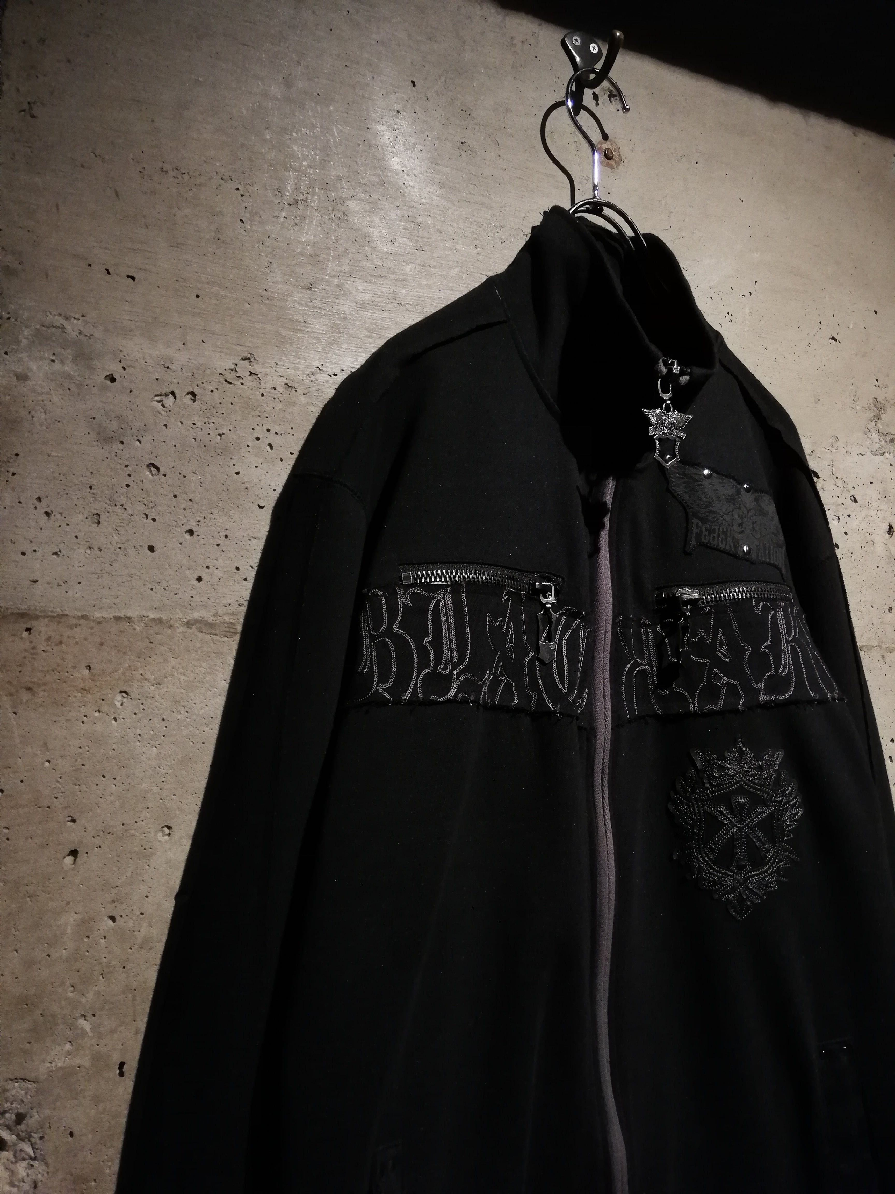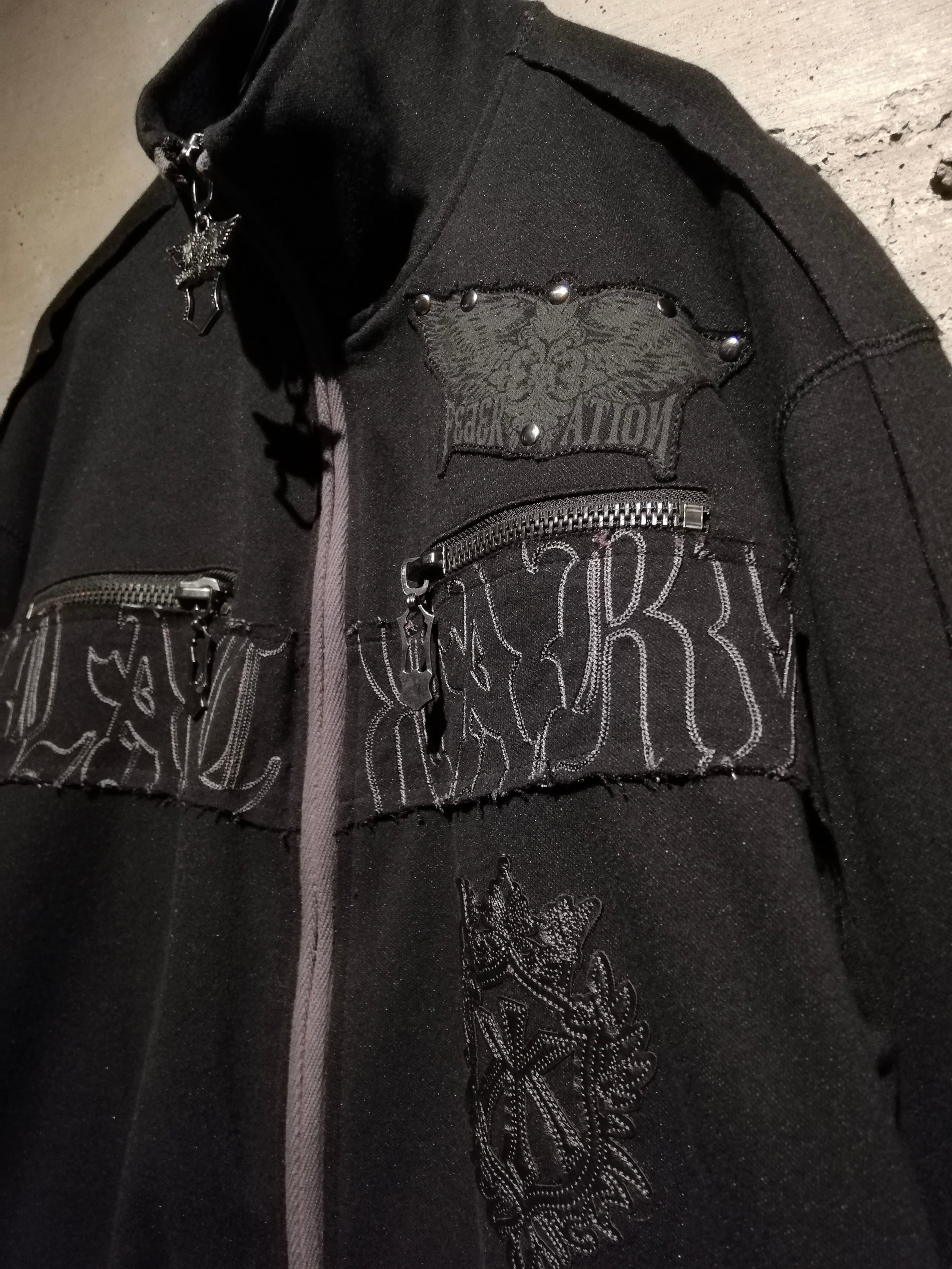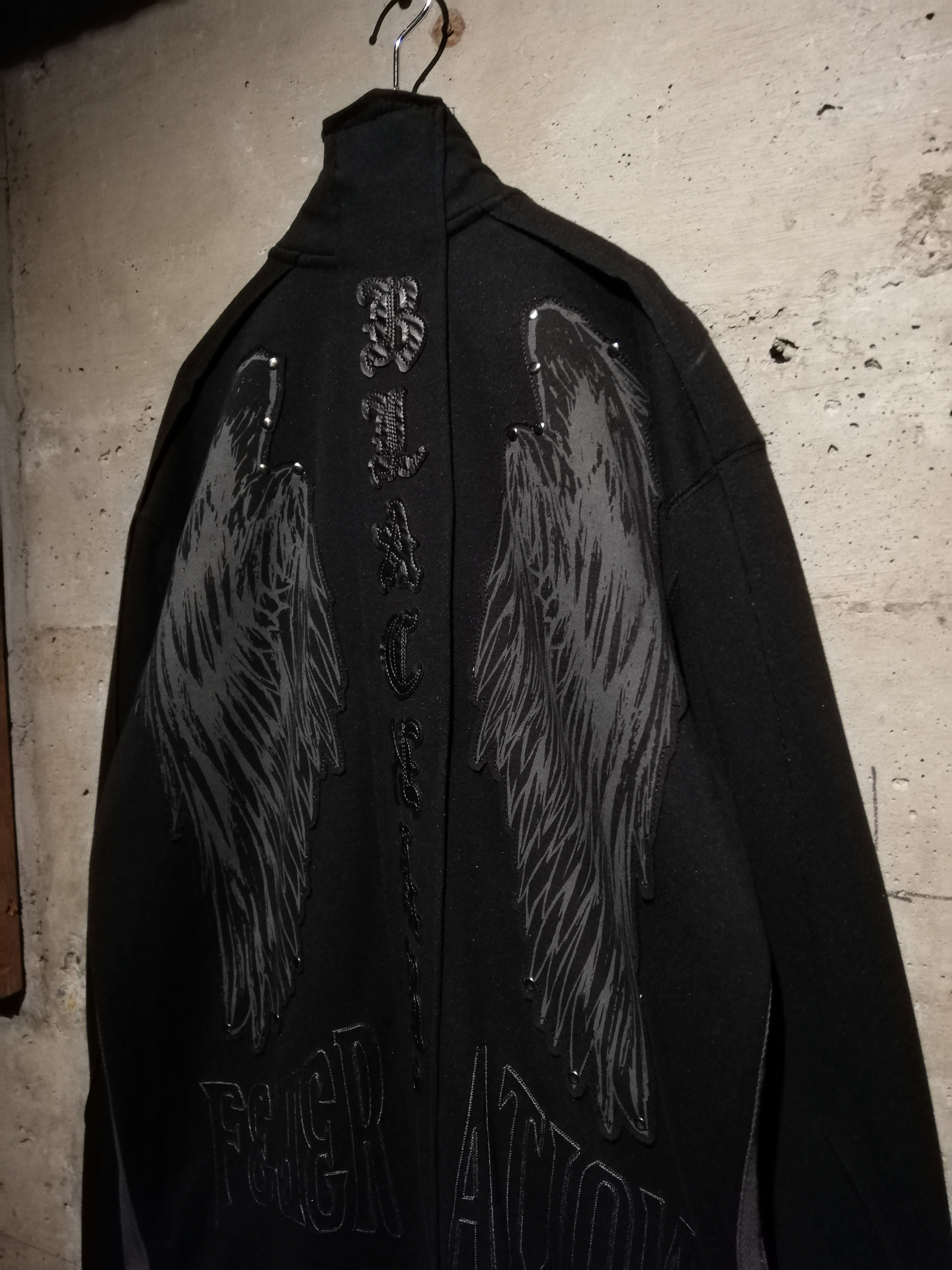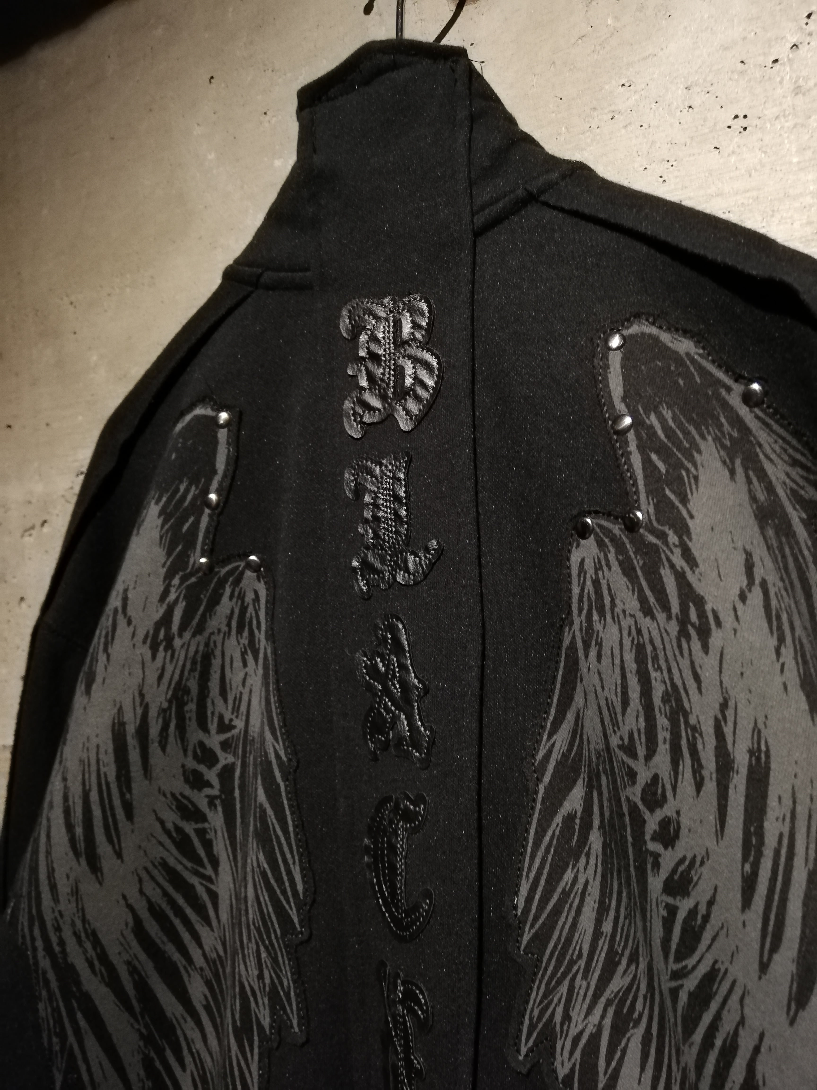 程よく肉感のあるブラックのボディに、ブランドロゴ、翼のデザインでゴシック風に仕上げたドライバーズ型ジップアップジャケット。