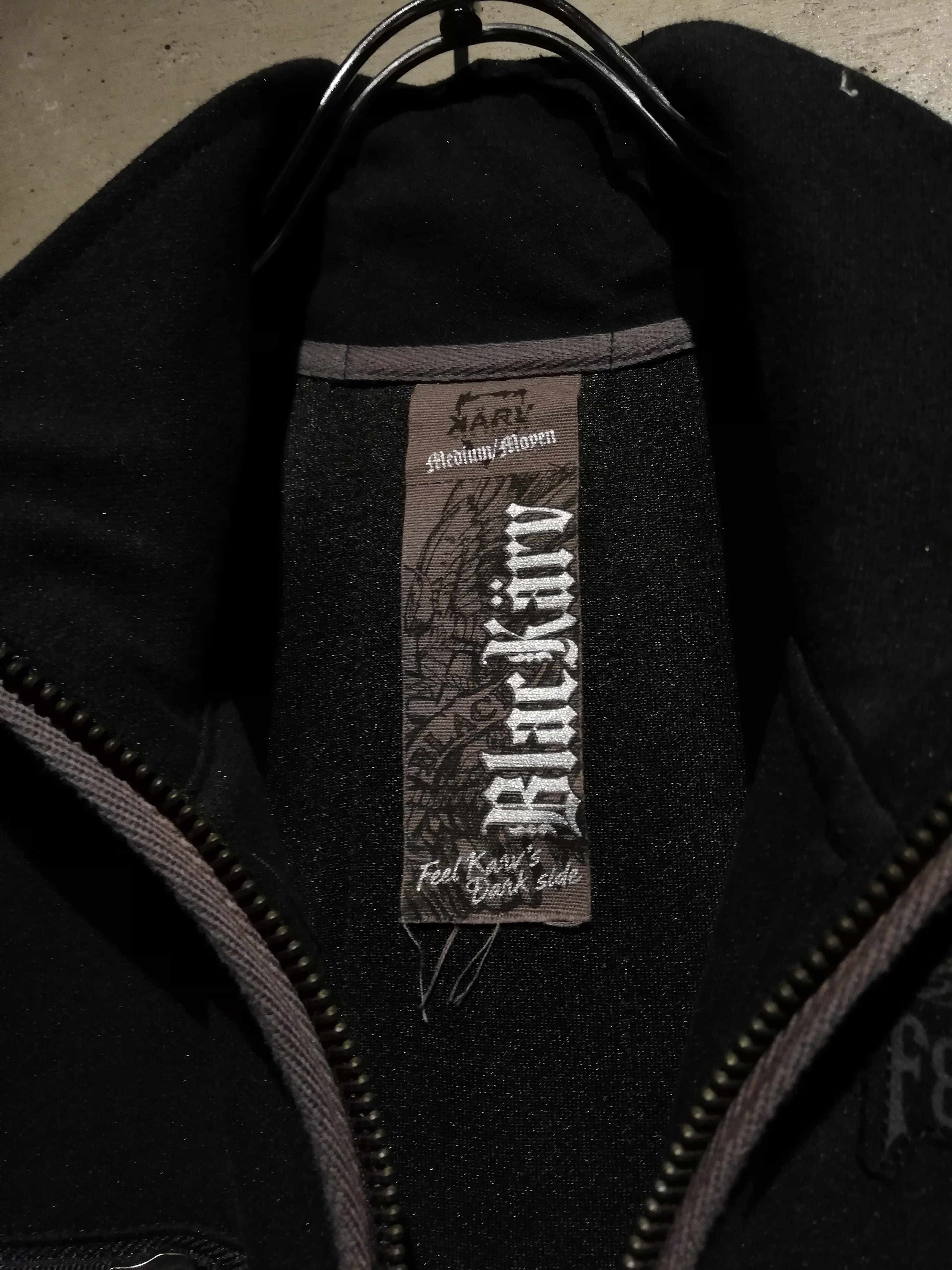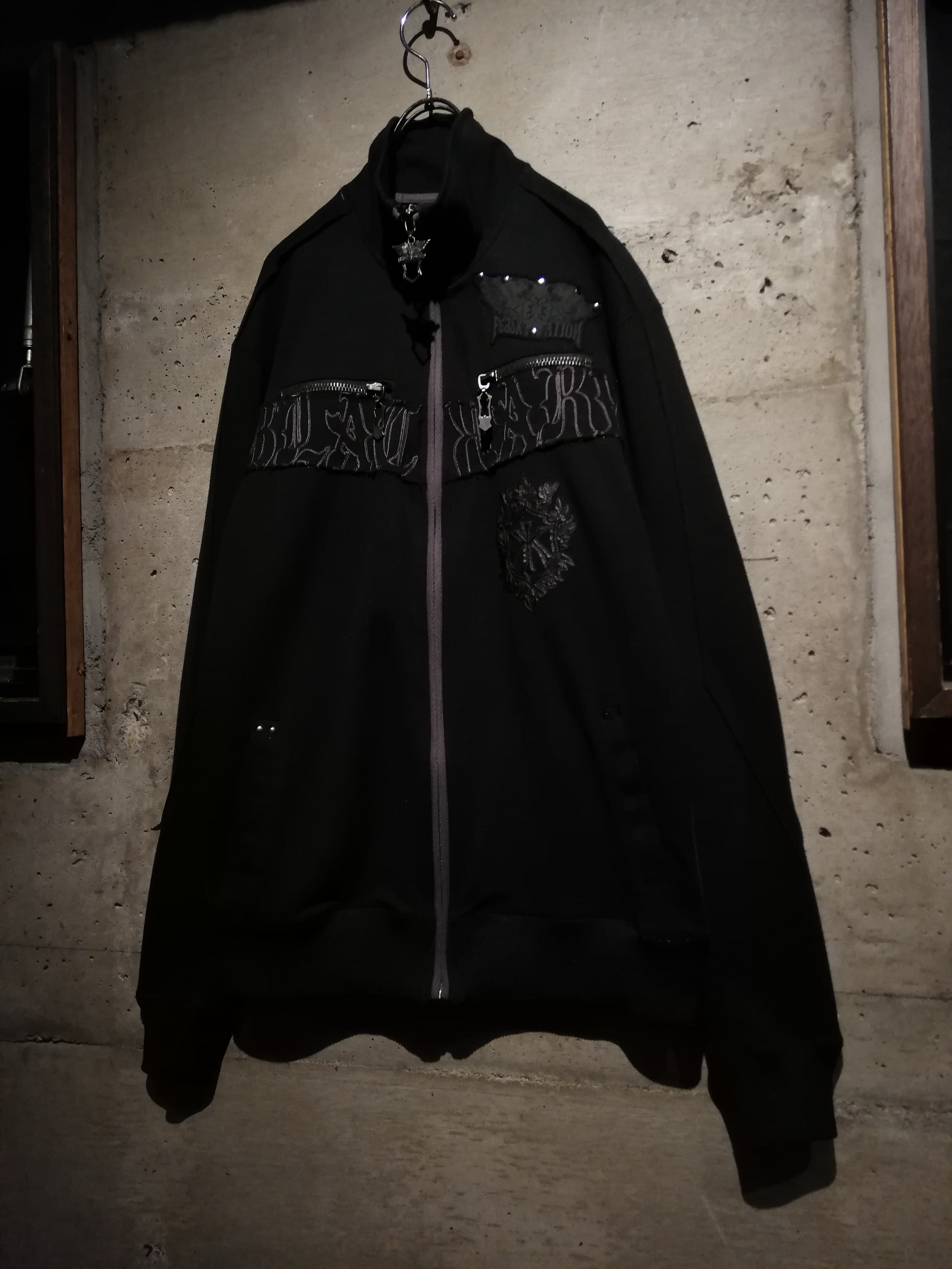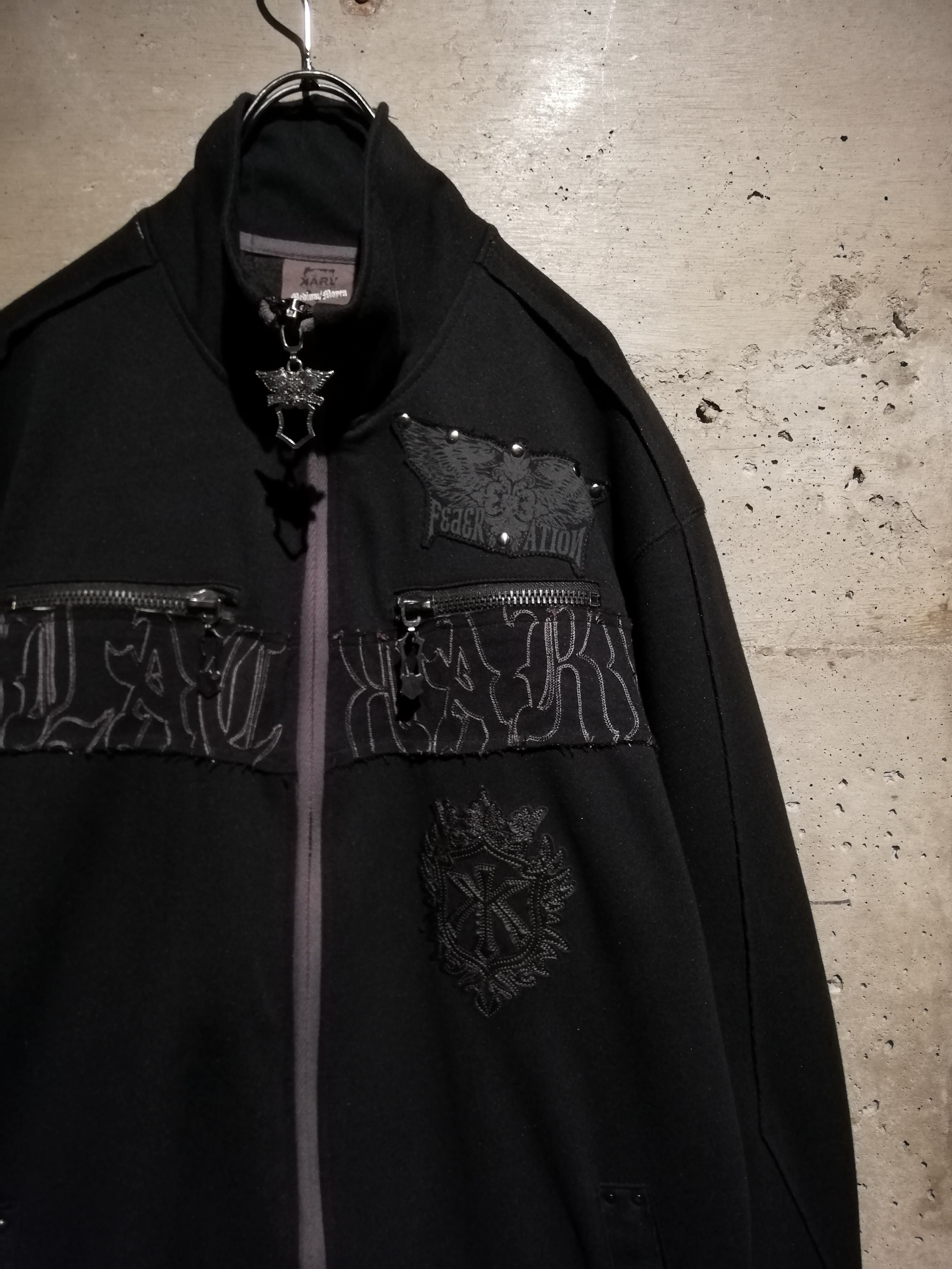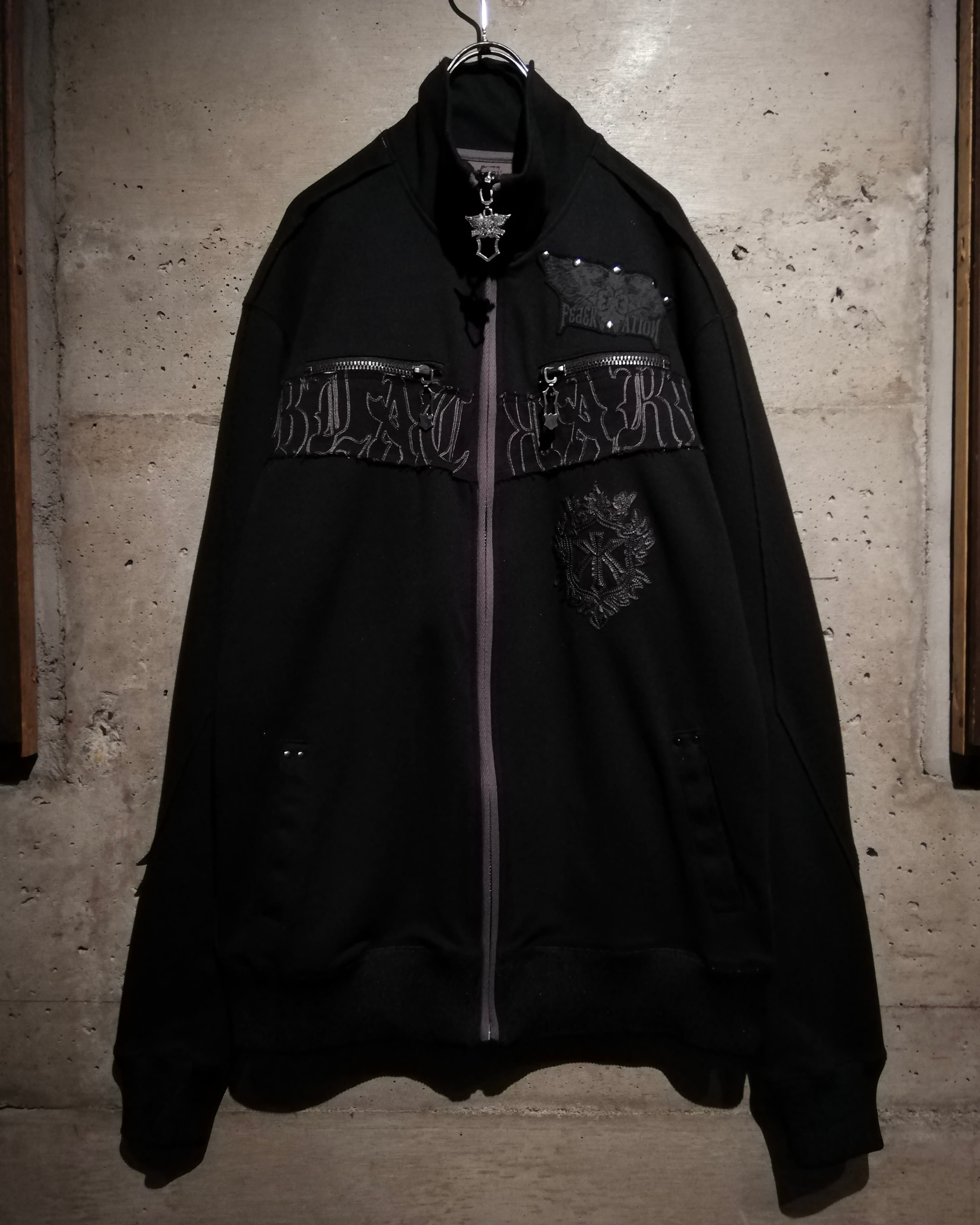 程よく肉感のあるブラックのボディに、ブランドロゴ、翼のデザインでゴシック風に仕上げたドライバーズ型ジップアップジャケット。