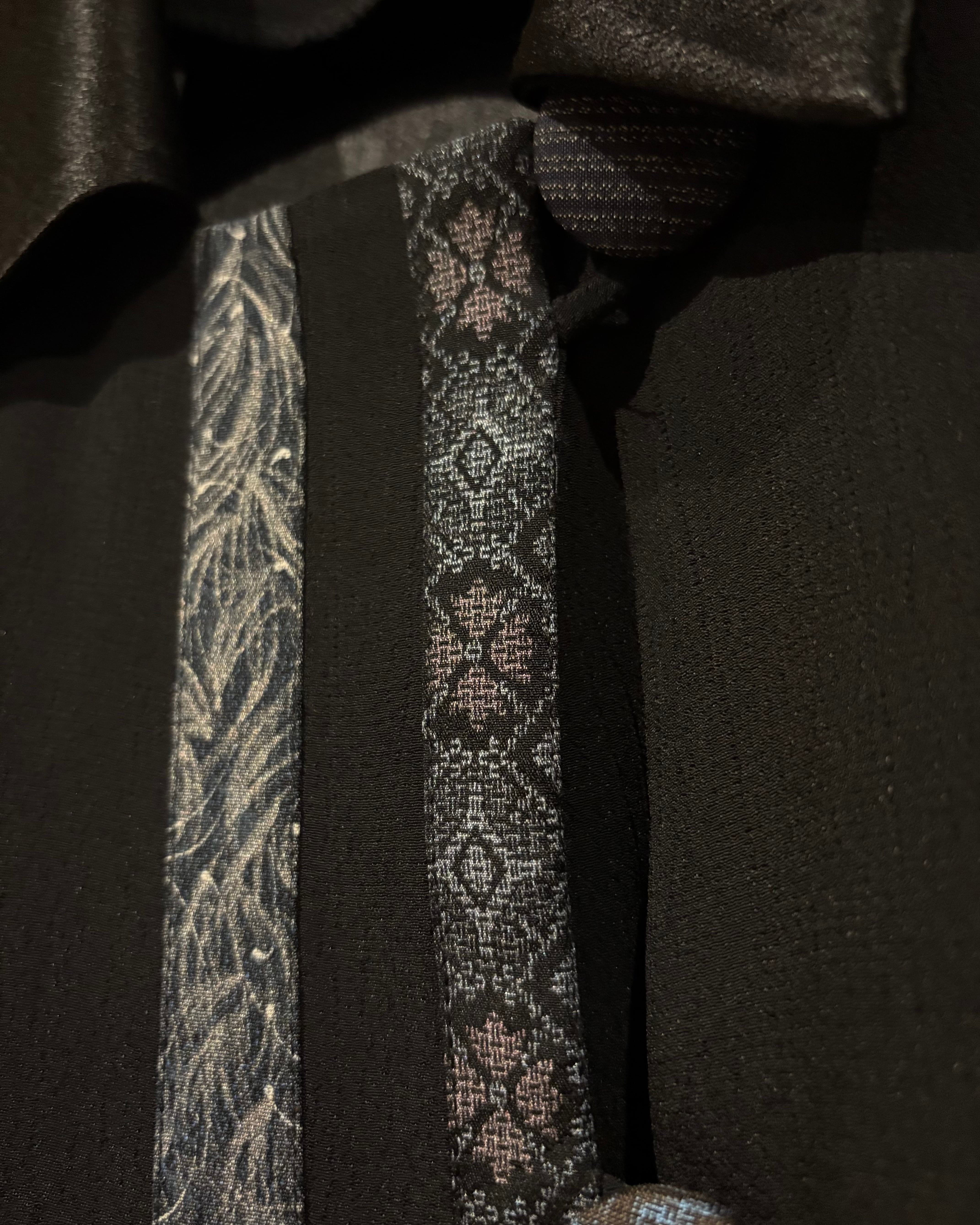 最大の見どころはフロントのデザイン。前立て部分を通常よりも太く取り、2種類の異なる織柄をライン状に配置。細やかな草花モチーフと幾何学的なパターンが交差し、オールブラックボディの中に奥行き演出します。大きめに作られたくるみボタンのアクセントも◎