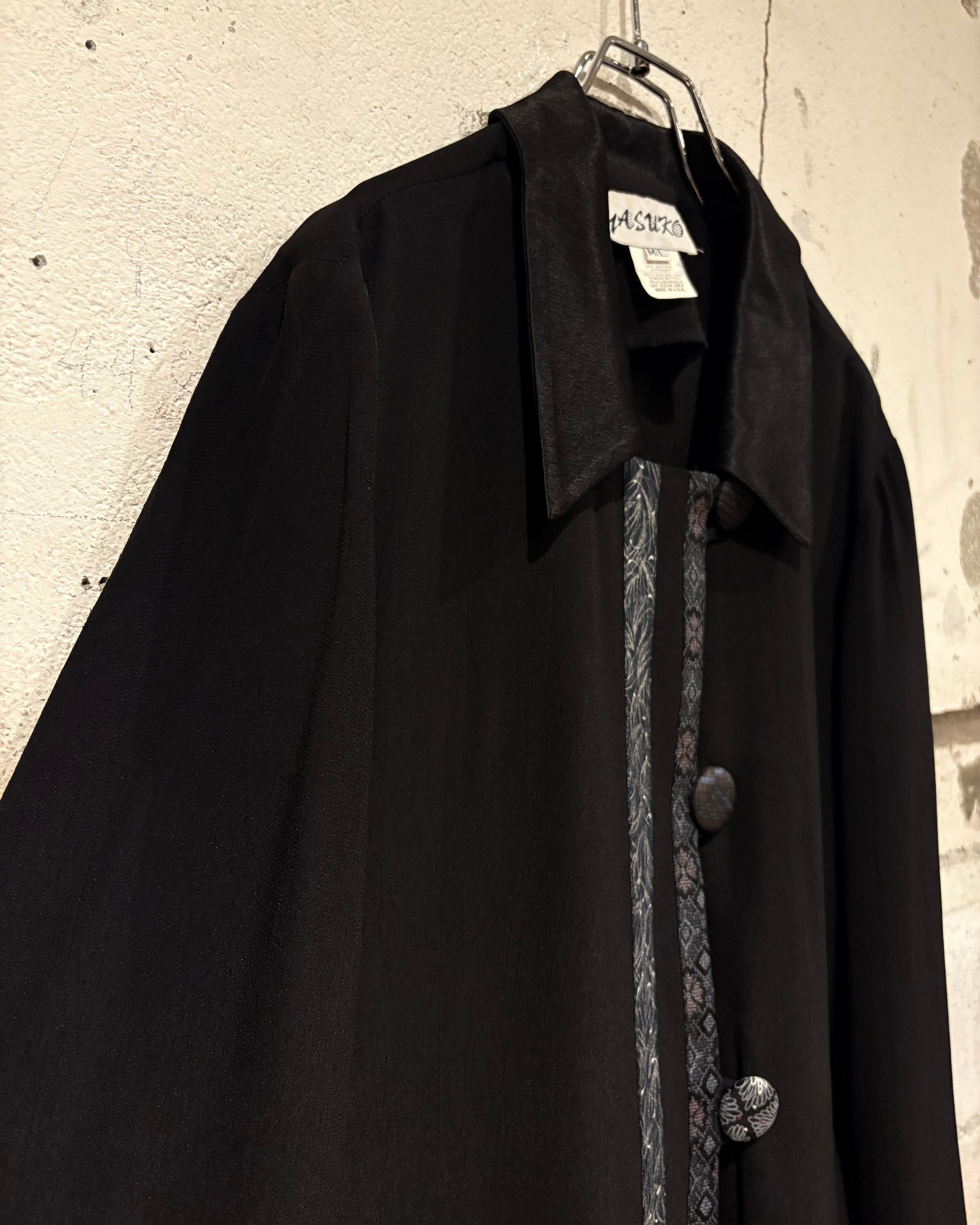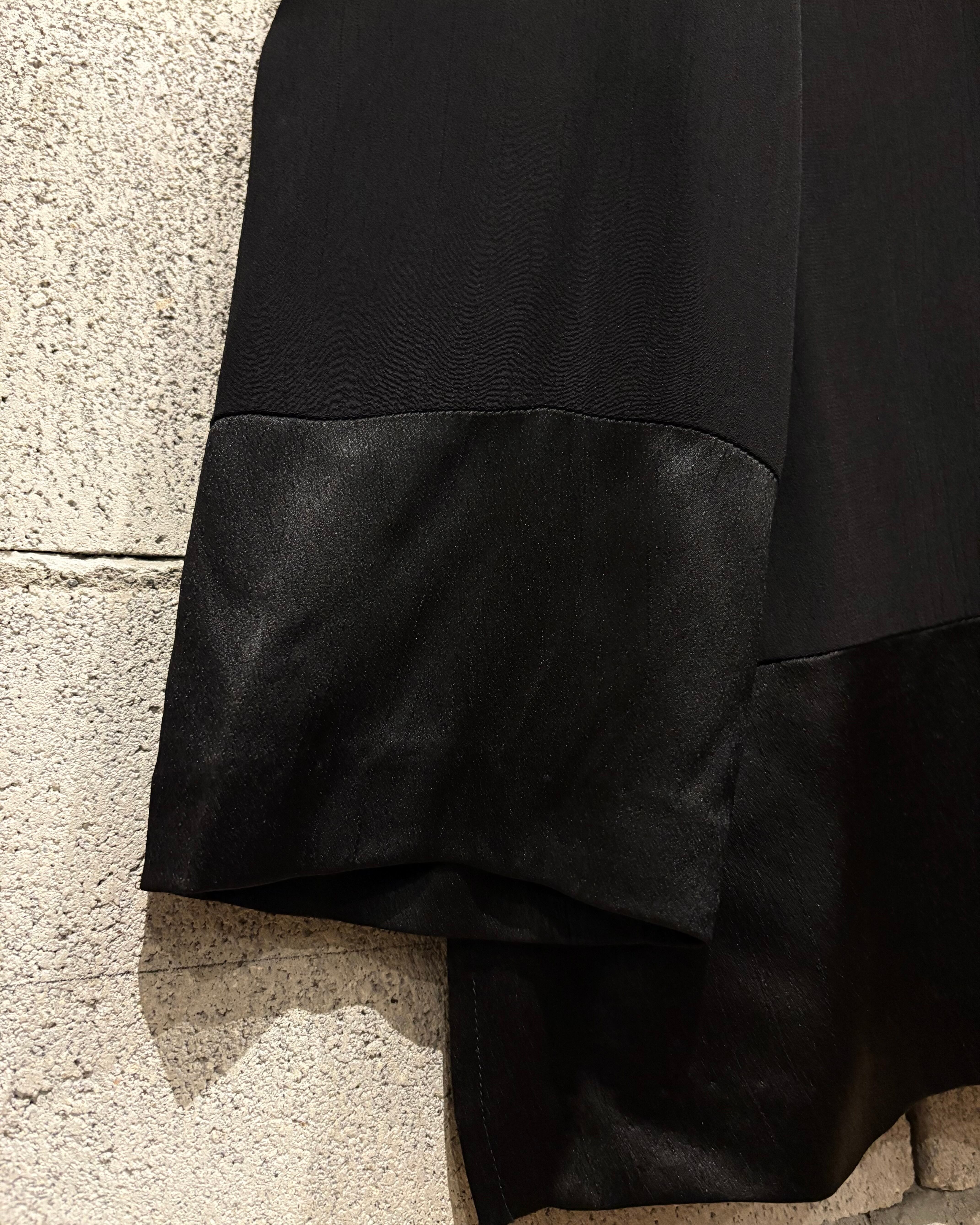 加えて、襟、袖口、裾には光沢のある生地を切り替え。動くたびに艶が浮かび上がり、全体をエレガントかつラグジュアリーな印象に仕上げています。ブラックを基調としながらも、切り替えの妙で単調さを感じさせない構成は秀逸。