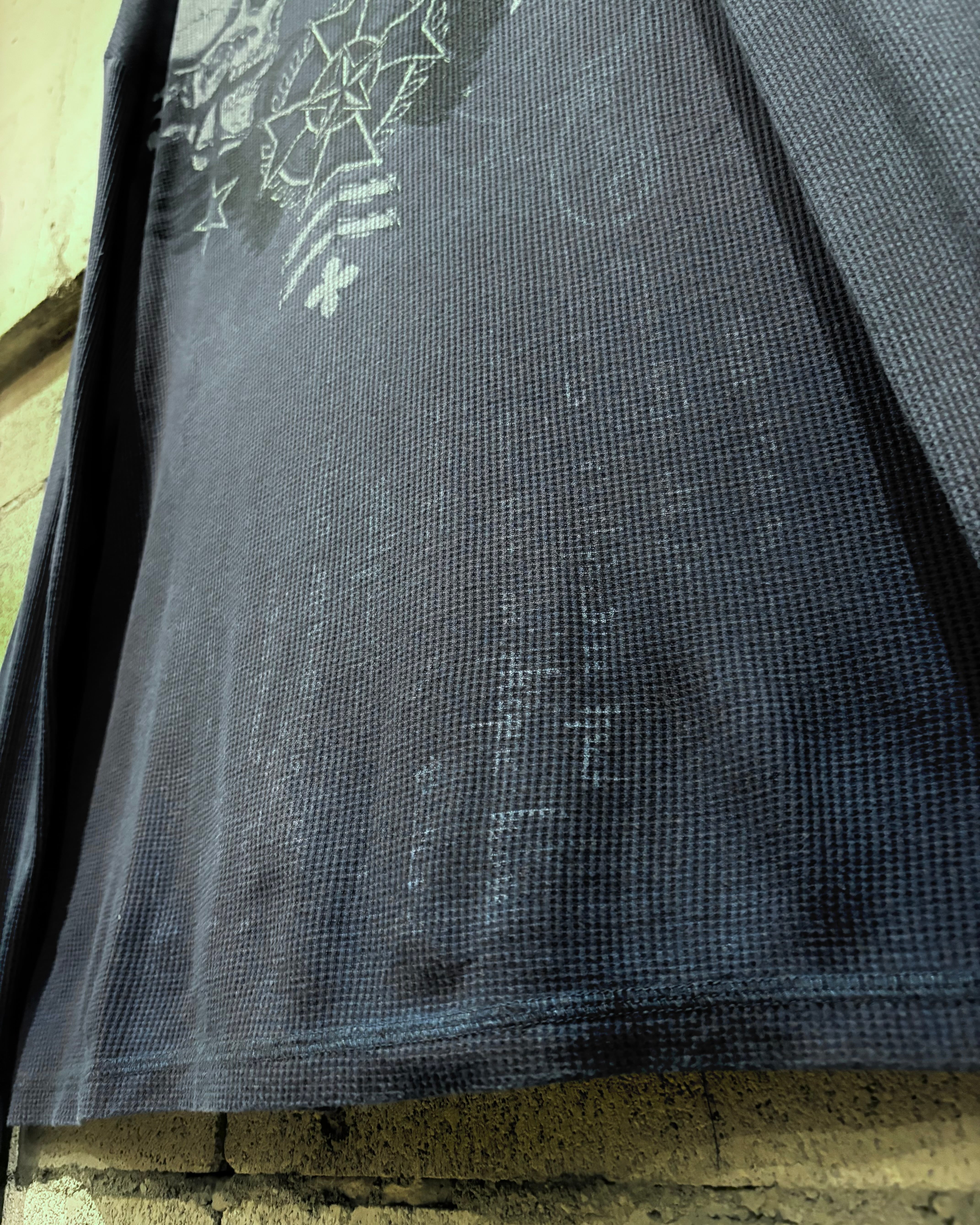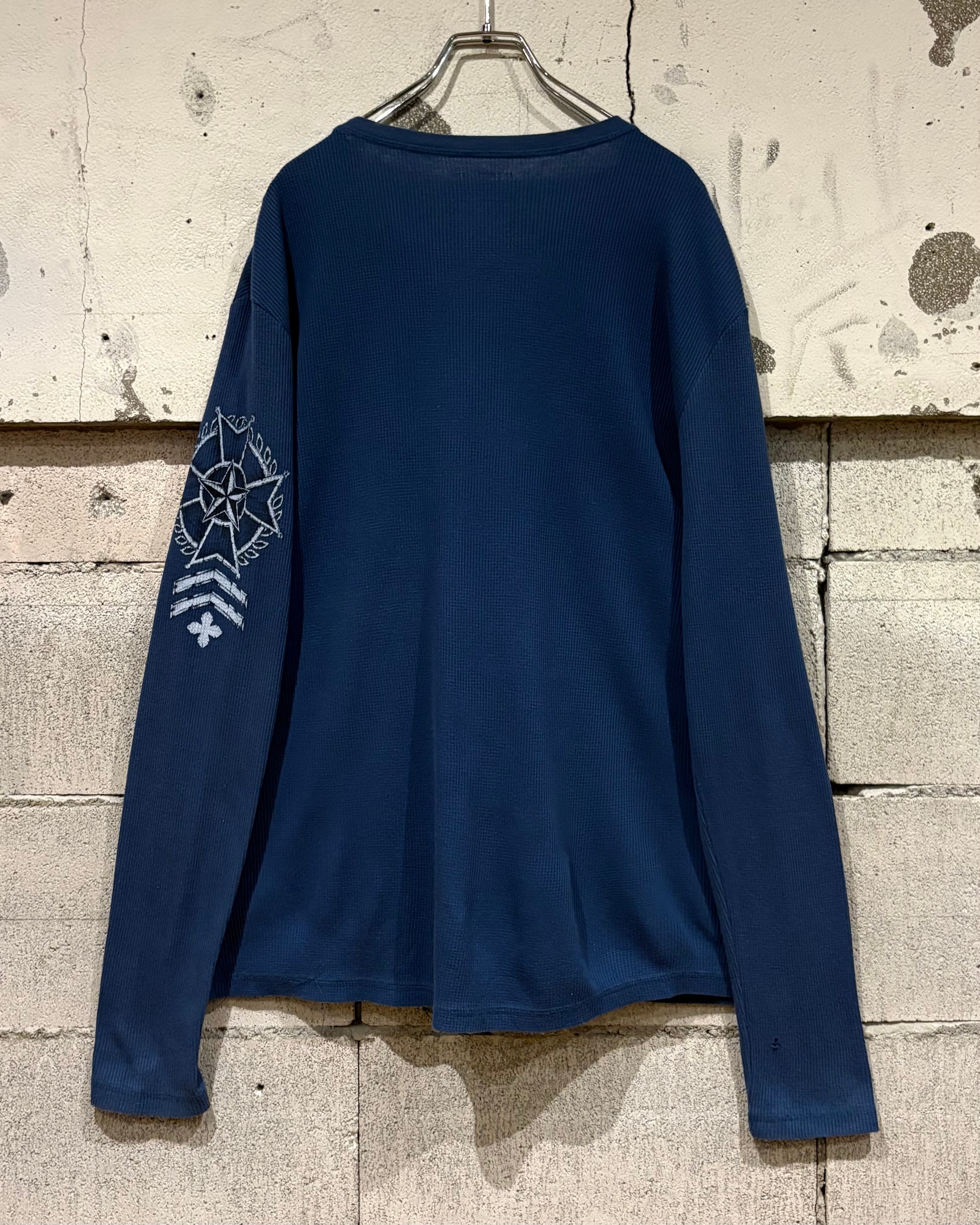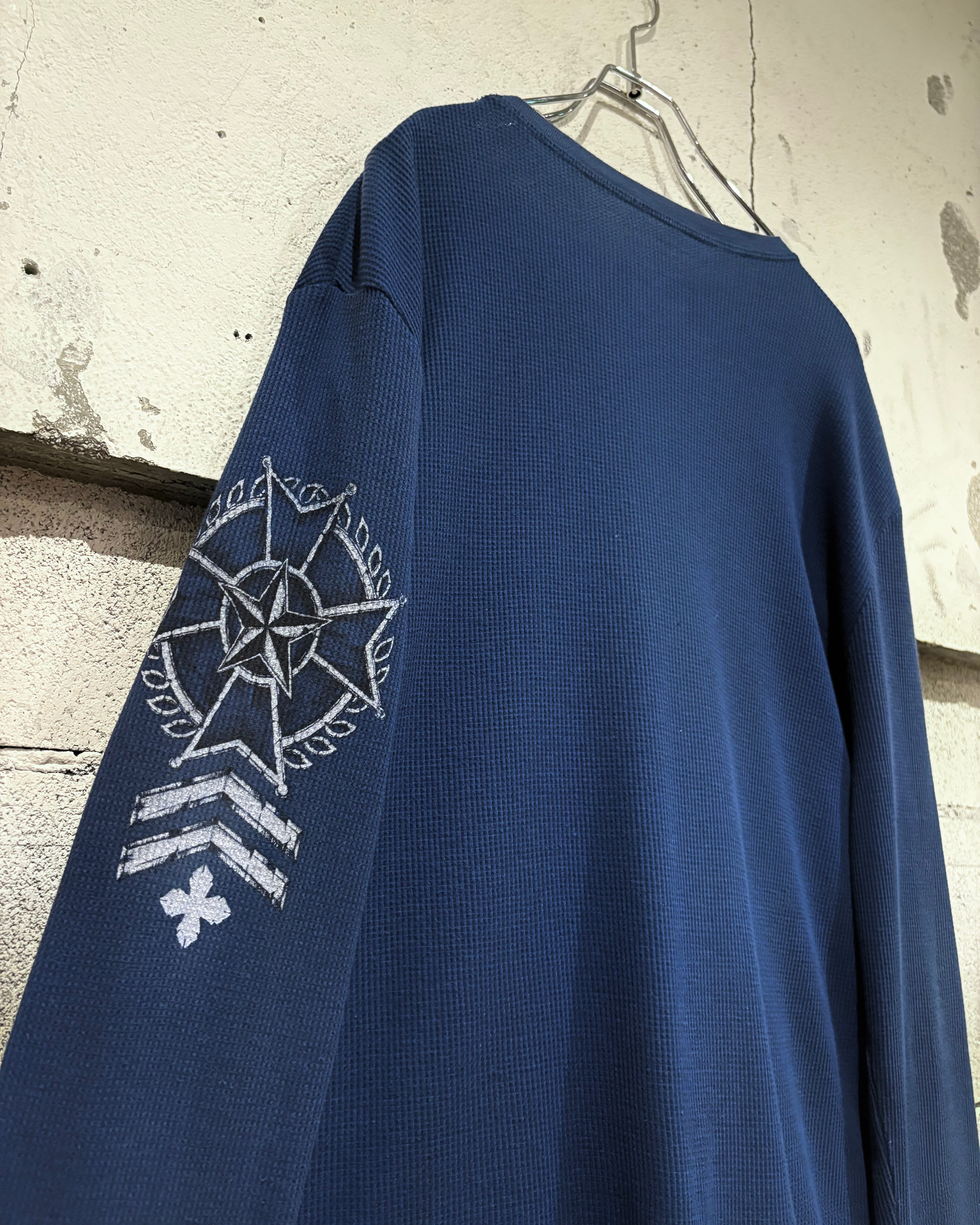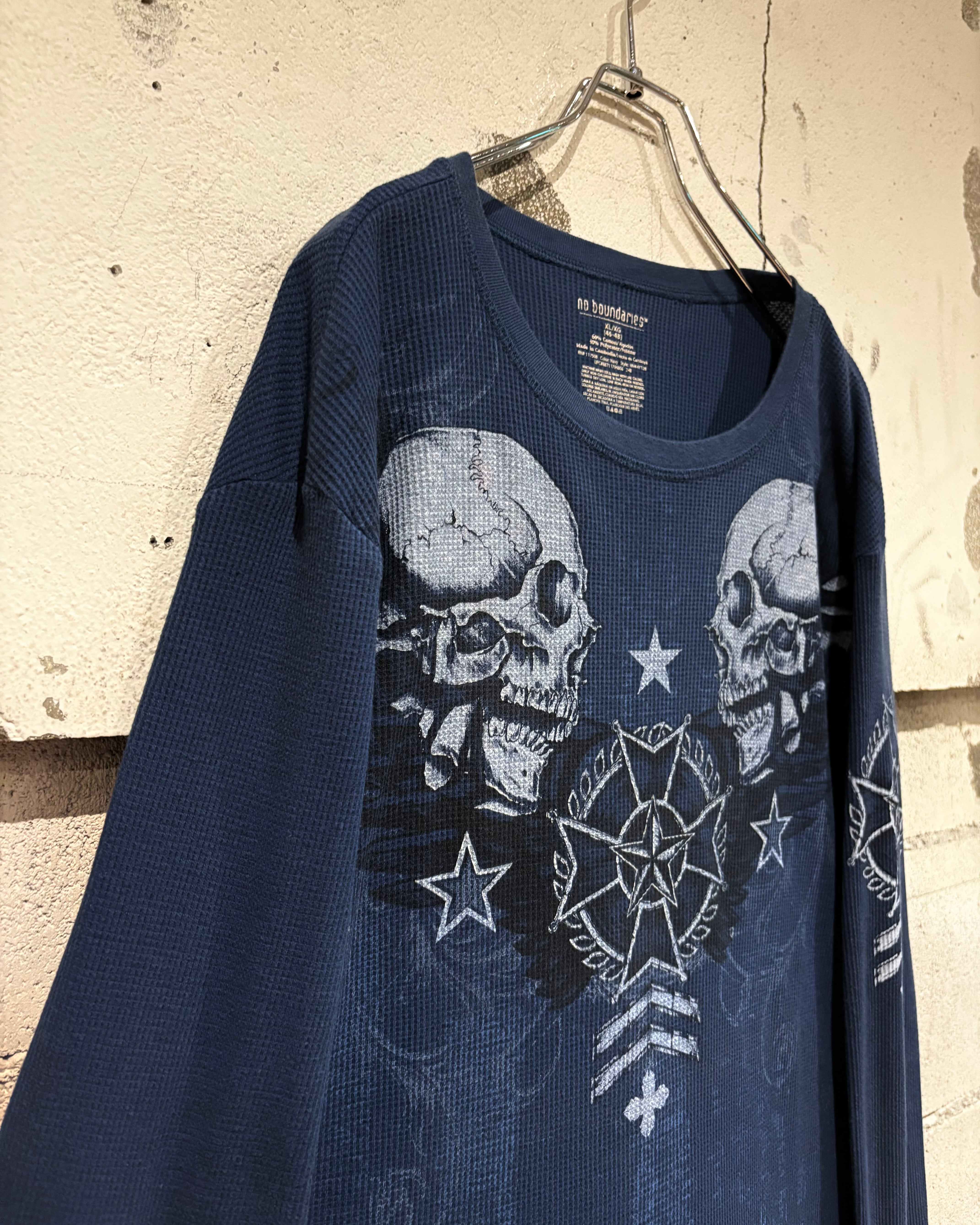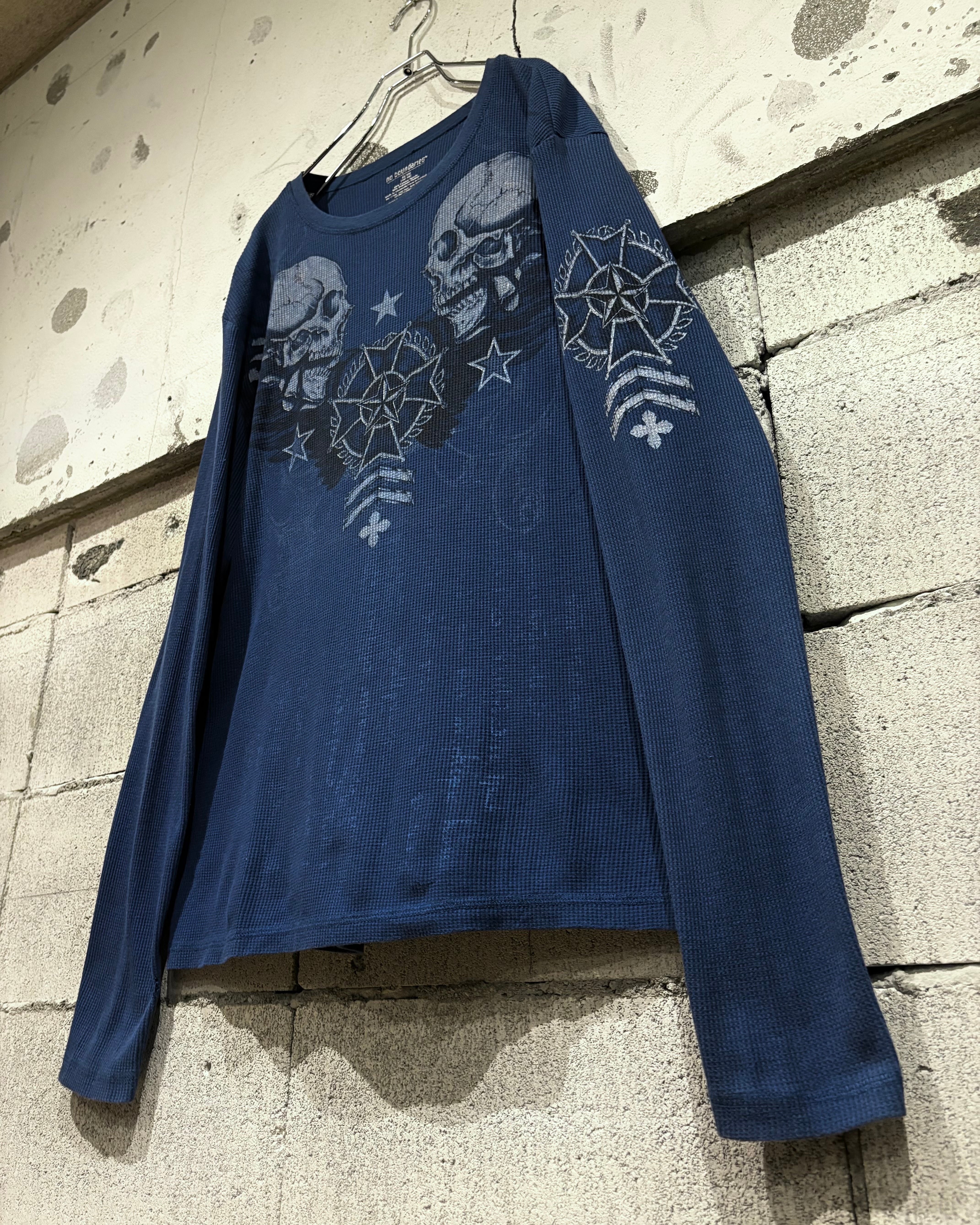 ネイビーのサーマル生地をベースに、フロントにスカル×スターのゴシックモチーフを左右対称に配置したロンT。