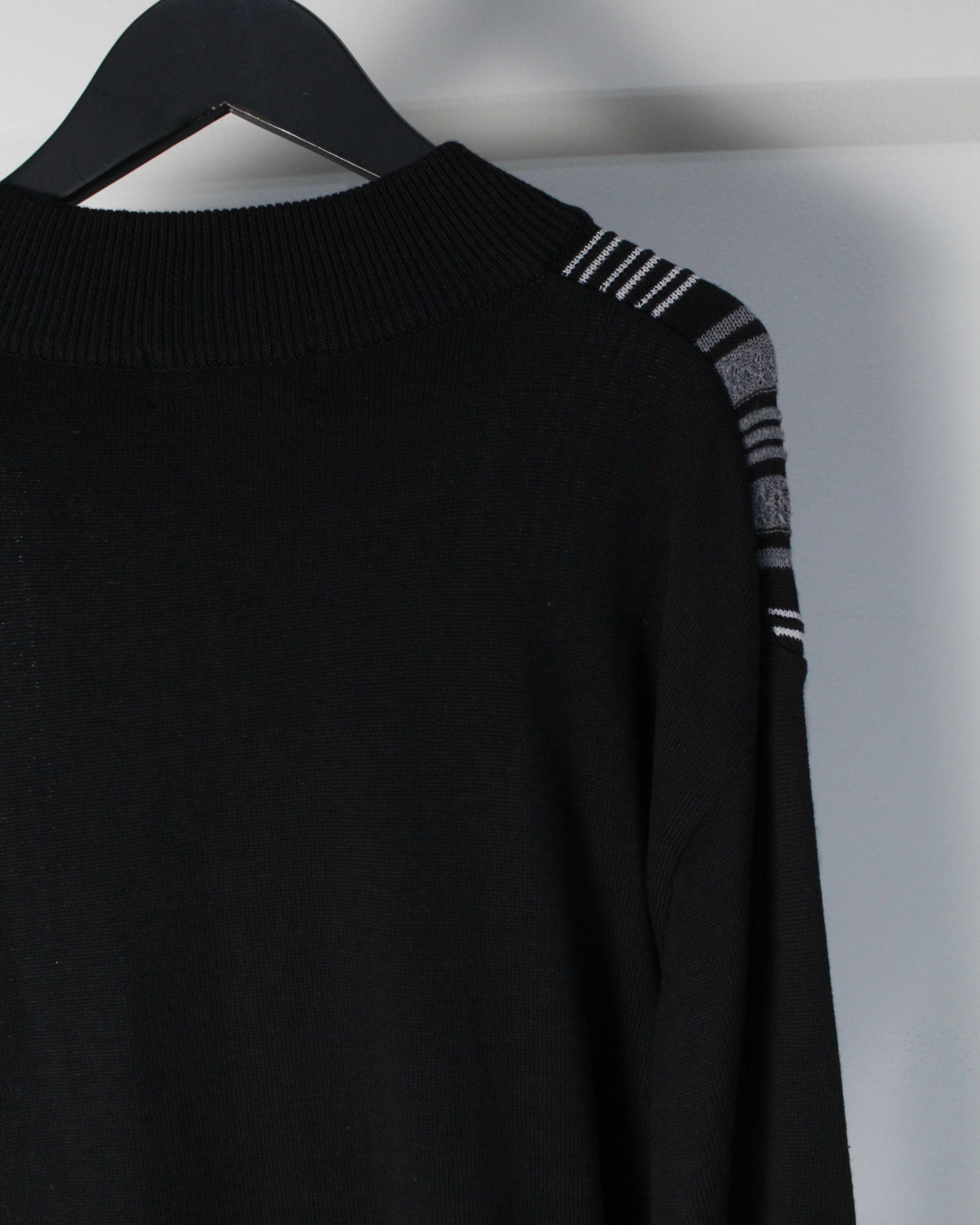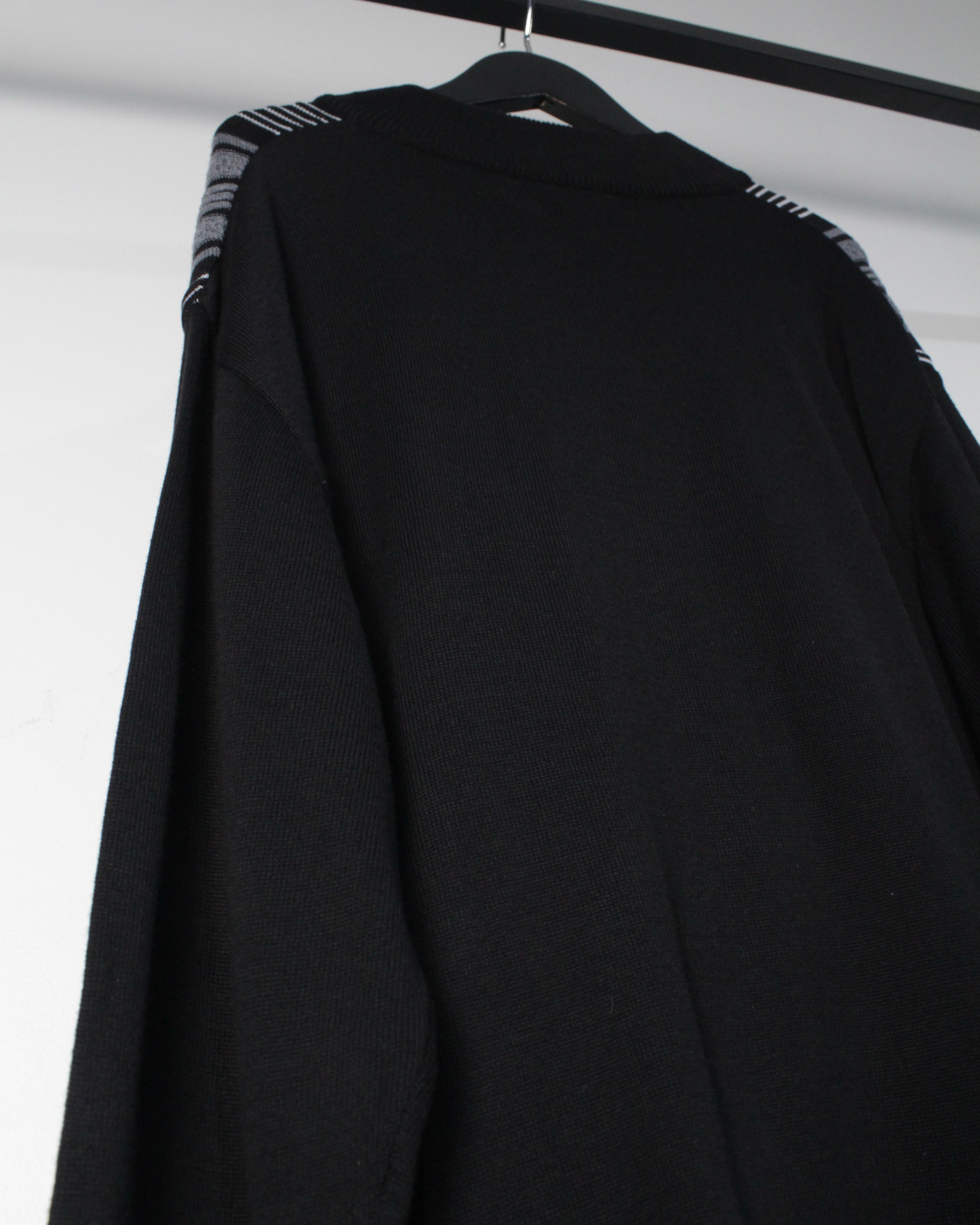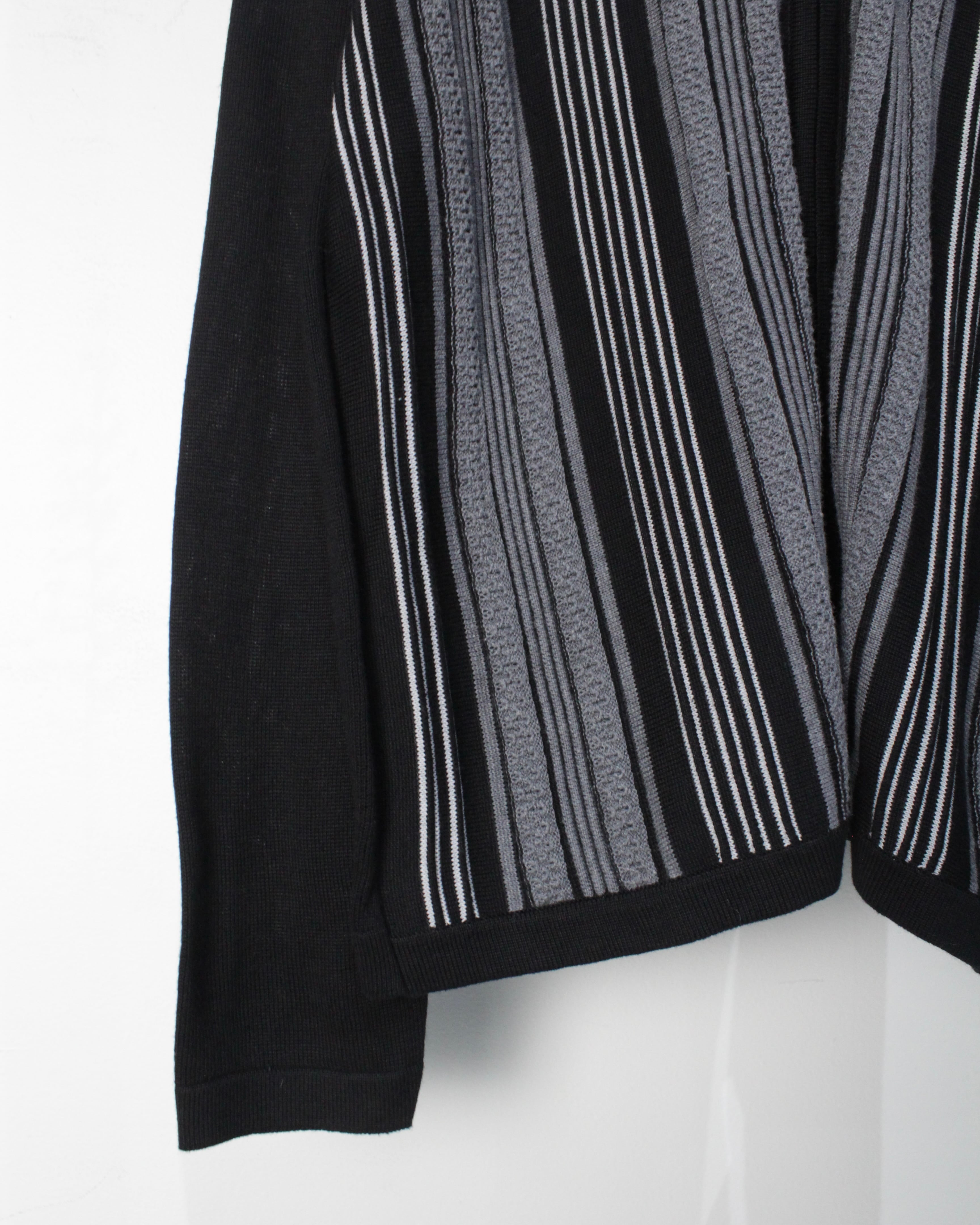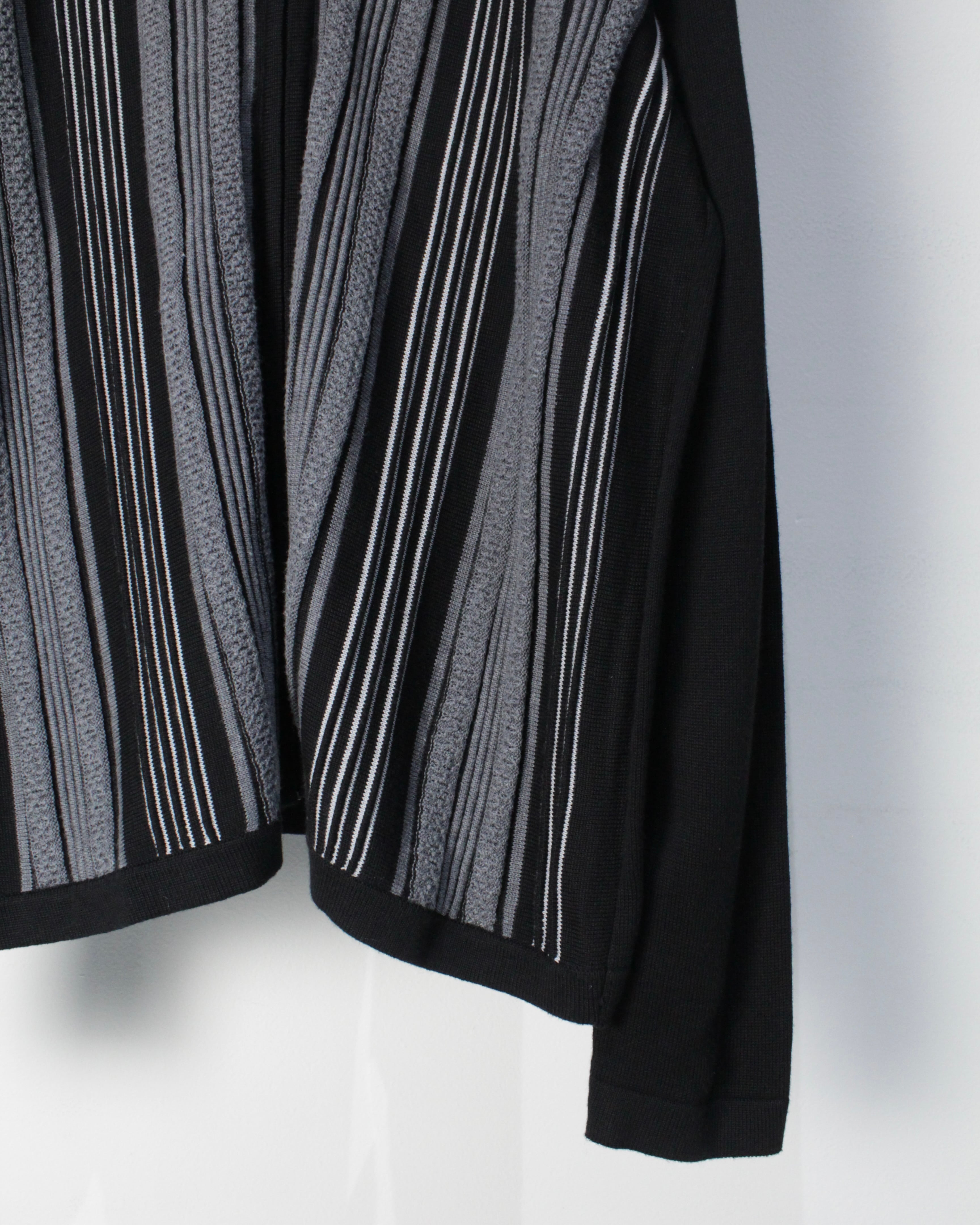 フロントに施された立体感編みで、グレー×ブラックのストライプが走るデザインは、当店らしいモードや雰囲気を漂わせています。