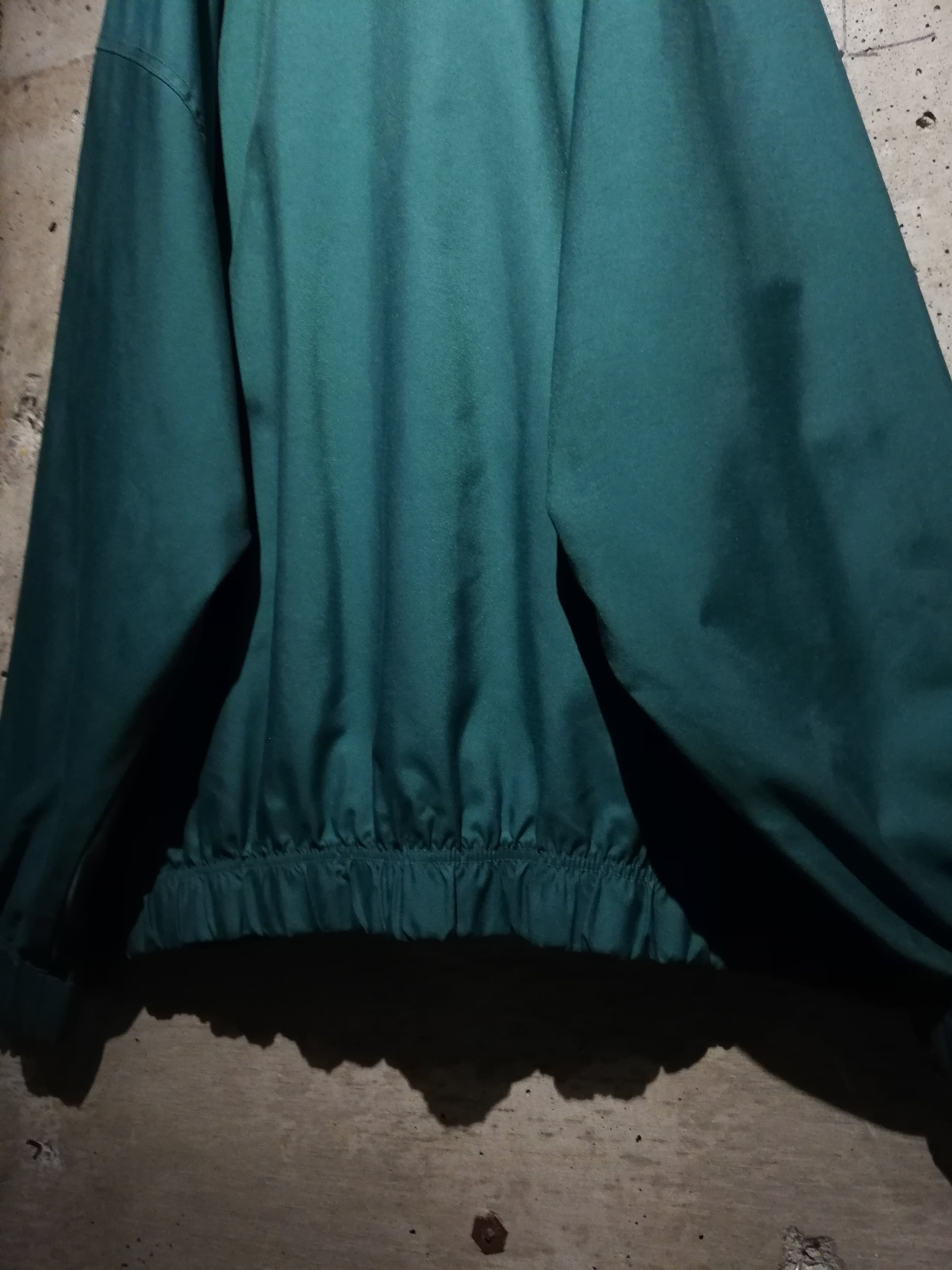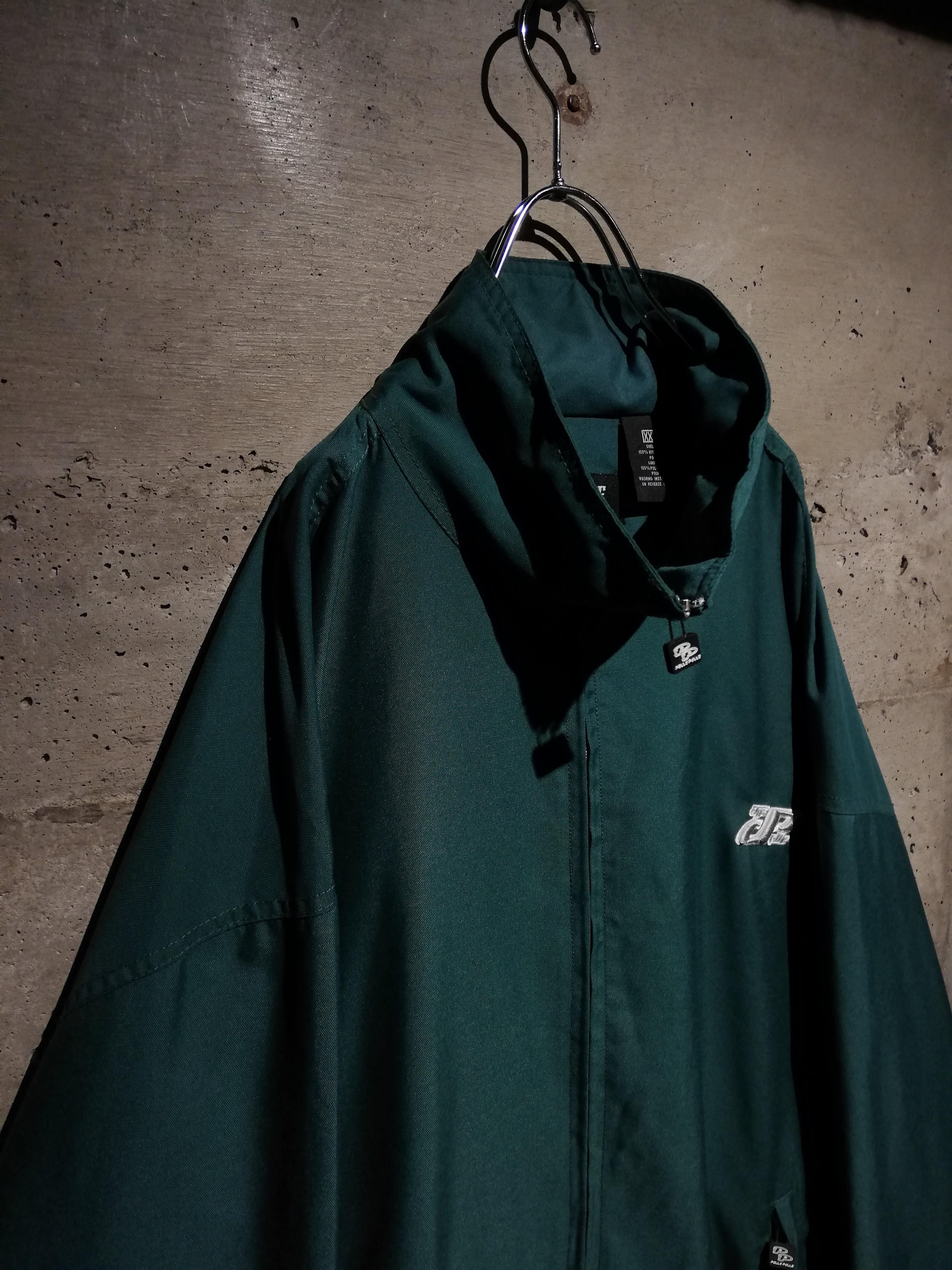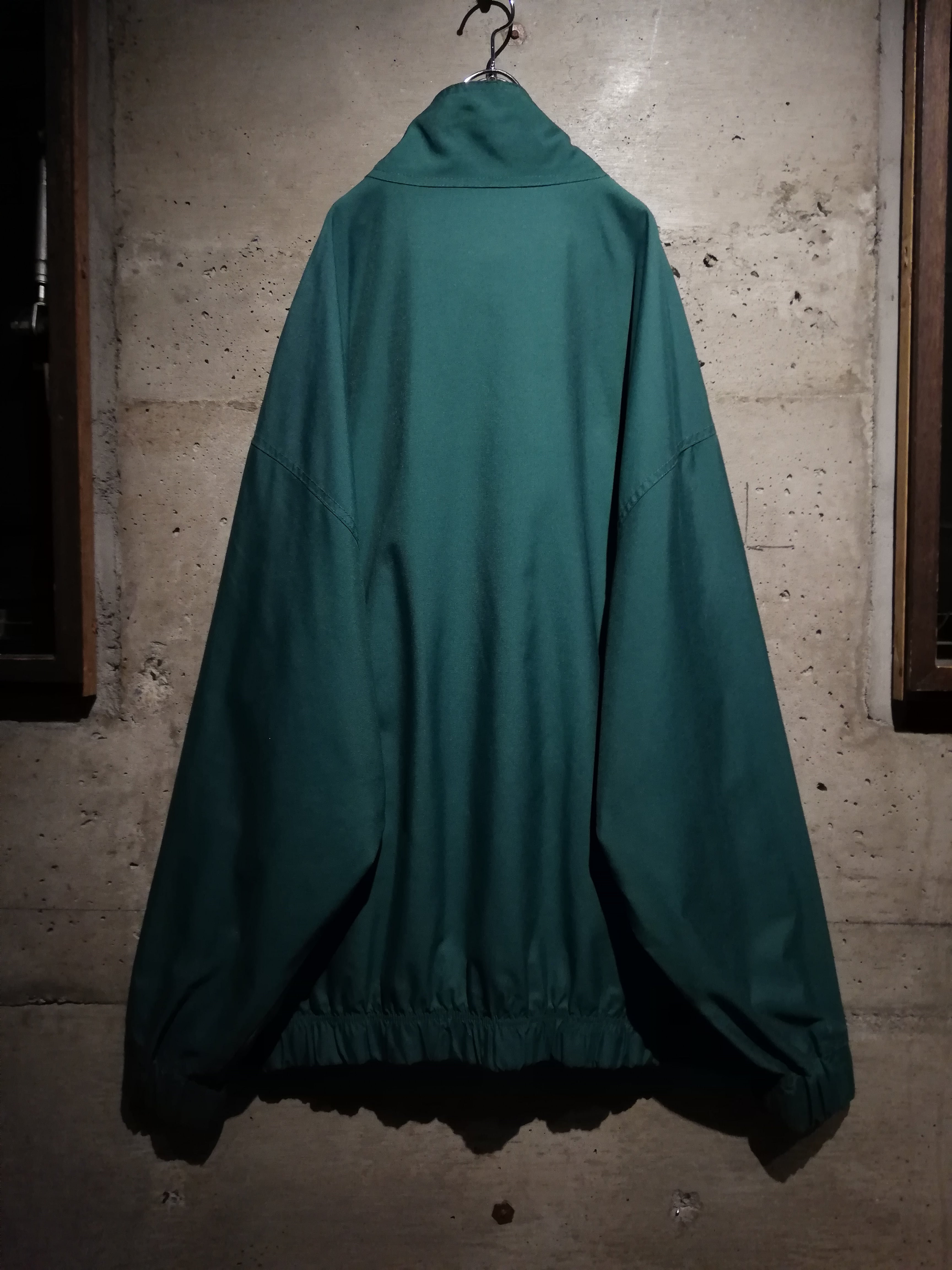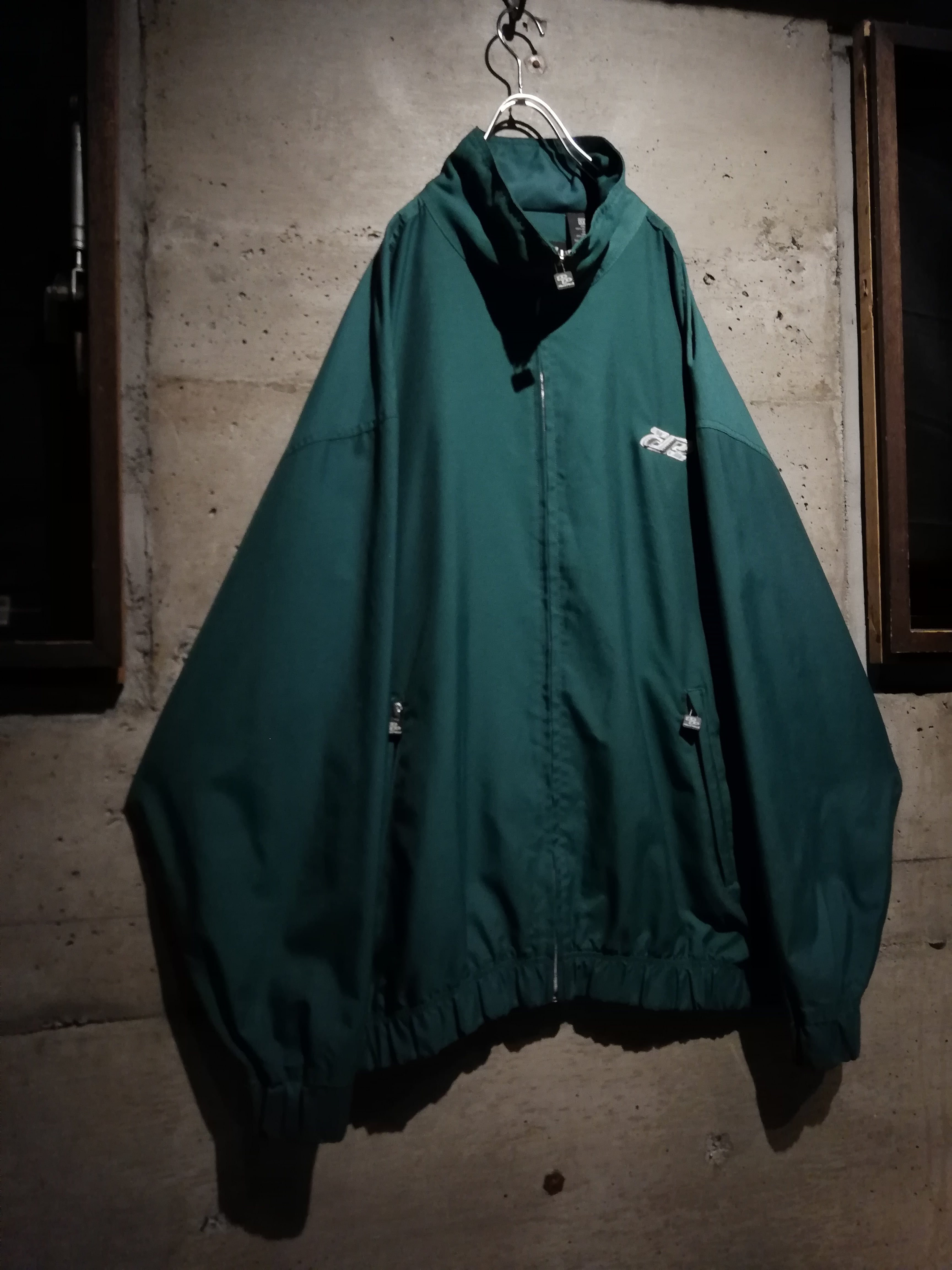 深みのあるエメラルドグリーンのボディに、フロント胸元に立体な刺繍ロゴを刻んだナイロンジャケット。