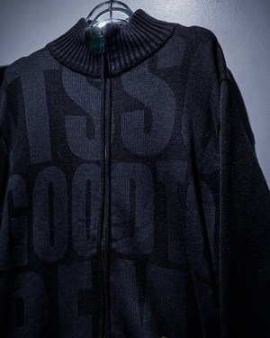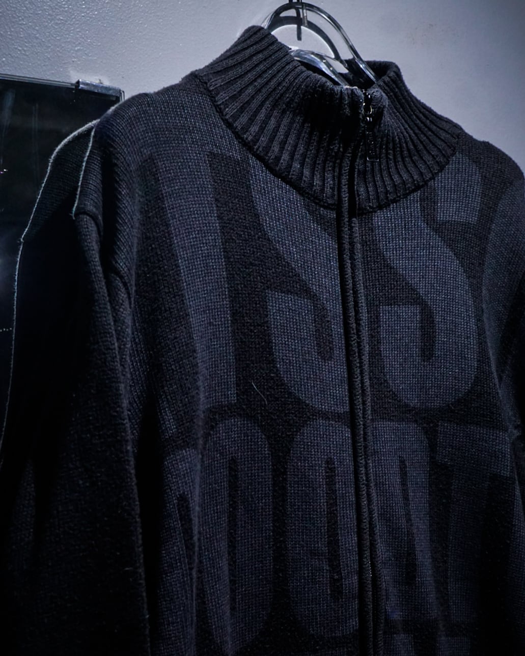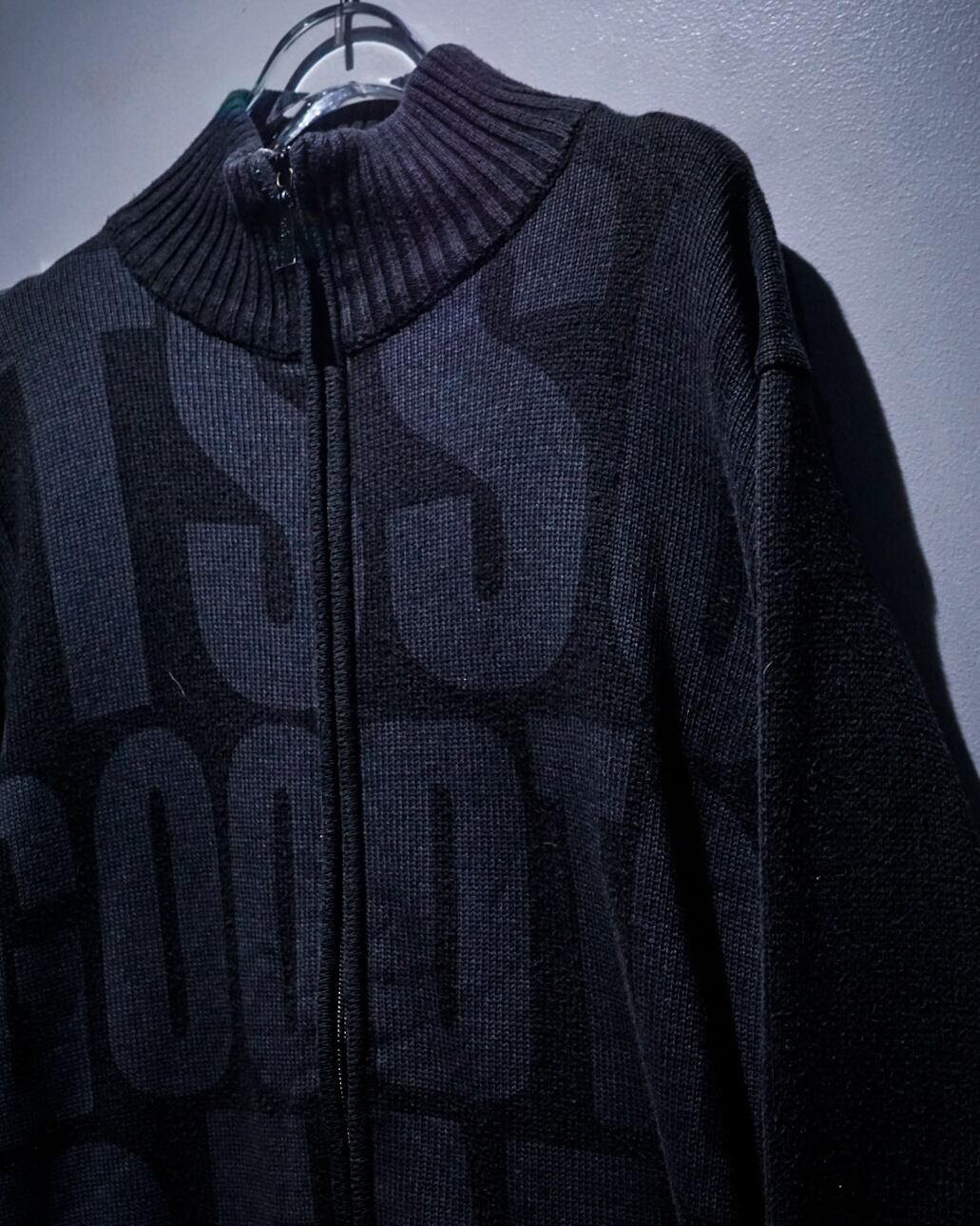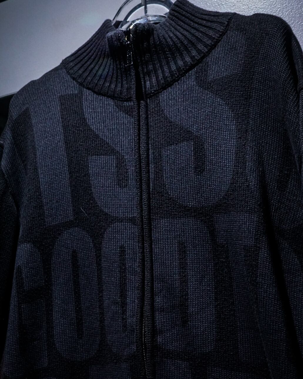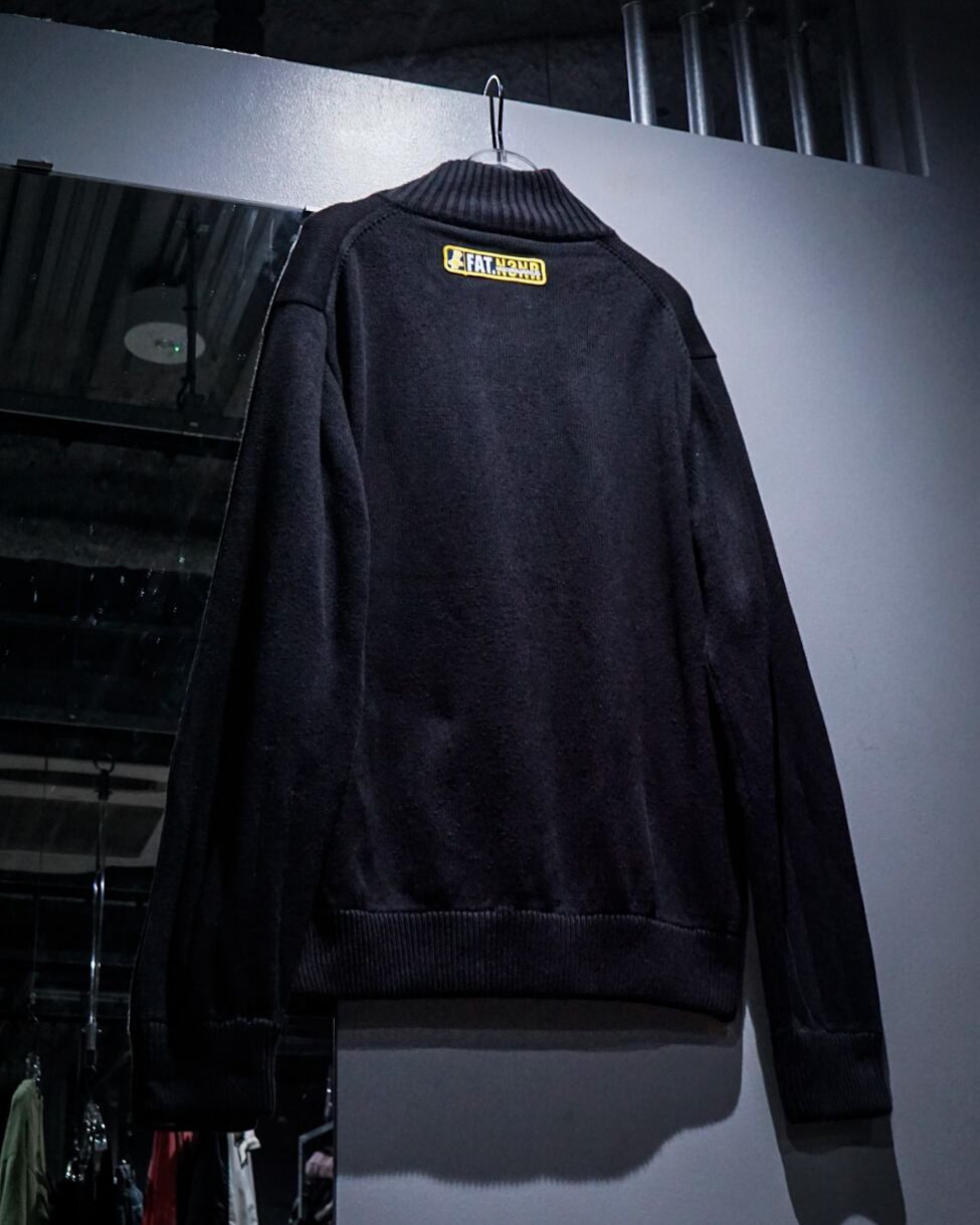 ブラックのボディに、ロゴを大胆に表現した“FAT. NSNR”のジップアップニット。