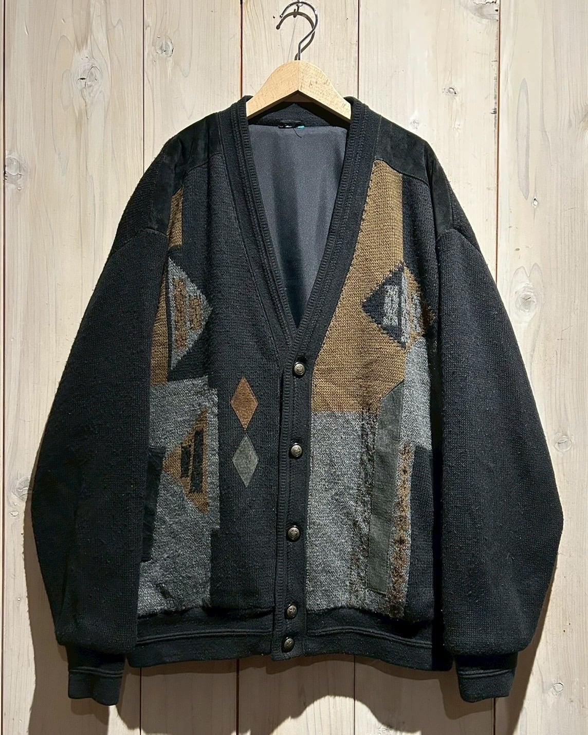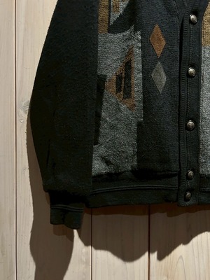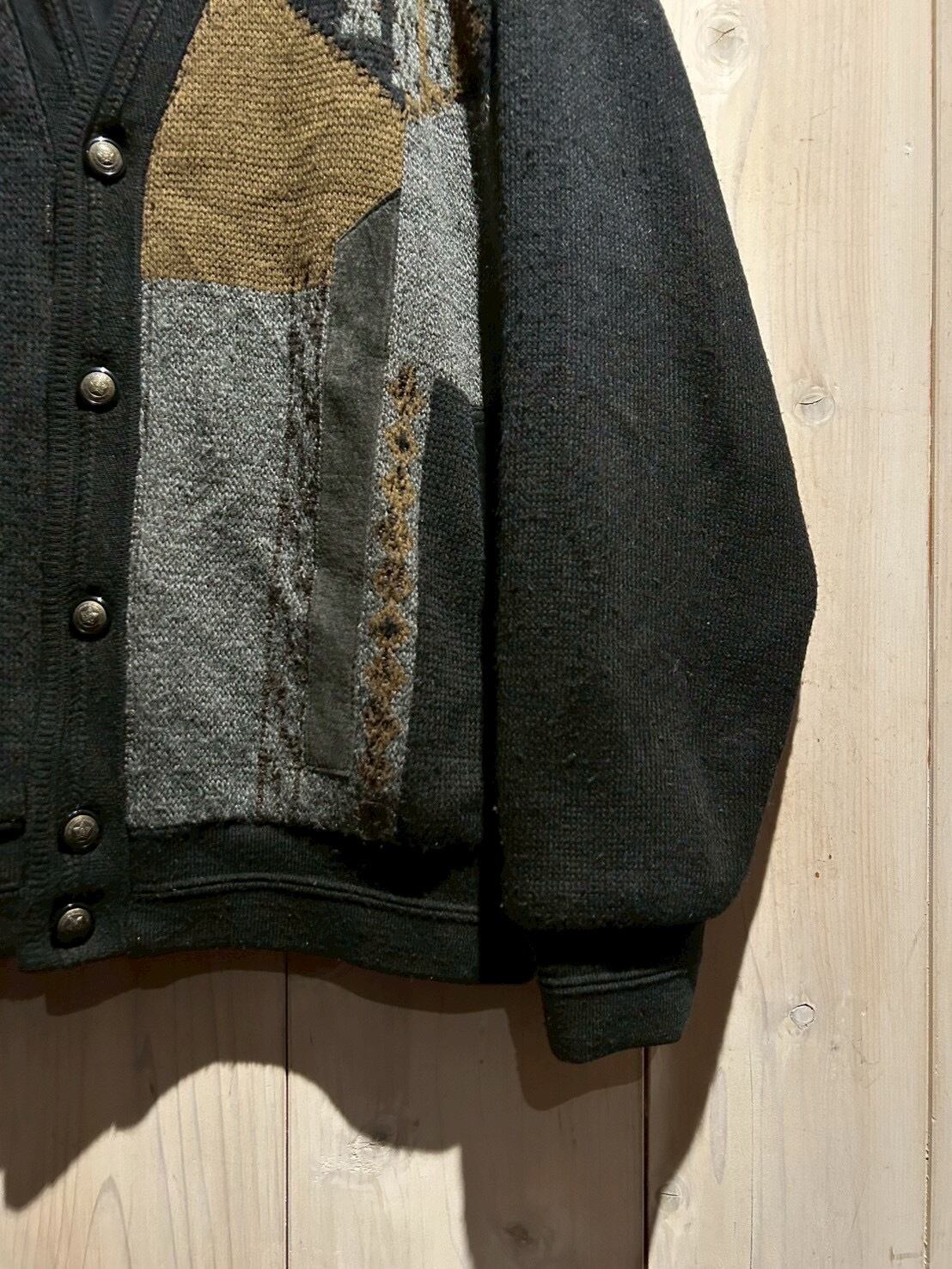 ブラックを基調に、カーキやグレーの落ち着いたトーン切り替えが施されたカーディガンジャケット。