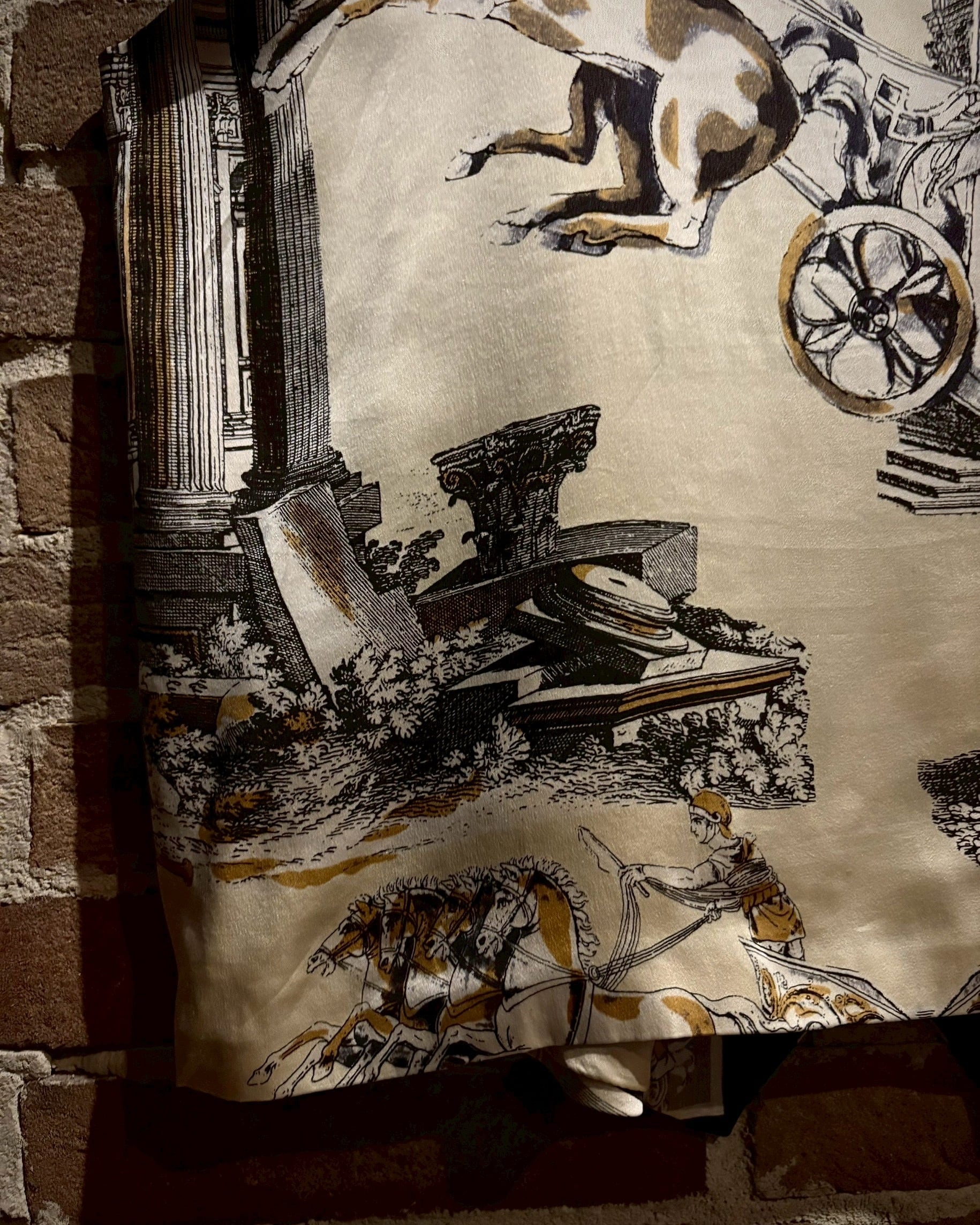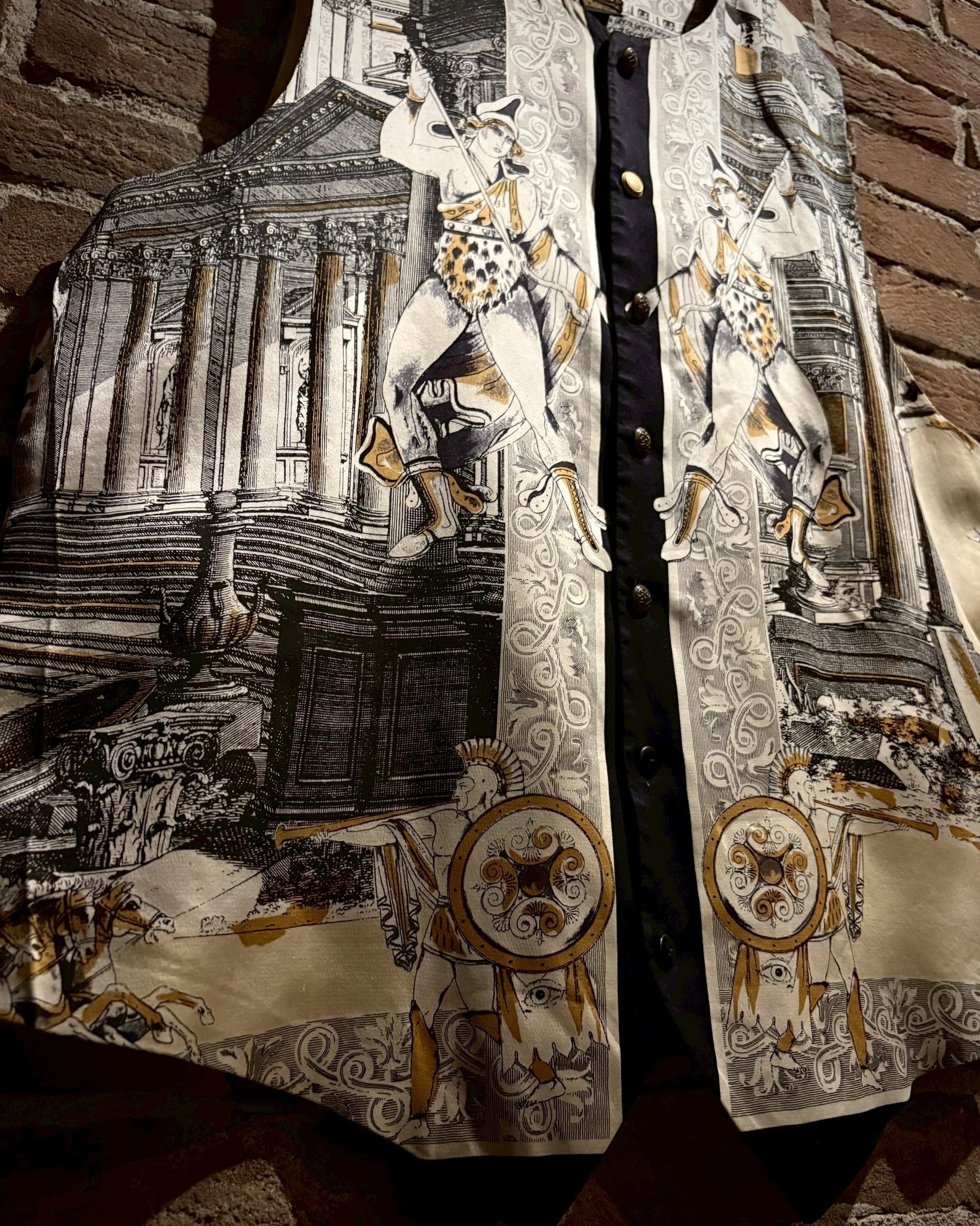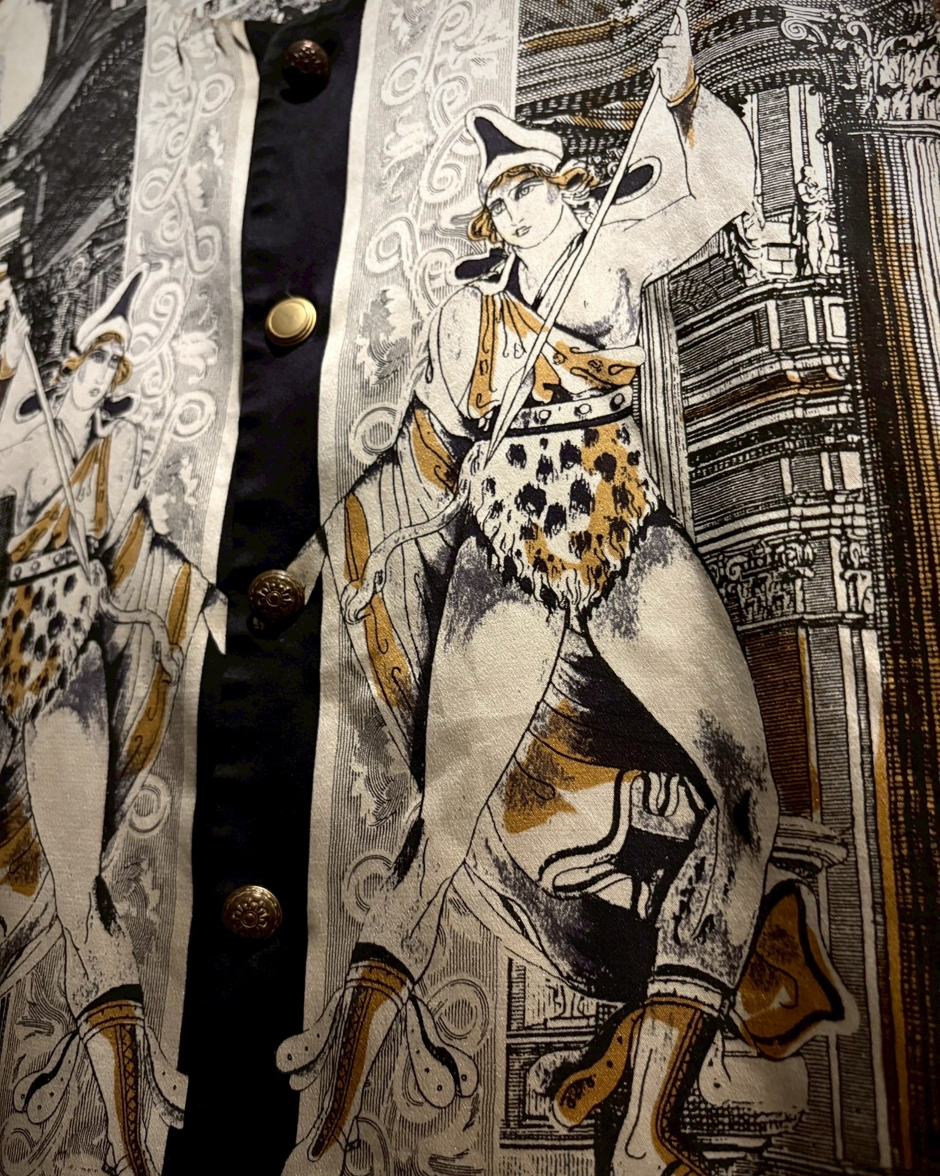 フロントには古代ローマの建築物と兵士をモチーフにした大胆な総柄プリントが施され、アートピースさながらの存在感。建築物や戦士の図柄は、まるで美術館の壁画を切り取ったかのような迫力を持ちます。背面にも天馬や戦車といったモチーフが描かれ、360度抜かりないデザイン性。