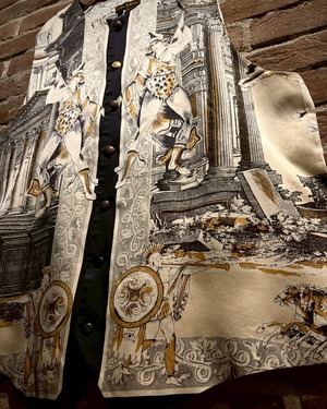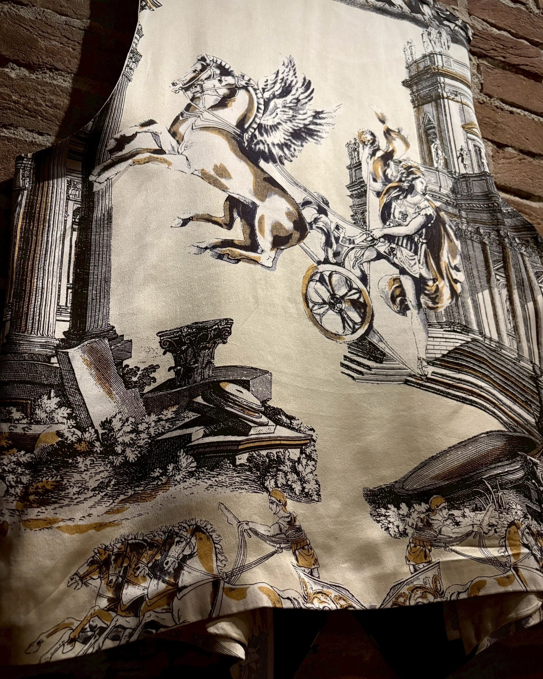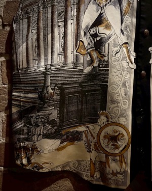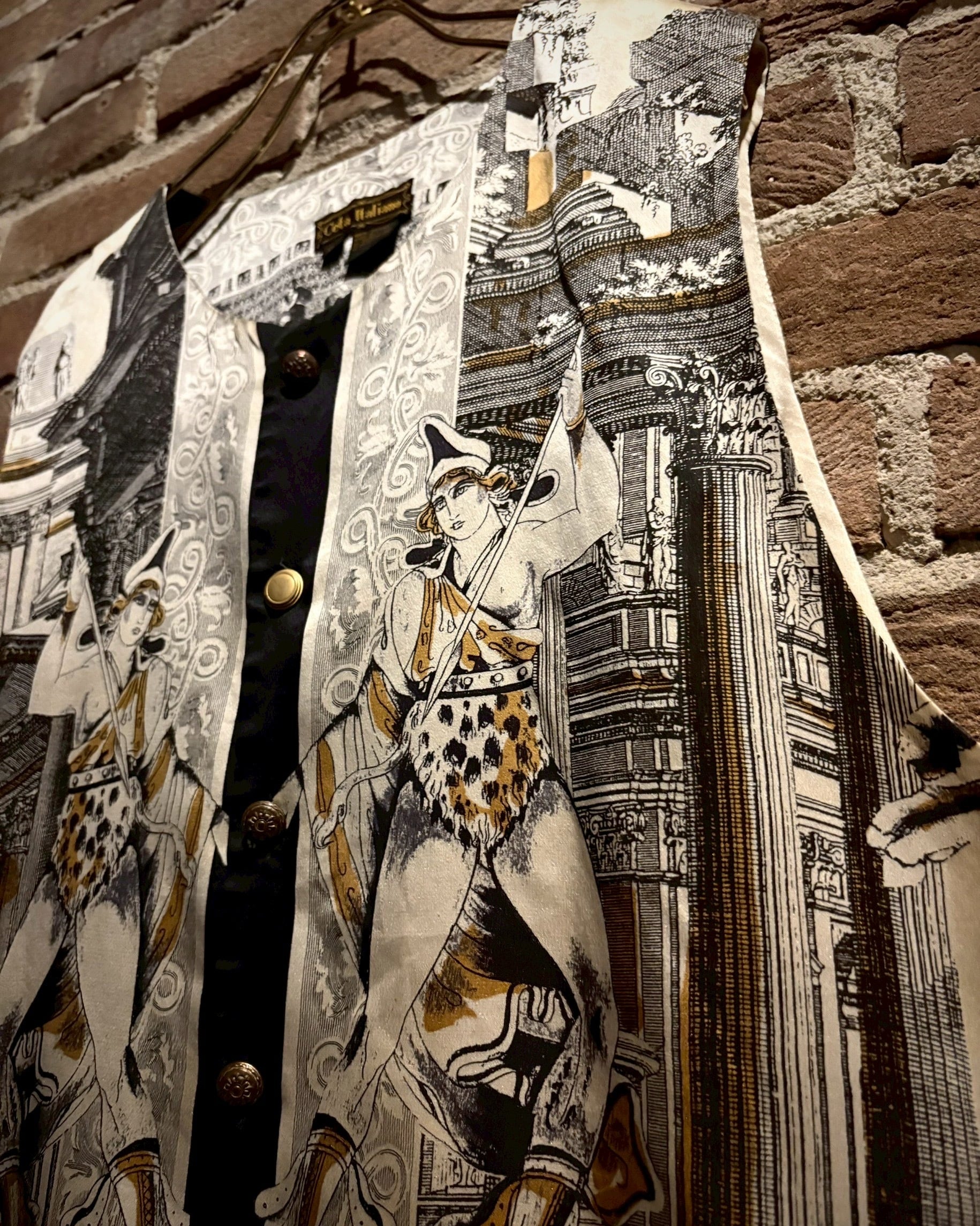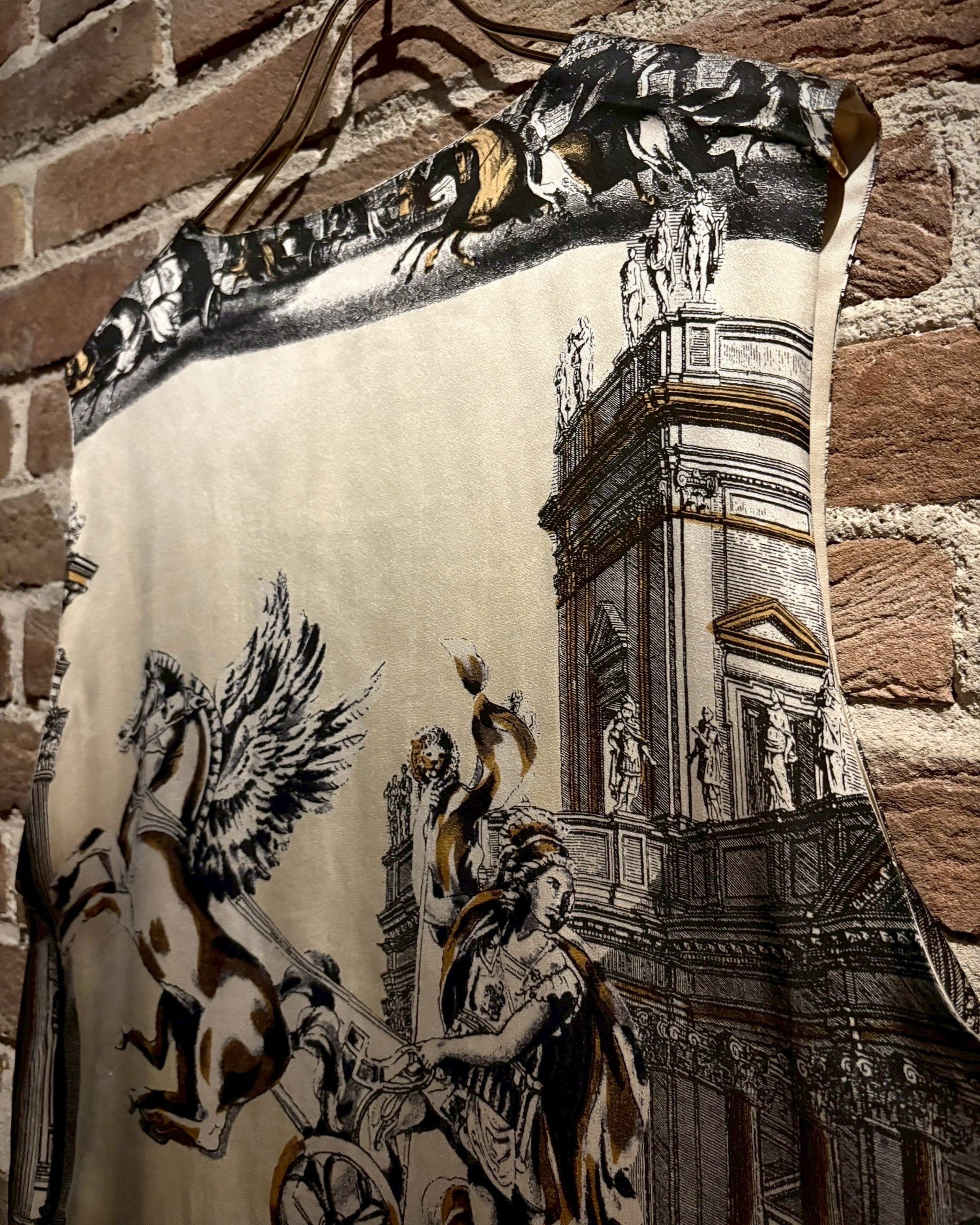 フロントには古代ローマの建築物と兵士をモチーフにした大胆な総柄プリントが施され、アートピースさながらの存在感。建築物や戦士の図柄は、まるで美術館の壁画を切り取ったかのような迫力を持ちます。背面にも天馬や戦車といったモチーフが描かれ、360度抜かりないデザイン性。