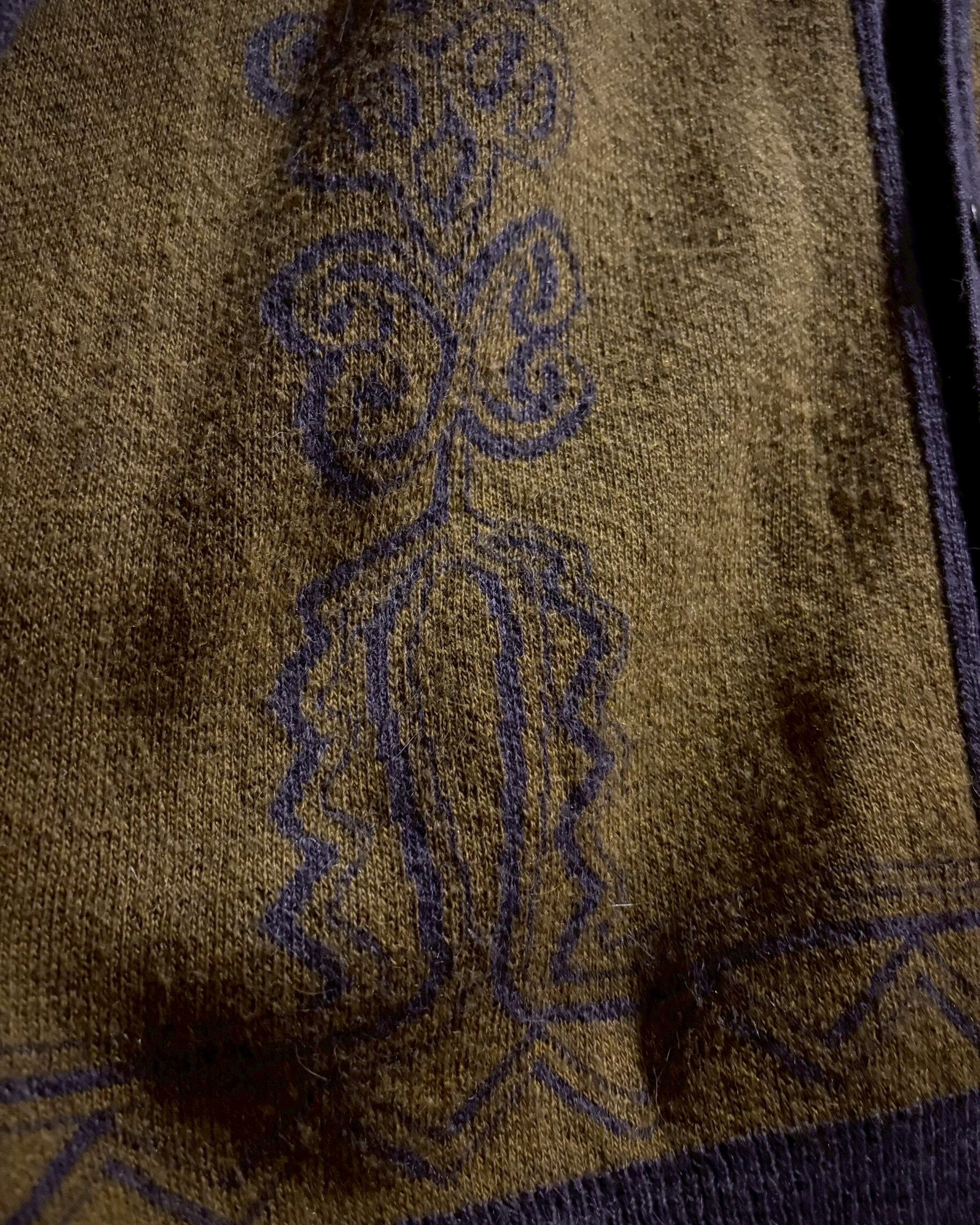 深みのあるグレーとマスタードイエローのバイカラーに、アートのような装飾的パターンを配した存在感抜群の1着。