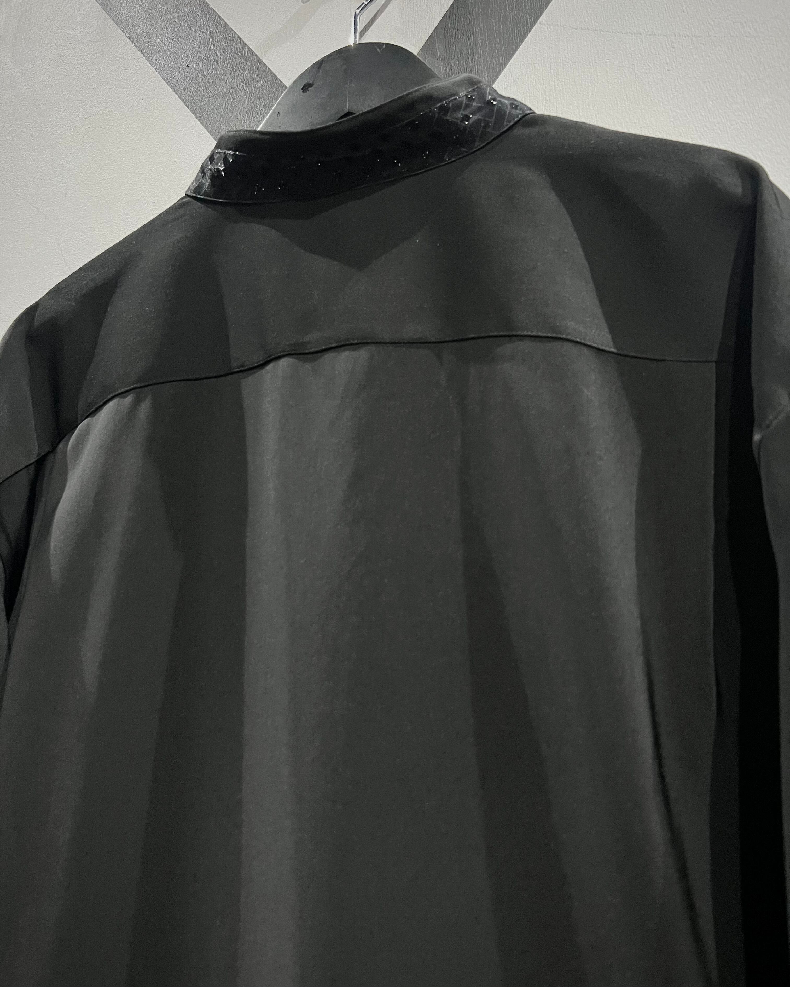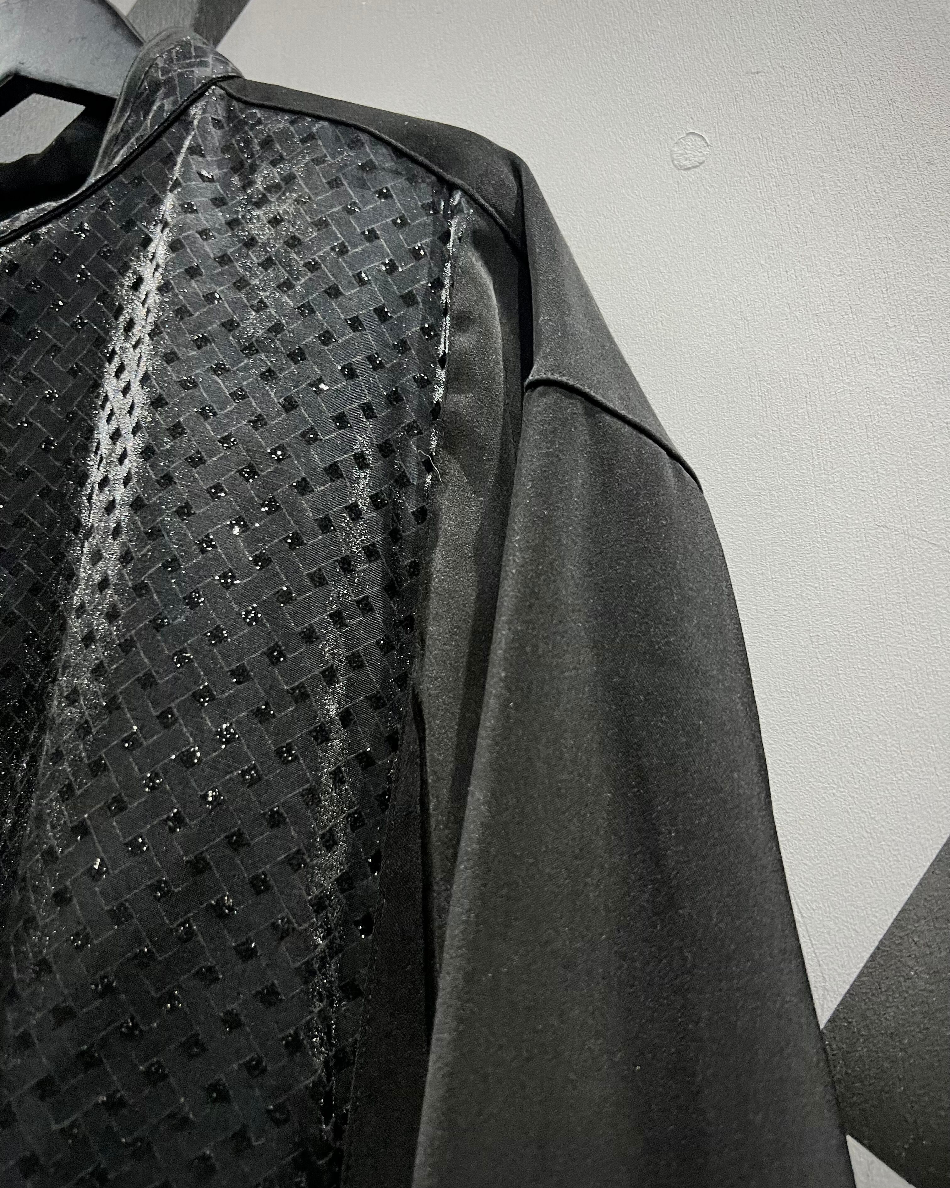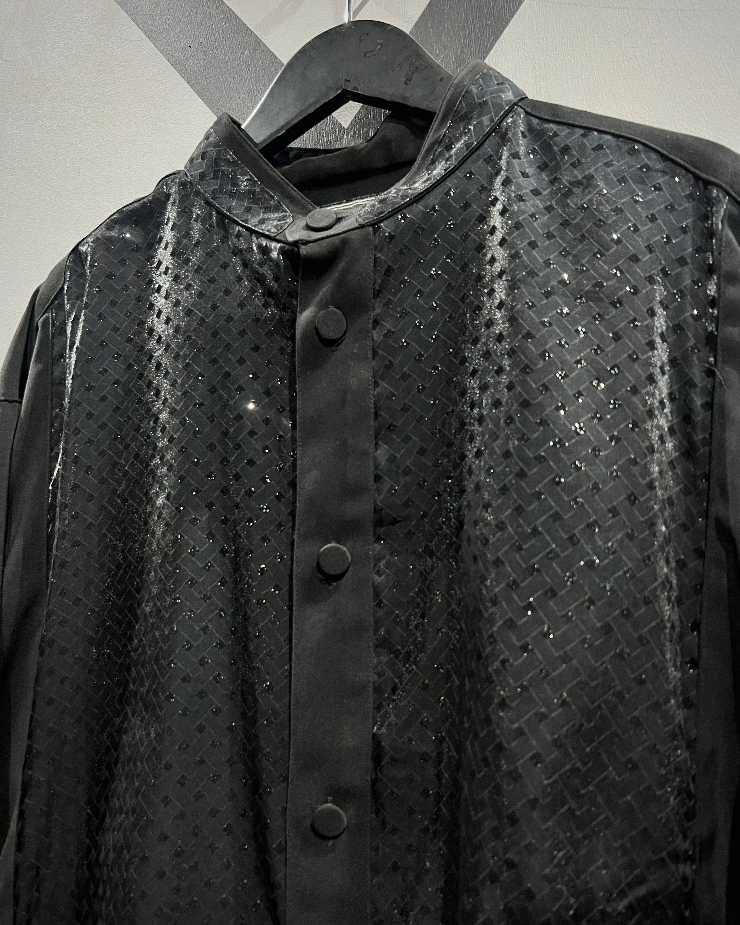 ハリのあるブラックのポリエステル素材をベースに、フロント一面にグリッターを織り込んだクロスパターンで切り替えたスペシャルなバンドカラーシャツ。