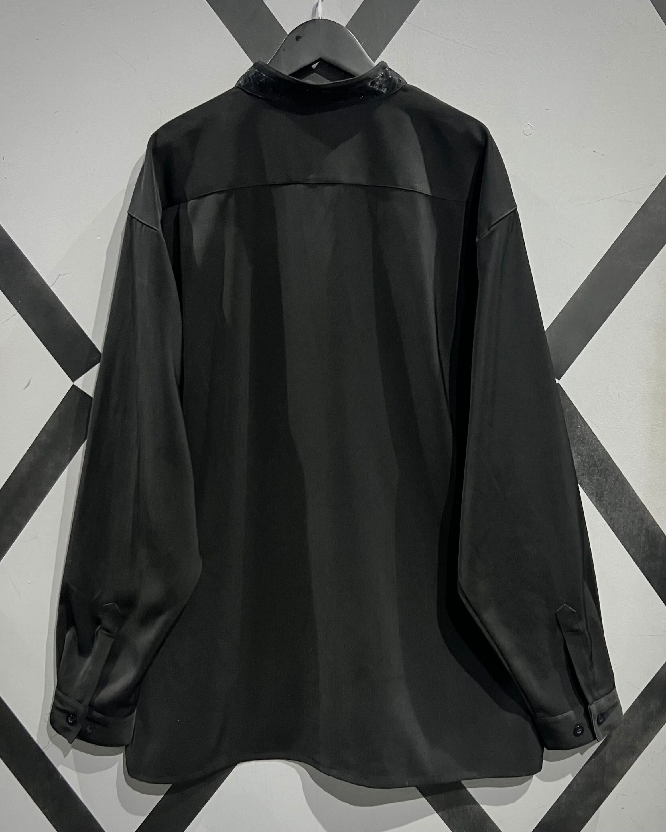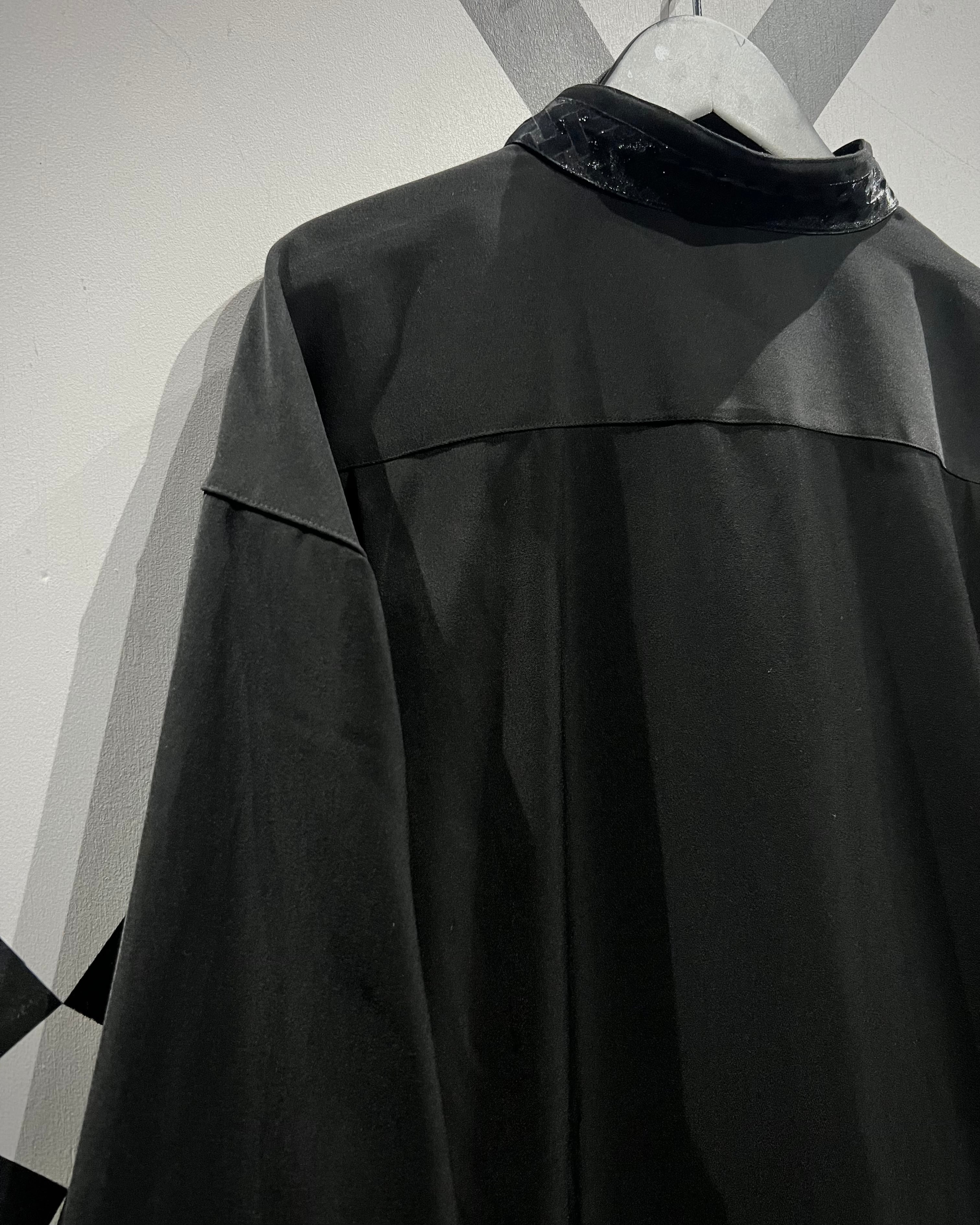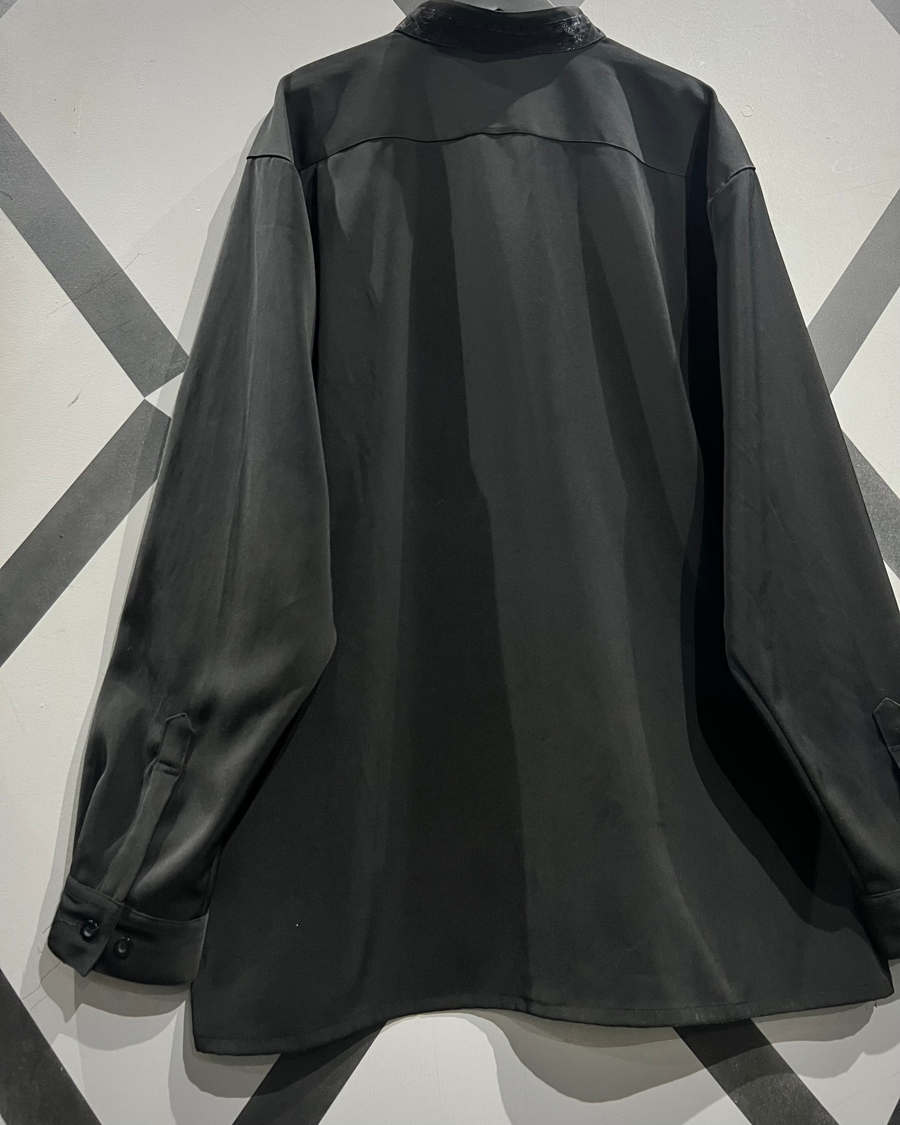 ハリのあるブラックのポリエステル素材をベースに、フロント一面にグリッターを織り込んだクロスパターンで切り替えたスペシャルなバンドカラーシャツ。