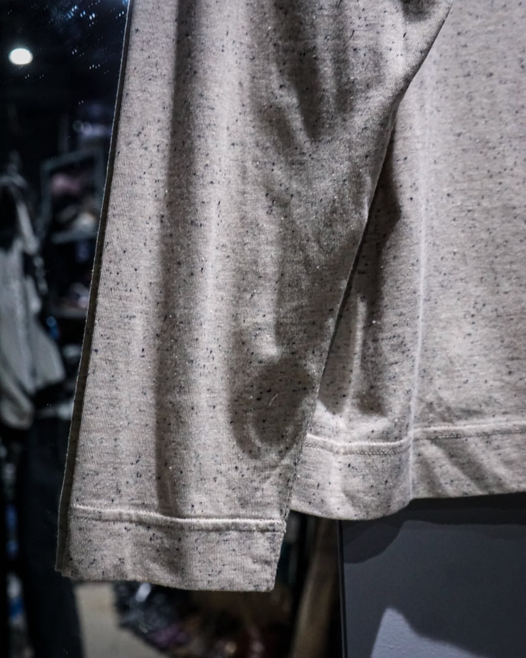ネックはブラックで切り替えられたリンガー仕様になっており、全体を程よく引き締めつつ、スタイリングにアクセントをプラス。さらに細かくネップが散りばめられたような杢生地は、表情豊かで存在感を放ちます。