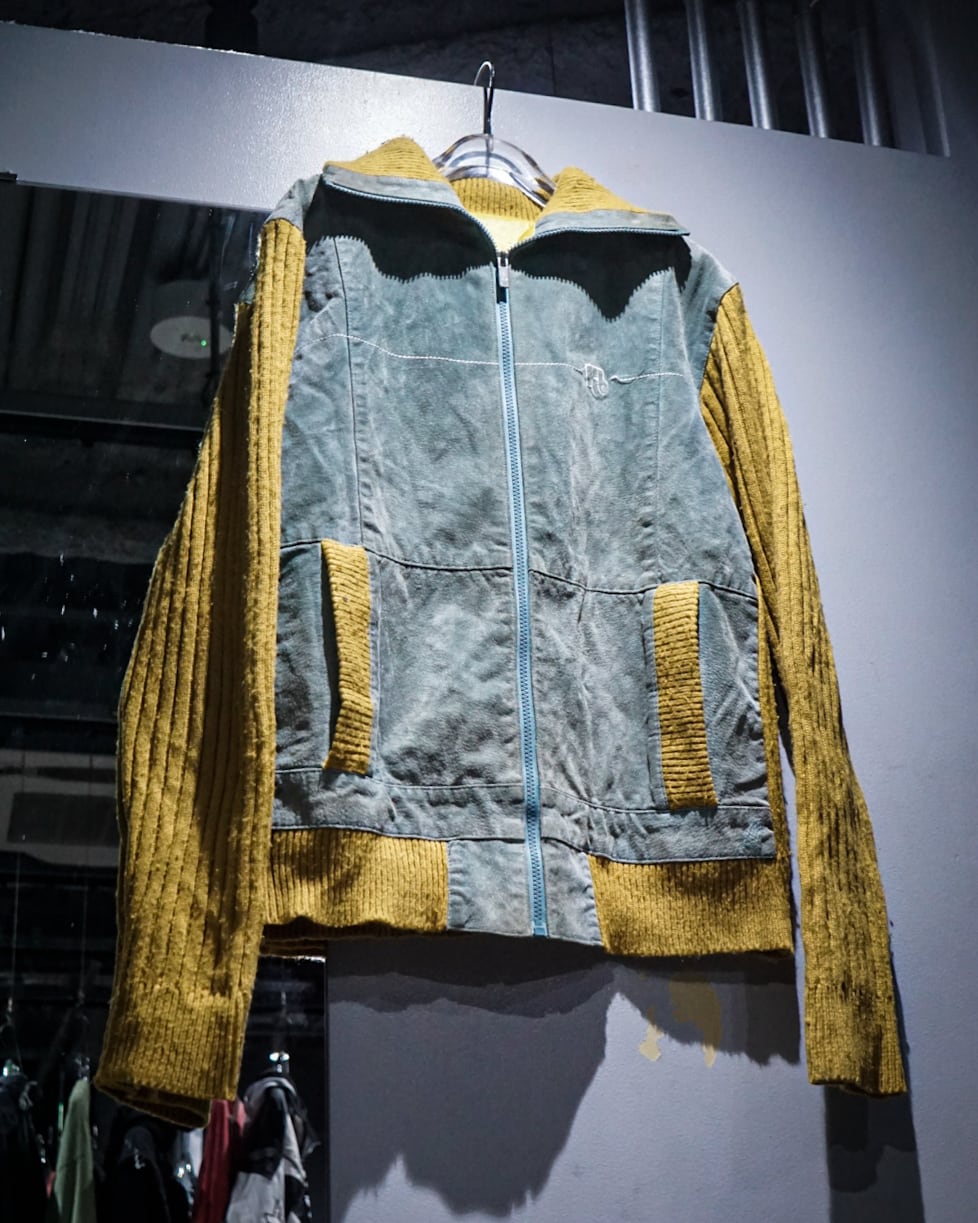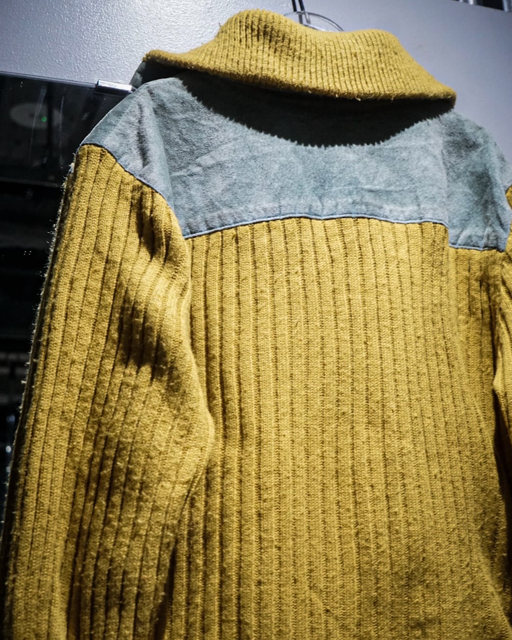 全体のベースとなるマスタードカラーのリブニットは肉厚で伸縮性があり、フィット感と防寒性を兼備。そこにブルーグレーのスエードを組み合わせることで、立体的かつ個性的な切り替えデザインを実現しています。