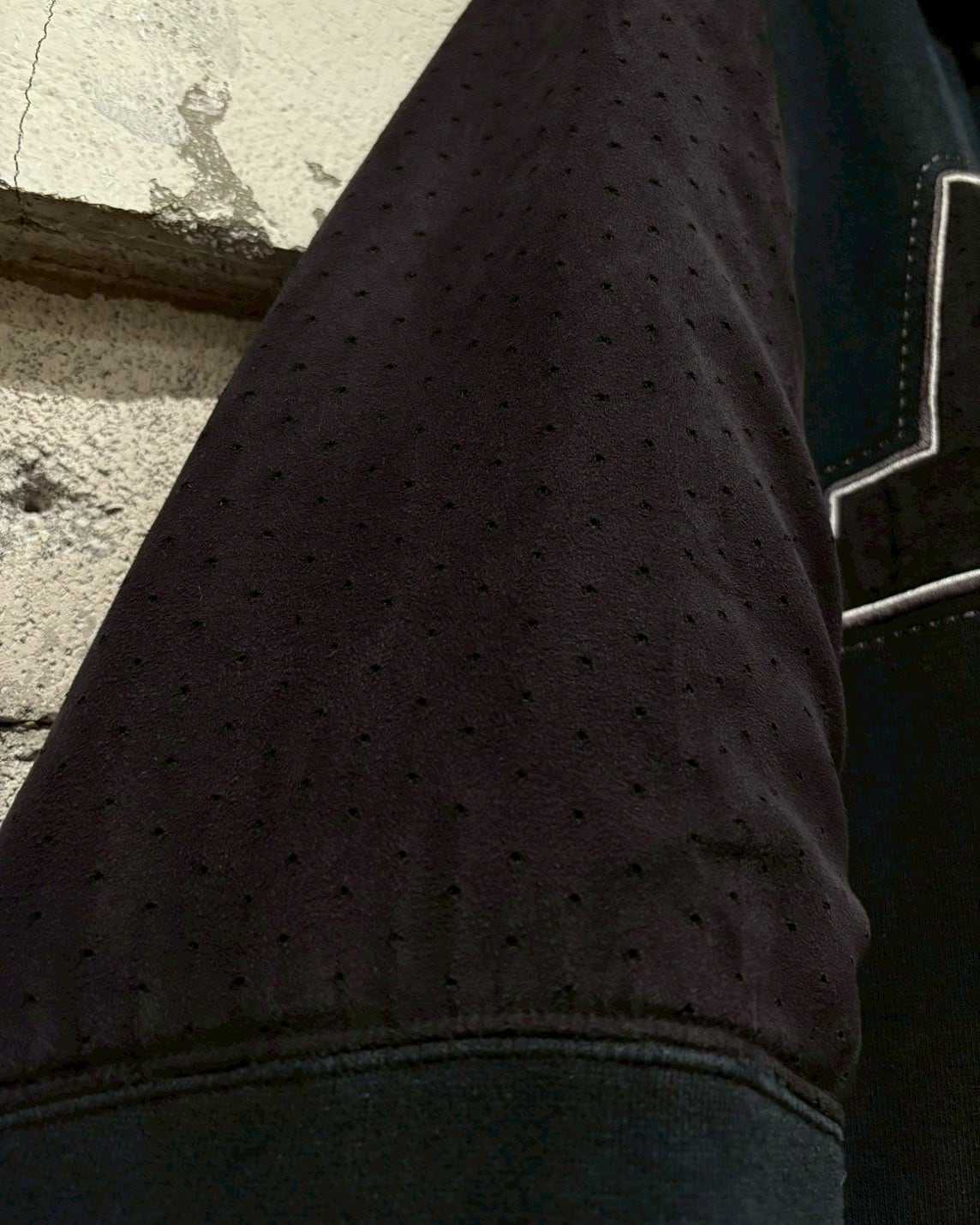 スウェットボディにパンチング加工が施されたフェイクスエードのアームを切り替え、異素材のコントラストを効かせることでストリートマインド溢れるデザインに仕上げられた1着。