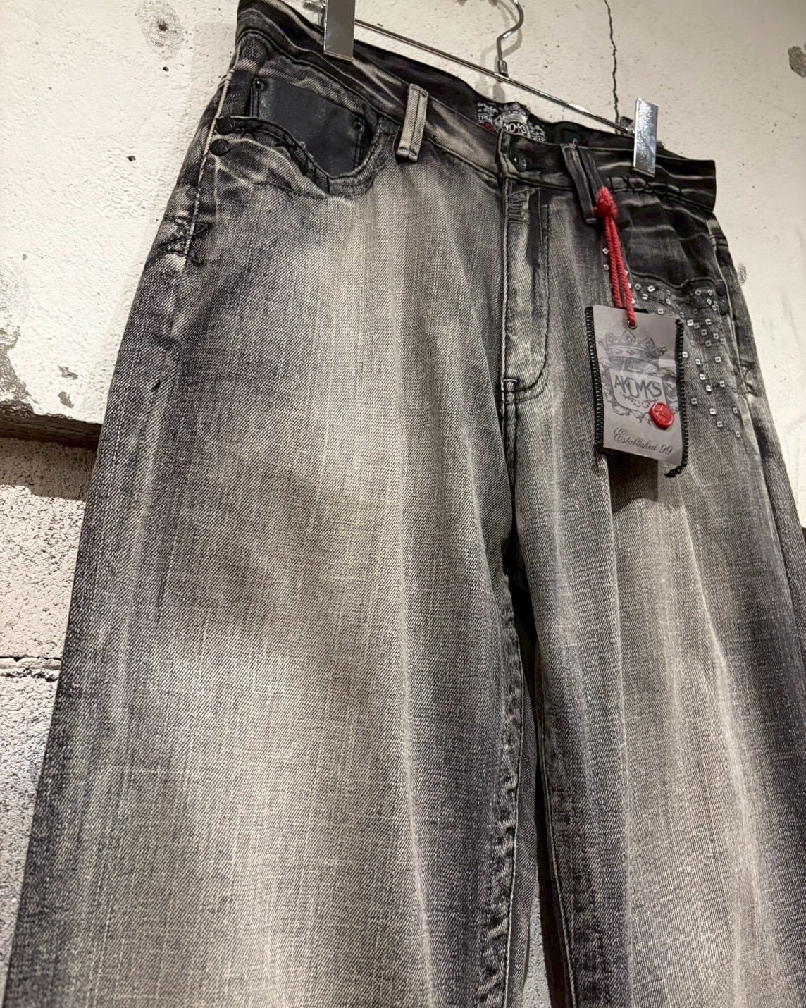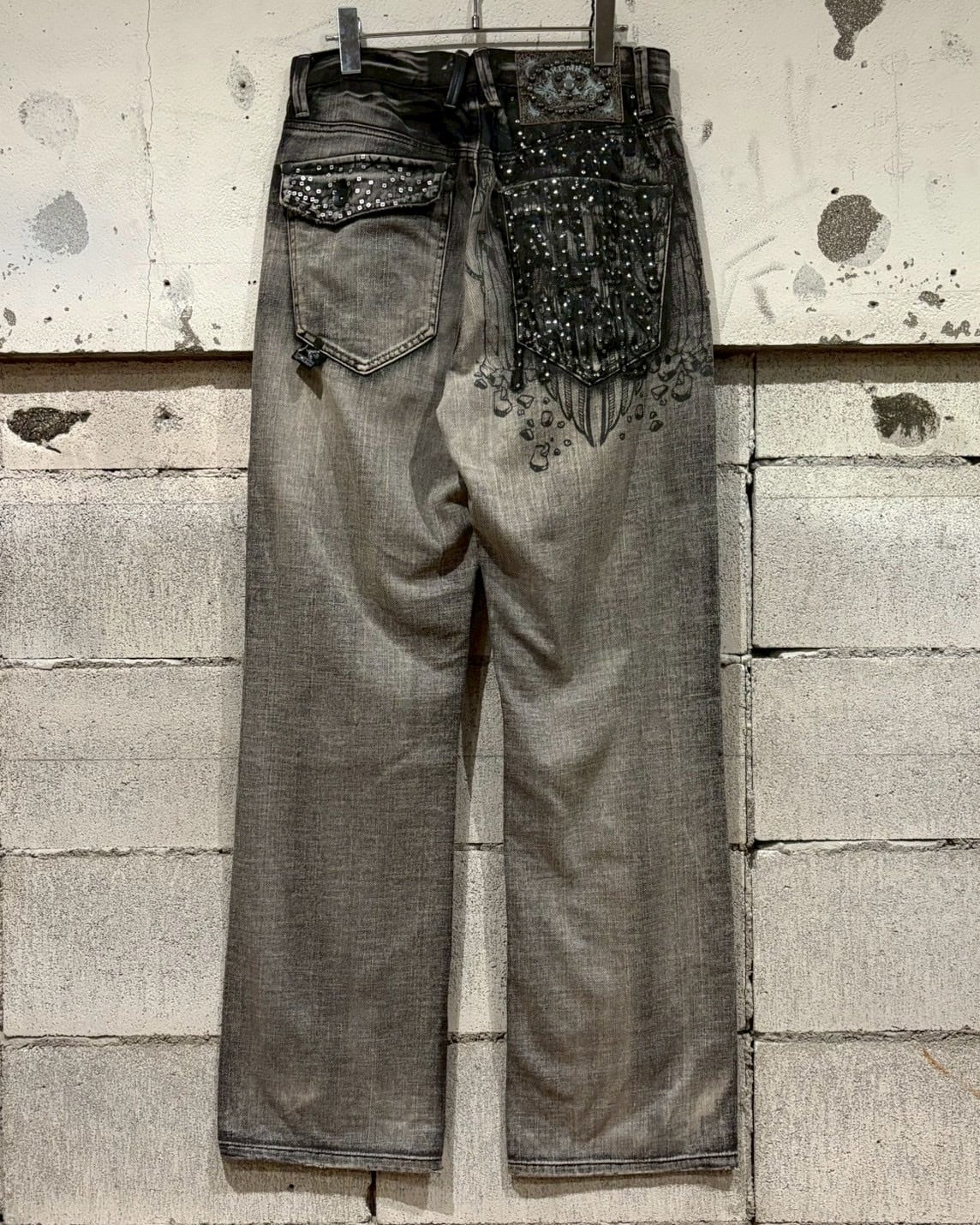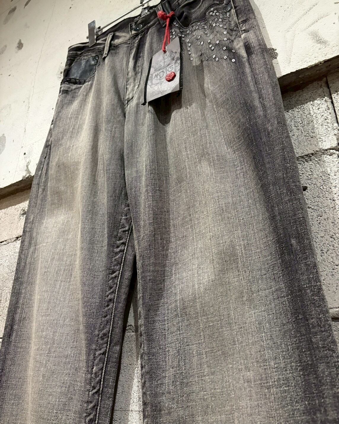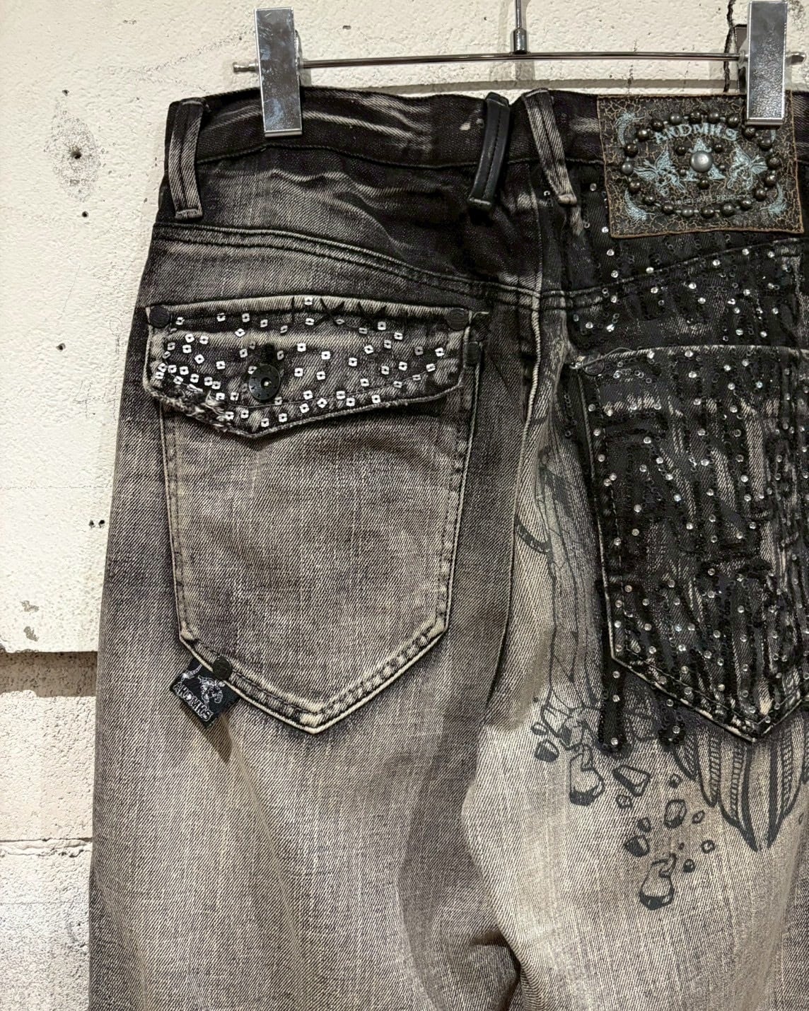 フロントにはレザーのコインポケットの切り替えやリベット使い、さらにステッチを叩き、スパンコールを散りばめたデザイン。バックポケットにも立体感のあるラインストーン、スパンコールを施し、ブランドらしい高いデザイン性を誇ります。