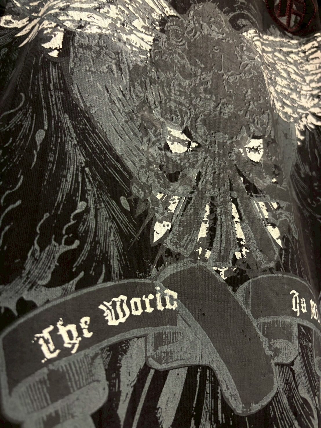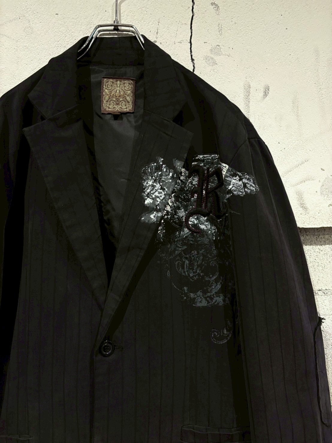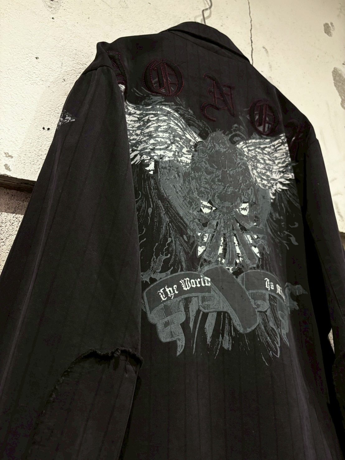 コットンをベースに仕立てられたボディに、荘厳な雰囲気を纏うフェザーとエンブレムのグラフィックを大胆に配したテーラードジャケット。