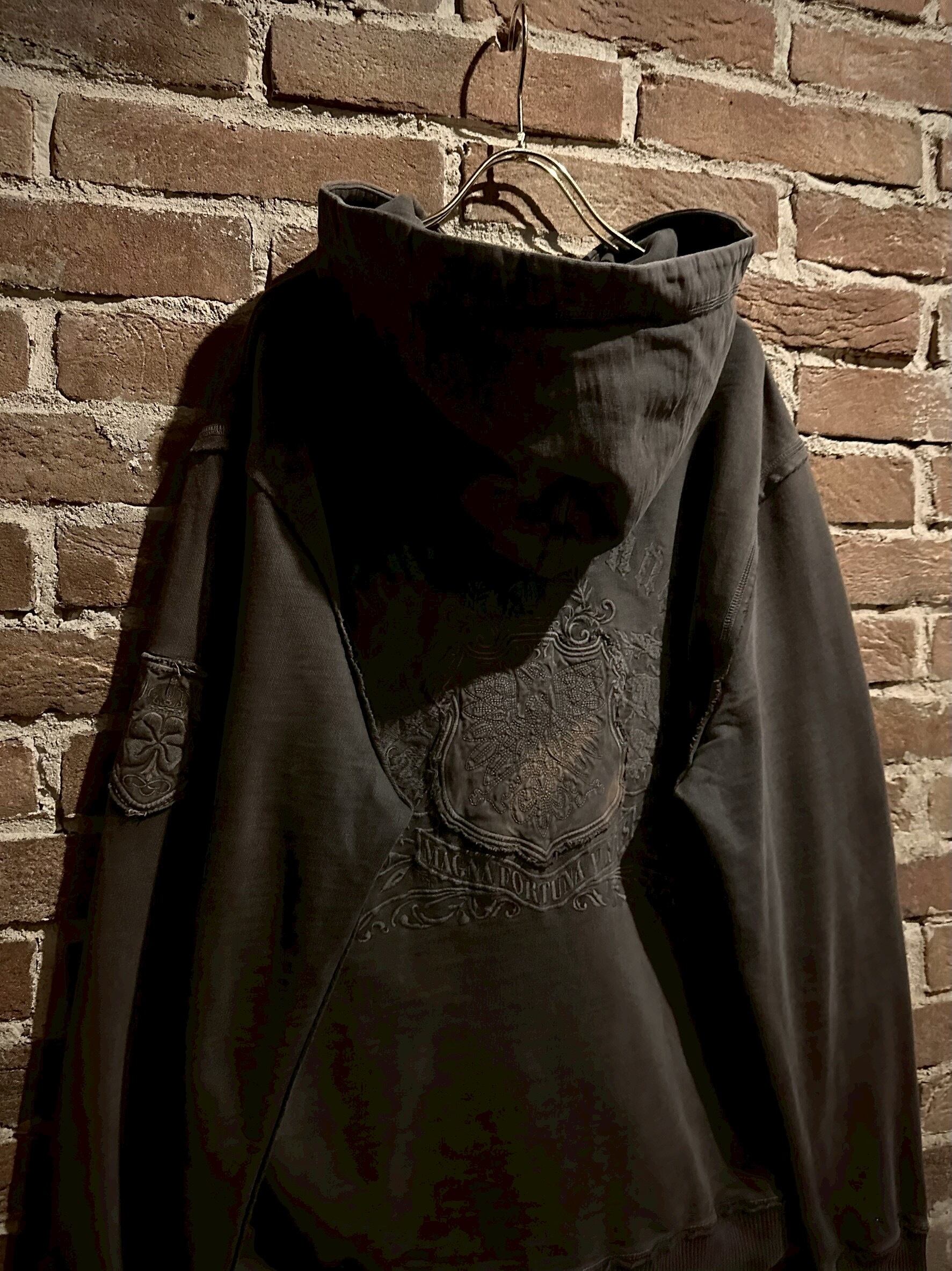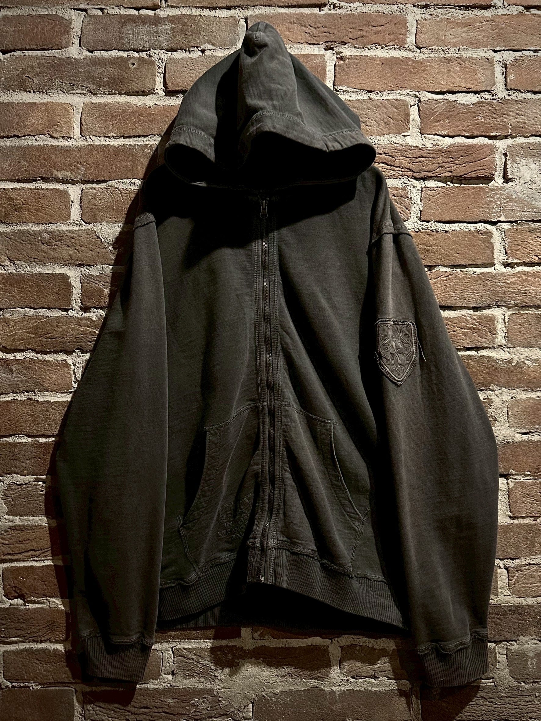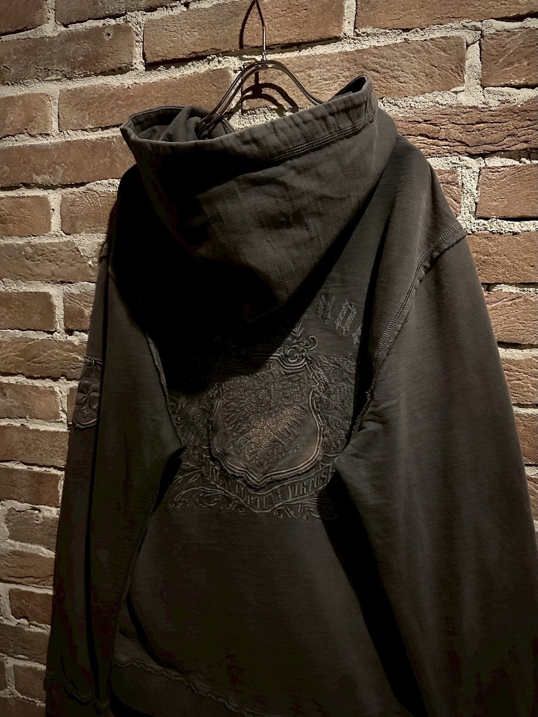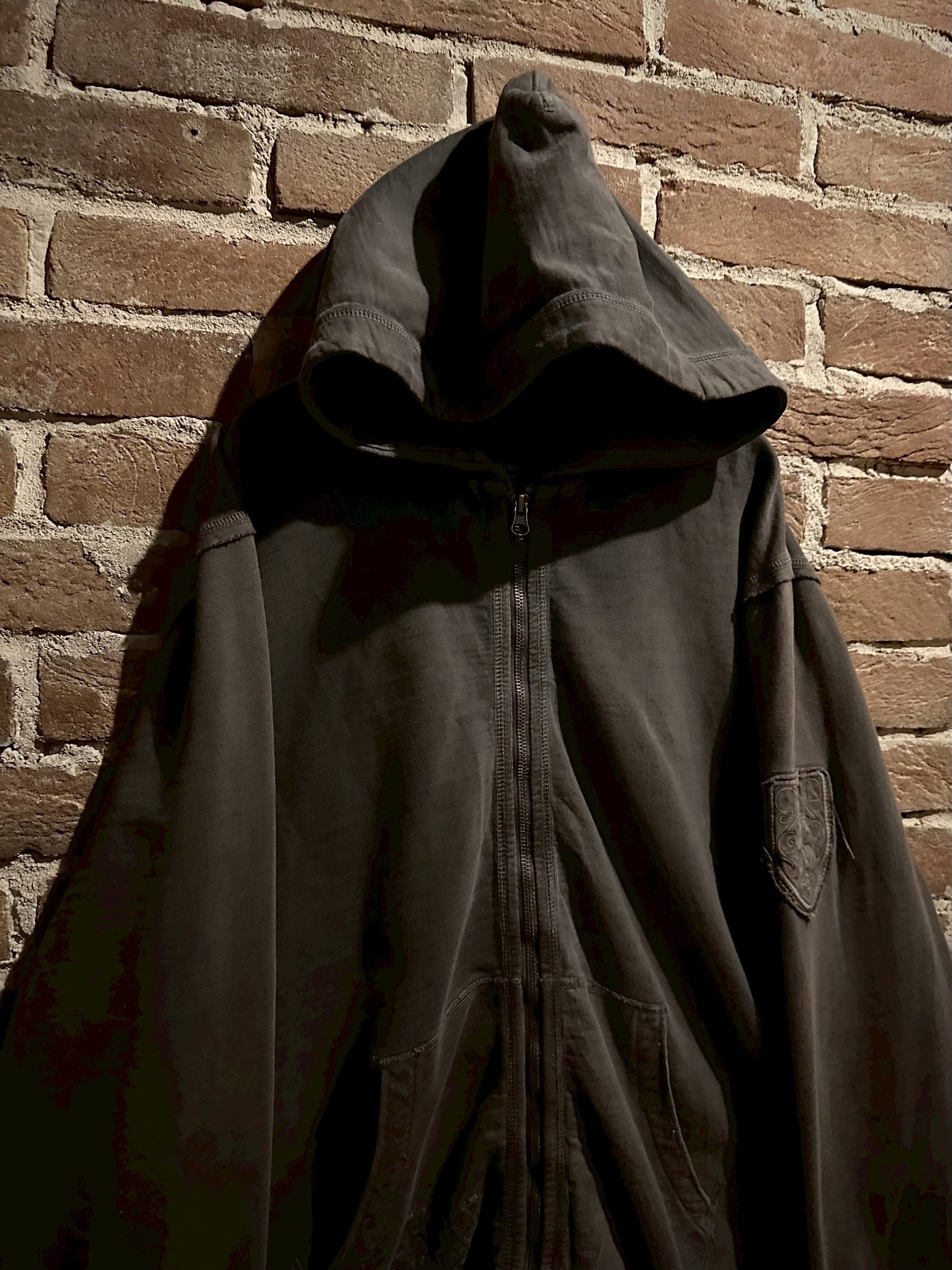 全体にエイジング加工が施されたスモーキーな色味が特徴で、程よいフェード感が雰囲気をムンムンに漂わせるジップアップフーディ。