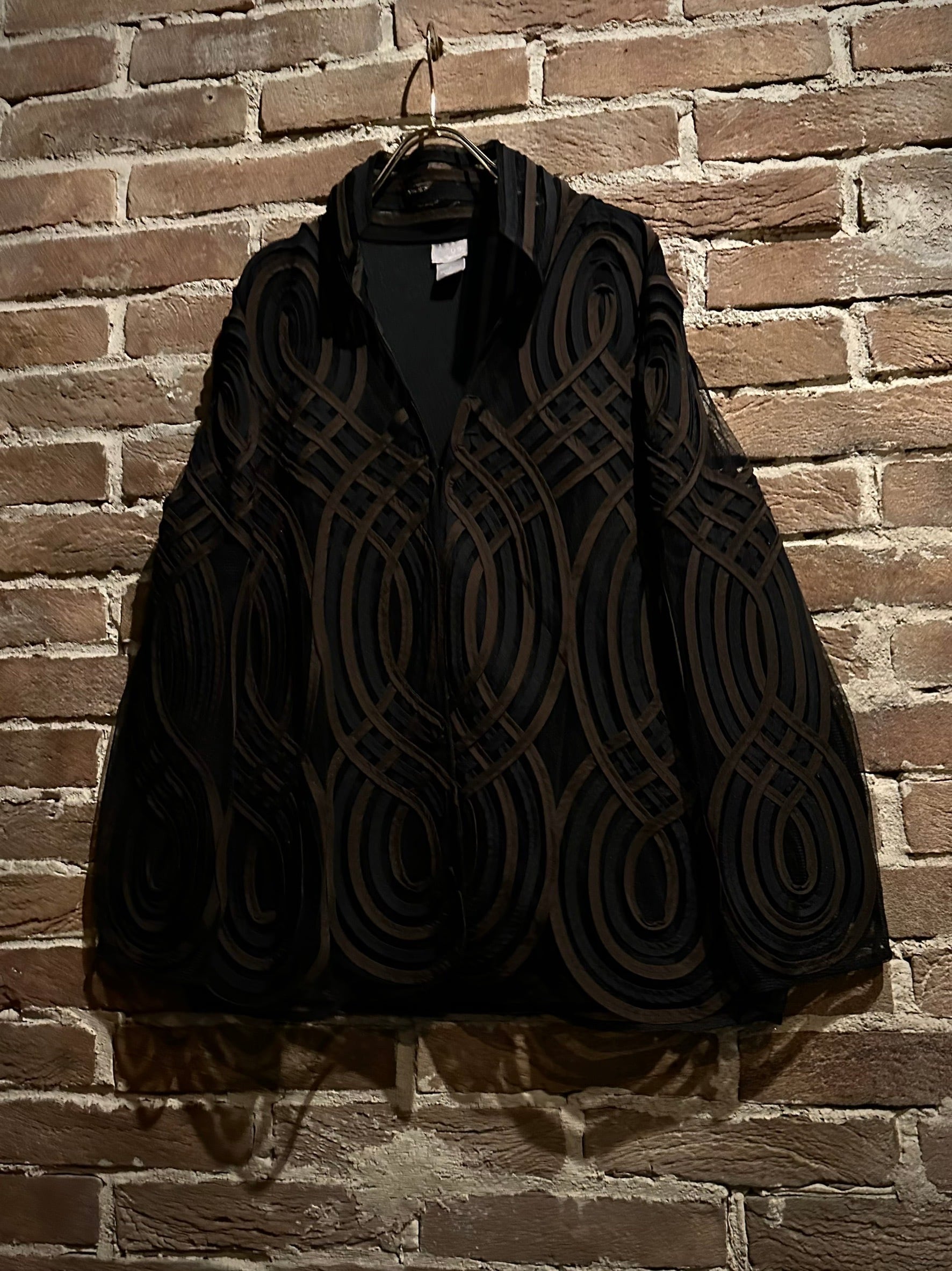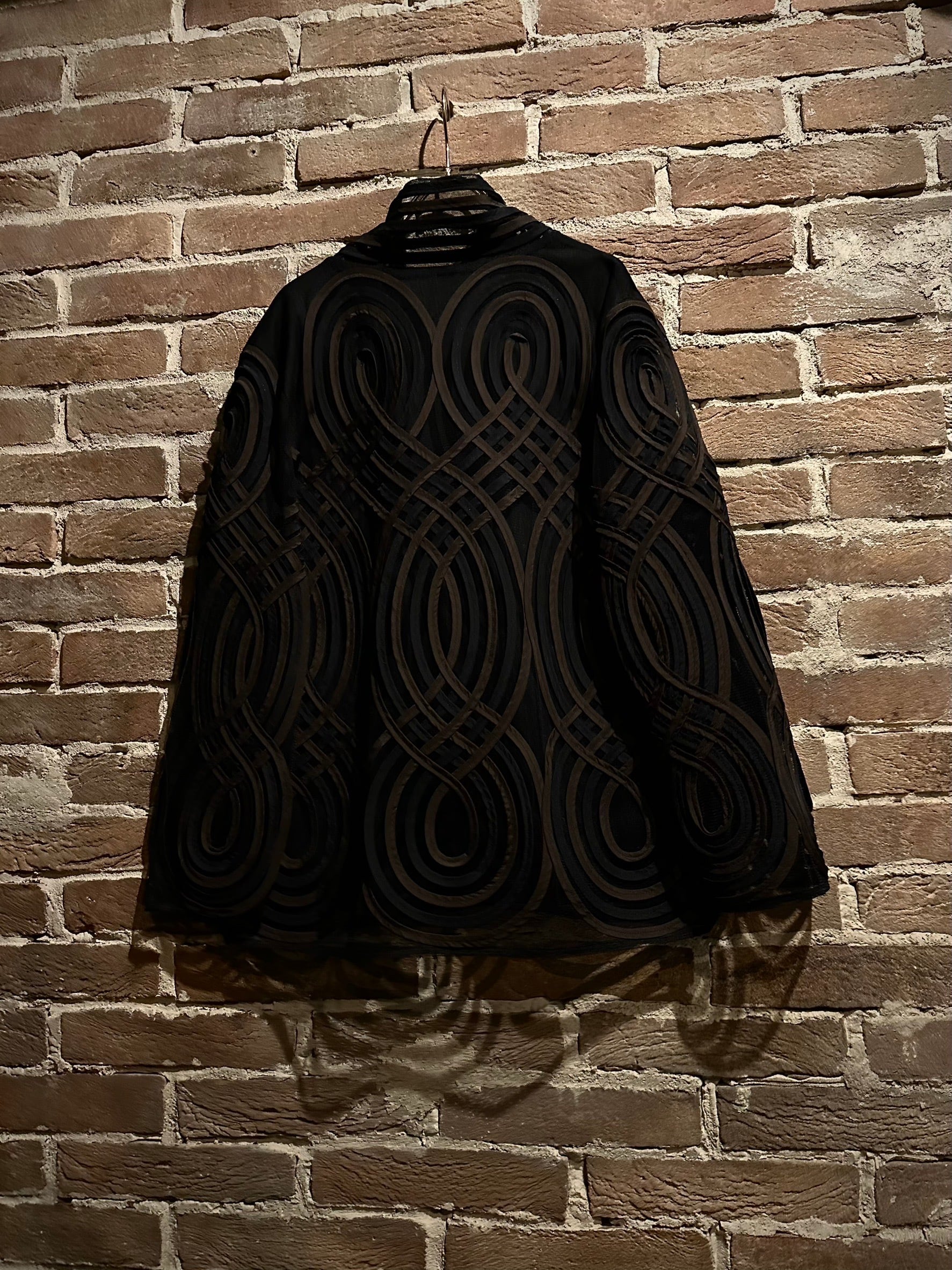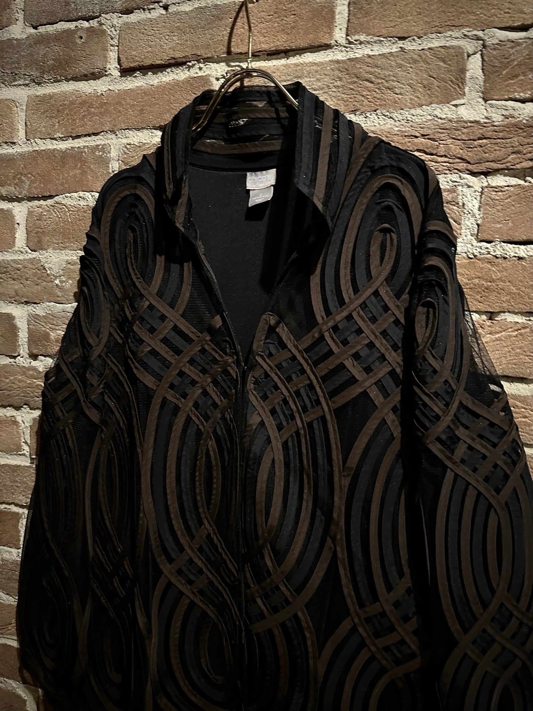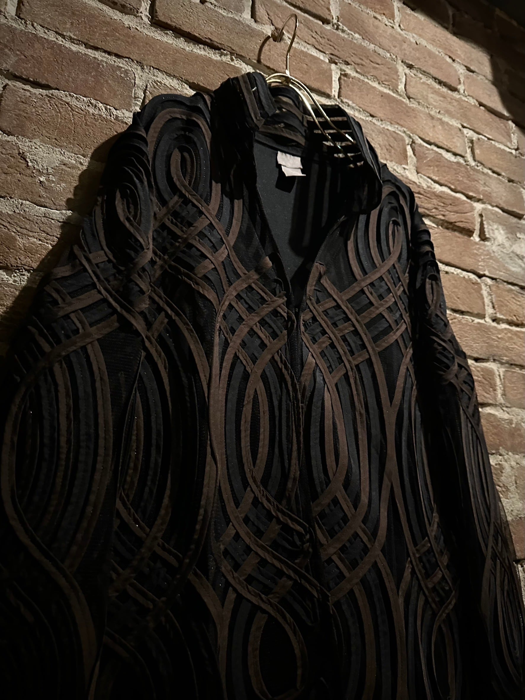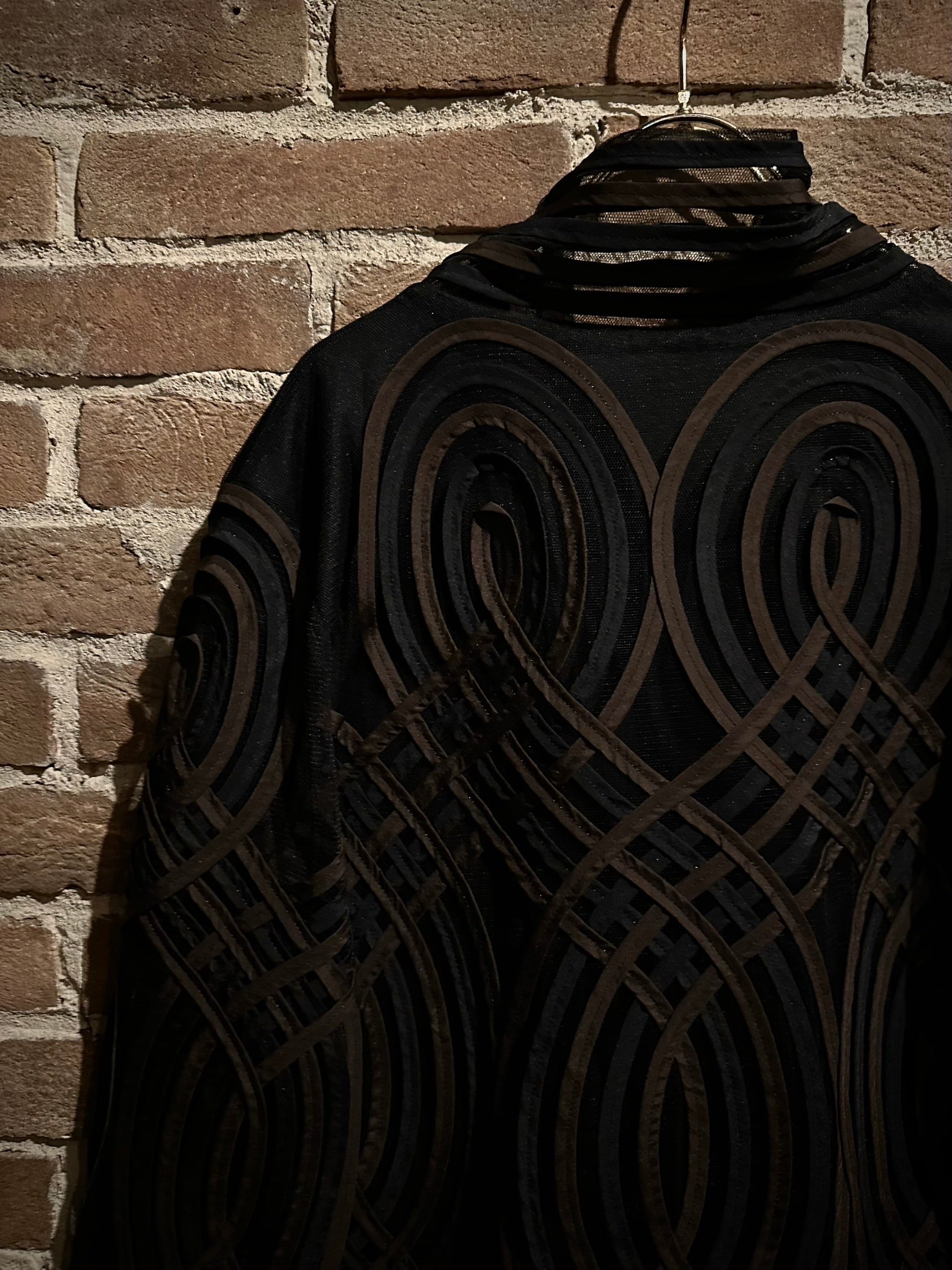 透け感の美しいブラックシアーのボディをベースに、立体的なラインデザインを全体に走らせたアーティスティックな1着。