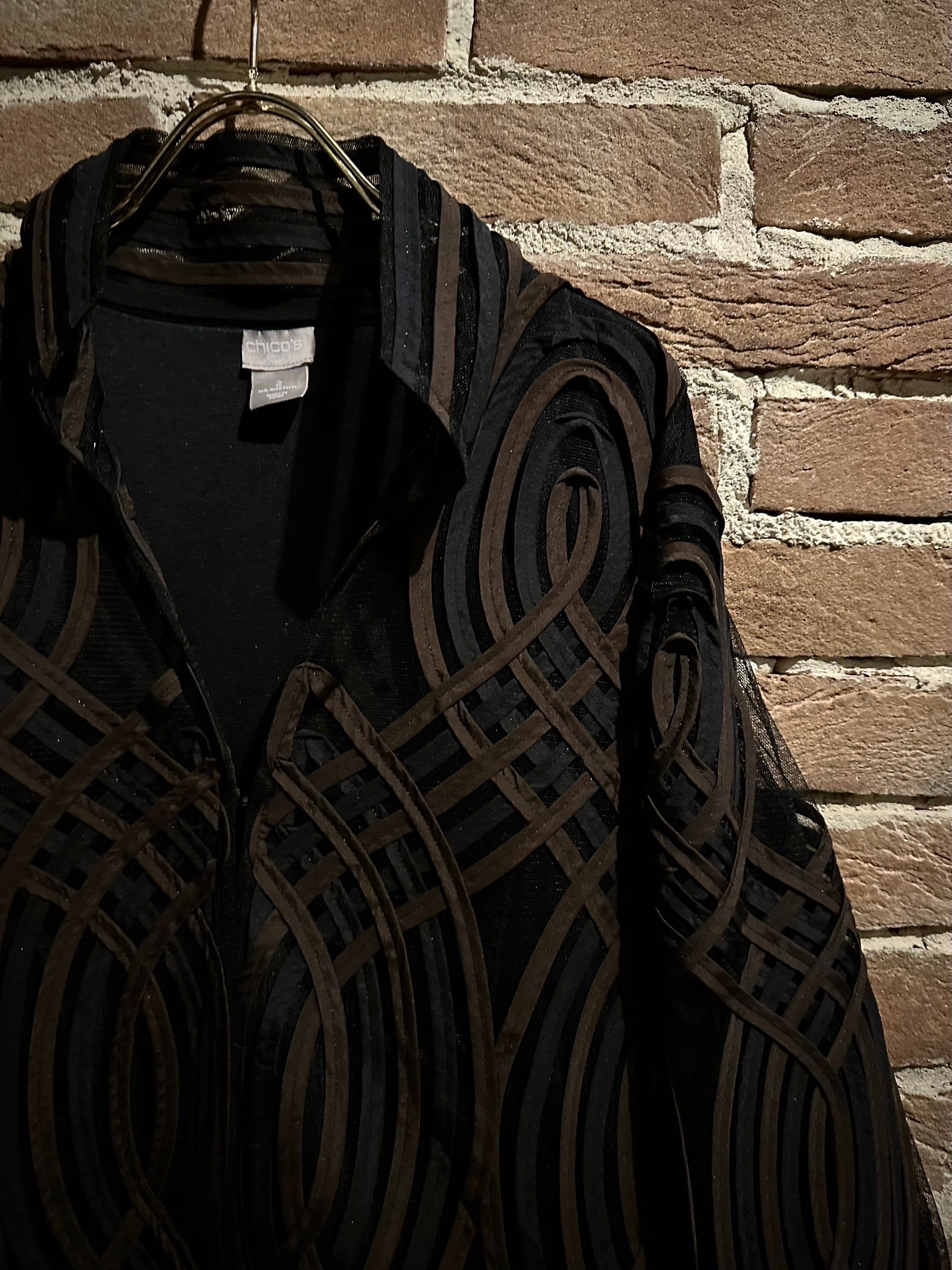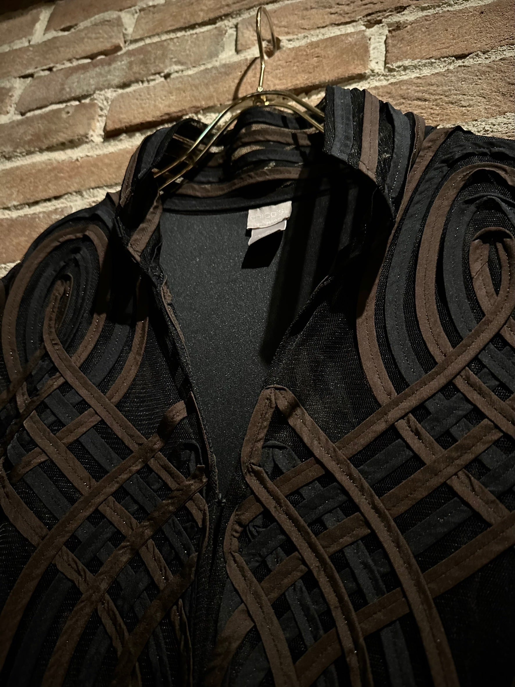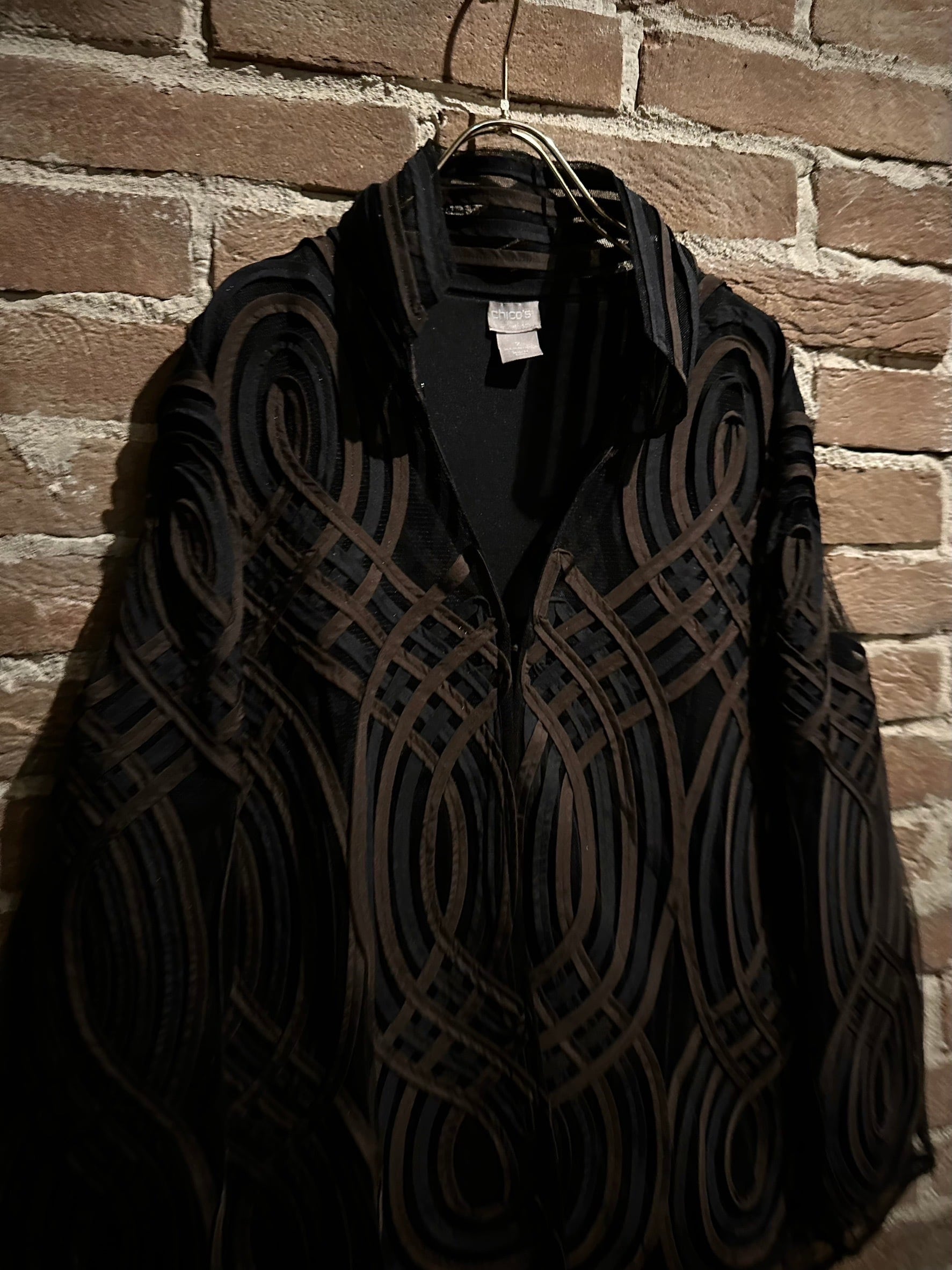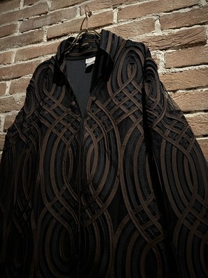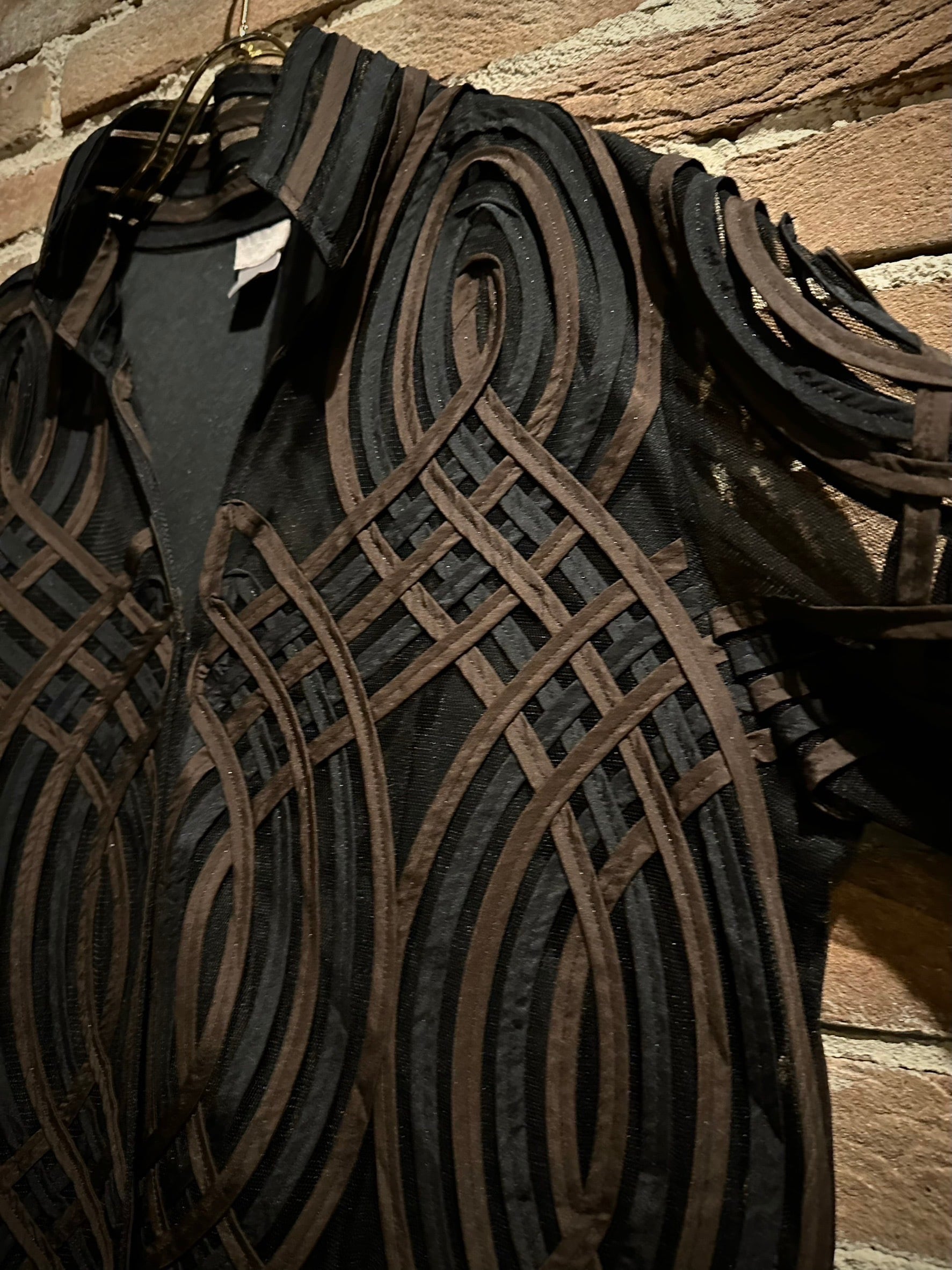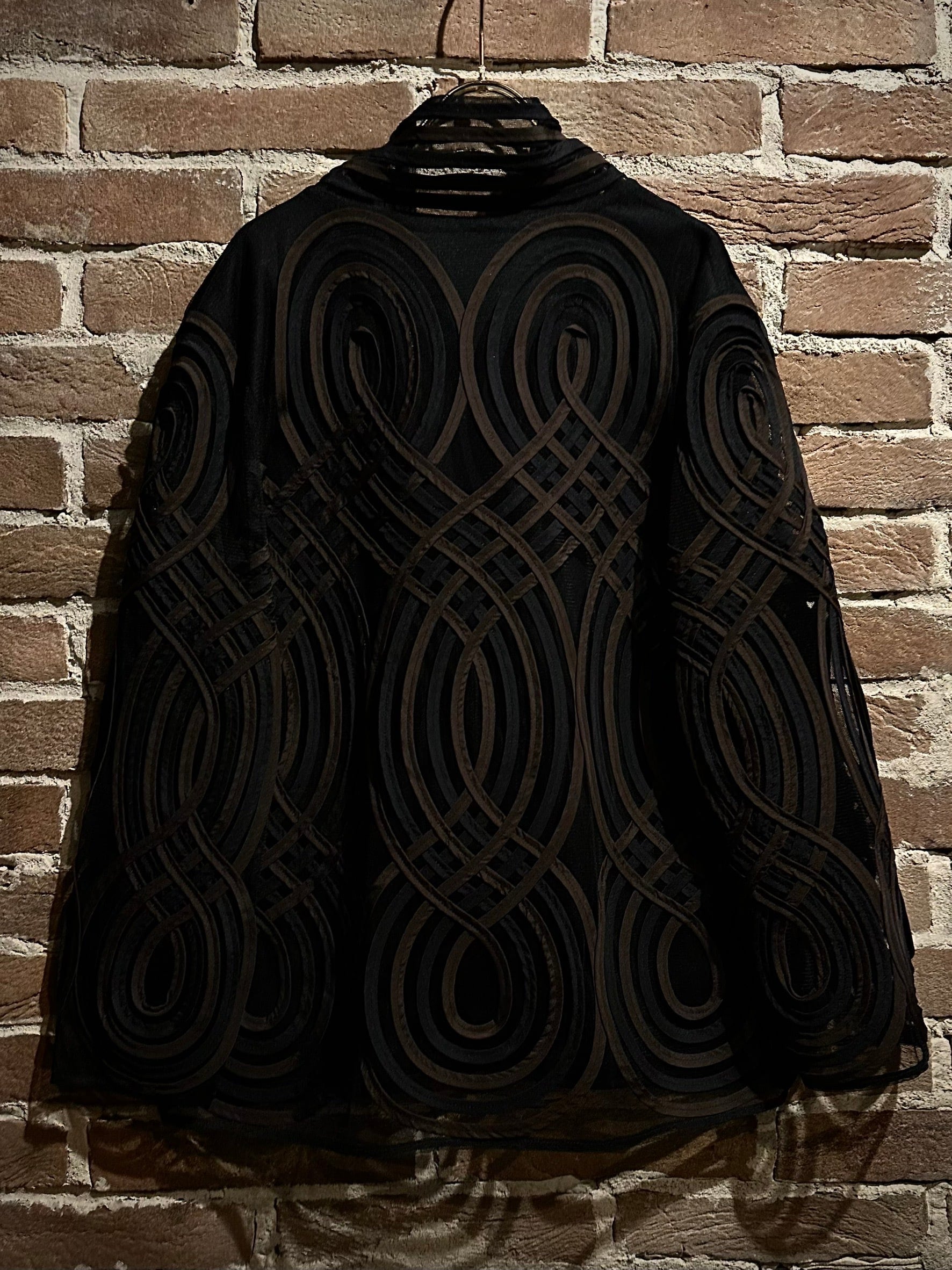 透け感の美しいブラックシアーのボディをベースに、立体的なラインデザインを全体に走らせたアーティスティックな1着。