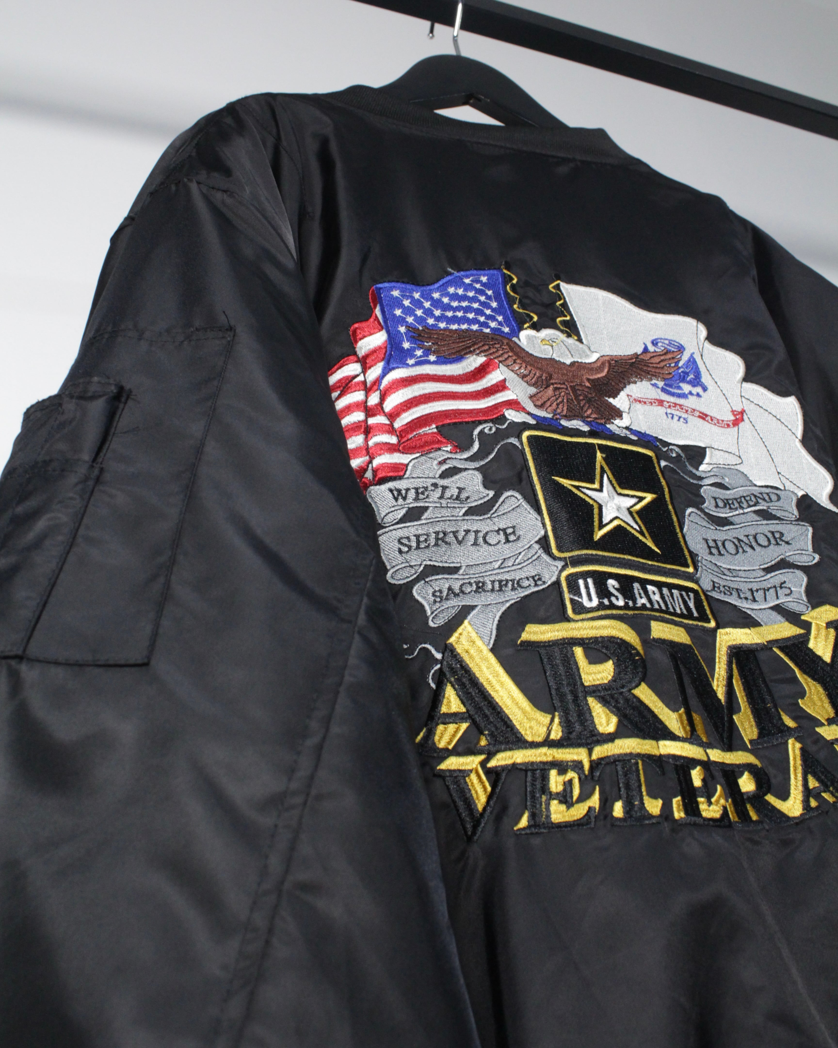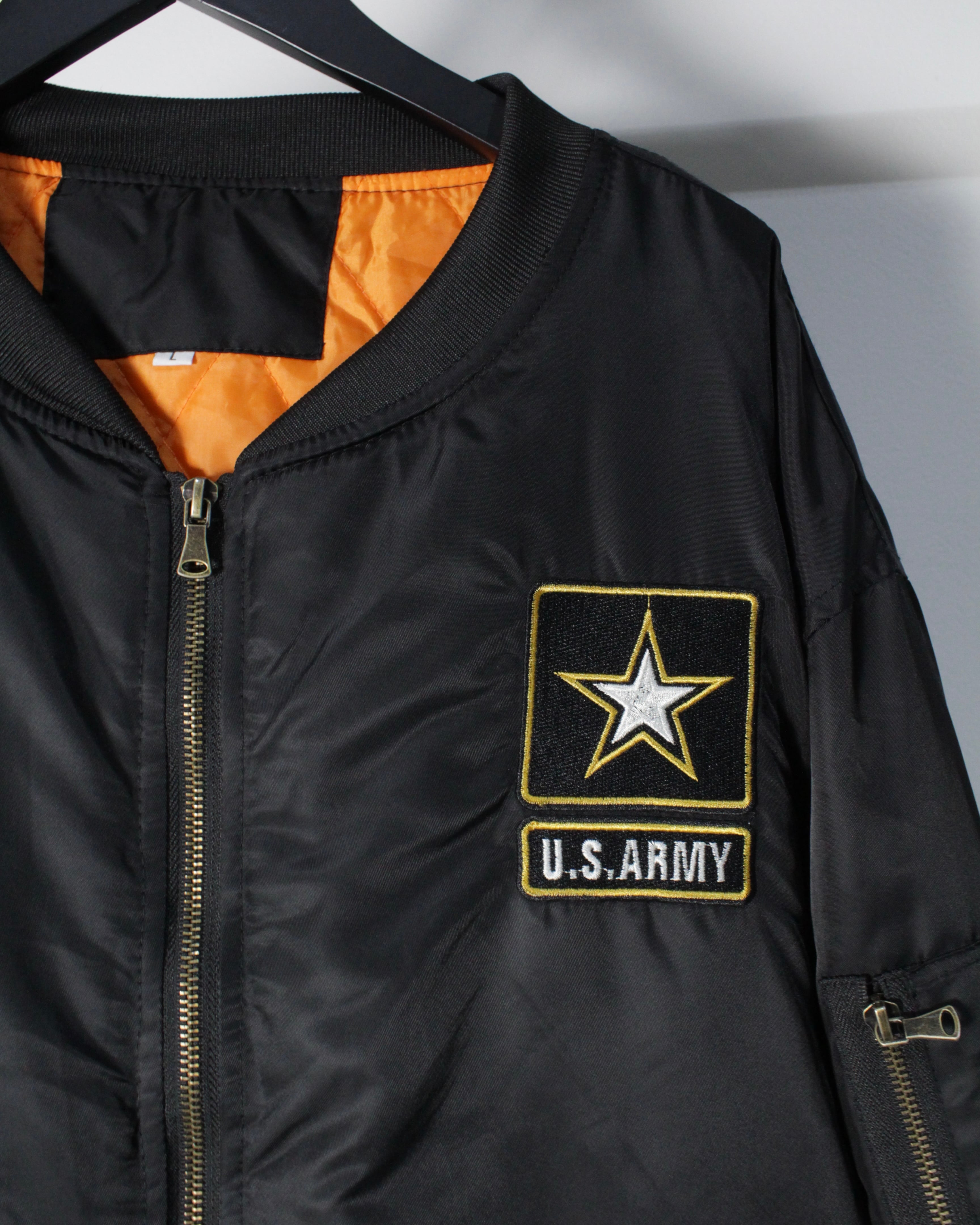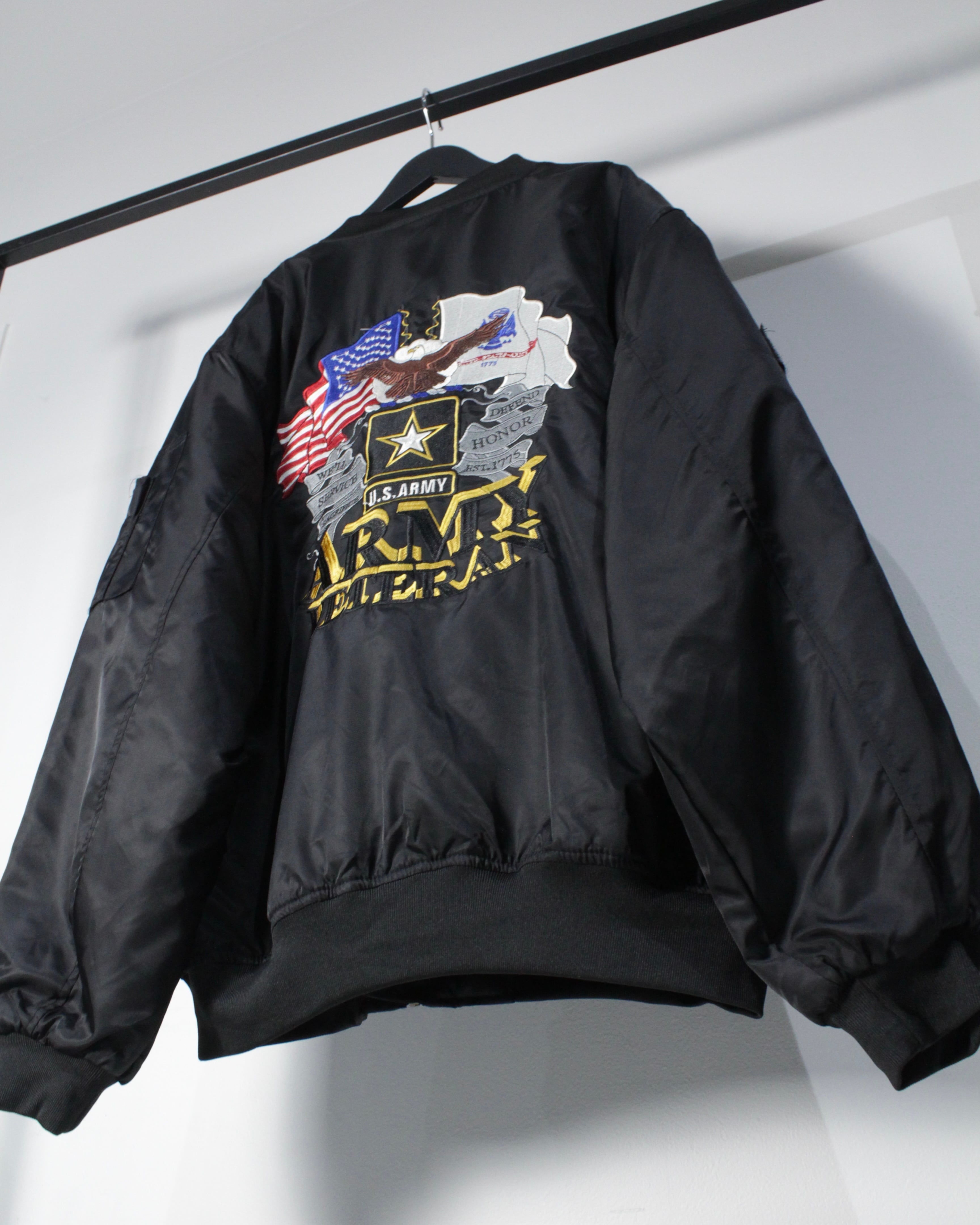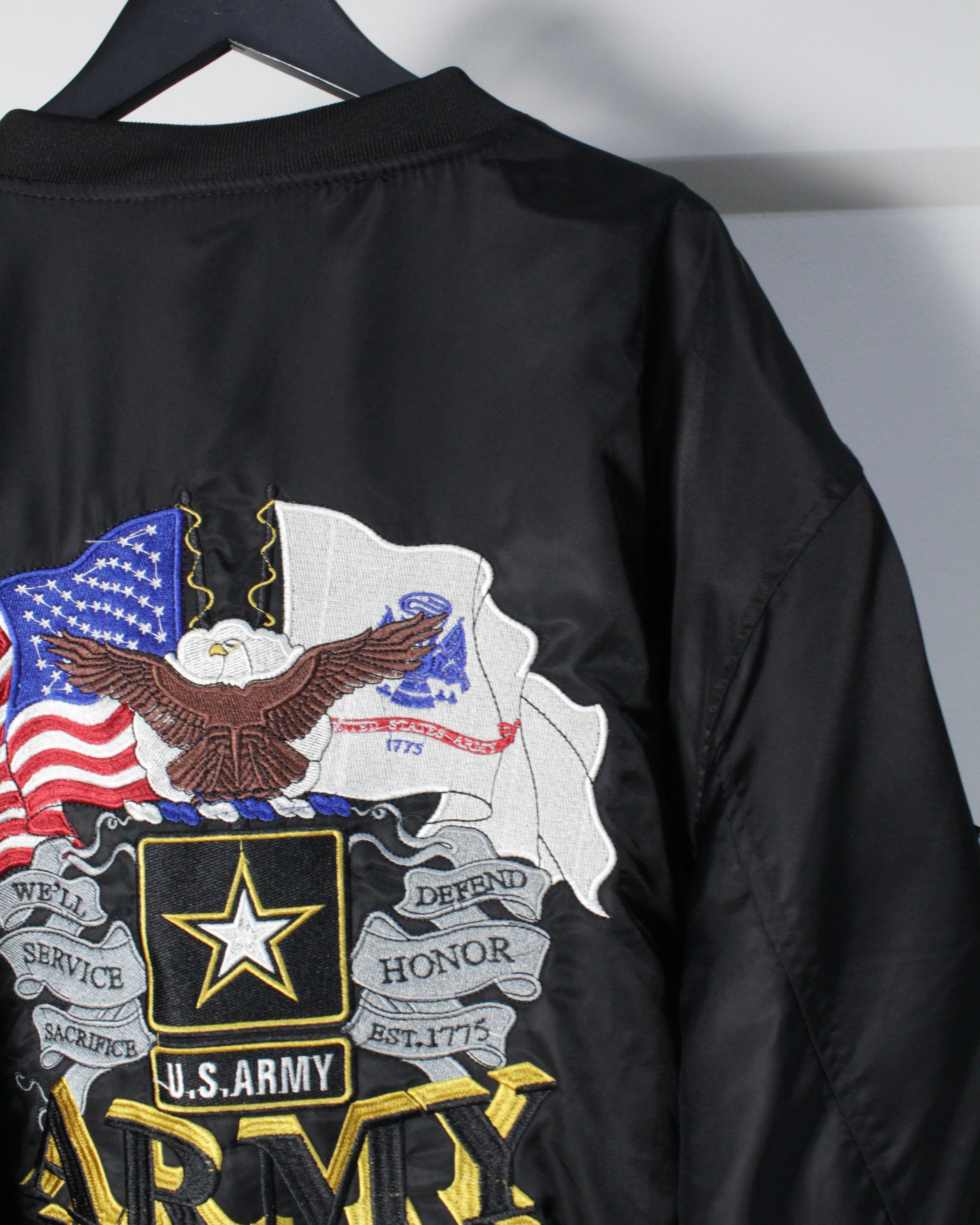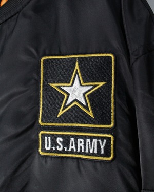 アメリカ陸軍の公式ロゴを胸元に刺繍であしらい、背面には星条旗、イーグル、ARMYのロゴを堂々と配置した、存在感抜群のスペシャルなMA-1ジャケット。