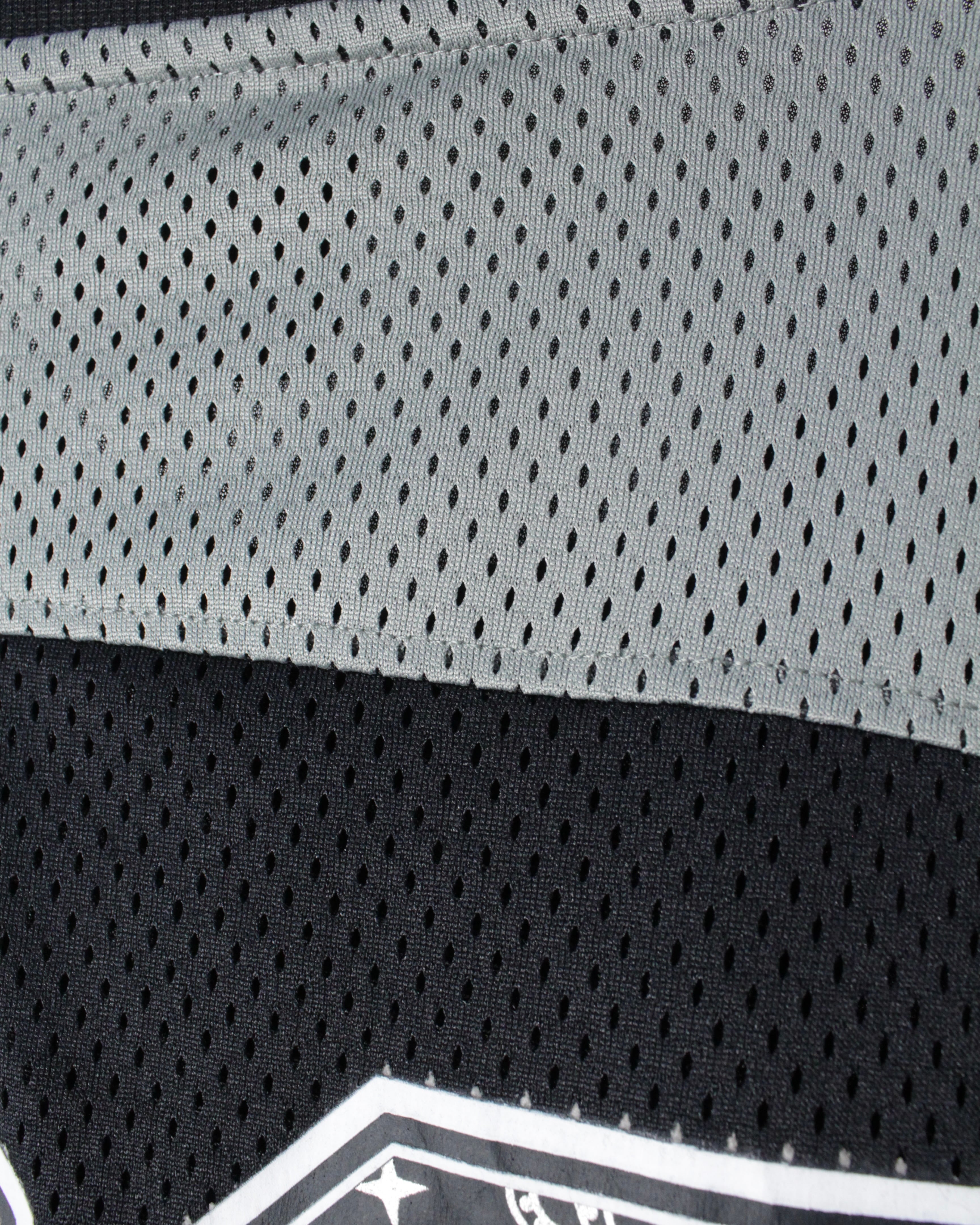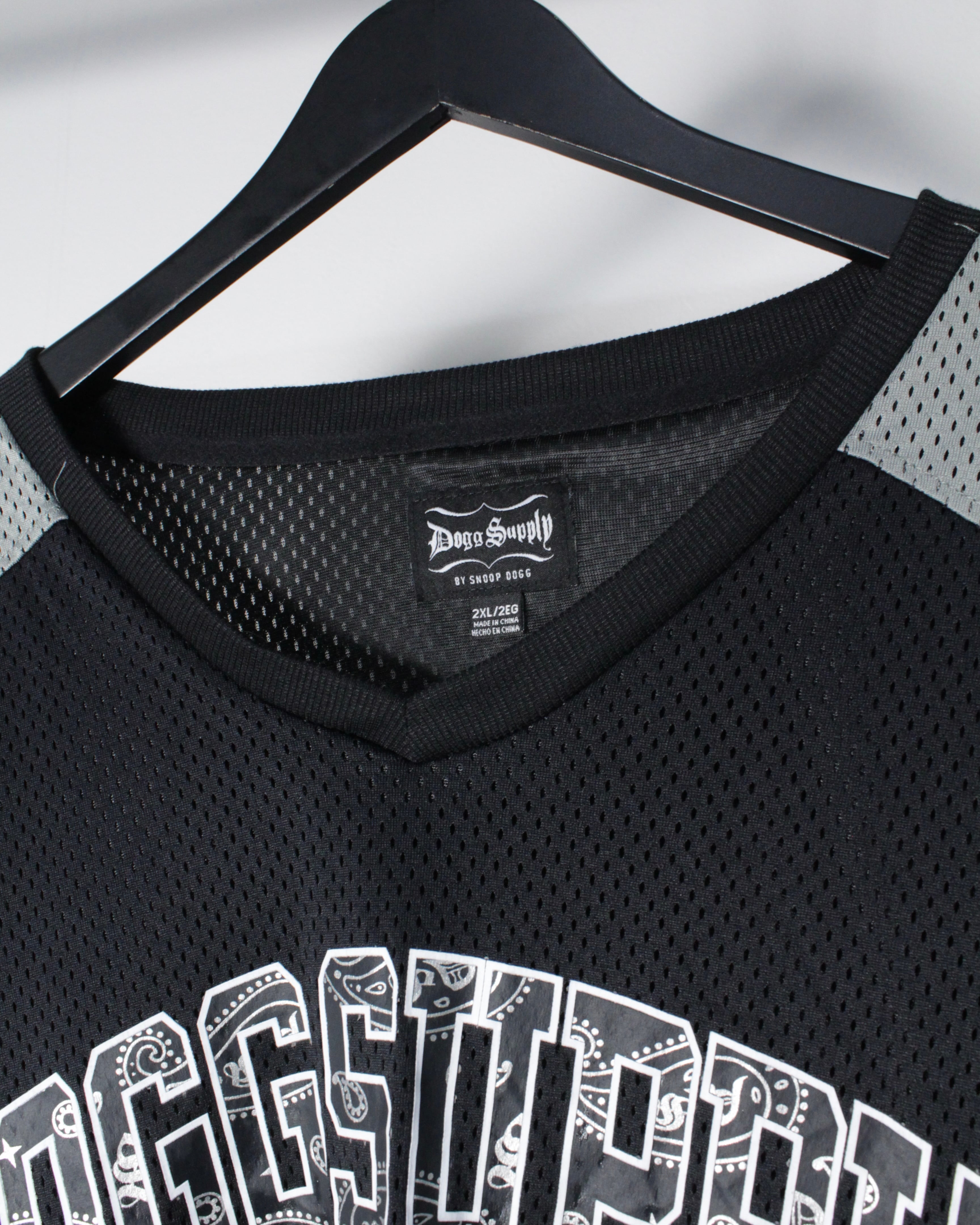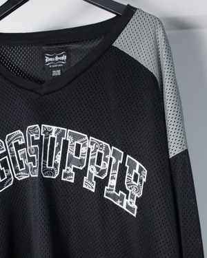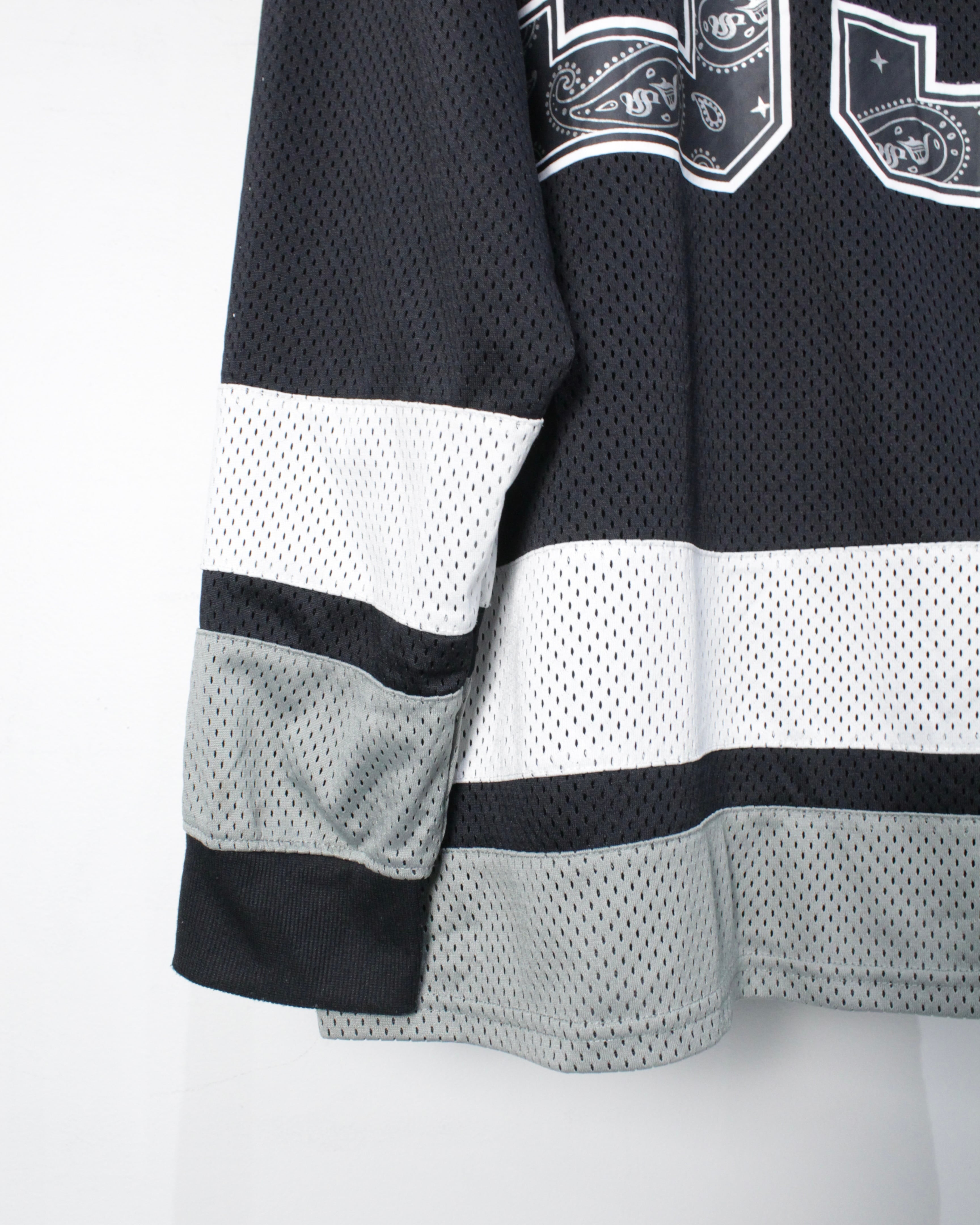 黒、グレー、白のモノトーンで切り替えたボディに、フロントにはブランドネーム、背面にナンバリングをバンダナ柄で載せたホッケーシャツ。